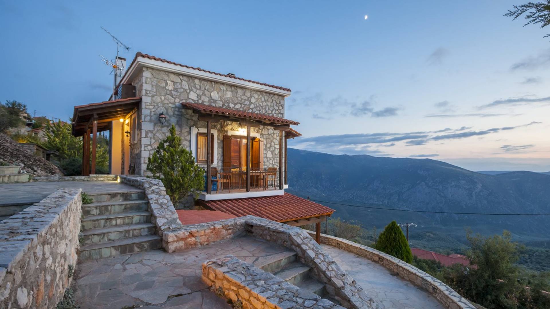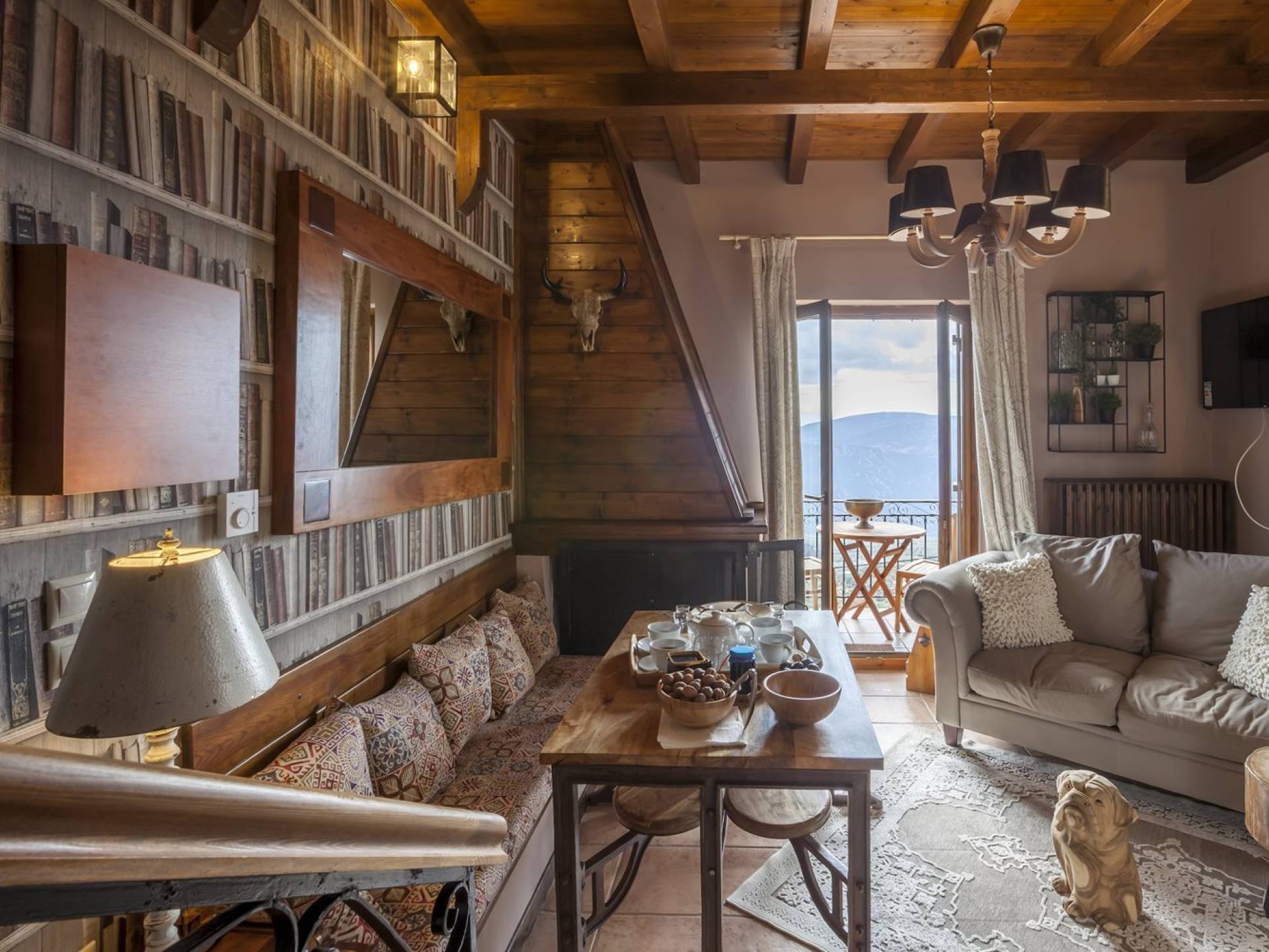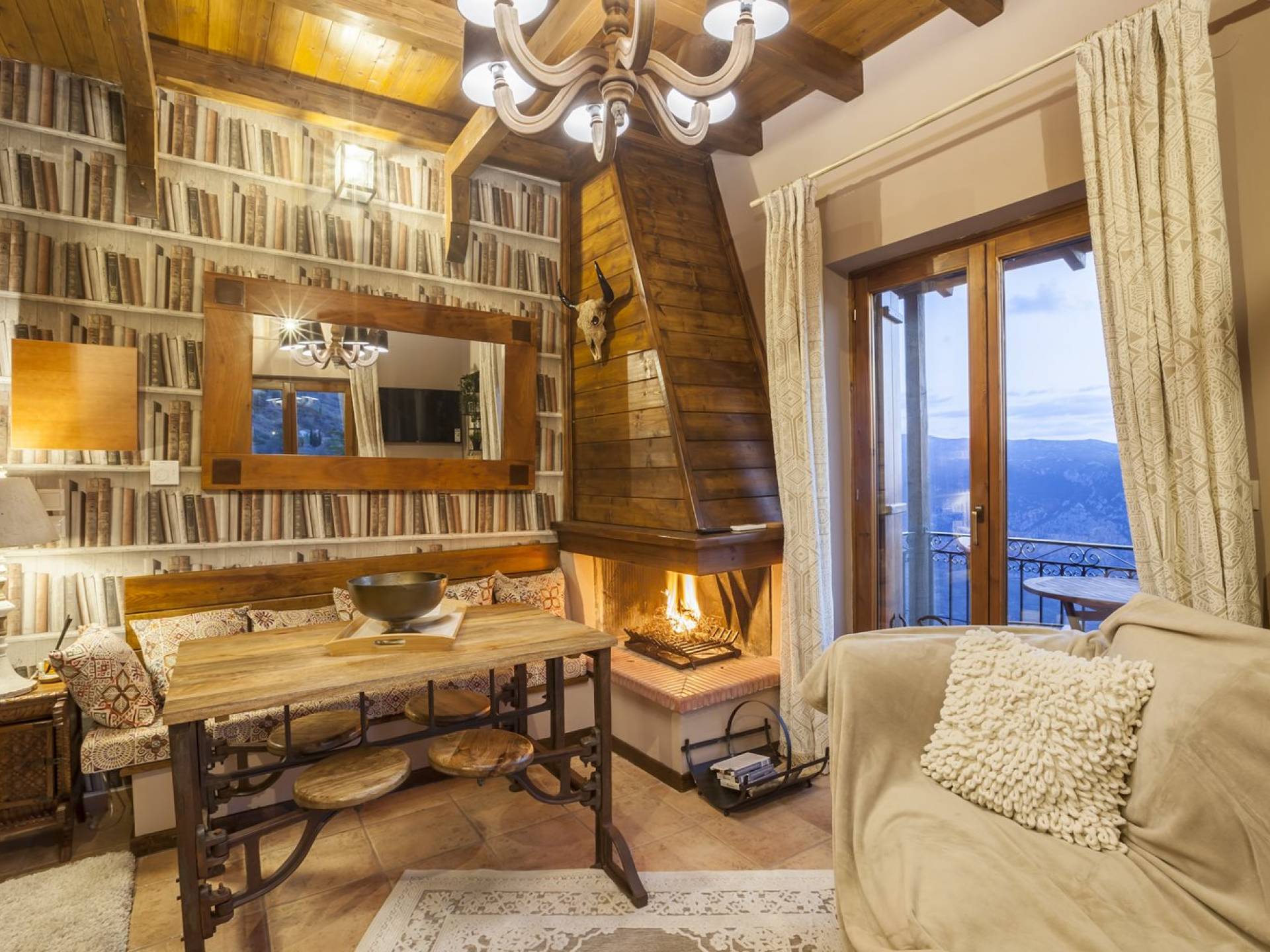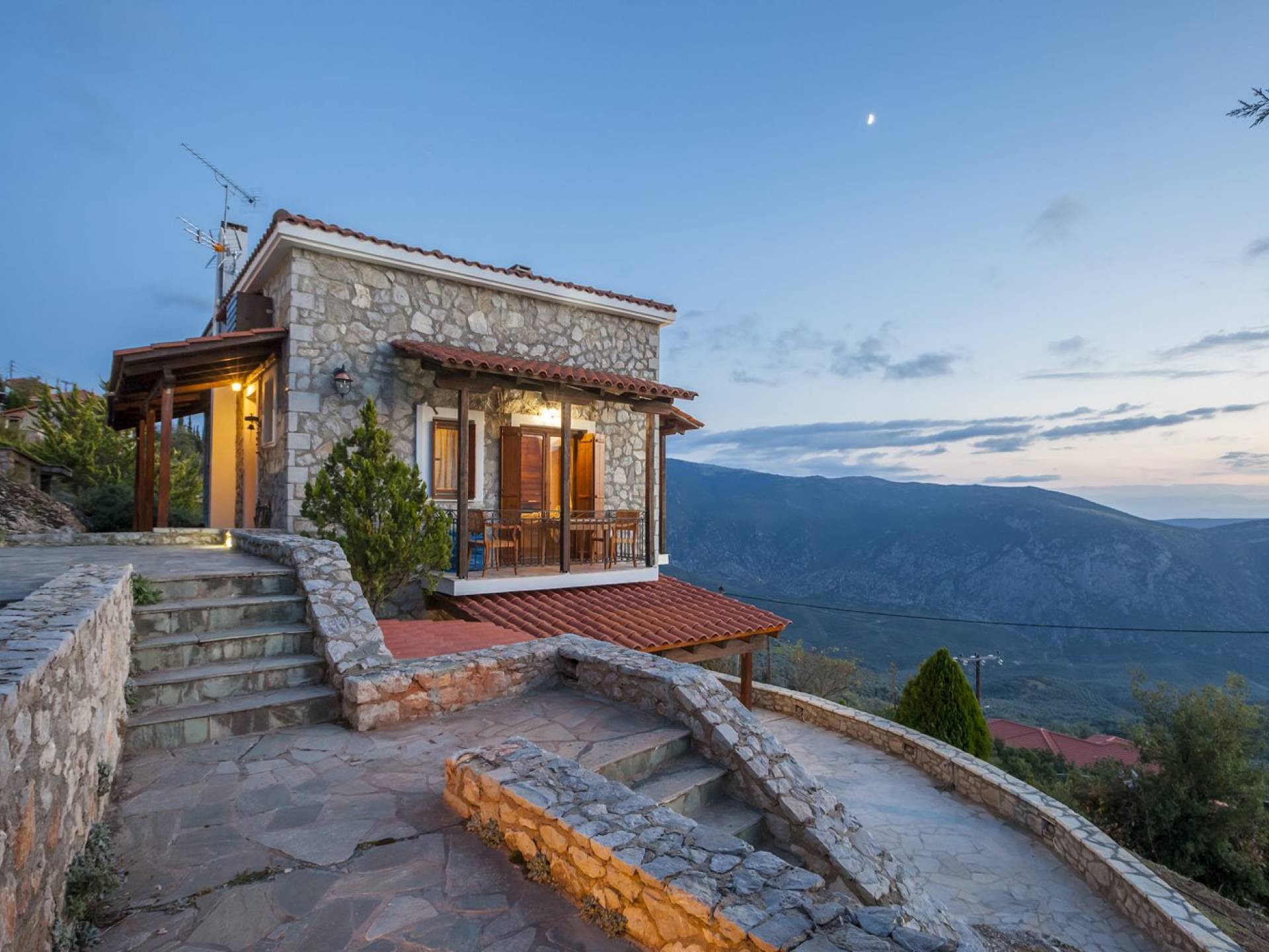 Η θέα από τα μπαλκόνια και τη βεράντα κόβει την ανάσα. Βρίσκεσαι σε υψόμετρο 900+ μέτρων και είναι σαν να απολαμβάνεις τον ήλιο και τα σύννεφα από πρώτη θέση. Η διακόσμηση είναι ιδιαίτερα εκλεπτυσμένη με την ενοχλητική πολυτέλεια που προκαλεί ζεστασιά και φινέτσα. Το σπίτι είναι εξοπλισμένο με hi-fi, τηλεοράσεις τελευταίου τύπου, ηλεκτρική κουζίνα, φούρνο μικροκυμάτων, κλιματισμό, τζάκι, τοστιέρα, μπόιλερ και όλων των ειδών τα μαγειρικά σκεύη, σάουνα και καμπίνα υδρομασάζ για όσους αναζητούν χαλάρωση και αποτοξίνωση 100%.