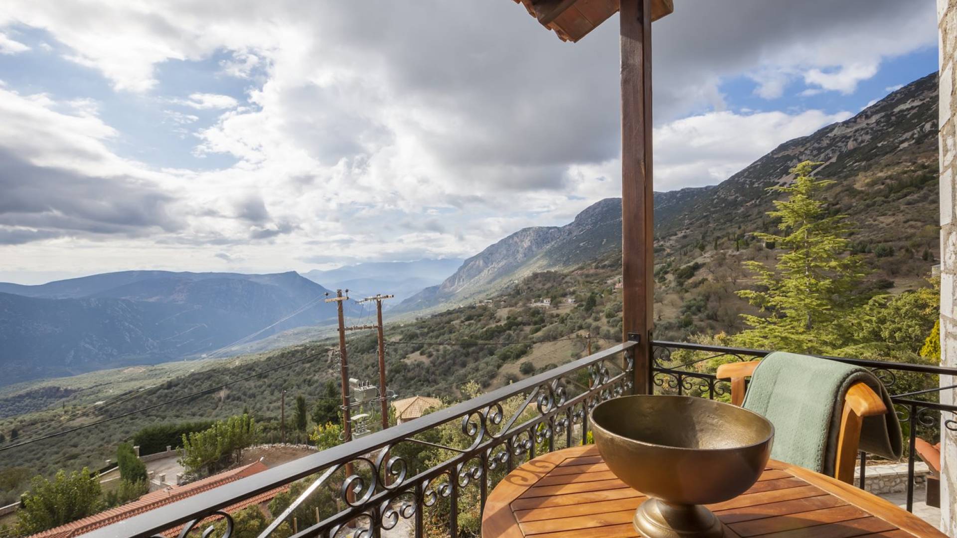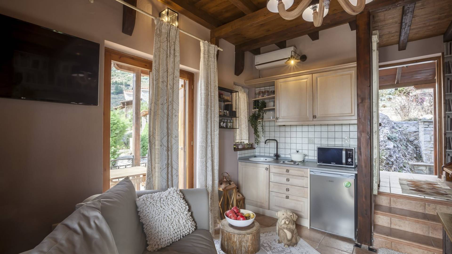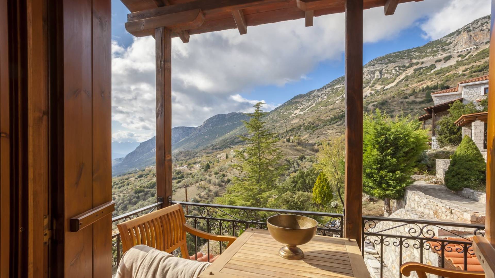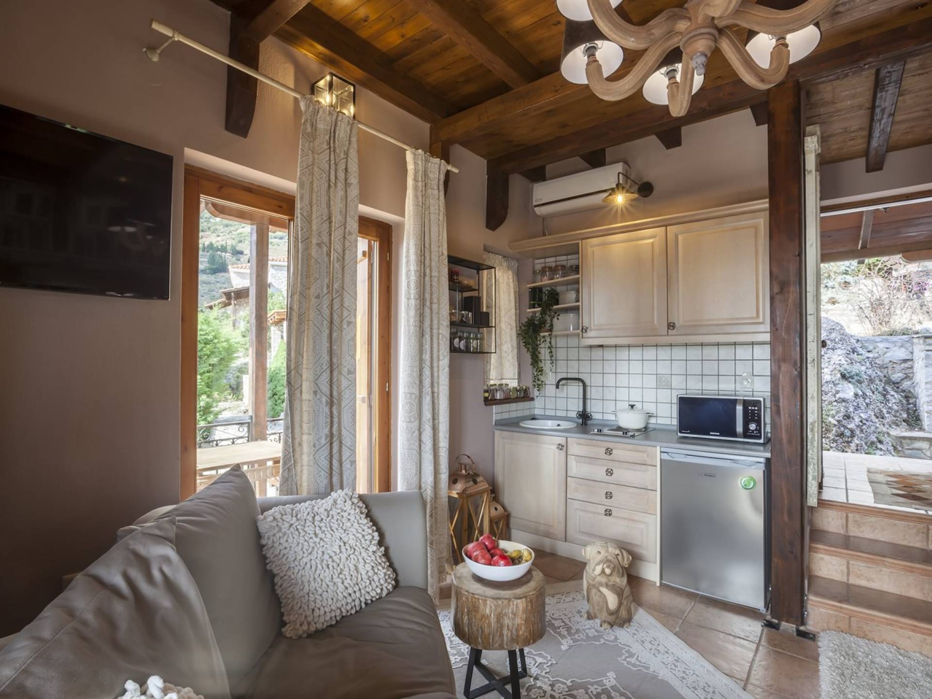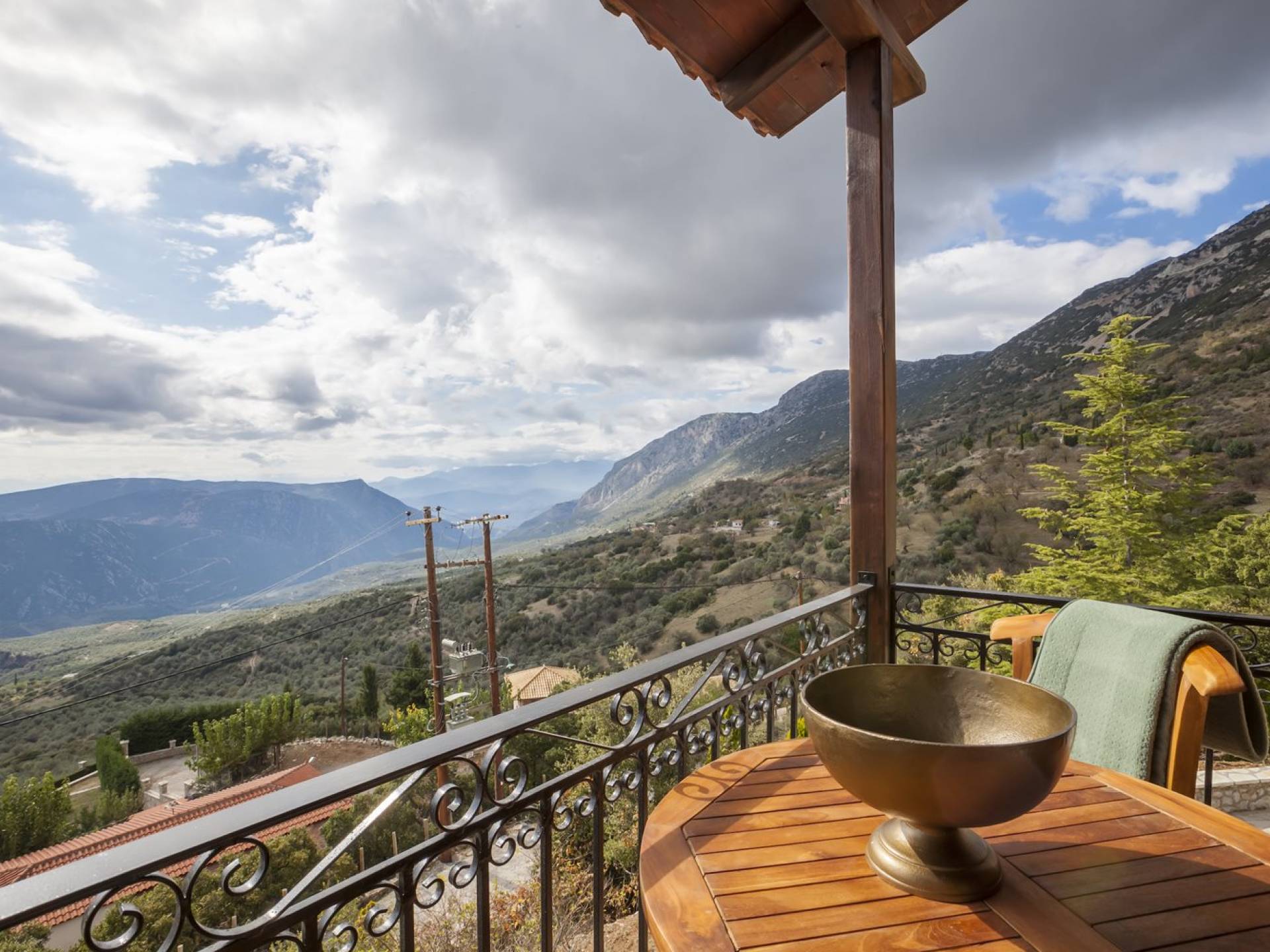 Η θέα από τα μπαλκόνια και τη βεράντα κόβει την ανάσα. Βρίσκεσαι σε υψόμετρο 900+ μέτρων και είναι σαν να απολαμβάνεις τον ήλιο και τα σύννεφα από πρώτη θέση. Η διακόσμηση είναι ιδιαίτερα εκλεπτυσμένη με την ενοχλητική πολυτέλεια που προκαλεί ζεστασιά και φινέτσα. Το σπίτι είναι εξοπλισμένο με hi-fi, τηλεοράσεις τελευταίου τύπου, ηλεκτρική κουζίνα, φούρνο μικροκυμάτων, κλιματισμό, τζάκι, τοστιέρα, μπόιλερ και όλων των ειδών τα μαγειρικά σκεύη, σάουνα και καμπίνα υδρομασάζ για όσους αναζητούν χαλάρωση και αποτοξίνωση 100%.