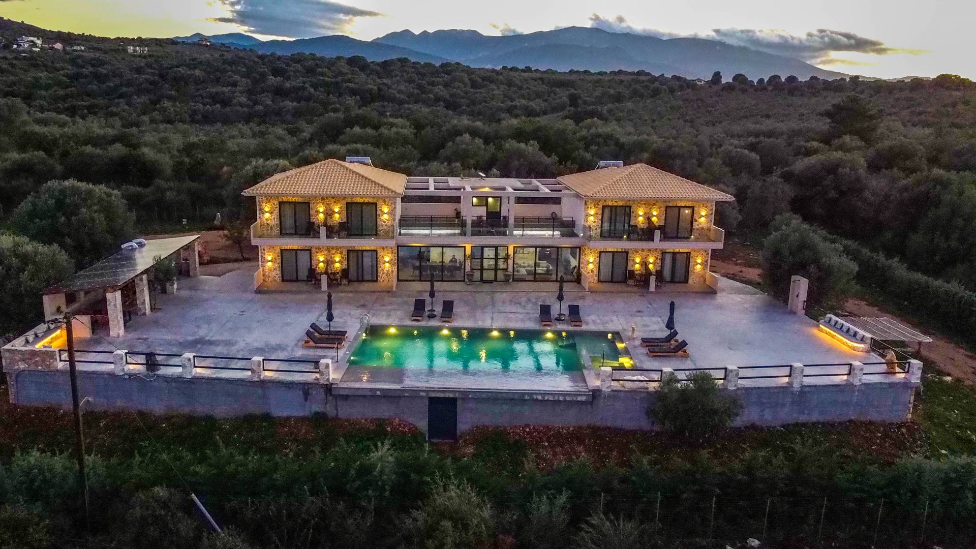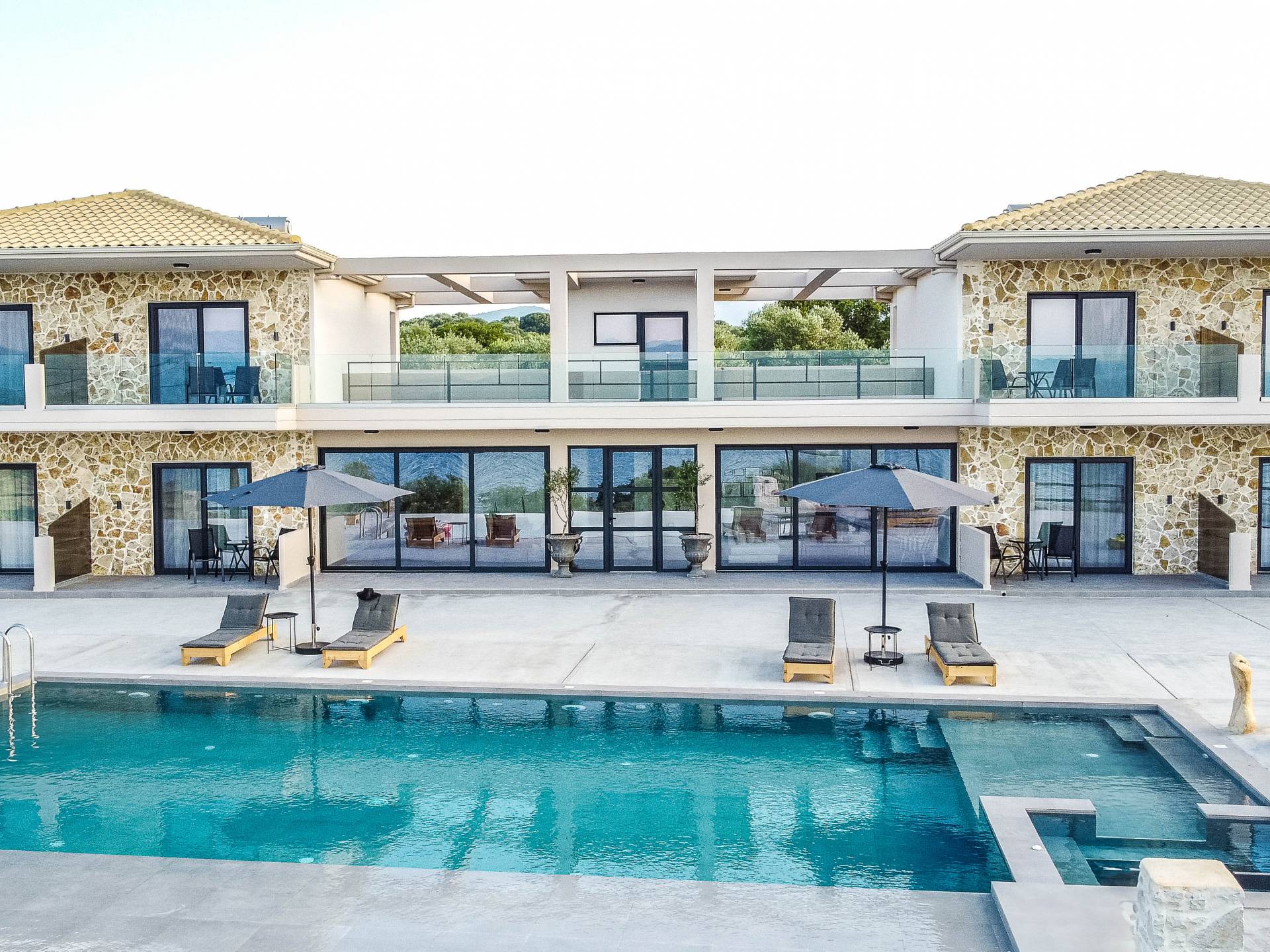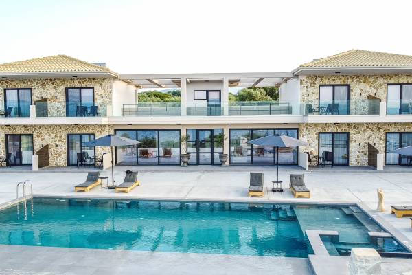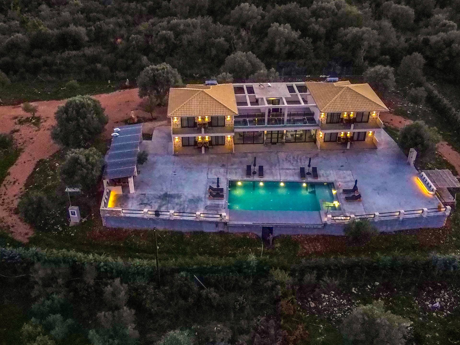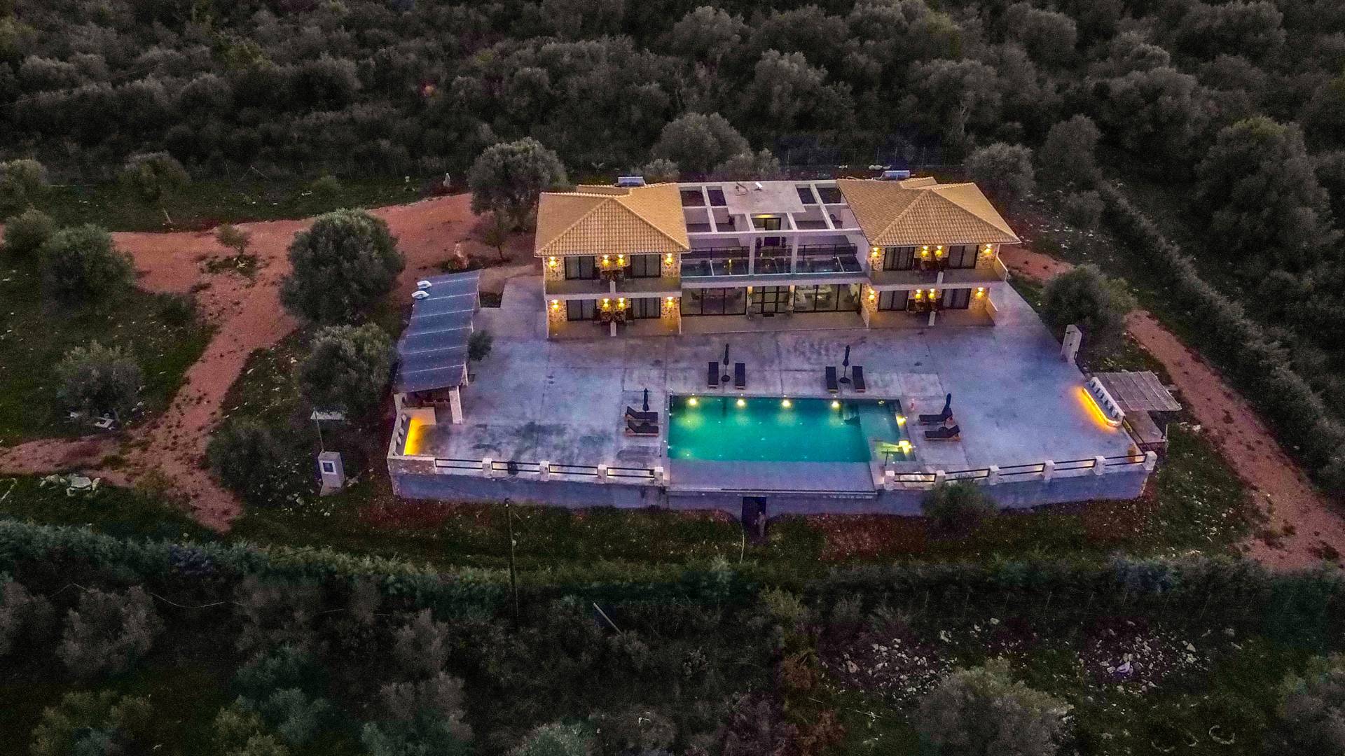 Εξωτερικά, η βίλα προσφέρει μια εντυπωσιακή πισίνα υπερχείλισης διαστάσεων 14 επί 7 μέτρα με ενσωματωμένο τζακούζι, υπαίθριο ντους και σκιερούς χώρους αναψυχής σχεδιασμένους για χαλάρωση και ψυχαγωγία. Οι επισκέπτες μπορούν να απολαύσουν ένα σκιερό υπαίθριο χώρο μαγειρέματος με μπάρμπεκιου και παραδοσιακό ξυλόφουρνο, μια μεγάλη σκιασμένη ξύλινη τραπεζαρία και καθιστικό για έως και 20 άτομα, ένα σκιερό υπαίθριο μπαρ, δύο πετρόχτιστους πάγκους, οκτώ ξαπλώστρες και τέσσερις ομπρέλες. Η ιδιωτική παραλία απέχει μόλις 100 μέτρα, προσφέροντας άμεση και εύκολη πρόσβαση από το κτήμα.