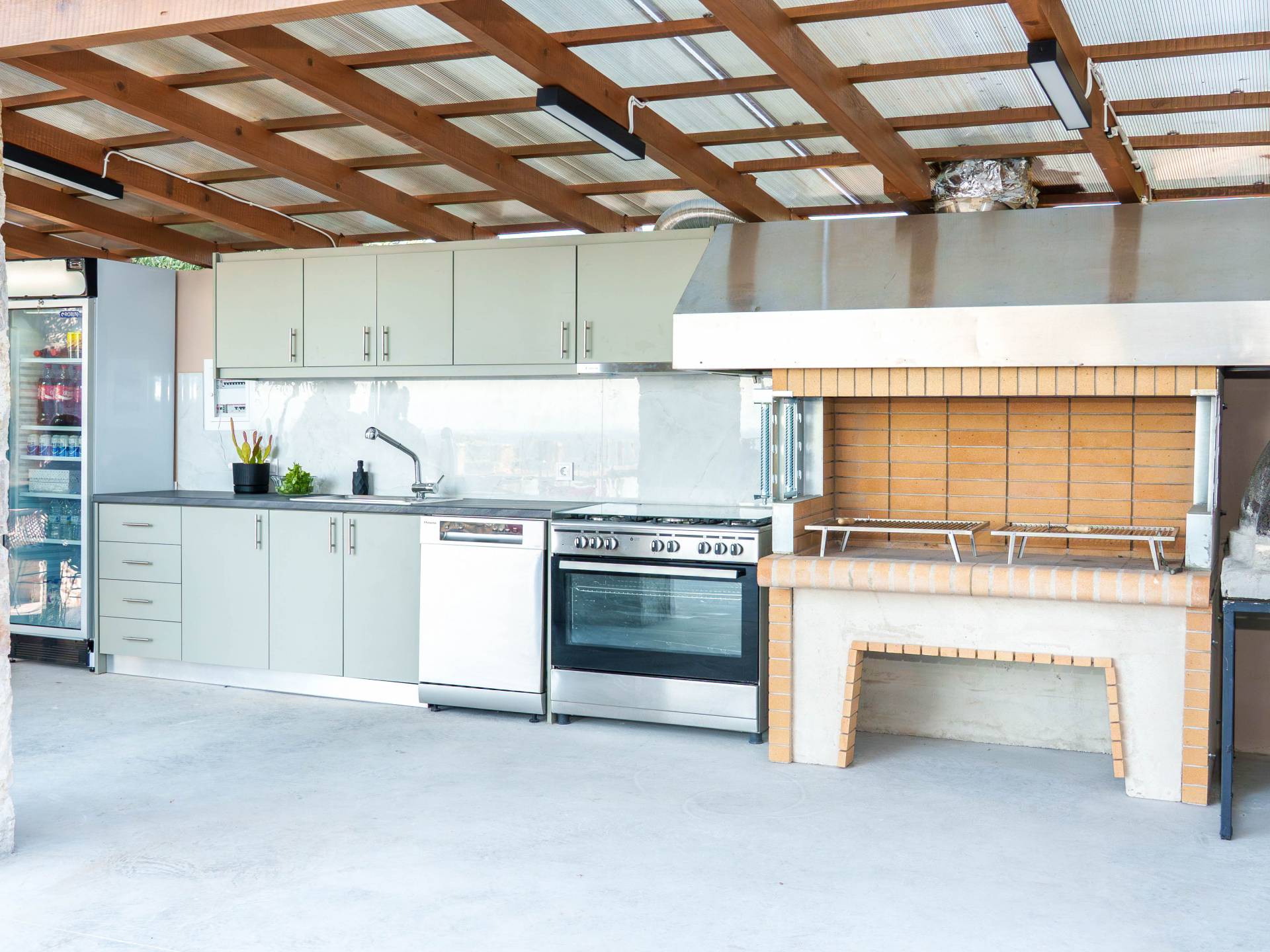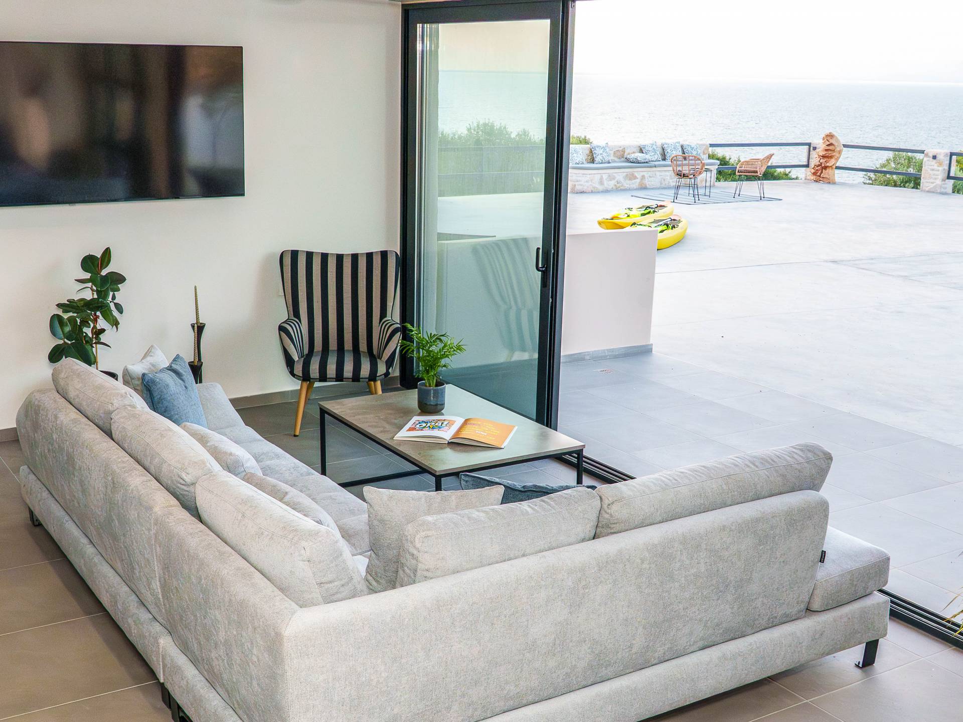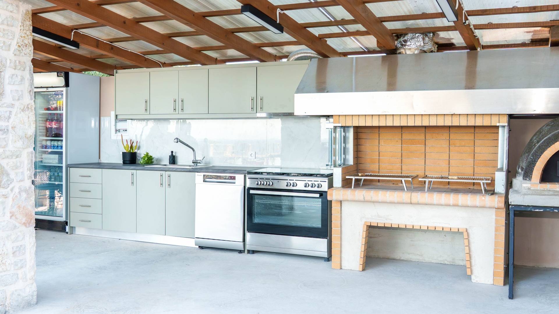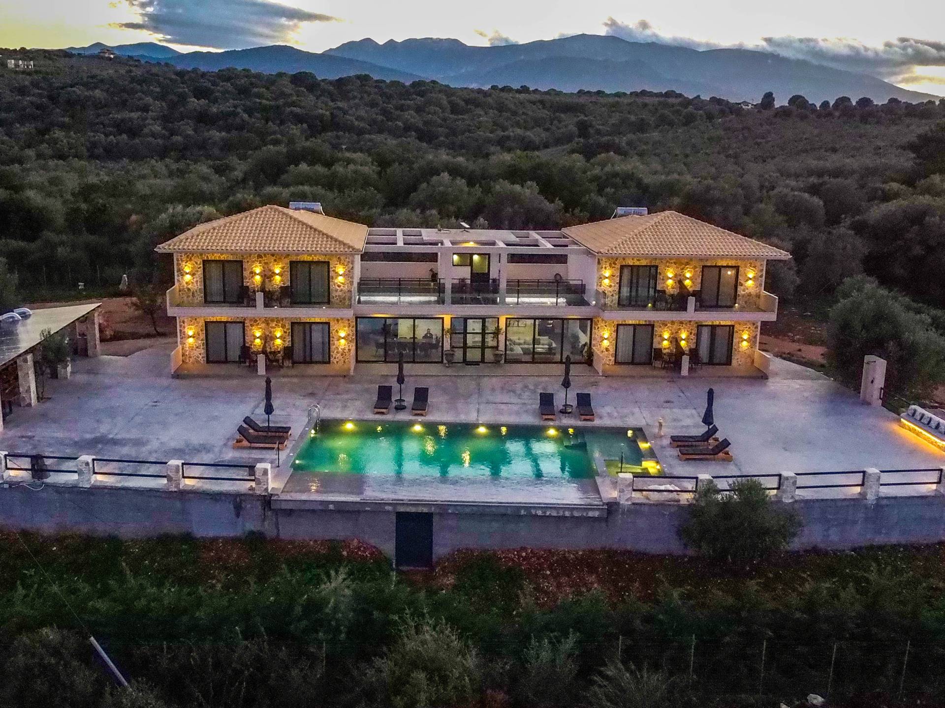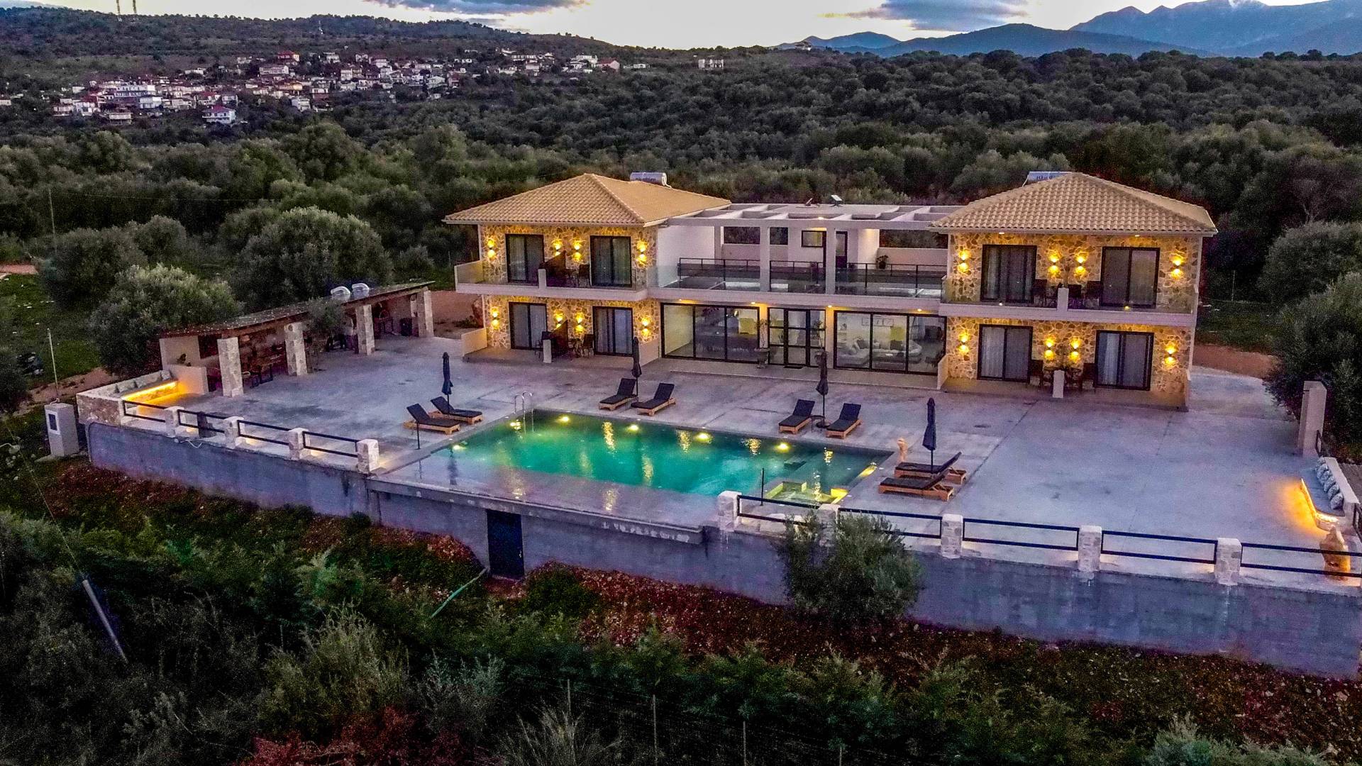 Εξωτερικά, η βίλα προσφέρει μια εντυπωσιακή πισίνα υπερχείλισης διαστάσεων 14 επί 7 μέτρα με ενσωματωμένο τζακούζι, υπαίθριο ντους και σκιερούς χώρους αναψυχής σχεδιασμένους για χαλάρωση και ψυχαγωγία. Οι επισκέπτες μπορούν να απολαύσουν ένα σκιερό υπαίθριο χώρο μαγειρέματος με μπάρμπεκιου και παραδοσιακό ξυλόφουρνο, μια μεγάλη σκιασμένη ξύλινη τραπεζαρία και καθιστικό για έως και 20 άτομα, ένα σκιερό υπαίθριο μπαρ, δύο πετρόχτιστους πάγκους, οκτώ ξαπλώστρες και τέσσερις ομπρέλες. Η ιδιωτική παραλία απέχει μόλις 100 μέτρα, προσφέροντας άμεση και εύκολη πρόσβαση από το κτήμα.