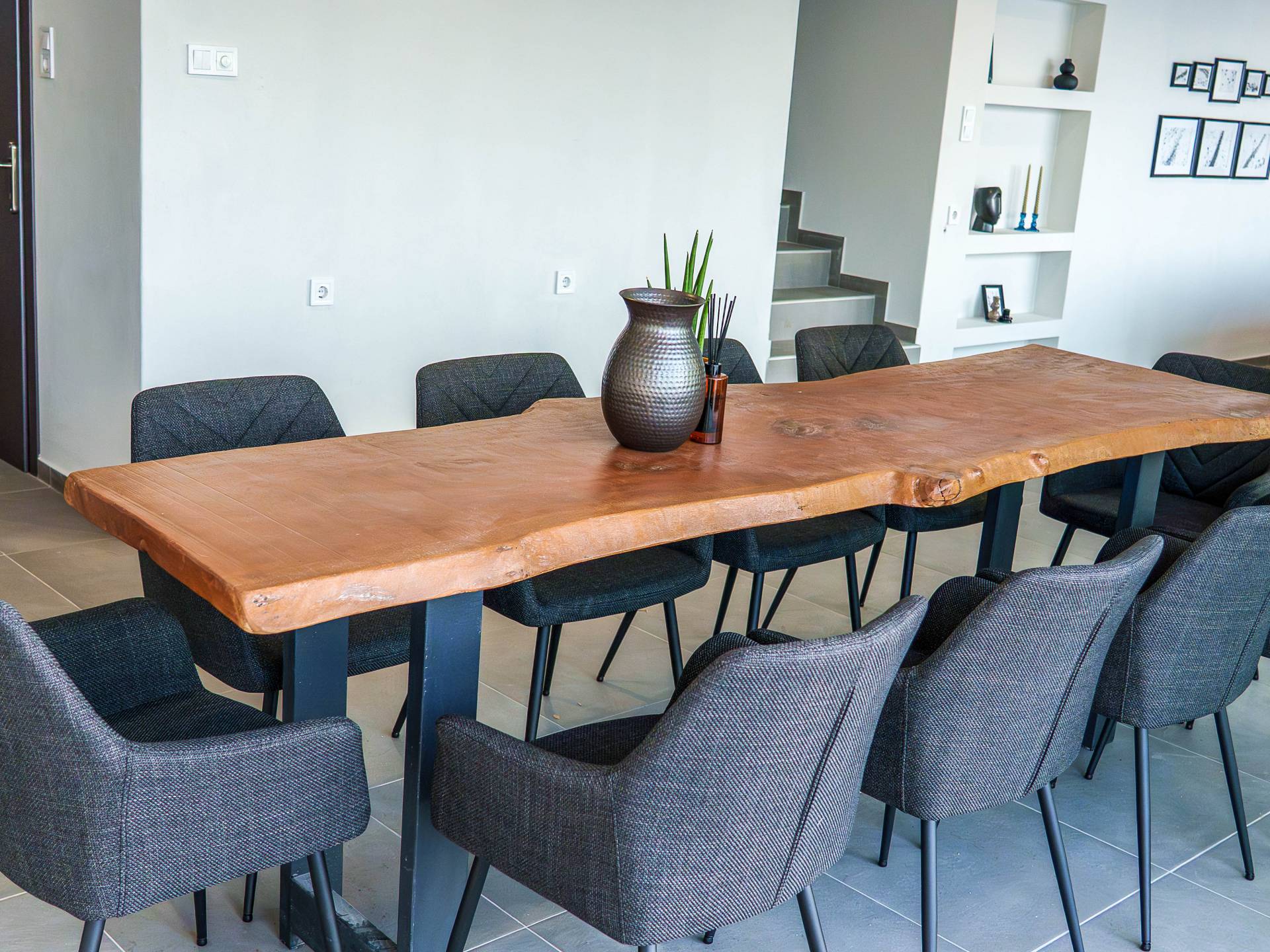 Οι κοινόχρηστοι εσωτερικοί χώροι περιλαμβάνουν μια πλήρως εξοπλισμένη κουζίνα, μια ευρύχωρη ξύλινη τραπεζαρία που μπορεί να φιλοξενήσει έως και 18 άτομα και ένα άνετο καθιστικό με τηλεόραση smart 65 ιντσών. Διατίθεται καναπές-κρεβάτι για έως δύο επιπλέον επισκέπτες κατόπιν αιτήματος. Στο ισόγειο, υπάρχουν επίσης δύο επιπλέον κοινά μπάνια, συμπεριλαμβανομένου ενός WC και ενός WC για ΑΜΕΑ.