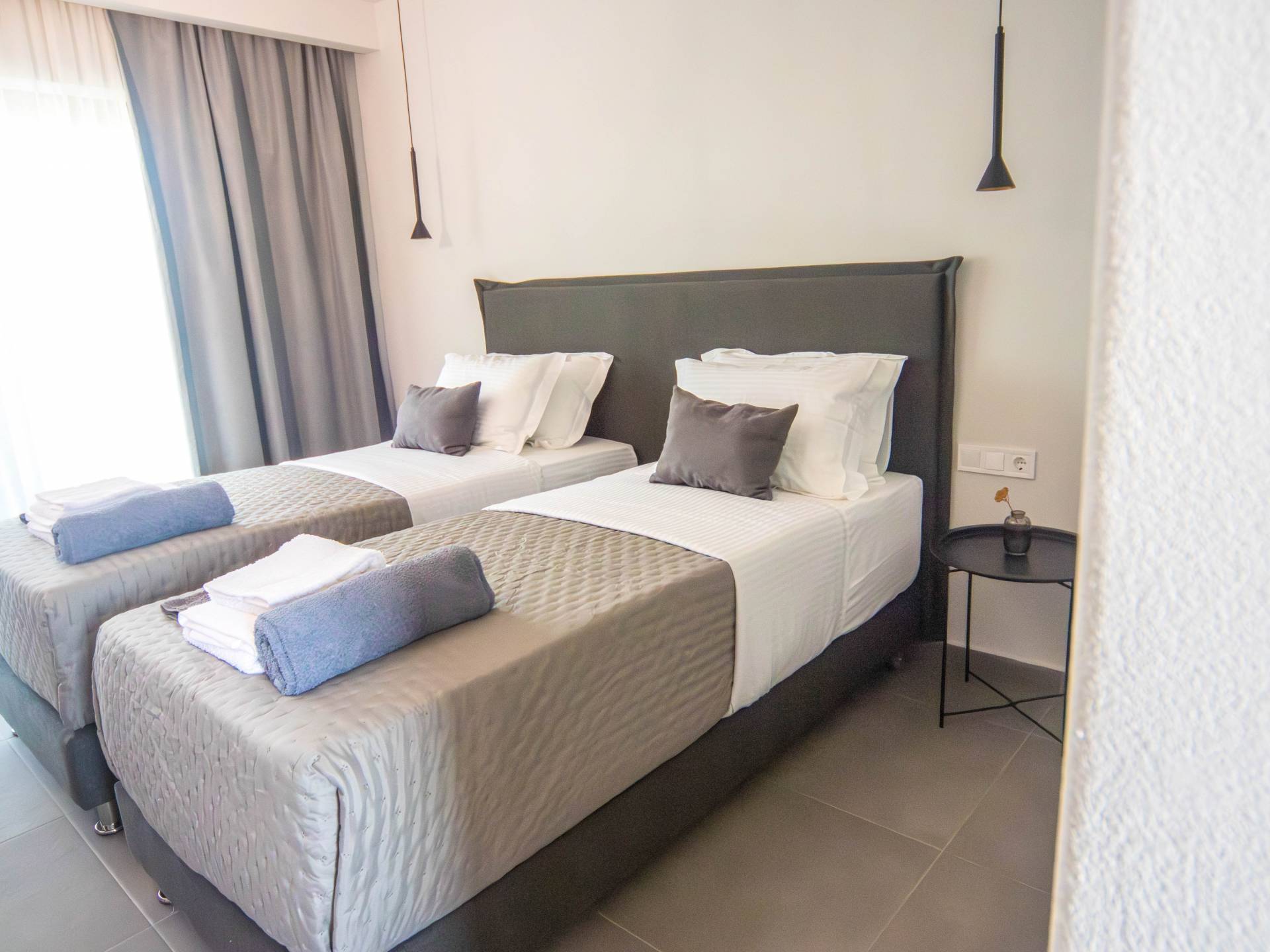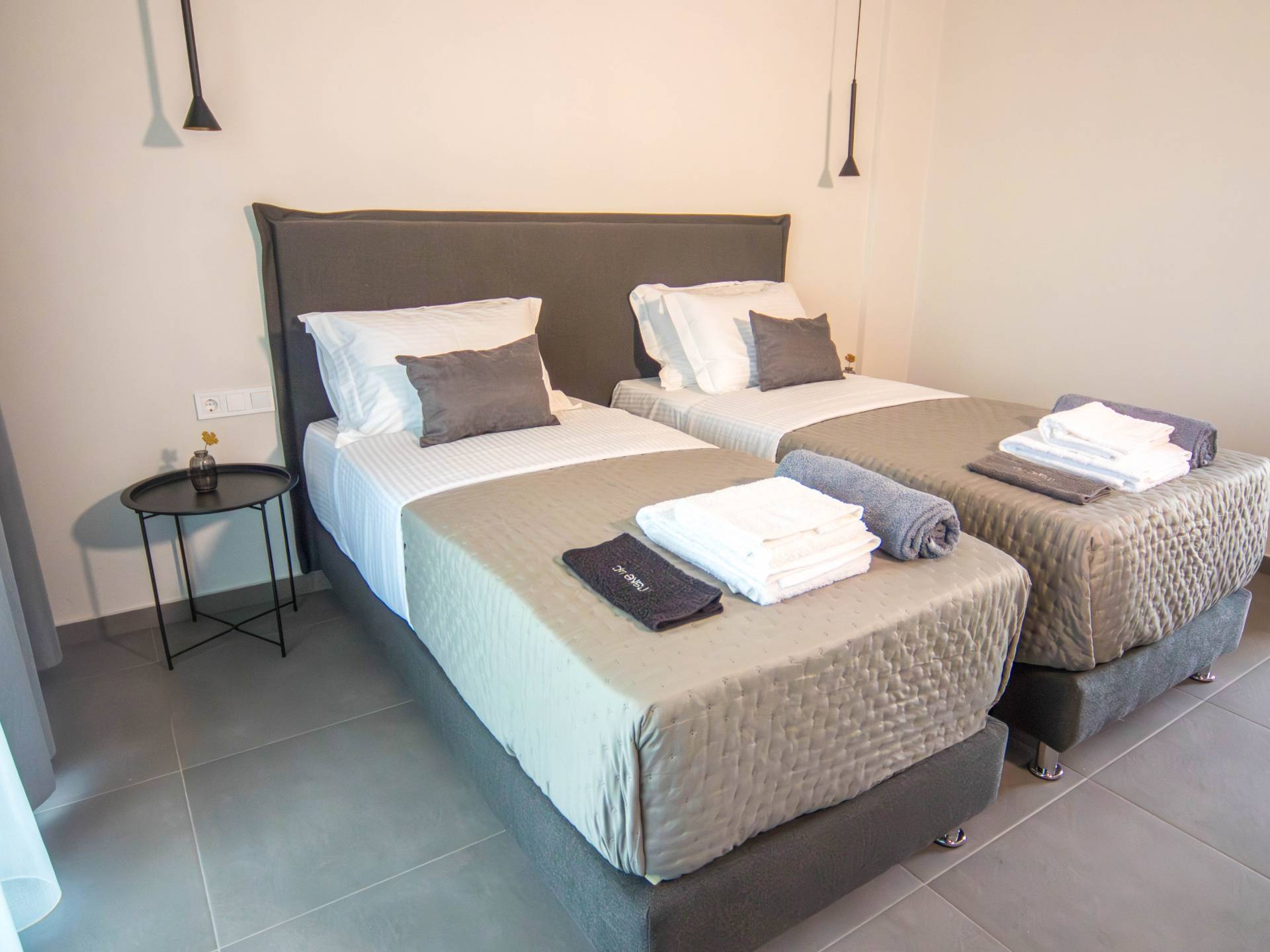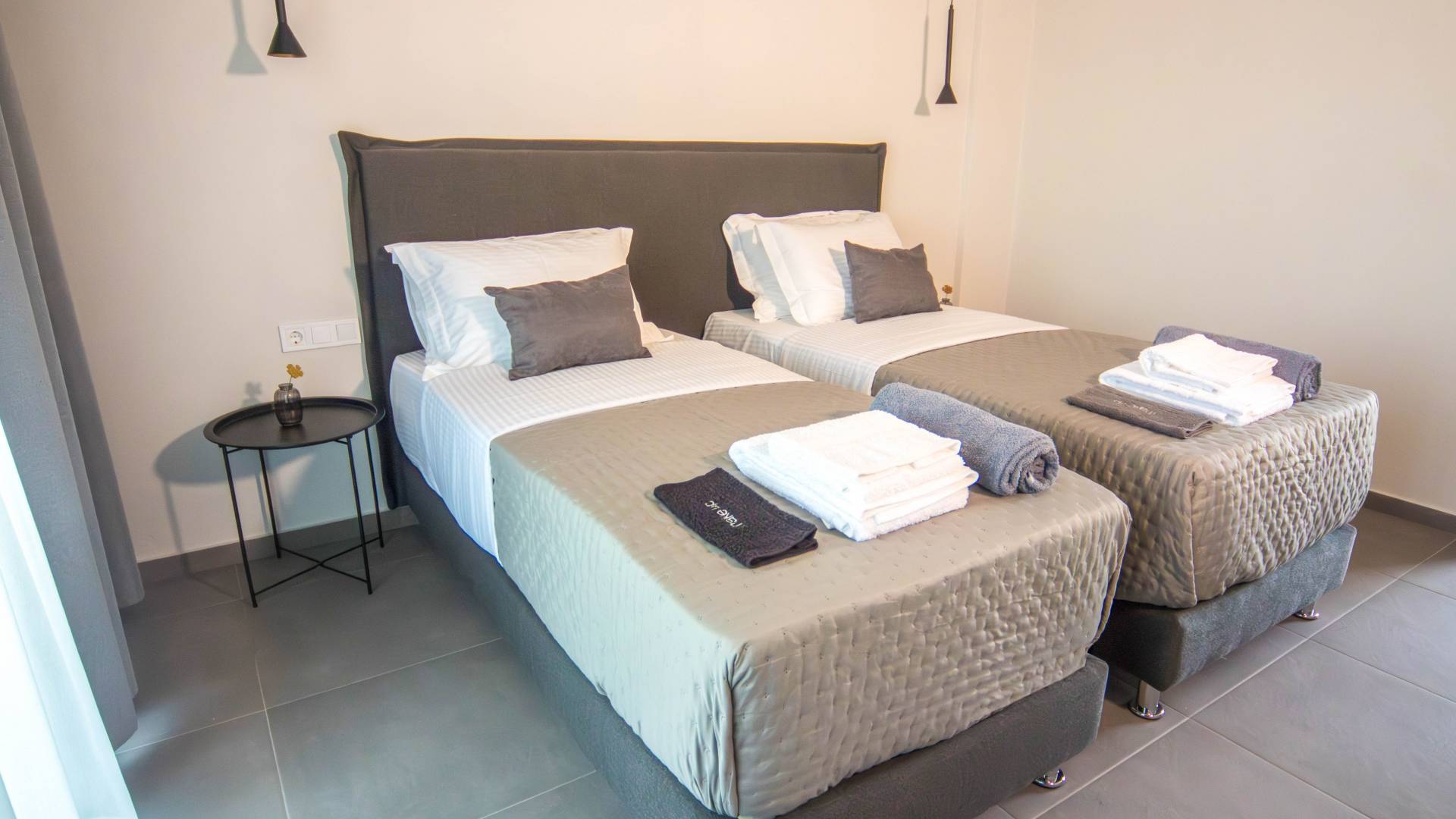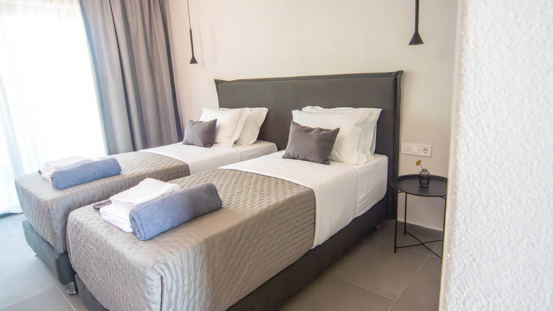 Το ισόγειο διαθέτει τέσσερα κομψά δίκλινα υπνοδωμάτια, το καθένα εμβαδού 26 τετραγωνικών μέτρων και επιπλωμένο με κρεβάτι king-size (180×200). Κάθε υπνοδωμάτιο περιλαμβάνει ιδιωτικό μπάνιο με ντους και δύο ιδιωτικά μπαλκόνια: ένα μπροστινό μπαλκόνι 10 τετραγωνικών μέτρων με εκπληκτική θέα στη θάλασσα και την πισίνα και ένα πίσω μπαλκόνι 3 τετραγωνικών μέτρων με ήρεμη θέα στο βουνό. Ο πρώτος όροφος αντικατοπτρίζει την ίδια διάταξη, προσφέροντας τέσσερα επιπλέον δίκλινα υπνοδωμάτια πανομοιότυπου μεγέθους, ανέσεις και πανοραμική θέα στο μπαλκόνι. Σε τέσσερα από τα υπνοδωμάτια, το κρεβάτι king-size μπορεί να μετατραπεί σε δύο μονά κρεβάτια (90×200) κατόπιν αιτήματος, παρέχοντας ευέλικτο κατάλυμα για διαφορετικές ανάγκες της ομάδας.