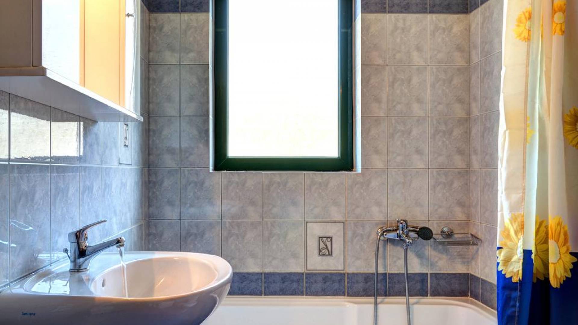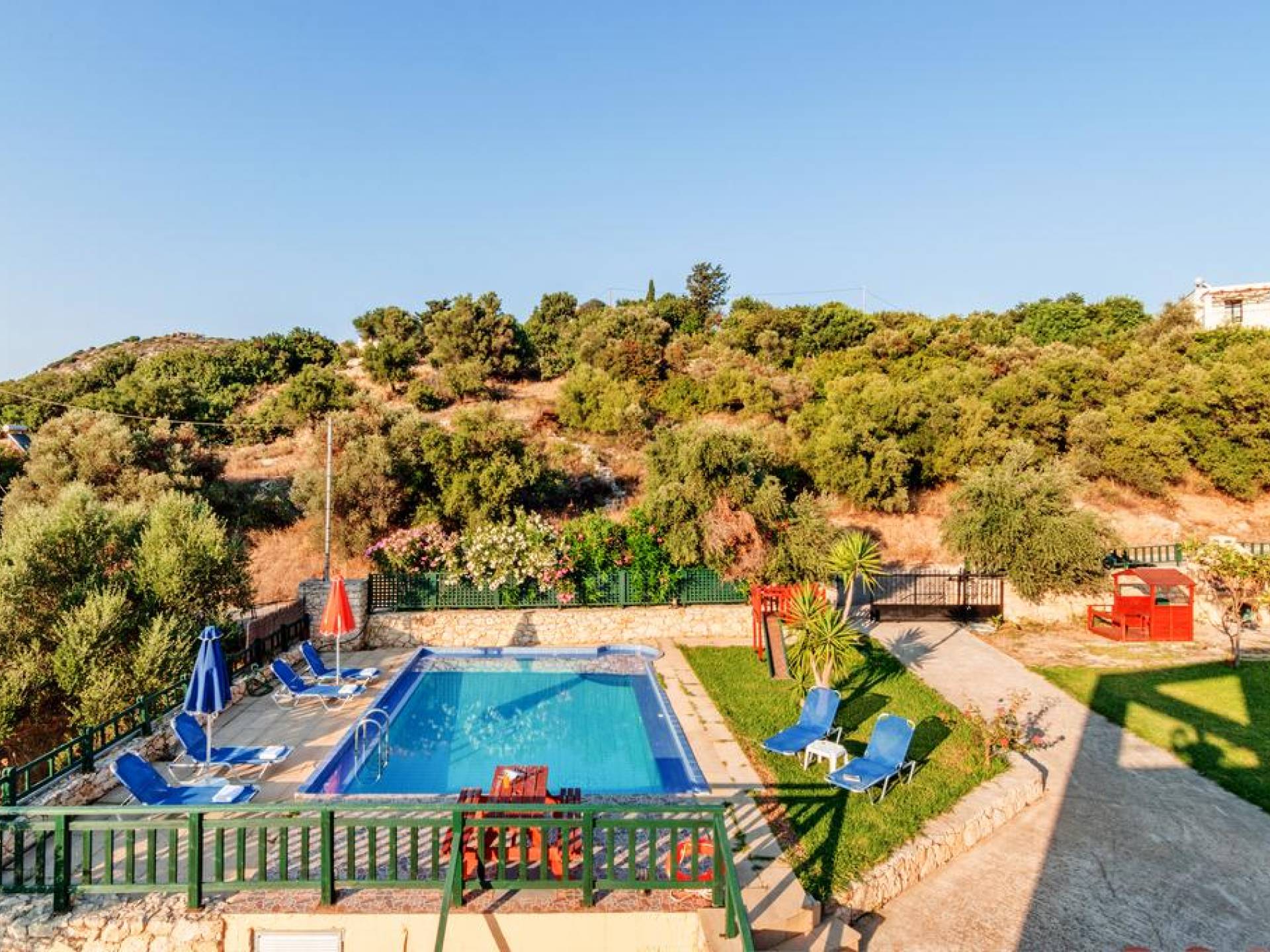 Υπάρχει ένας πέτρινος τοίχος που περιβάλλει τον ιδιωτικό χώρο γύρω από τη βίλα, που παρόλο που είναι κοντά στο χωριό δίνει την αίσθηση της εξοχής. Η βίλα και ο ξεχωριστός χώρος του αίθριου της πισίνας είναι στολισμένοι με ελαιώνες, αμυγδαλιές, αγριοκερασιές και αμπελώνα. Η υπερυψωμένη βεράντα της πισίνας περιβάλλεται από γκαζόν και ελαιόδεντρα και επίσης χαμηλό πέτρινο τοίχο και ξύλινα κιγκλιδώματα για να διασφαλίζεται η ασφάλεια των νεότερων μελών της οικογένειας, ενώ δεν αλλοιώνεται η όμορφη θέα. Τα δέντρα προσφέρουν σκιά στον κήπο, γεγονός που τον κάνει ιδανικό για χαλάρωση τις ζεστές μέρες του καλοκαιριού, διαβάζοντας ένα βιβλίο.