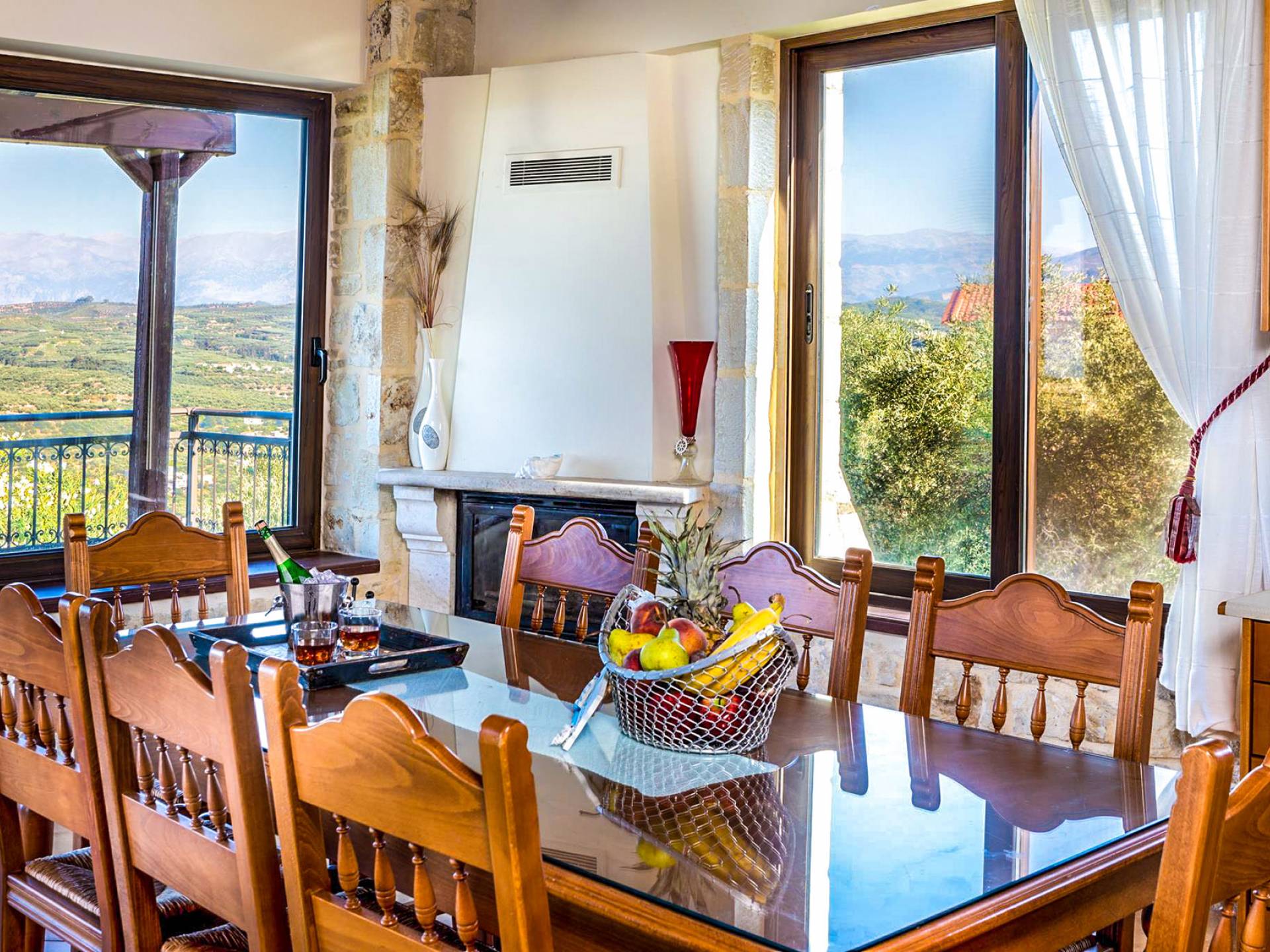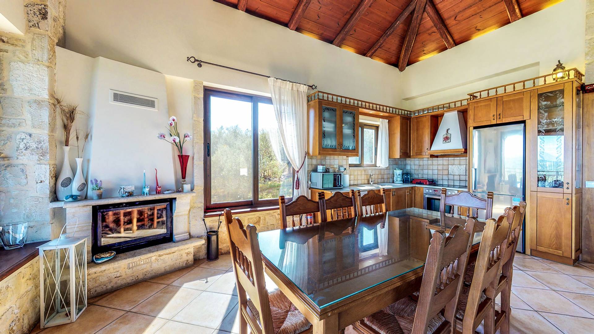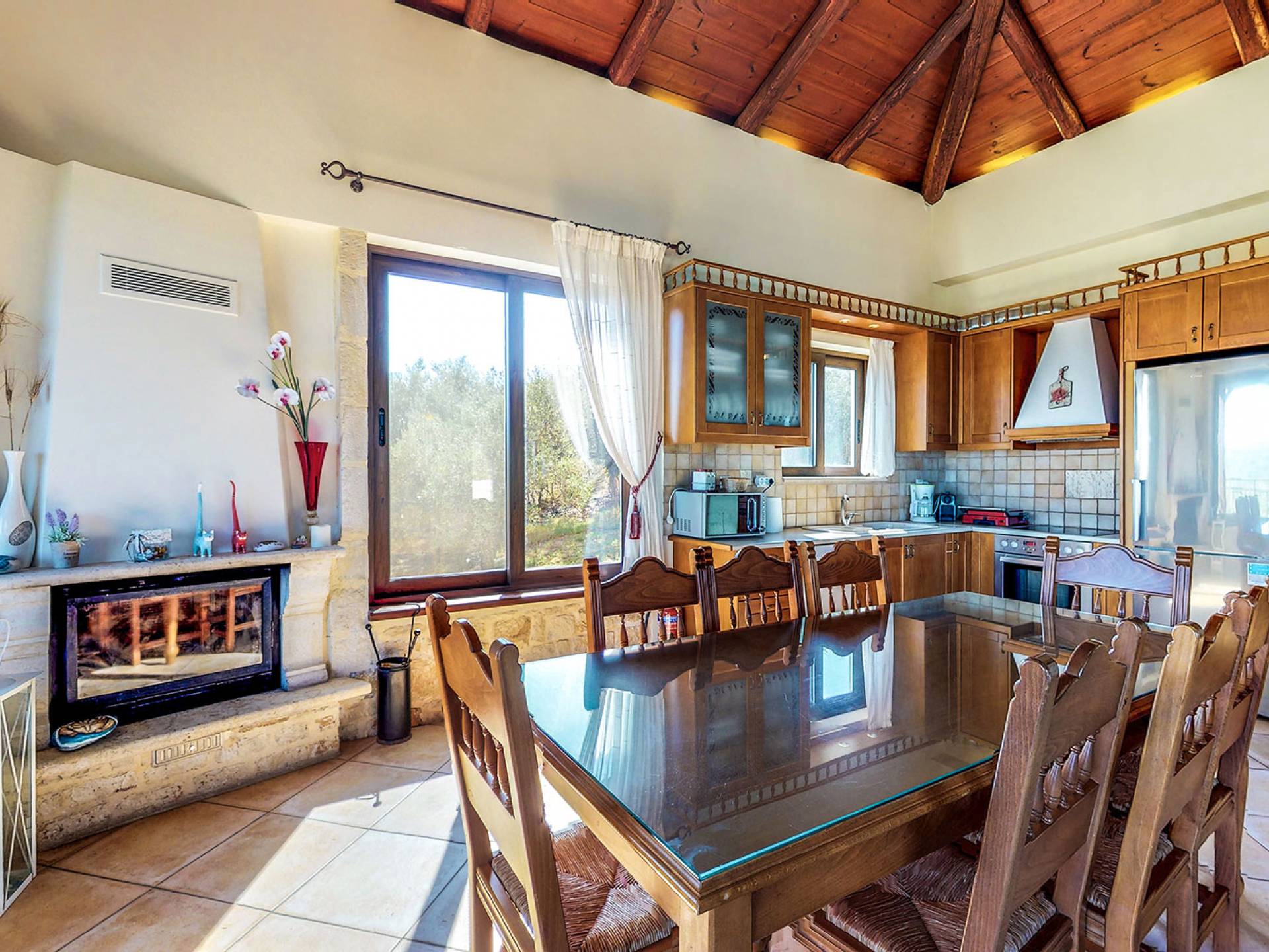 - Ανοιχτό σχέδιο και τραπεζαρία με τζάκι και ζεστούς καναπέδες.
