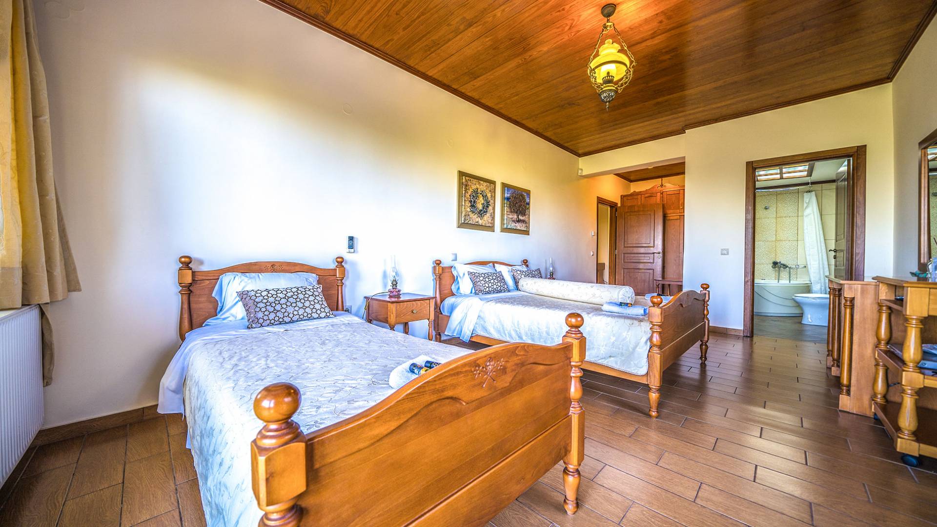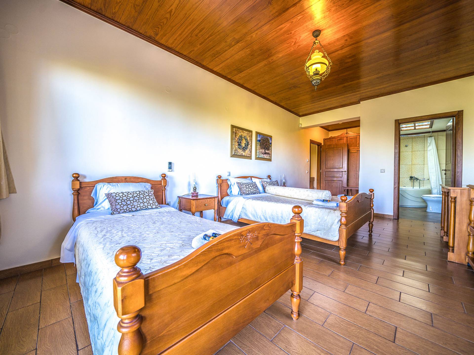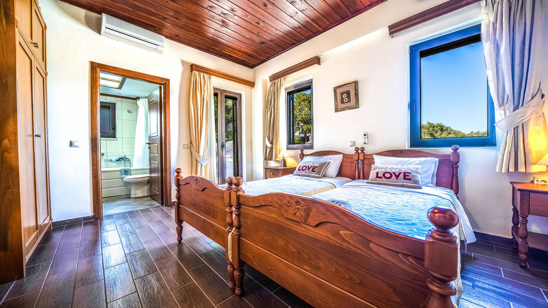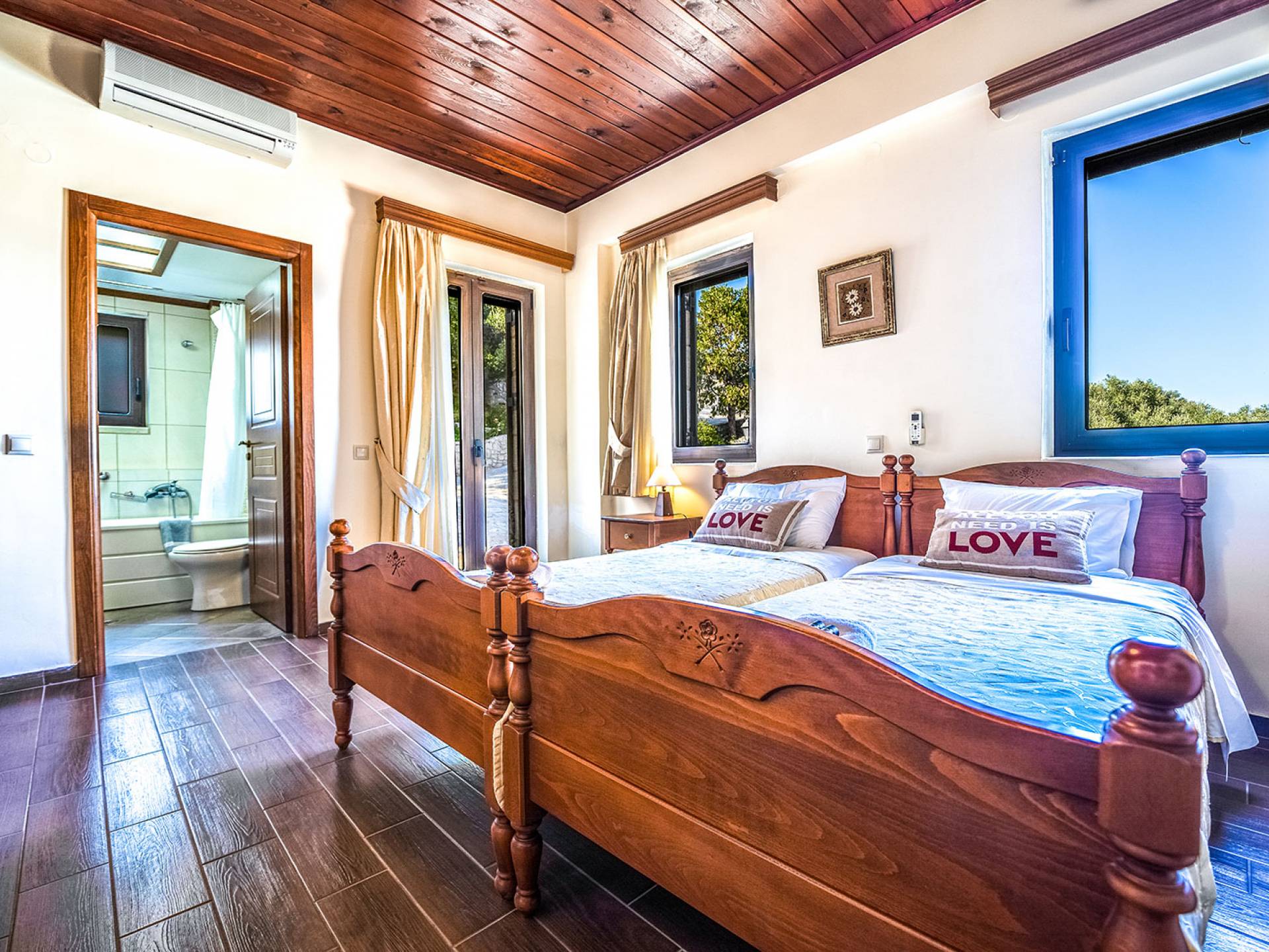 - Υπνοδωμάτιο 2 με δύο μονά κρεβάτια, μπάνιο με υδροηλεκτρική μάζα και ιδιωτική αίθριο και άμεση πρόσβαση στην πισίνα.