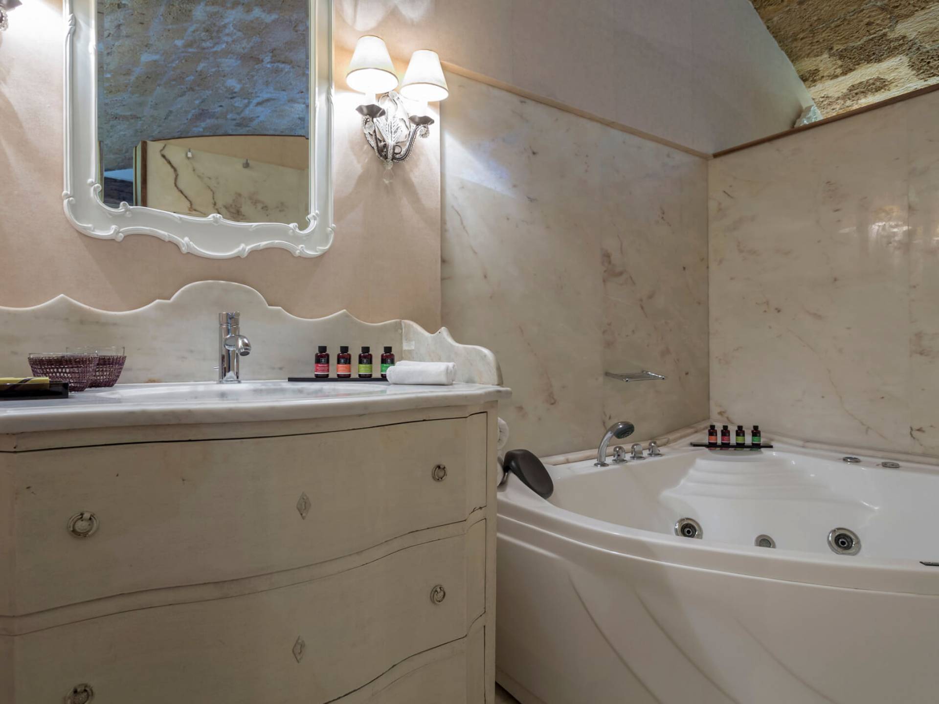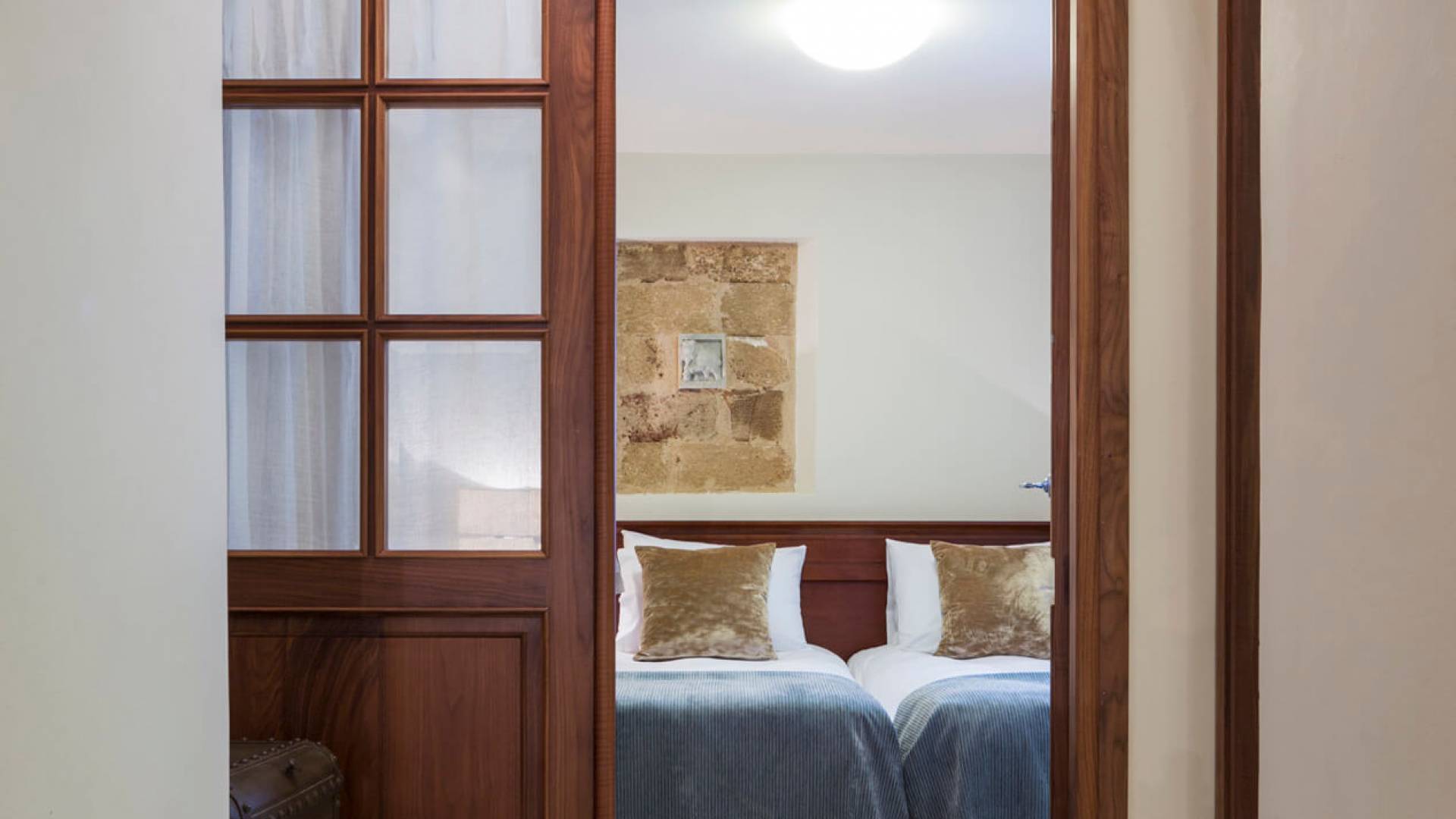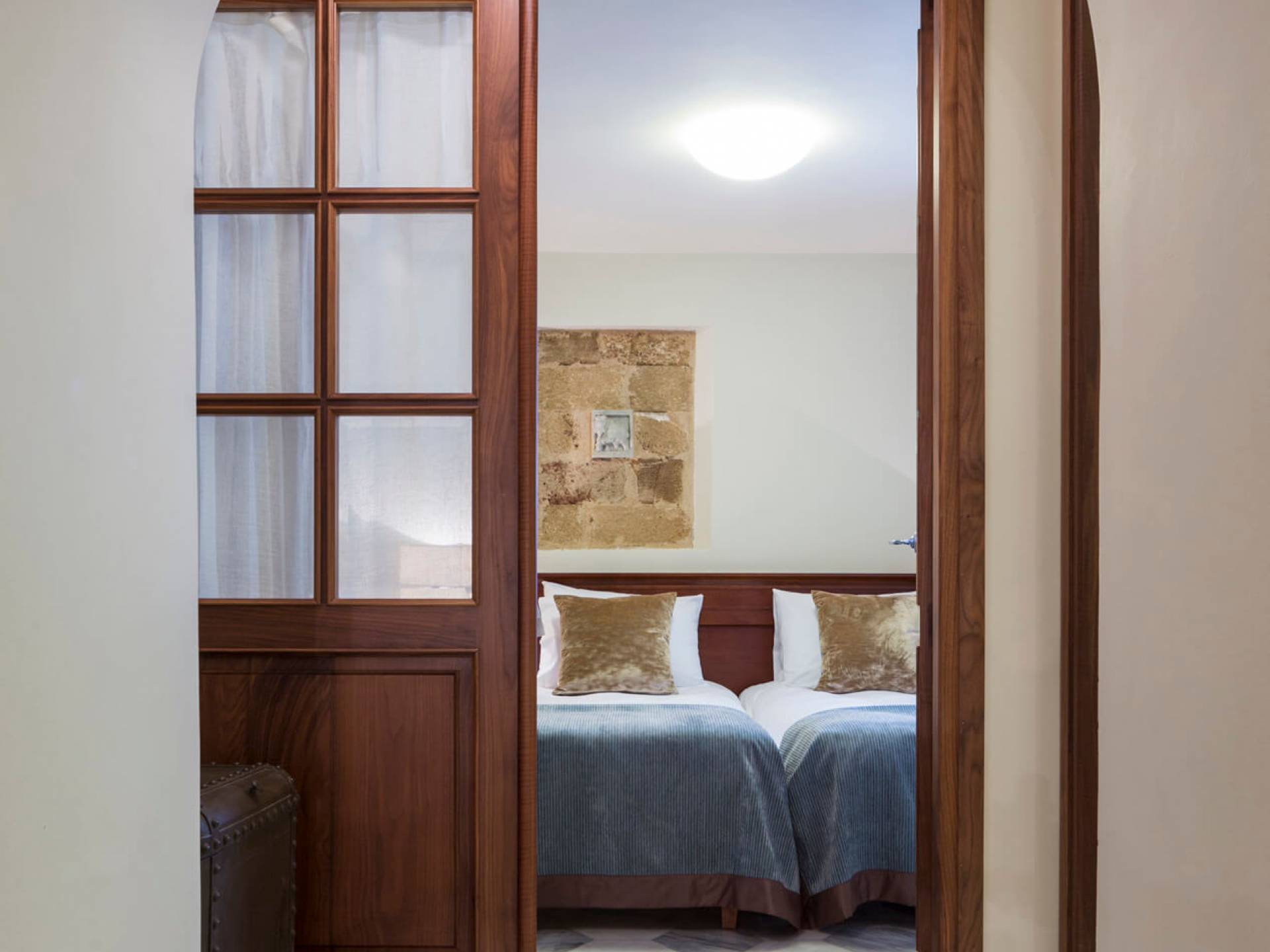 Εξαιρετικά ευχάριστη, η Master Σουίτα περιλαμβάνει κομψό σαλόνι, καθώς και ξεχωριστό καμαρίνι. Το υπνοδωμάτιο, που οδηγεί στην αυλή, διαθέτει θολωτή οροφή και εκτεθειμένη λιθοδομή. Κρυμμένο πίσω από το κρεβάτι king size είναι ένα μεγάλο τζακούζι. Το δεύτερο υπνοδωμάτιο διαθέτει δύο μονά κρεβάτια και ένα μπάνιο (με ντους). Μια πόρτα χωρίζει το κυρίως υπνοδωμάτιο από το δεύτερο για απόλυτη ιδιωτικότητα.