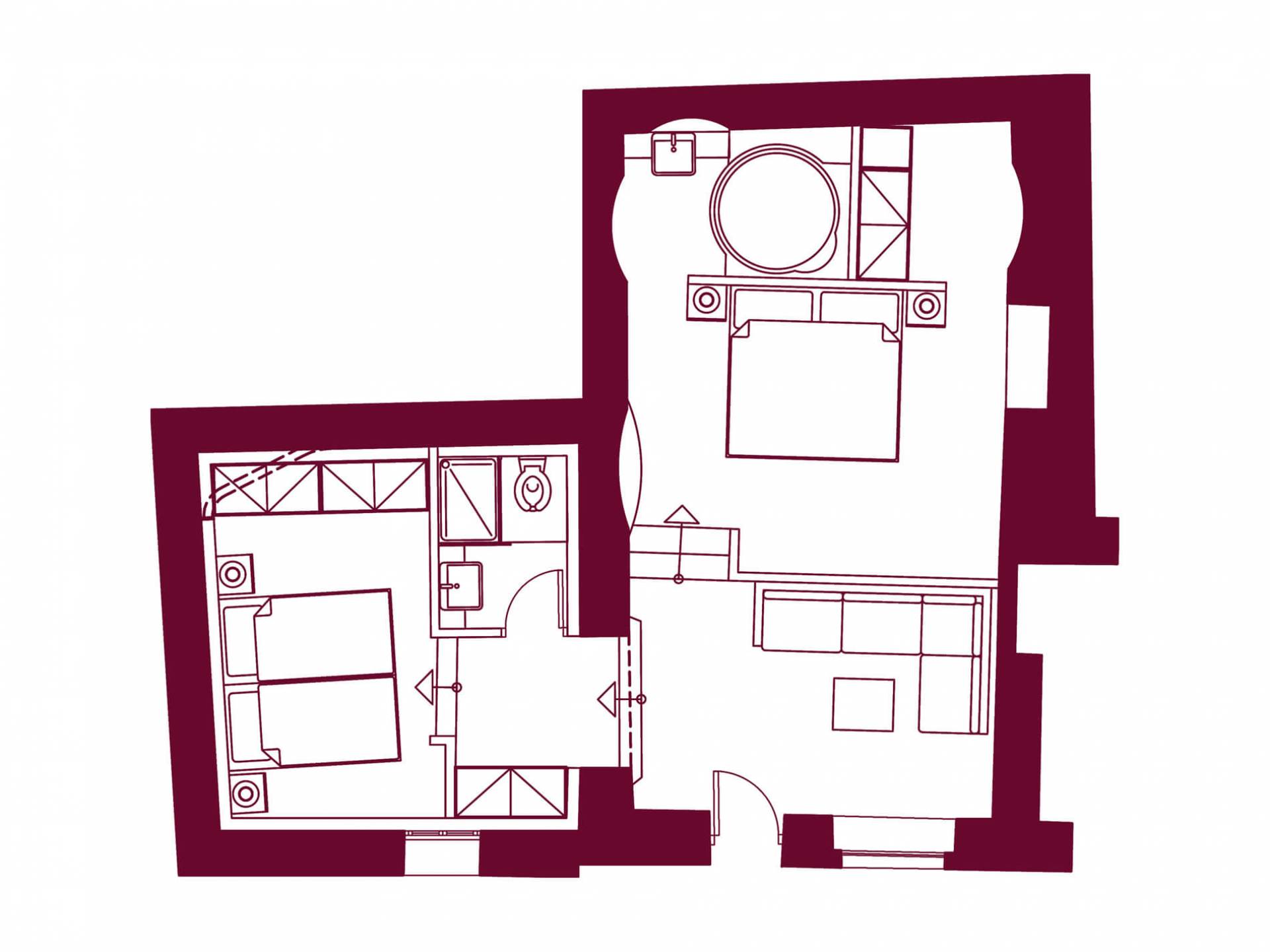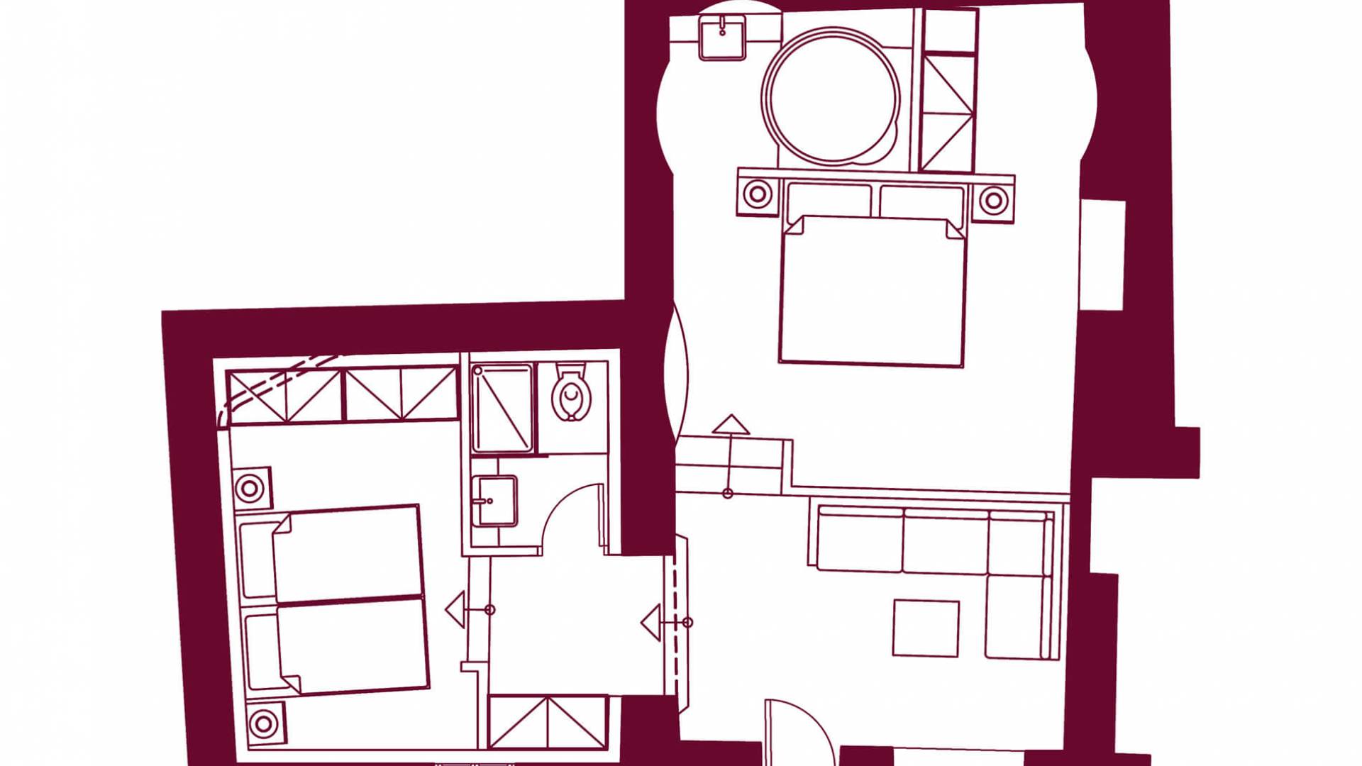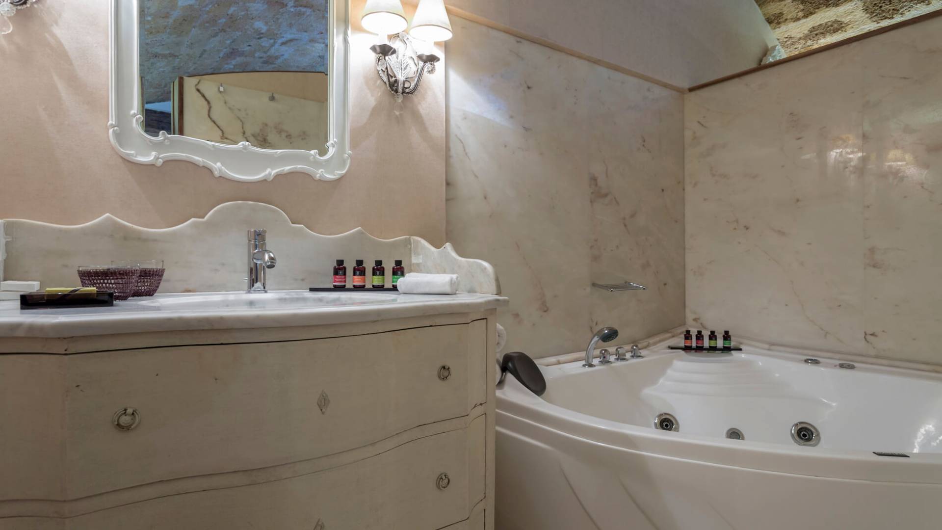 Εξαιρετικά ευχάριστη, η Master Σουίτα περιλαμβάνει κομψό σαλόνι, καθώς και ξεχωριστό καμαρίνι. Το υπνοδωμάτιο, που οδηγεί στην αυλή, διαθέτει θολωτή οροφή και εκτεθειμένη λιθοδομή. Κρυμμένο πίσω από το κρεβάτι king size είναι ένα μεγάλο τζακούζι. Το δεύτερο υπνοδωμάτιο διαθέτει δύο μονά κρεβάτια και ένα μπάνιο (με ντους). Μια πόρτα χωρίζει το κυρίως υπνοδωμάτιο από το δεύτερο για απόλυτη ιδιωτικότητα.