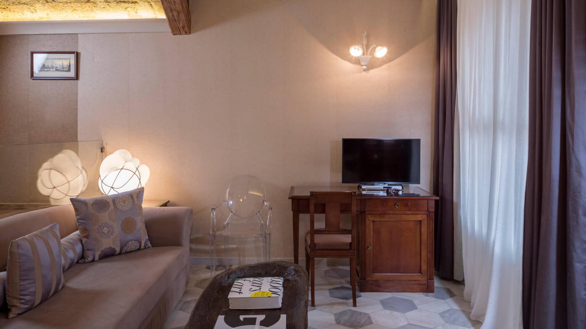 Όλα τα δωμάτια υφαίνουν απρόσκοπτα την αρχιτεκτονική ιστορία με σύγχρονο σχεδιασμό. Από εξατομικευμένα δρομολόγια μέχρι απροσδόκητες απολαύσεις κατά την προετοιμασία, μας αρέσει να χαλάμε τους καλεσμένους μας. Η βοτσαλωτή αυλή του Casa Delfino είναι μια ατμοσφαιρική όαση όπου οι επισκέπτες μπορούν να διαβάσουν, να χαλαρώσουν ή απλά να γευτούν τη γαλήνια ατμόσφαιρα. Βγείτε όμως έξω από αυτό το μαγευτικό περιβάλλον και μπορείτε να έχετε πρόσβαση σε όλα τα κύρια αξιοθέατα, μουσεία, εστιατόρια, κομψά καταστήματα και ζωντανά μπαρ. Το ξενοδοχείο βρίσκεται στην καρδιά της περιτειχισμένης Παλιάς Ενετικής Πόλης - ακόμα έναν κόσμο μακριά.
