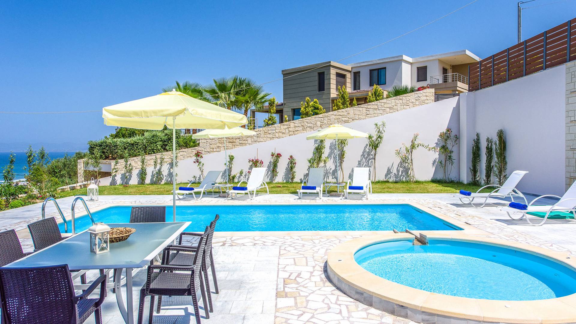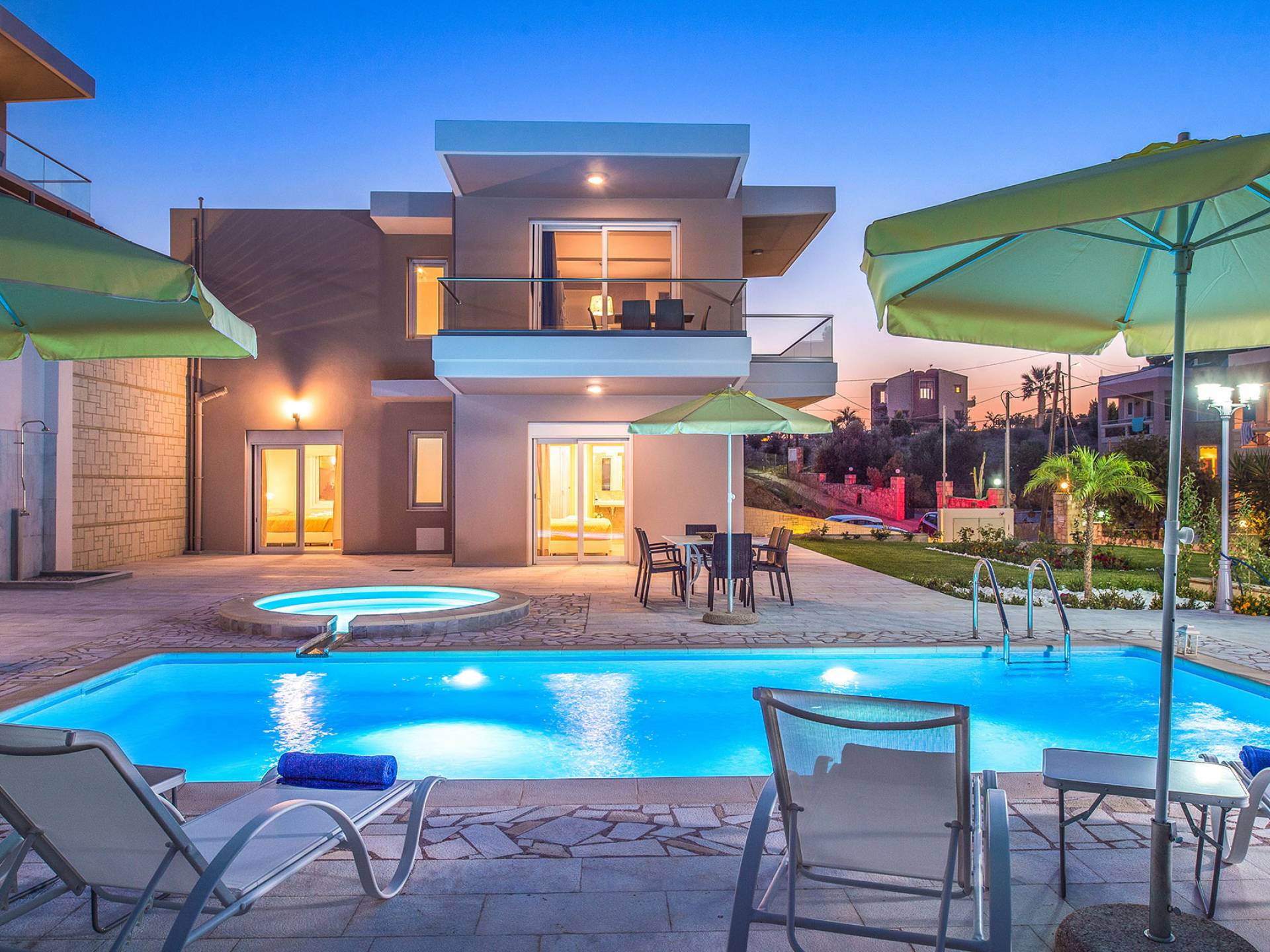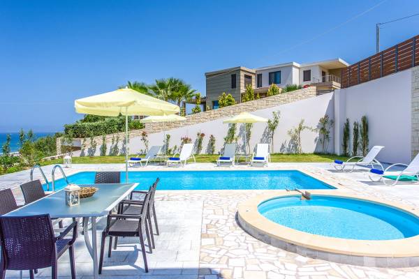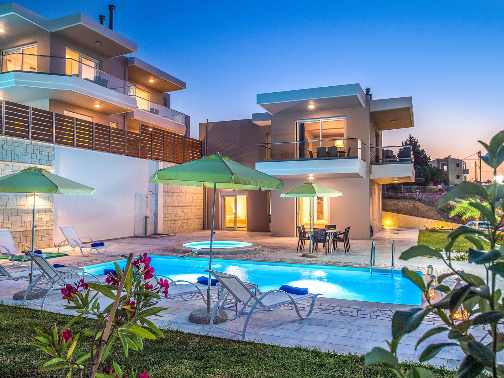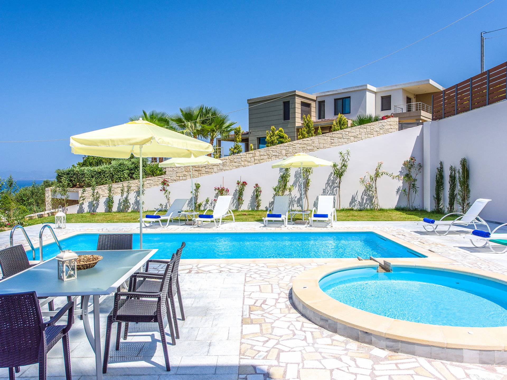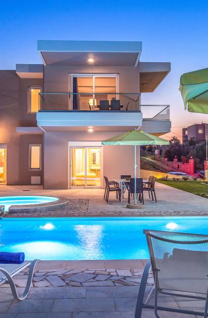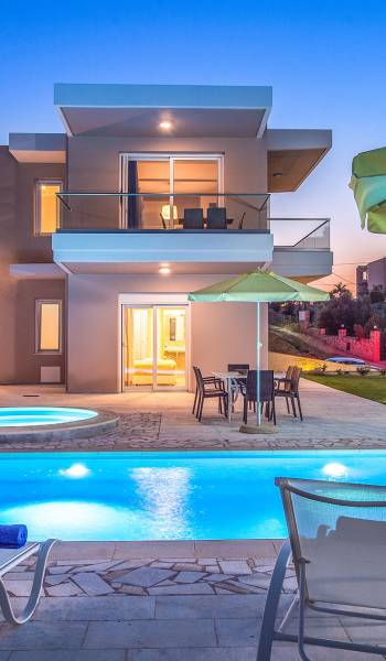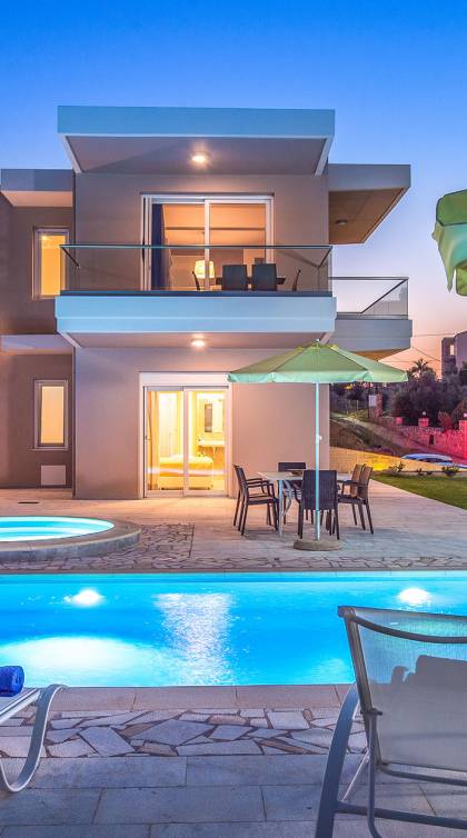 Marjorie Villa Chania: Ανοίγοντας τις πόρτες του αίθριου από τα υπνοδωμάτια, βρίσκετε την ιδιωτική πισίνα που περιβάλλεται από μια ευρύχωρη βεράντα και παρτέρια, με ένα μικρό χώρο με γρασίδι. Υπάρχει ένα φορητό μπάρμπεκιου και εξωτερικό τραπέζι φαγητού και καρέκλες για δείπνο alfresco ενώ παρακολουθείτε το ηλιοβασίλεμα. Μην ξεχνάτε τα μικρά στο πάρτι σας - υπάρχει επίσης ξεχωριστή παιδική πισίνα. Μπαίνοντας στην μπροστινή πόρτα στο κάτω επίπεδο υπάρχει ένας μικρός διάδρομος με 2 πόρτες που οδηγούν στα υπνοδωμάτια. Μια σπειροειδής σκάλα σας μεταφέρει στο σαλόνι με υπέροχη θέα στη θάλασσα που θα βελτιώσει τη διαμονή σας. Στον επάνω όροφο, το ενιαίο σαλόνι είναι ένα τέλειο μέρος για να χαλαρώσετε μακριά από τη ζέστη του ήλιου. Η κομψή, καλαίσθητη επίπλωση και οι δροσεροί ουδέτεροι τόνοι με πιτσιλιές χρώματος δημιουργούν έναν πραγματικά χαλαρό χώρο. Τα 2 μπαλκόνια προσφέρουν θέα στην πισίνα και τον κήπο με απέραντη θέα στο Αιγαίο Πέλαγος.