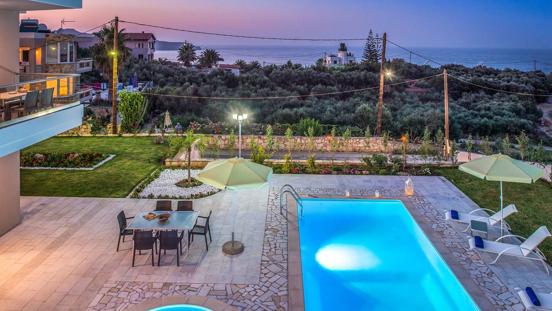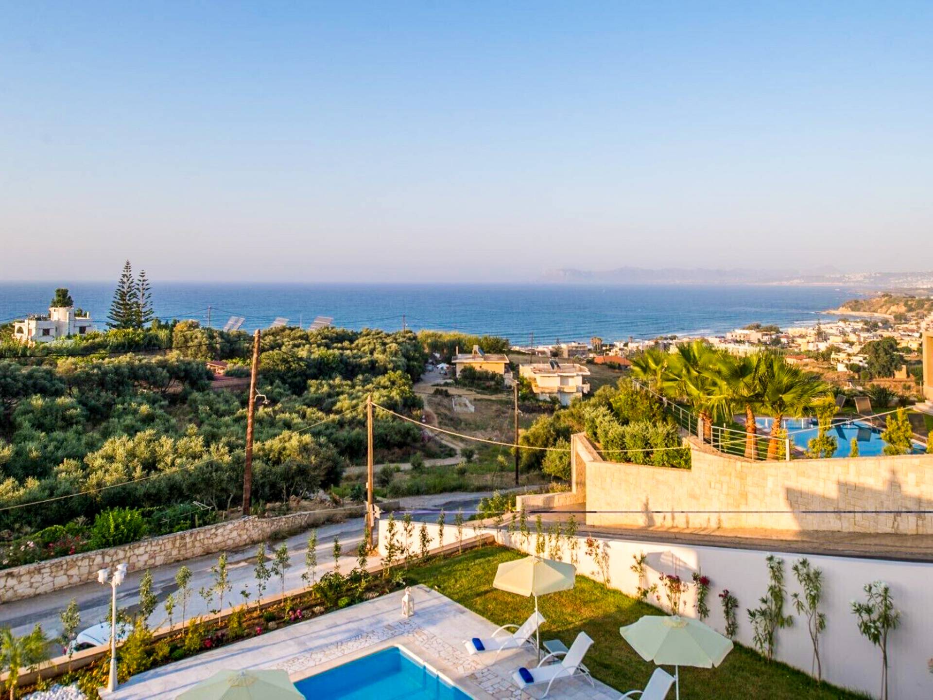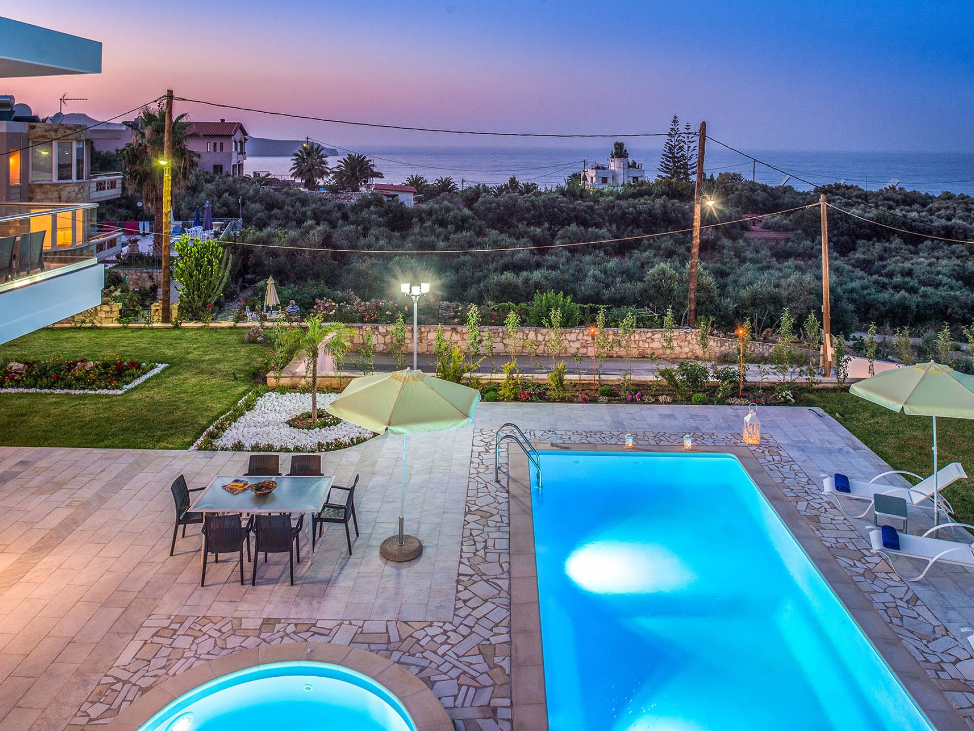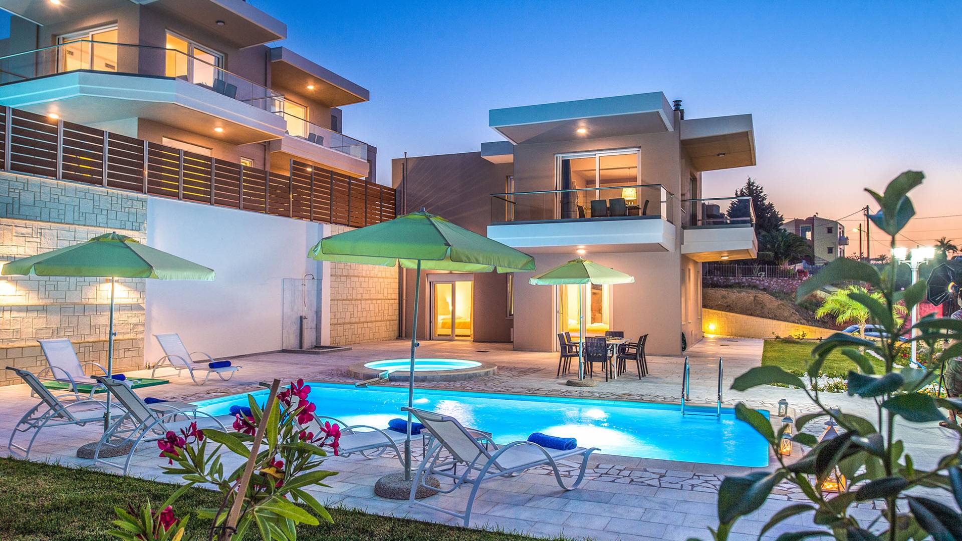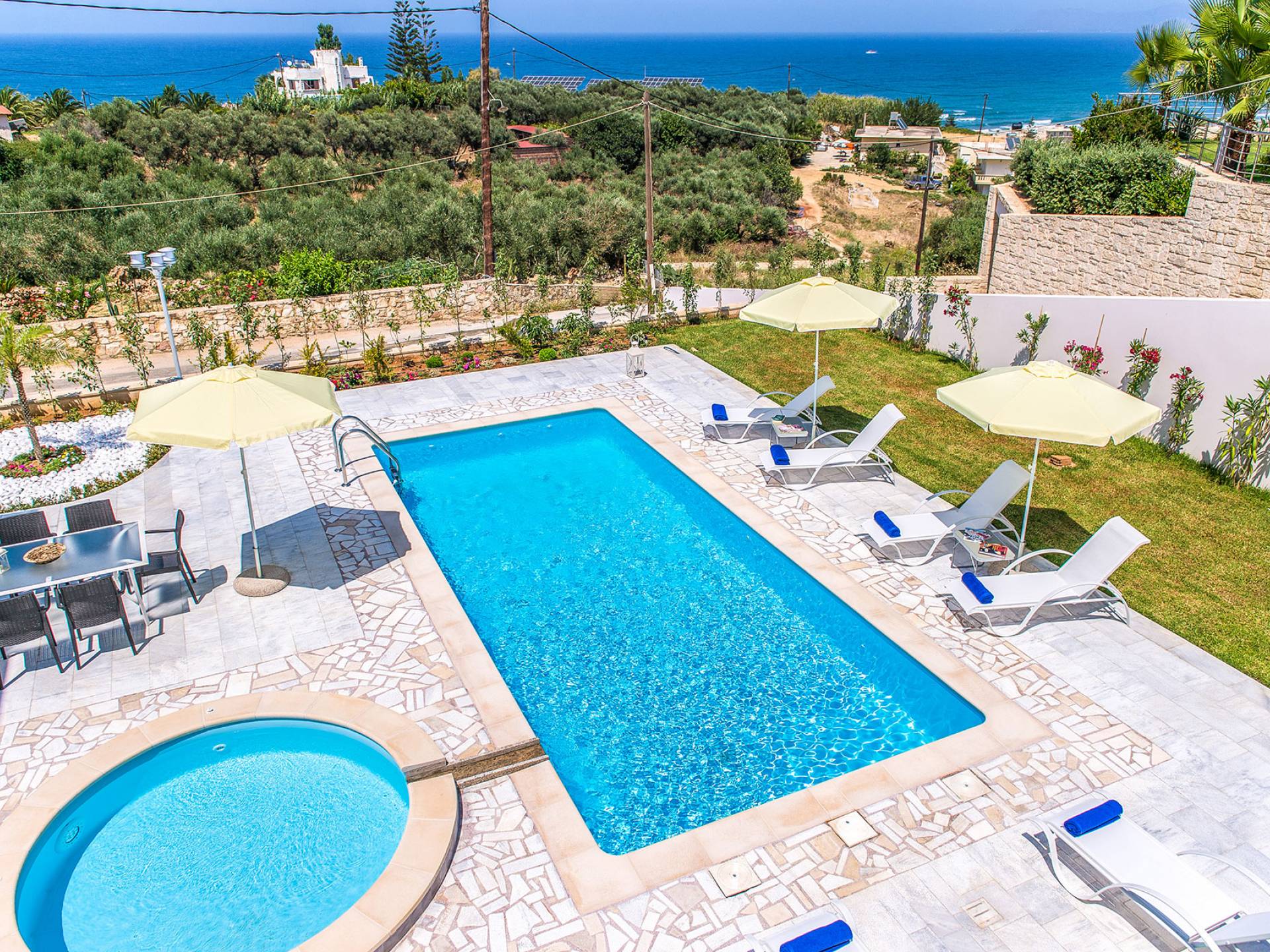 Marjorie Villa Chania: Ανοίγοντας τις πόρτες του αίθριου από τα υπνοδωμάτια, βρίσκετε την ιδιωτική πισίνα που περιβάλλεται από μια ευρύχωρη βεράντα και παρτέρια, με ένα μικρό χώρο με γρασίδι. Υπάρχει ένα φορητό μπάρμπεκιου και εξωτερικό τραπέζι φαγητού και καρέκλες για δείπνο alfresco ενώ παρακολουθείτε το ηλιοβασίλεμα. Μην ξεχνάτε τα μικρά στο πάρτι σας - υπάρχει επίσης ξεχωριστή παιδική πισίνα. Μπαίνοντας στην μπροστινή πόρτα στο κάτω επίπεδο υπάρχει ένας μικρός διάδρομος με 2 πόρτες που οδηγούν στα υπνοδωμάτια. Μια σπειροειδής σκάλα σας μεταφέρει στο σαλόνι με υπέροχη θέα στη θάλασσα που θα βελτιώσει τη διαμονή σας. Στον επάνω όροφο, το ενιαίο σαλόνι είναι ένα τέλειο μέρος για να χαλαρώσετε μακριά από τη ζέστη του ήλιου. Η κομψή, καλαίσθητη επίπλωση και οι δροσεροί ουδέτεροι τόνοι με πιτσιλιές χρώματος δημιουργούν έναν πραγματικά χαλαρό χώρο. Τα 2 μπαλκόνια προσφέρουν θέα στην πισίνα και τον κήπο με απέραντη θέα στο Αιγαίο Πέλαγος.