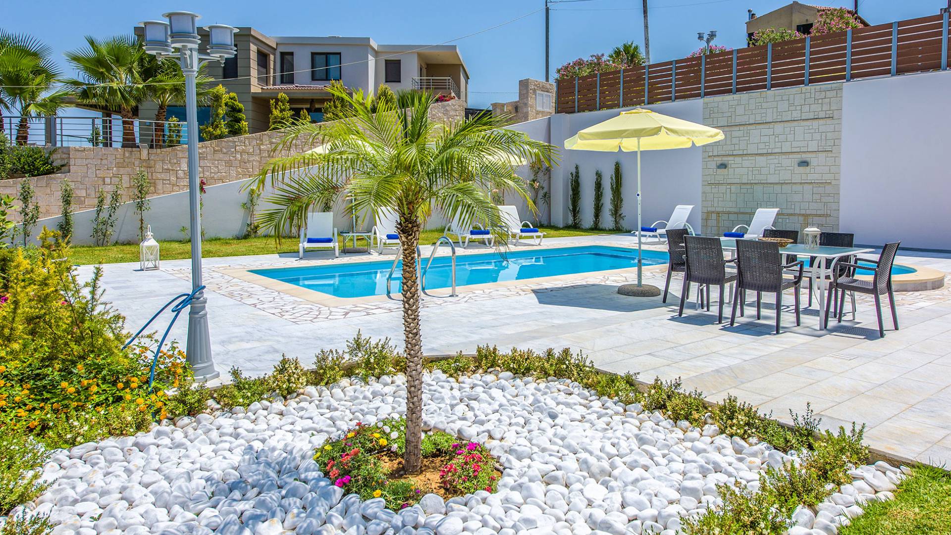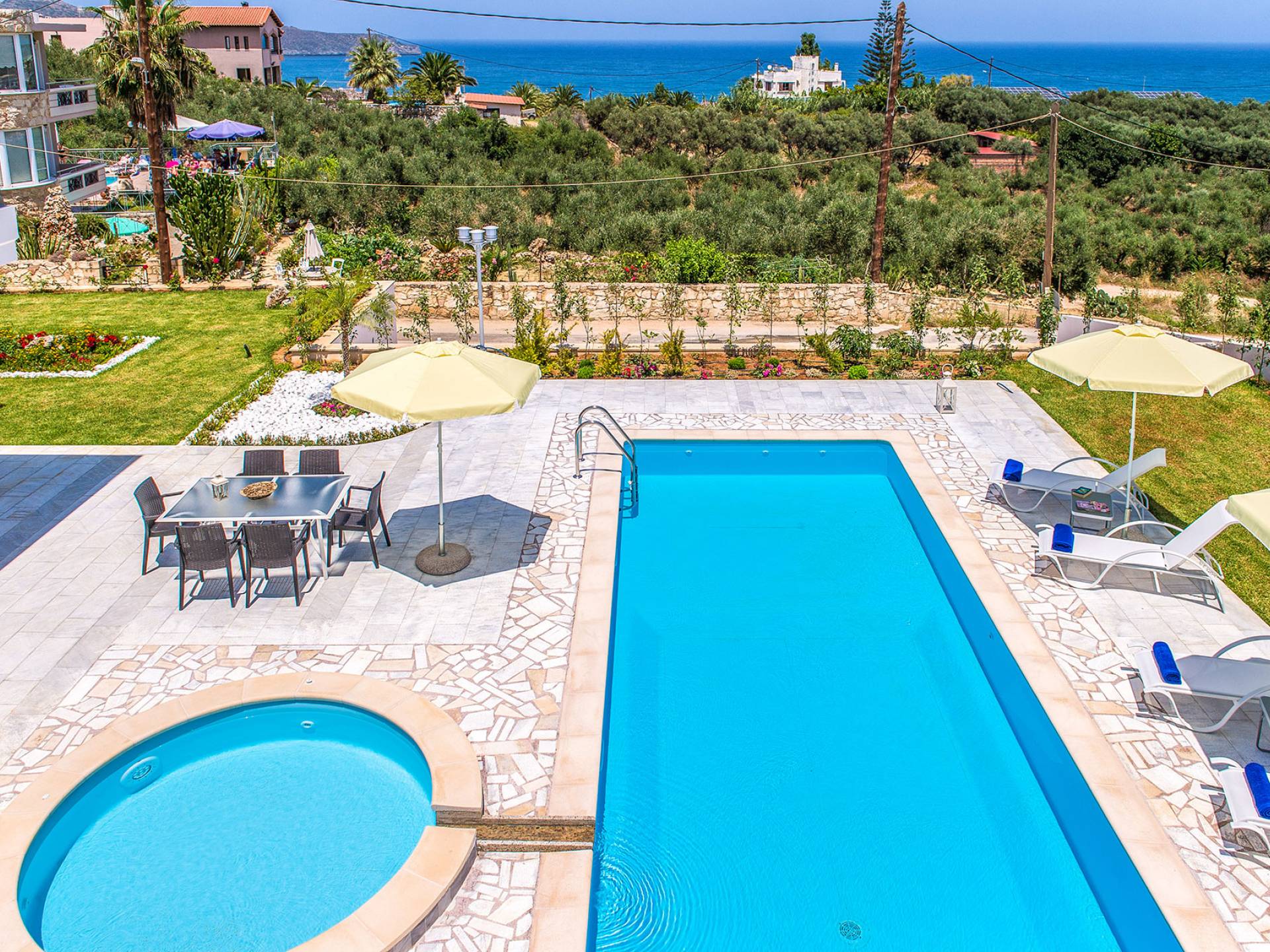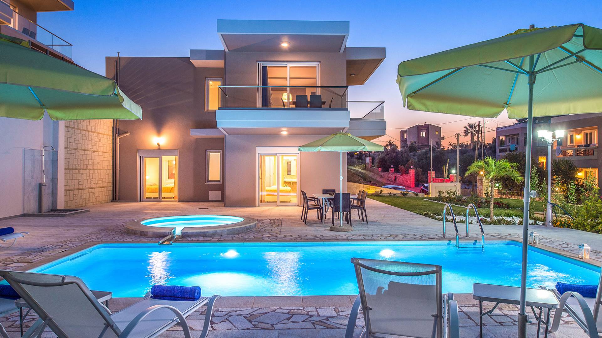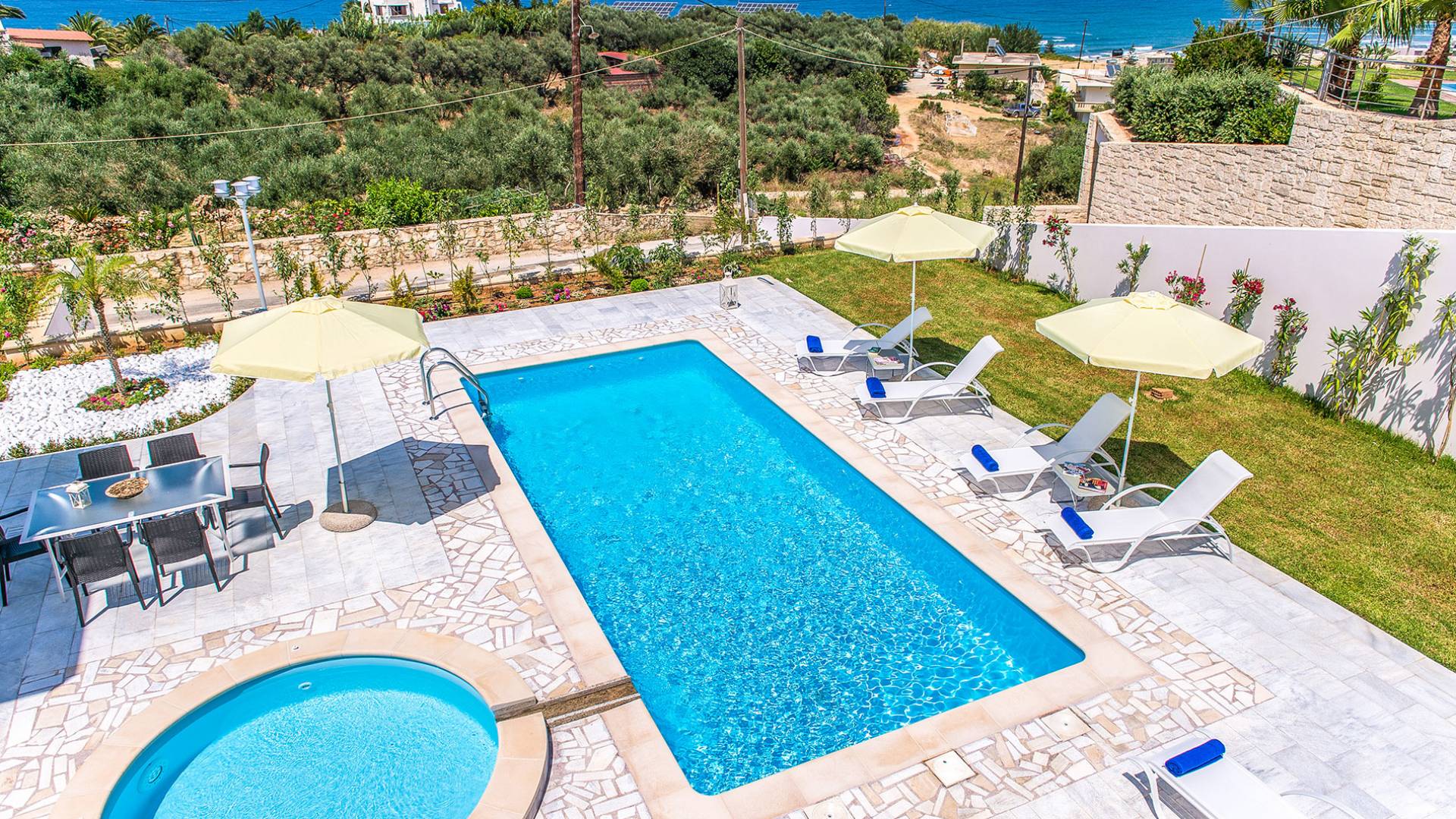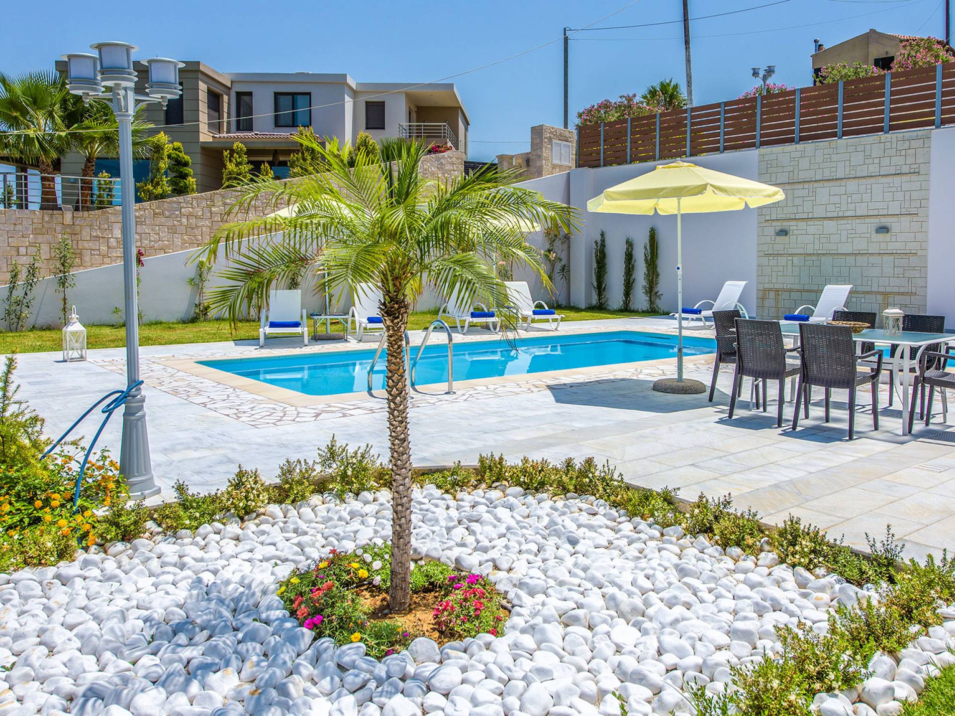 Marjorie Villa Chania: Ανοίγοντας τις πόρτες του αίθριου από τα υπνοδωμάτια, βρίσκετε την ιδιωτική πισίνα που περιβάλλεται από μια ευρύχωρη βεράντα και παρτέρια, με ένα μικρό χώρο με γρασίδι. Υπάρχει ένα φορητό μπάρμπεκιου και εξωτερικό τραπέζι φαγητού και καρέκλες για δείπνο alfresco ενώ παρακολουθείτε το ηλιοβασίλεμα. Μην ξεχνάτε τα μικρά στο πάρτι σας - υπάρχει επίσης ξεχωριστή παιδική πισίνα. Μπαίνοντας στην μπροστινή πόρτα στο κάτω επίπεδο υπάρχει ένας μικρός διάδρομος με 2 πόρτες που οδηγούν στα υπνοδωμάτια. Μια σπειροειδής σκάλα σας μεταφέρει στο σαλόνι με υπέροχη θέα στη θάλασσα που θα βελτιώσει τη διαμονή σας. Στον επάνω όροφο, το ενιαίο σαλόνι είναι ένα τέλειο μέρος για να χαλαρώσετε μακριά από τη ζέστη του ήλιου. Η κομψή, καλαίσθητη επίπλωση και οι δροσεροί ουδέτεροι τόνοι με πιτσιλιές χρώματος δημιουργούν έναν πραγματικά χαλαρό χώρο. Τα 2 μπαλκόνια προσφέρουν θέα στην πισίνα και τον κήπο με απέραντη θέα στο Αιγαίο Πέλαγος.