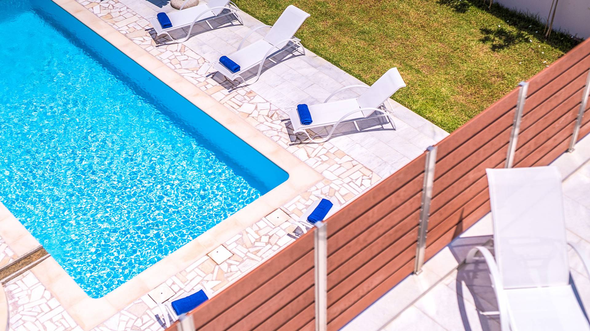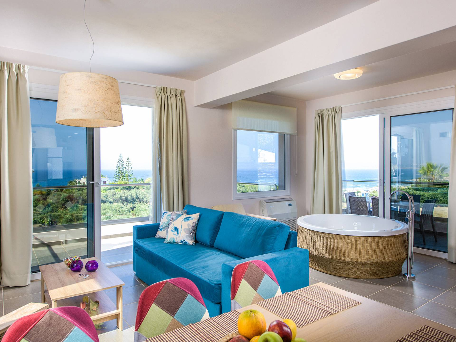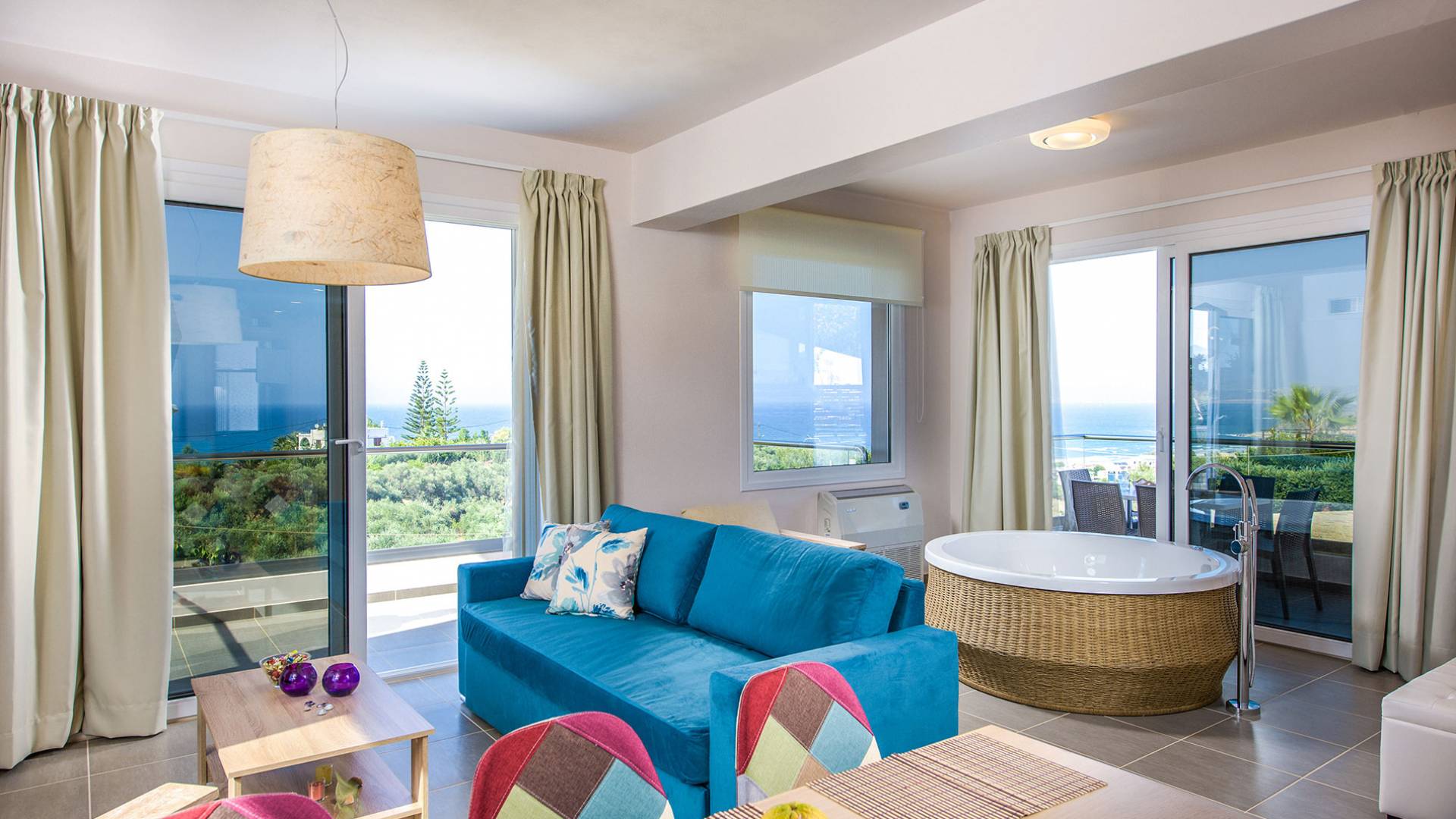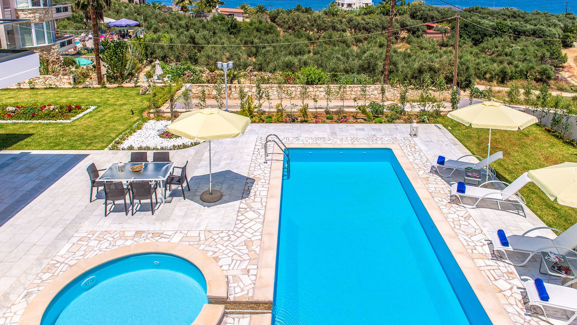 Marjorie Villa Chania: Ανοίγοντας τις πόρτες του αίθριου από τα υπνοδωμάτια, βρίσκετε την ιδιωτική πισίνα που περιβάλλεται από μια ευρύχωρη βεράντα και παρτέρια, με ένα μικρό χώρο με γρασίδι. Υπάρχει ένα φορητό μπάρμπεκιου και εξωτερικό τραπέζι φαγητού και καρέκλες για δείπνο alfresco ενώ παρακολουθείτε το ηλιοβασίλεμα. Μην ξεχνάτε τα μικρά στο πάρτι σας - υπάρχει επίσης ξεχωριστή παιδική πισίνα. Μπαίνοντας στην μπροστινή πόρτα στο κάτω επίπεδο υπάρχει ένας μικρός διάδρομος με 2 πόρτες που οδηγούν στα υπνοδωμάτια. Μια σπειροειδής σκάλα σας μεταφέρει στο σαλόνι με υπέροχη θέα στη θάλασσα που θα βελτιώσει τη διαμονή σας. Στον επάνω όροφο, το ενιαίο σαλόνι είναι ένα τέλειο μέρος για να χαλαρώσετε μακριά από τη ζέστη του ήλιου. Η κομψή, καλαίσθητη επίπλωση και οι δροσεροί ουδέτεροι τόνοι με πιτσιλιές χρώματος δημιουργούν έναν πραγματικά χαλαρό χώρο. Τα 2 μπαλκόνια προσφέρουν θέα στην πισίνα και τον κήπο με απέραντη θέα στο Αιγαίο Πέλαγος.