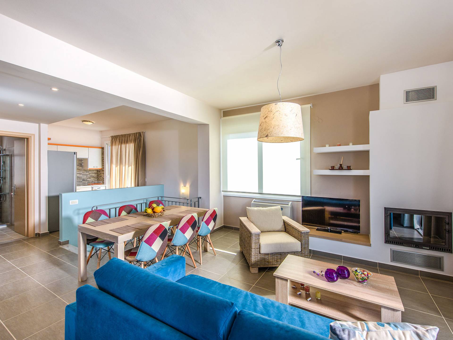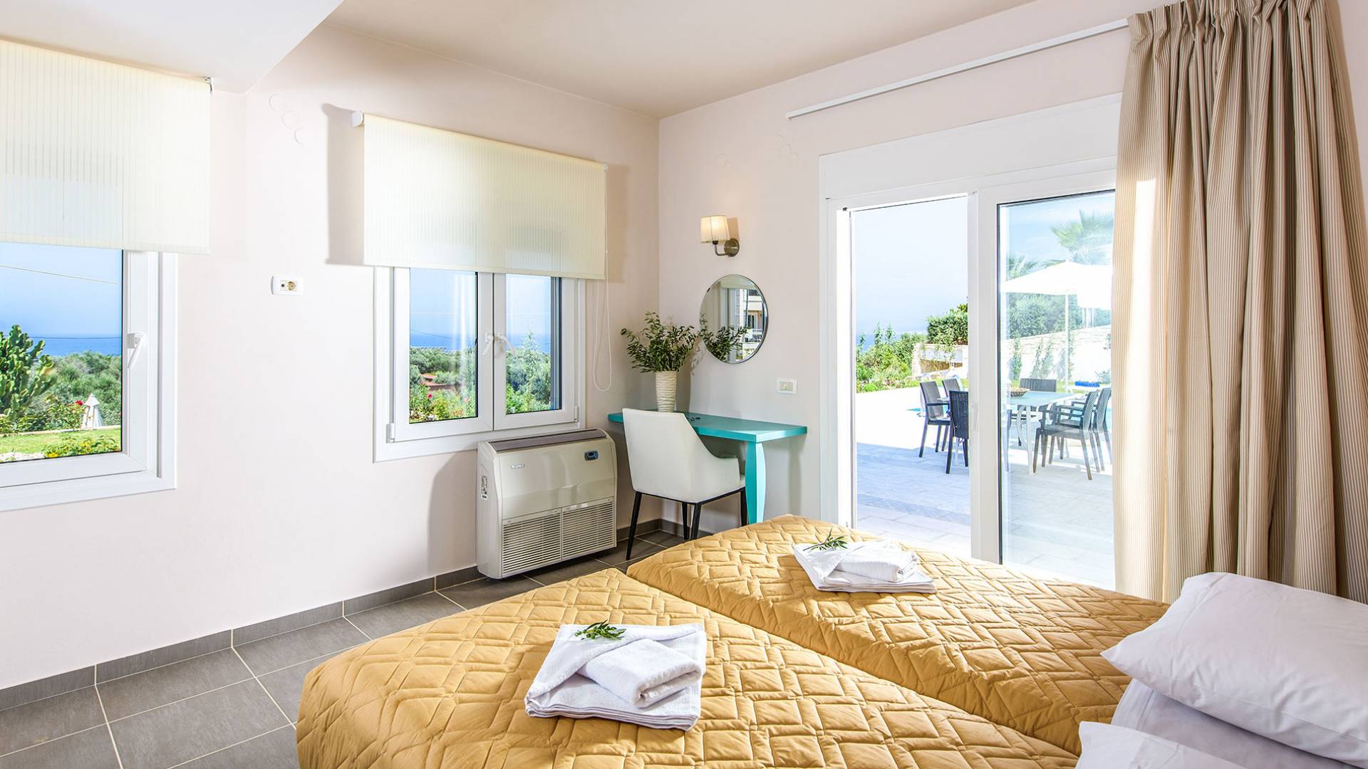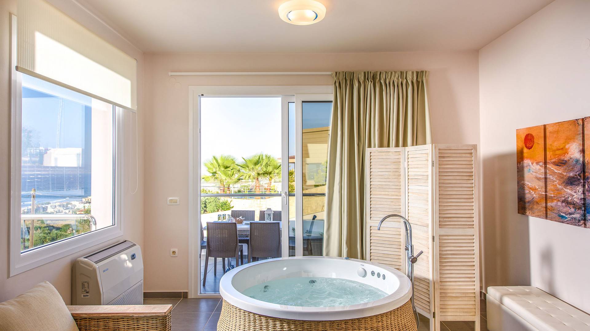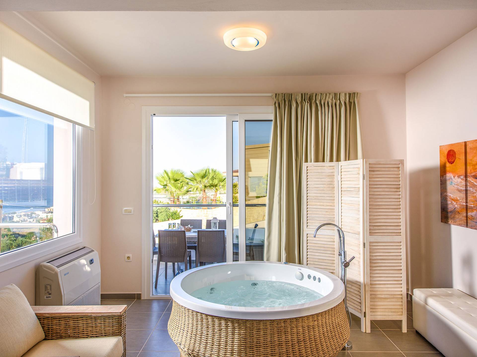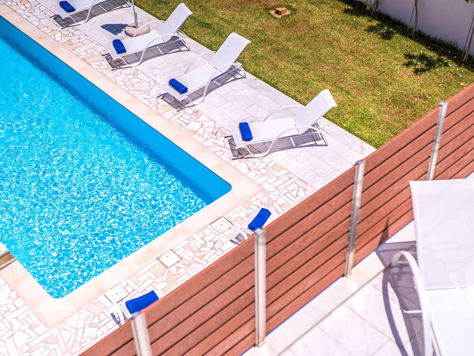 Marjorie Villa Chania: Ανοίγοντας τις πόρτες του αίθριου από τα υπνοδωμάτια, βρίσκετε την ιδιωτική πισίνα που περιβάλλεται από μια ευρύχωρη βεράντα και παρτέρια, με ένα μικρό χώρο με γρασίδι. Υπάρχει ένα φορητό μπάρμπεκιου και εξωτερικό τραπέζι φαγητού και καρέκλες για δείπνο alfresco ενώ παρακολουθείτε το ηλιοβασίλεμα. Μην ξεχνάτε τα μικρά στο πάρτι σας - υπάρχει επίσης ξεχωριστή παιδική πισίνα. Μπαίνοντας στην μπροστινή πόρτα στο κάτω επίπεδο υπάρχει ένας μικρός διάδρομος με 2 πόρτες που οδηγούν στα υπνοδωμάτια. Μια σπειροειδής σκάλα σας μεταφέρει στο σαλόνι με υπέροχη θέα στη θάλασσα που θα βελτιώσει τη διαμονή σας. Στον επάνω όροφο, το ενιαίο σαλόνι είναι ένα τέλειο μέρος για να χαλαρώσετε μακριά από τη ζέστη του ήλιου. Η κομψή, καλαίσθητη επίπλωση και οι δροσεροί ουδέτεροι τόνοι με πιτσιλιές χρώματος δημιουργούν έναν πραγματικά χαλαρό χώρο. Τα 2 μπαλκόνια προσφέρουν θέα στην πισίνα και τον κήπο με απέραντη θέα στο Αιγαίο Πέλαγος.