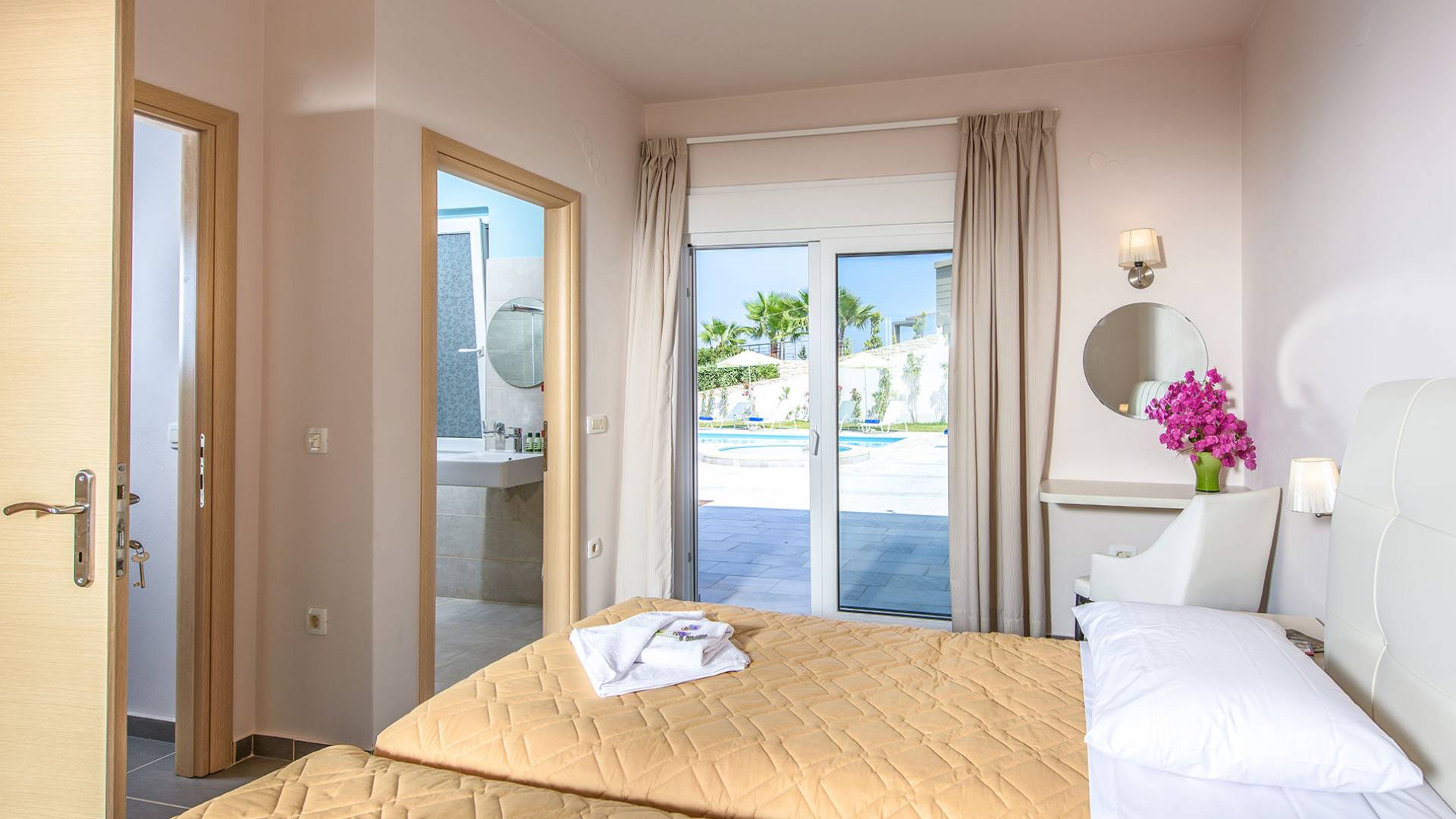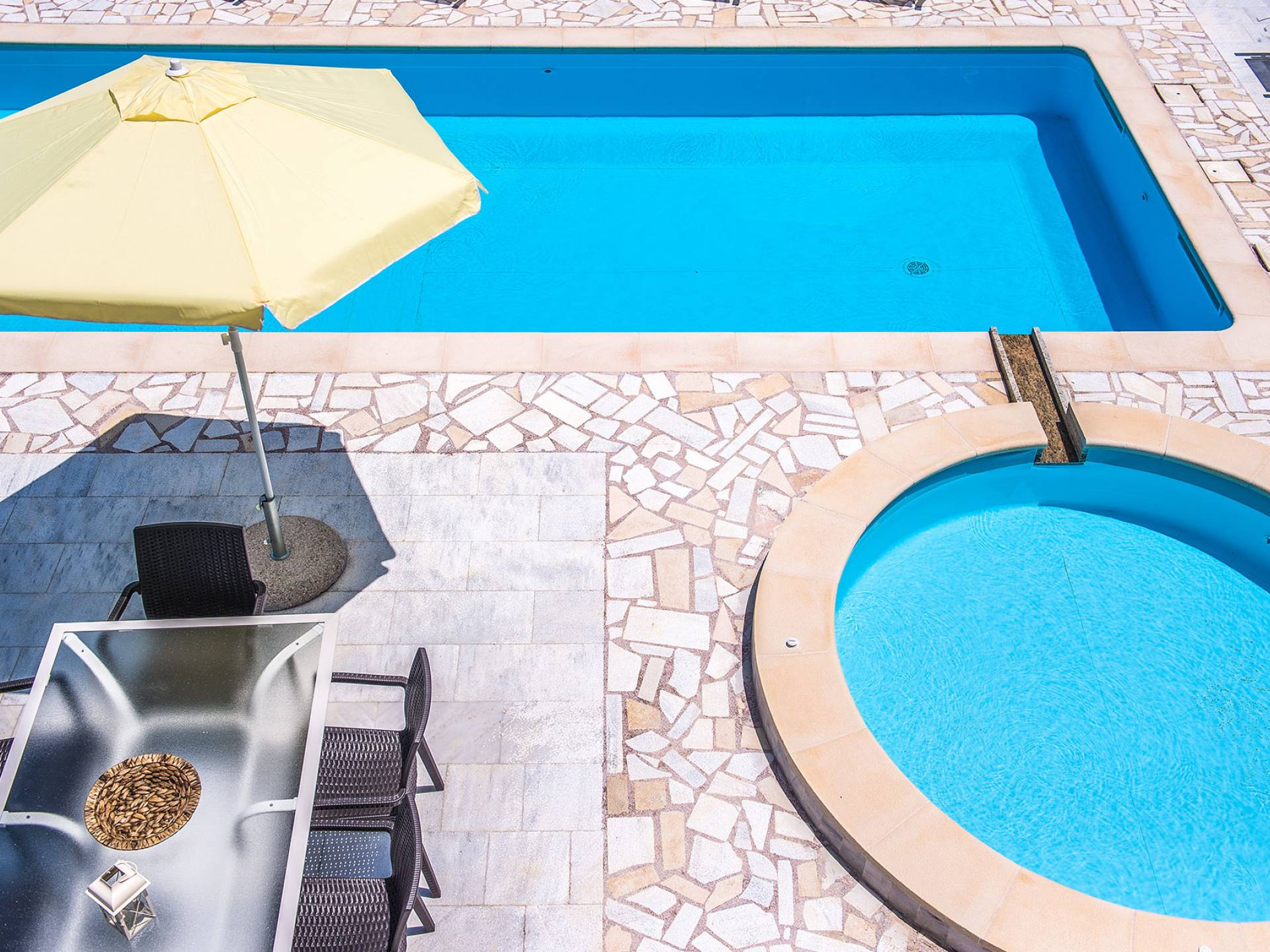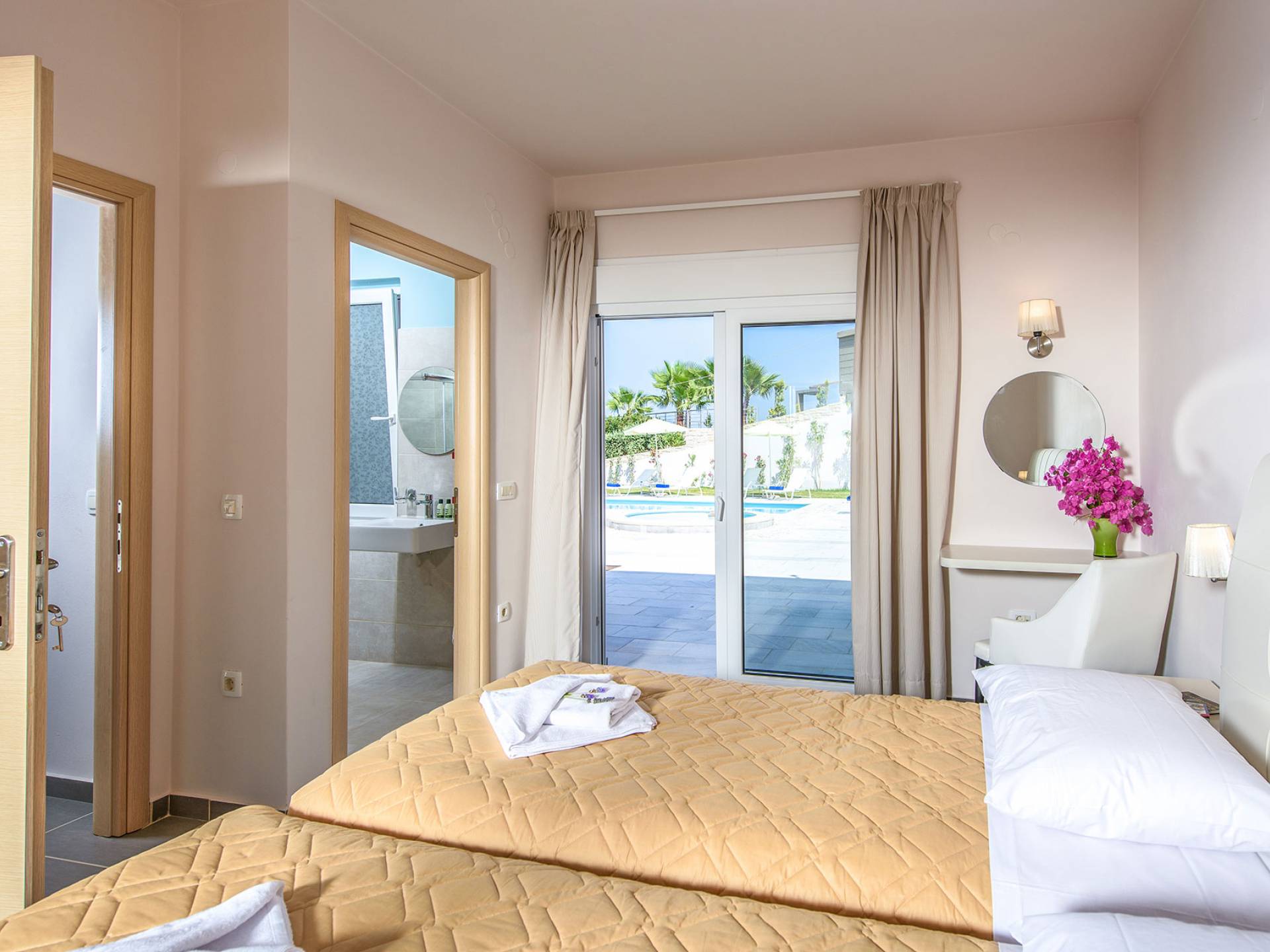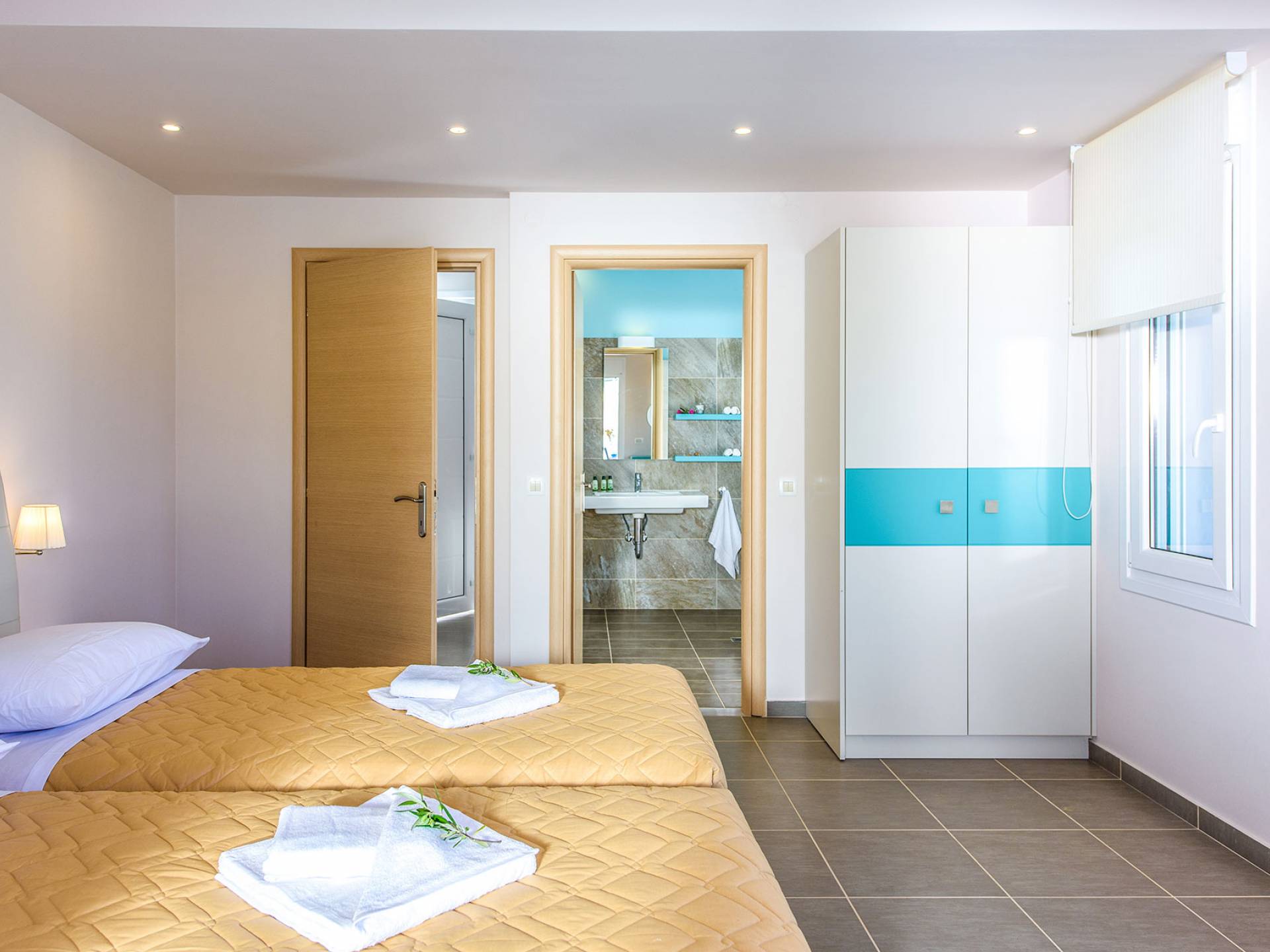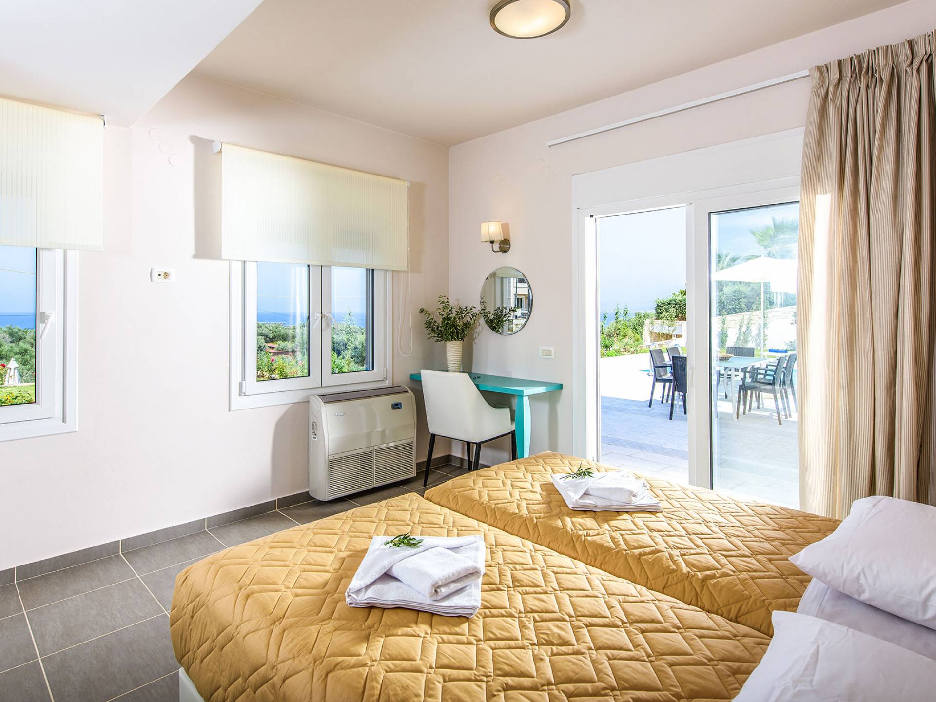 Η σύγχρονη, συμπαγής κουζίνα οδηγεί από το σαλόνι και διαθέτει 2 τραπέζια φαγητού και σετ καρέκλας. Είναι καλά εξοπλισμένο για όλες τις ανάγκες εστίασης κατά τη διάρκεια των διακοπών σας. Και τα δύο υπνοδωμάτια βρίσκονται στο ισόγειο. Το δίκλινο υπνοδωμάτιο είναι φωτεινά επιπλωμένο και διαθέτει πόρτες βεράντας που οδηγούν απευθείας στη βεράντα της πισίνας. Ακριβώς έξω από αυτό το υπνοδωμάτιο, υπάρχει το ιδιωτικό μπάνιο. Το δίκλινο υπνοδωμάτιο με 2 μονά κρεβάτια διαθέτει ποιοτικά εξαρτήματα, πόρτες βεράντας που οδηγούν στη βεράντα της πισίνας και ιδιωτικό ντους. Υπάρχει ένα επιπλέον ντους στο επάνω επίπεδο μεταξύ του σαλονιού και της κουζίνας.