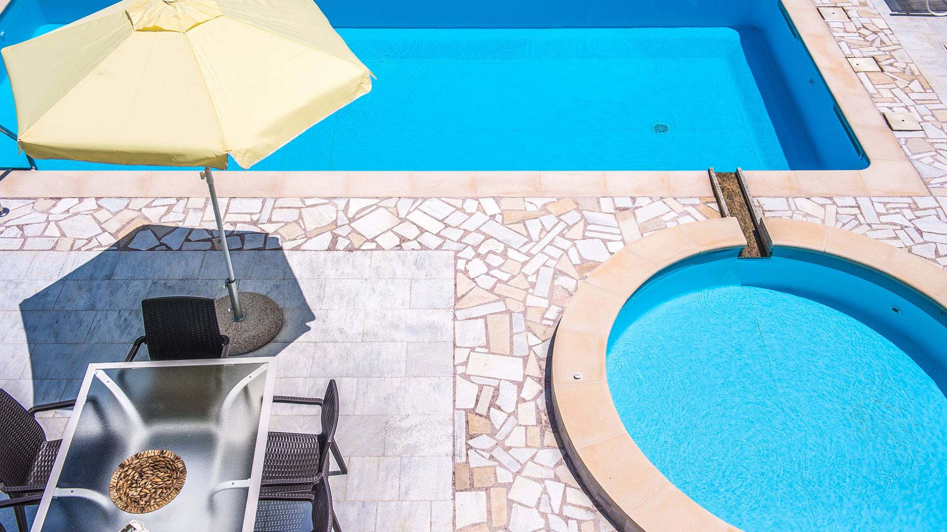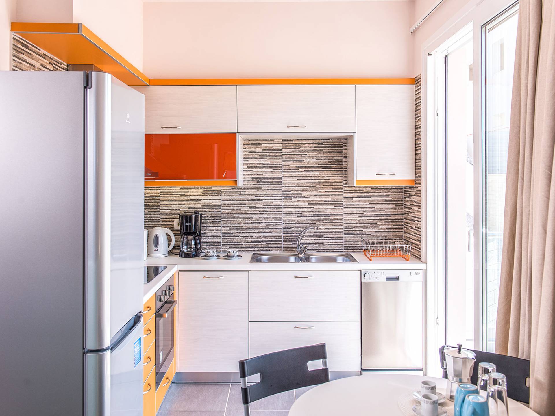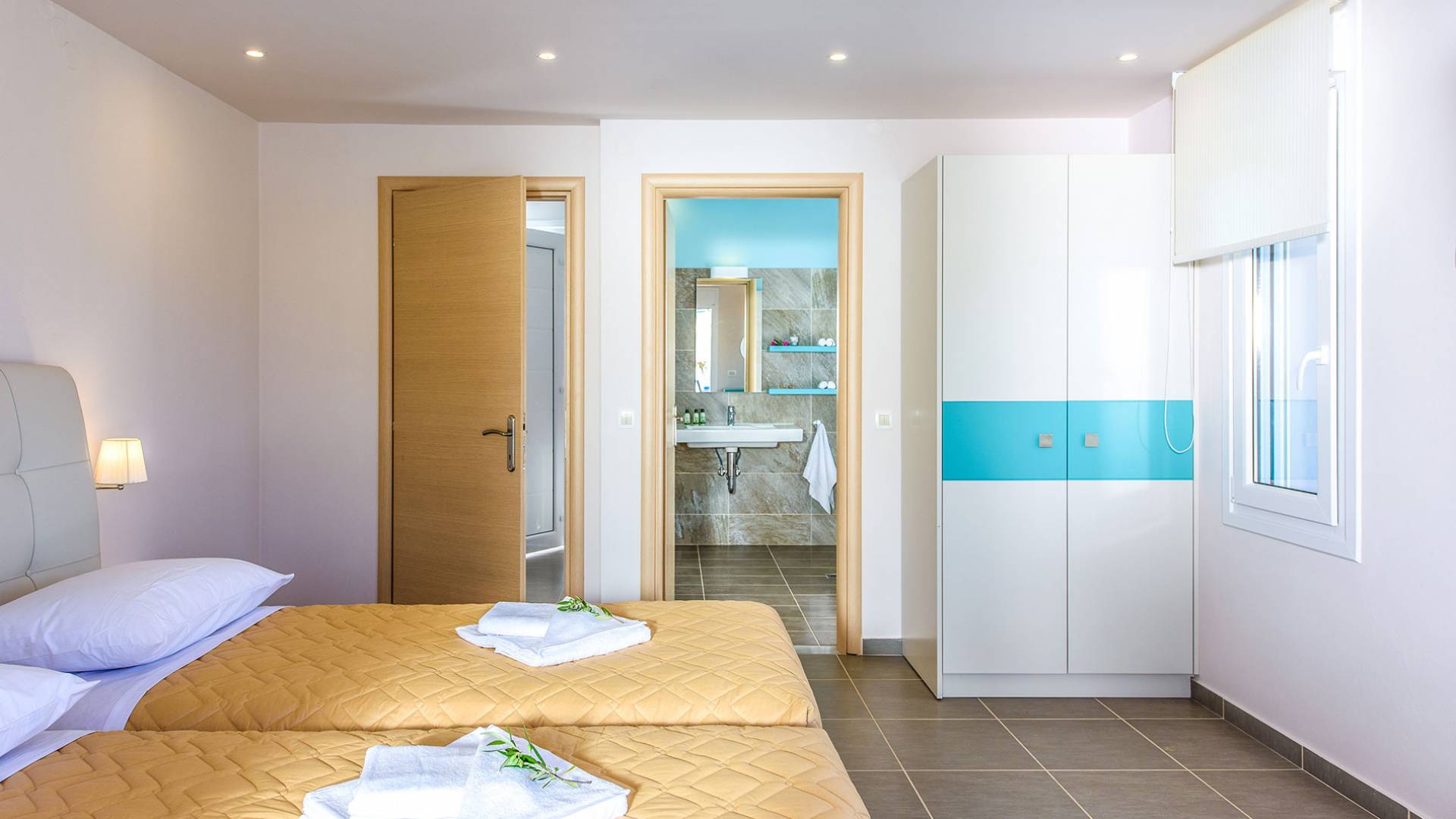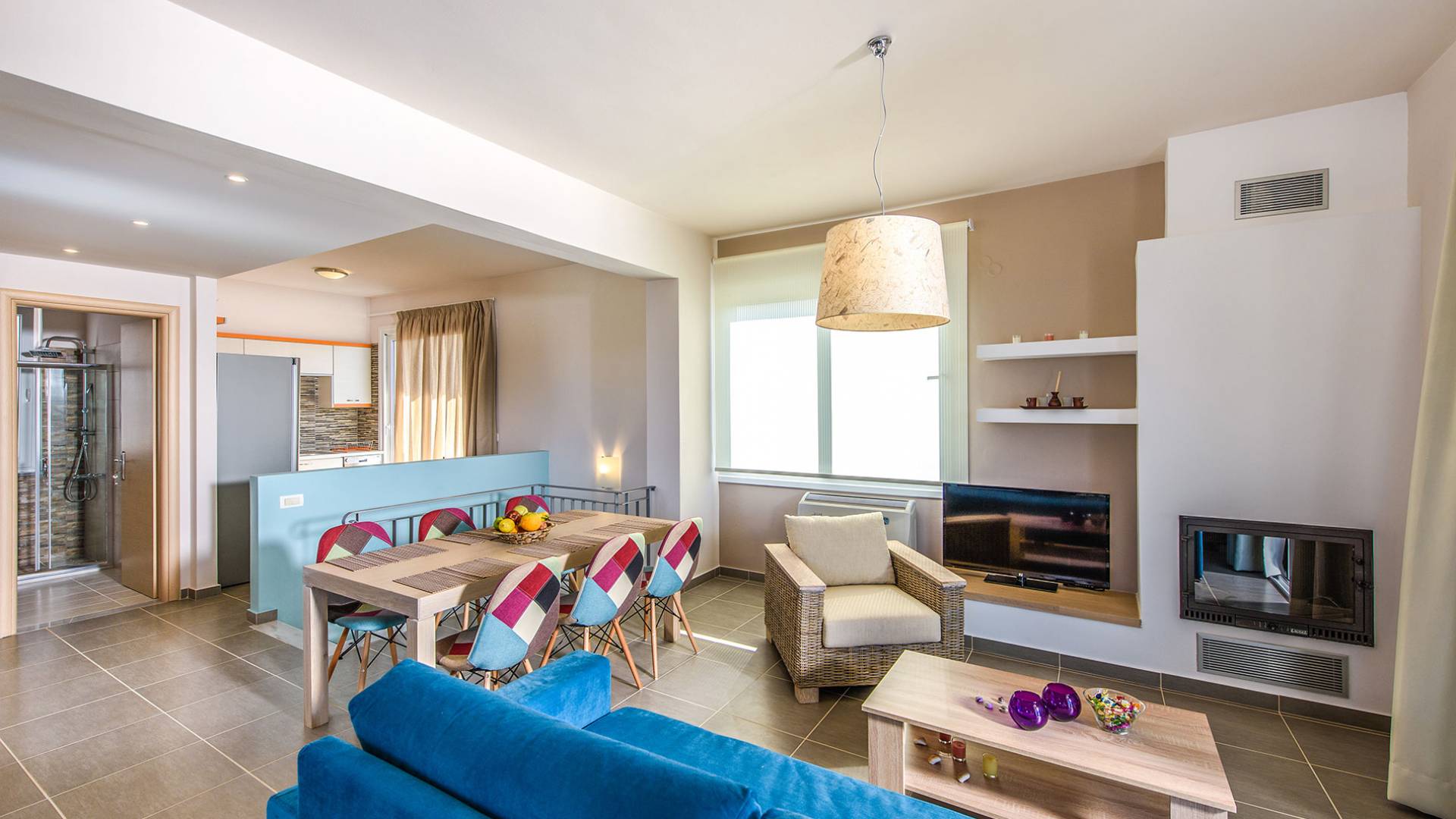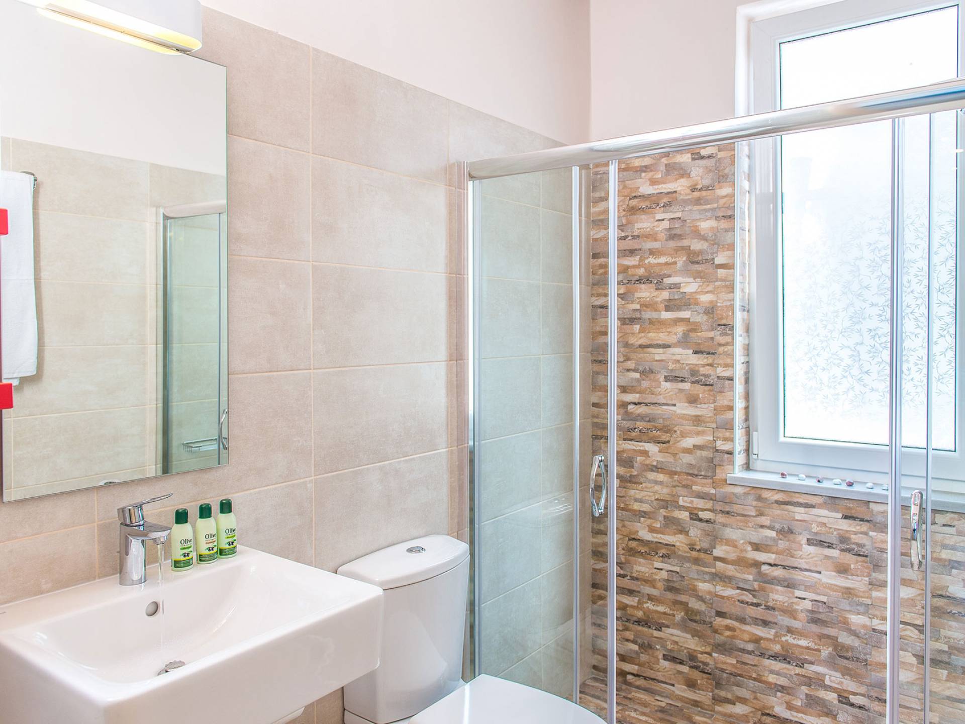 Η σύγχρονη, συμπαγής κουζίνα οδηγεί από το σαλόνι και διαθέτει 2 τραπέζια φαγητού και σετ καρέκλας. Είναι καλά εξοπλισμένο για όλες τις ανάγκες εστίασης κατά τη διάρκεια των διακοπών σας. Και τα δύο υπνοδωμάτια βρίσκονται στο ισόγειο. Το δίκλινο υπνοδωμάτιο είναι φωτεινά επιπλωμένο και διαθέτει πόρτες βεράντας που οδηγούν απευθείας στη βεράντα της πισίνας. Ακριβώς έξω από αυτό το υπνοδωμάτιο, υπάρχει το ιδιωτικό μπάνιο. Το δίκλινο υπνοδωμάτιο με 2 μονά κρεβάτια διαθέτει ποιοτικά εξαρτήματα, πόρτες βεράντας που οδηγούν στη βεράντα της πισίνας και ιδιωτικό ντους. Υπάρχει ένα επιπλέον ντους στο επάνω επίπεδο μεταξύ του σαλονιού και της κουζίνας.