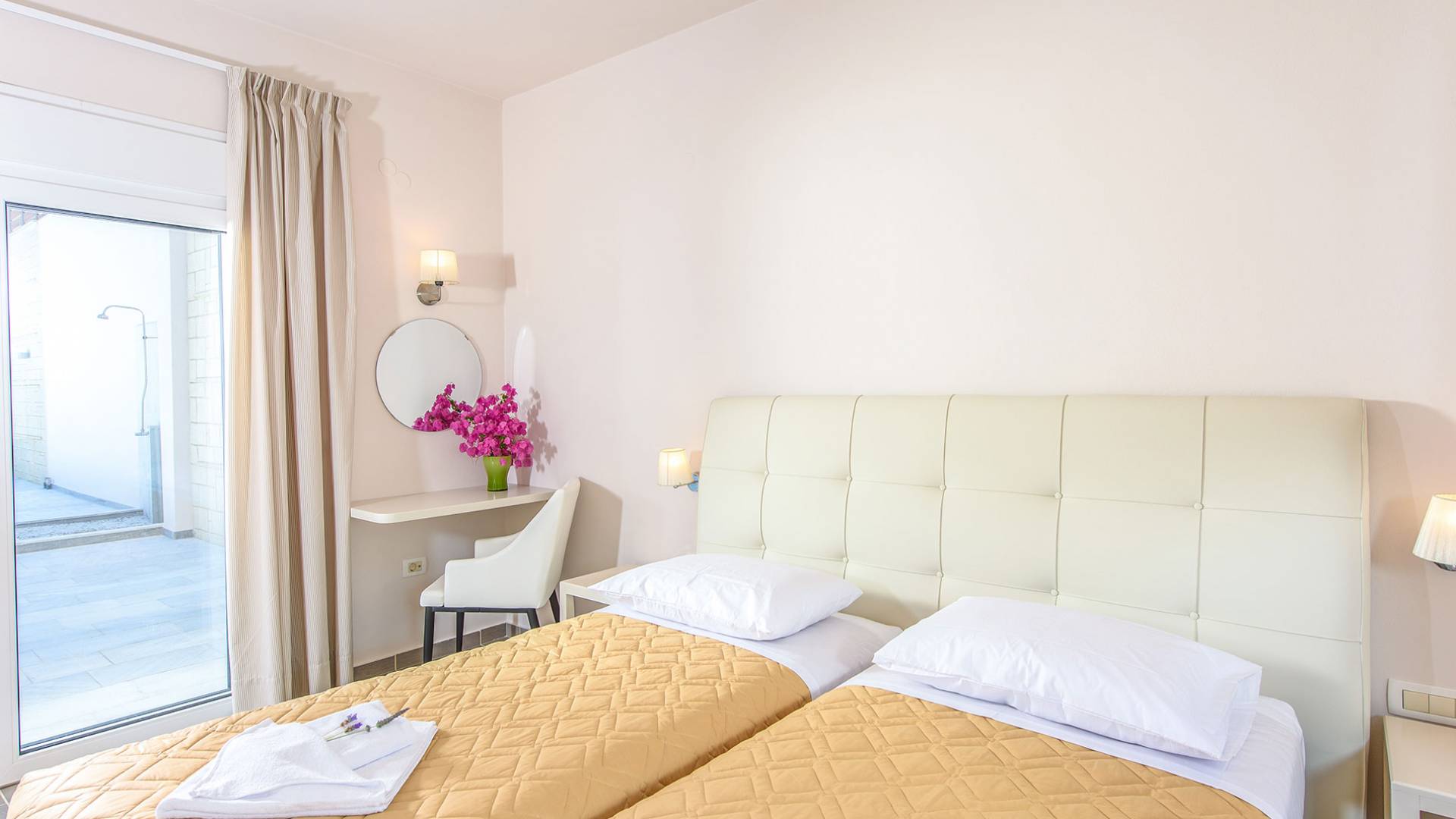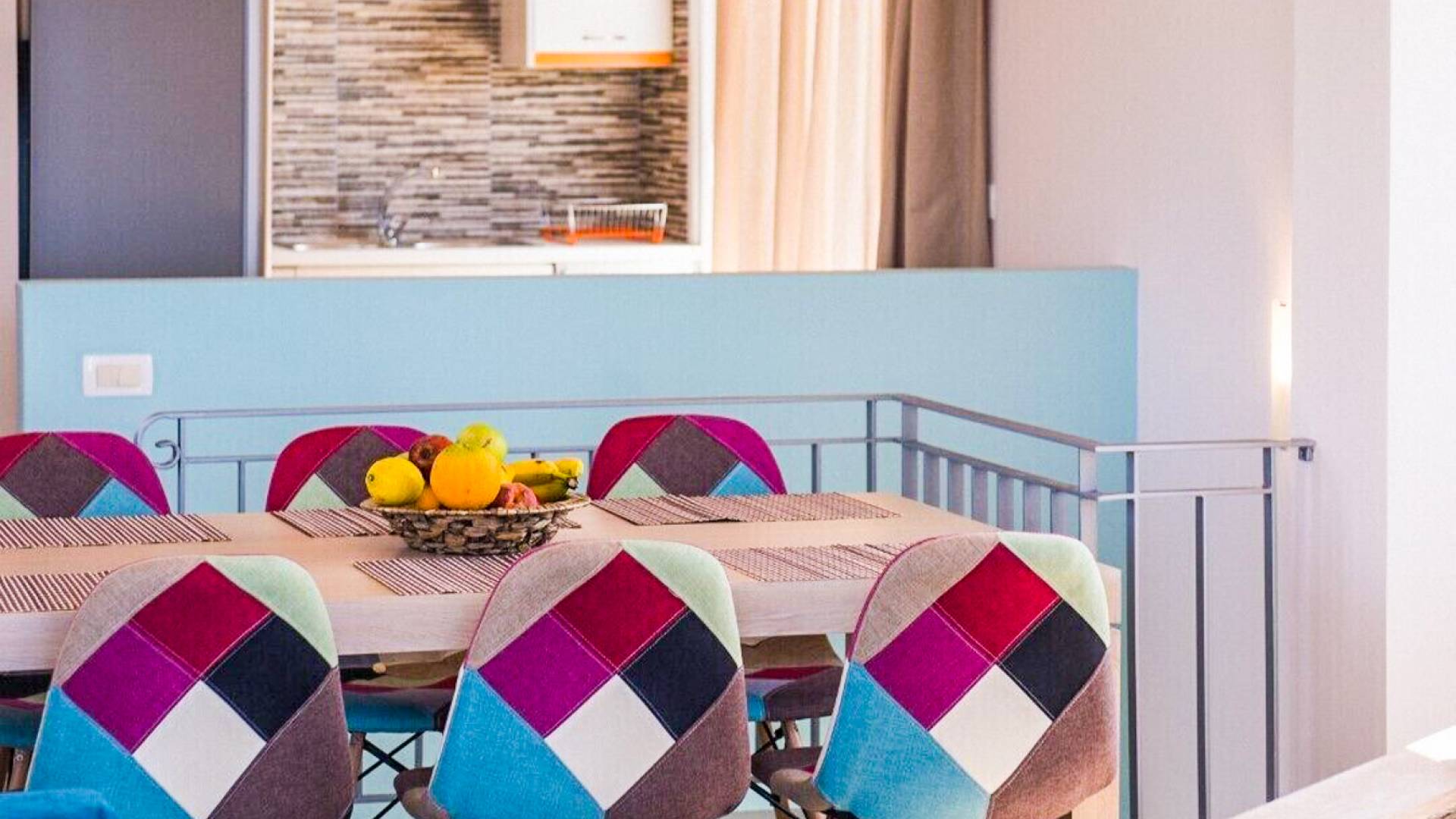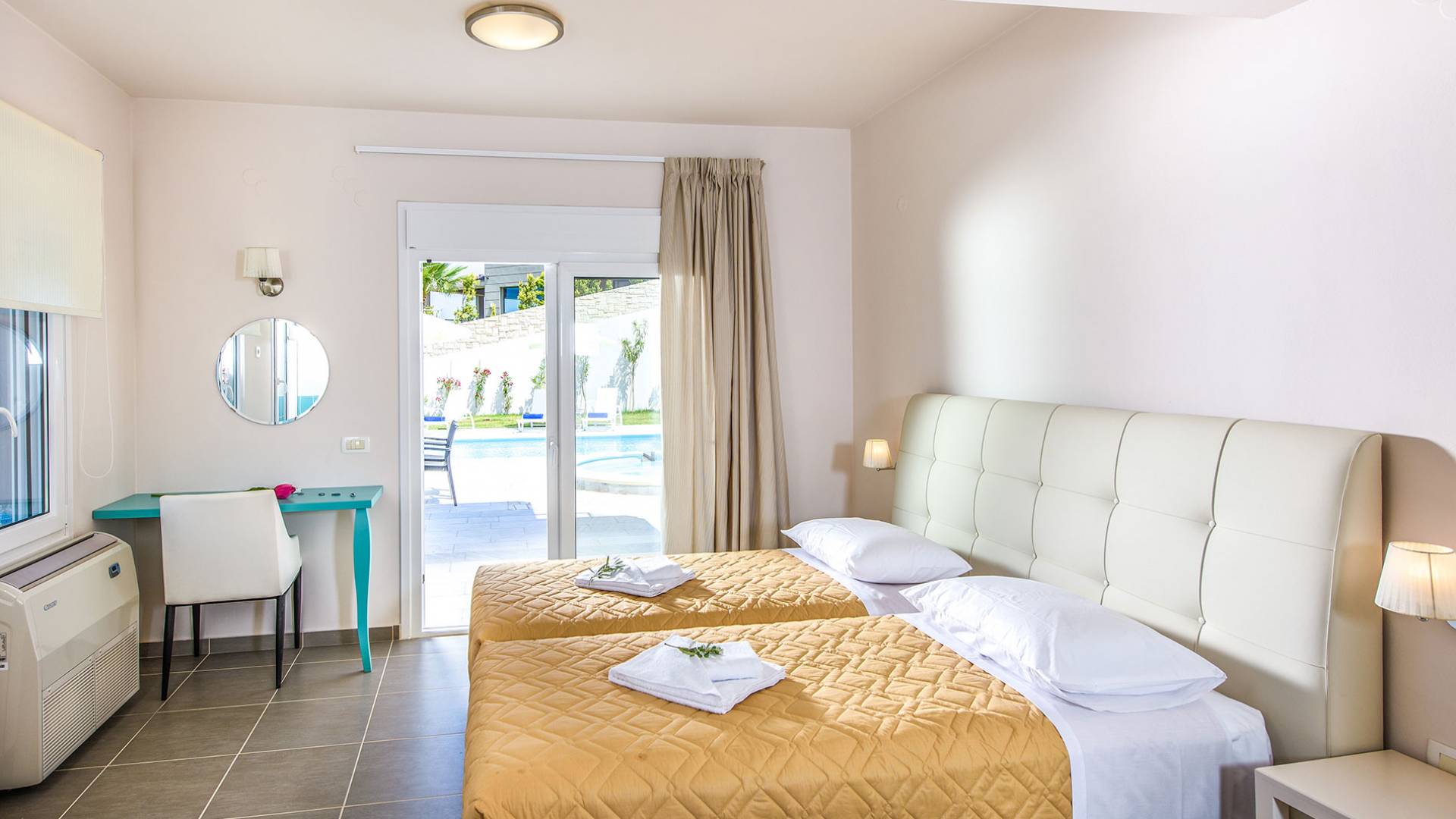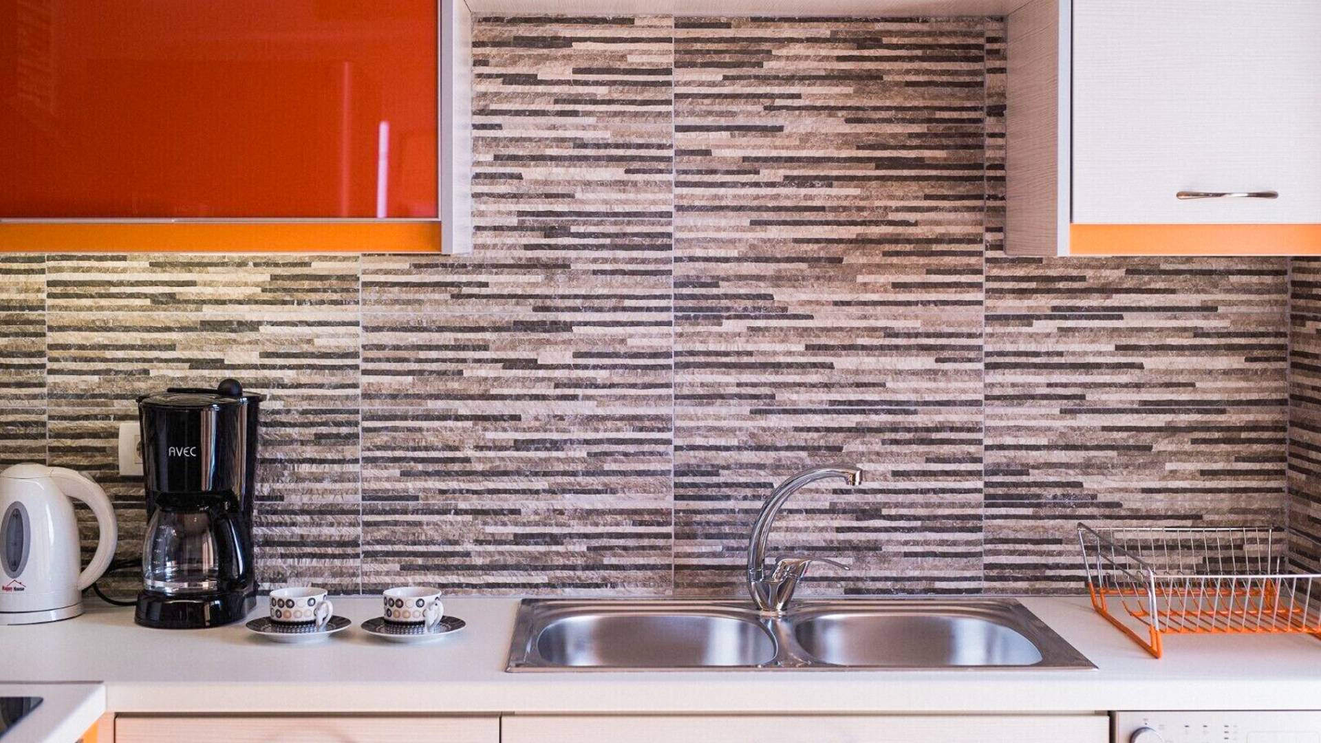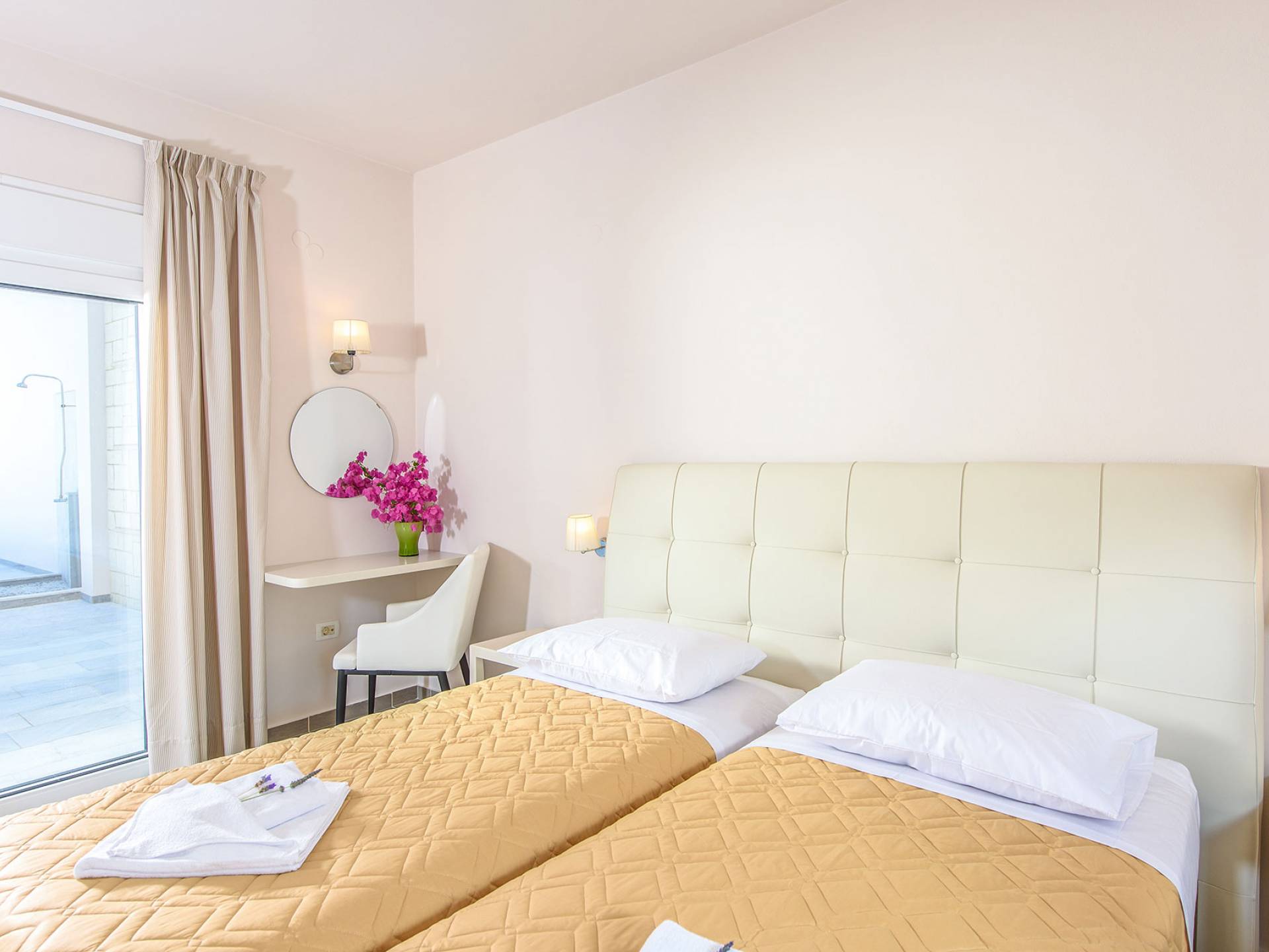 Η σύγχρονη, συμπαγής κουζίνα οδηγεί από το σαλόνι και διαθέτει 2 τραπέζια φαγητού και σετ καρέκλας. Είναι καλά εξοπλισμένο για όλες τις ανάγκες εστίασης κατά τη διάρκεια των διακοπών σας. Και τα δύο υπνοδωμάτια βρίσκονται στο ισόγειο. Το δίκλινο υπνοδωμάτιο είναι φωτεινά επιπλωμένο και διαθέτει πόρτες βεράντας που οδηγούν απευθείας στη βεράντα της πισίνας. Ακριβώς έξω από αυτό το υπνοδωμάτιο, υπάρχει το ιδιωτικό μπάνιο. Το δίκλινο υπνοδωμάτιο με 2 μονά κρεβάτια διαθέτει ποιοτικά εξαρτήματα, πόρτες βεράντας που οδηγούν στη βεράντα της πισίνας και ιδιωτικό ντους. Υπάρχει ένα επιπλέον ντους στο επάνω επίπεδο μεταξύ του σαλονιού και της κουζίνας.