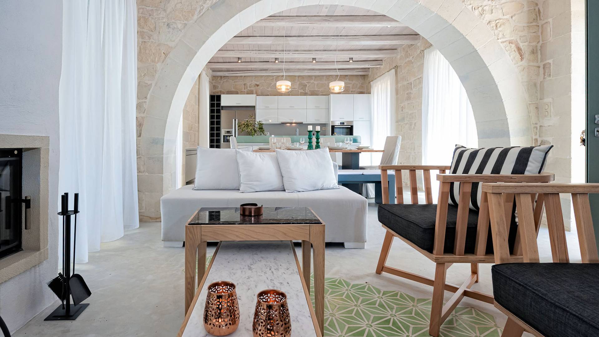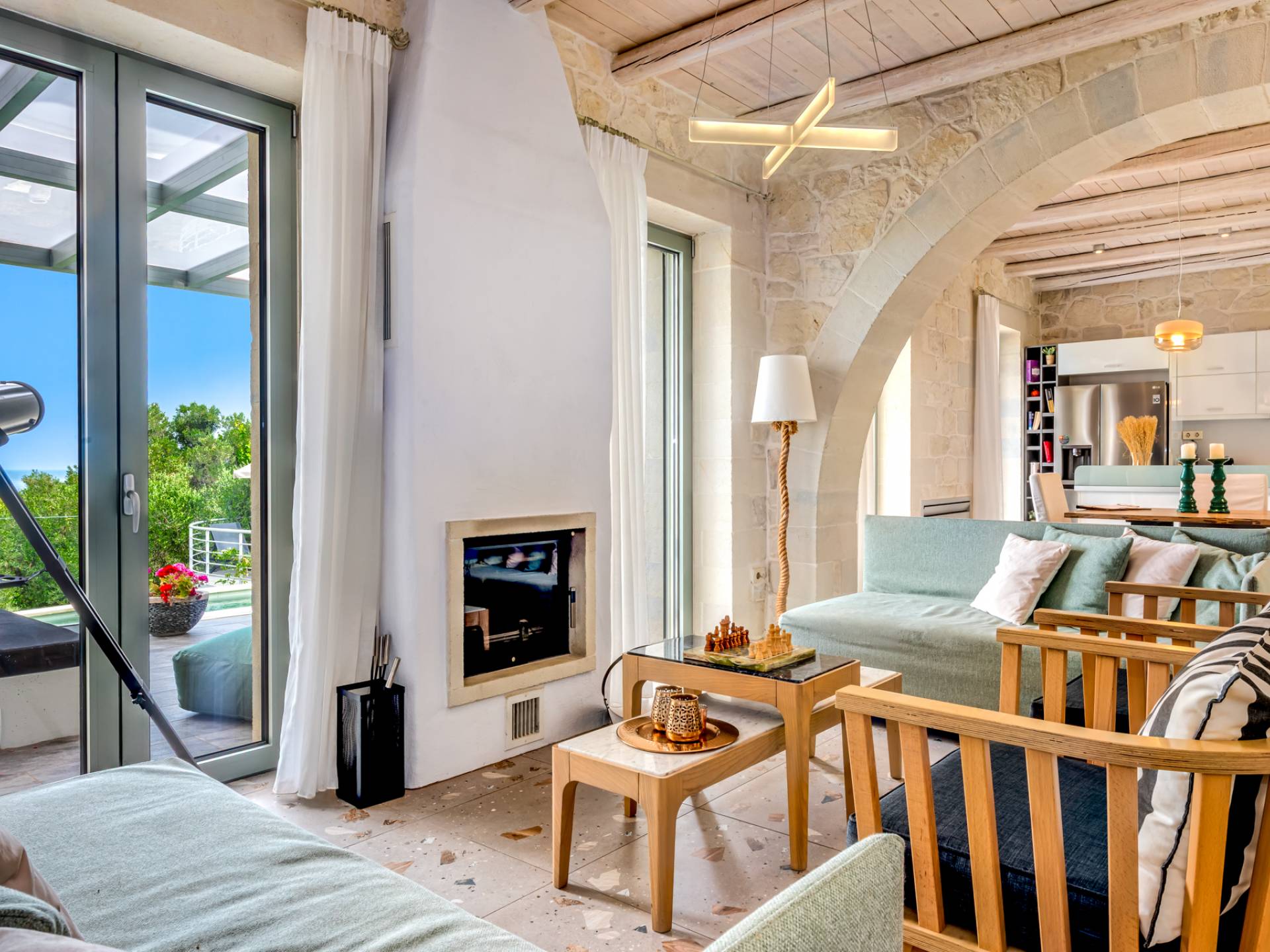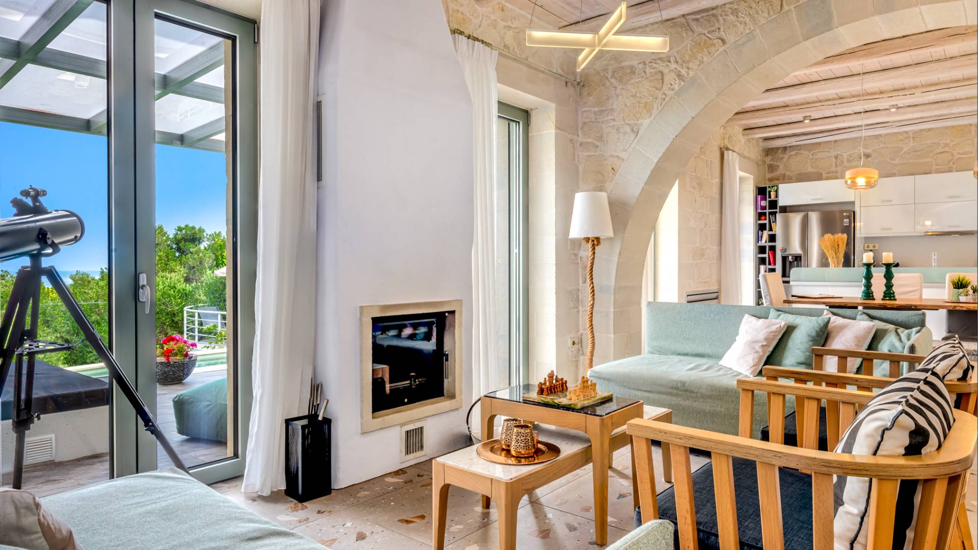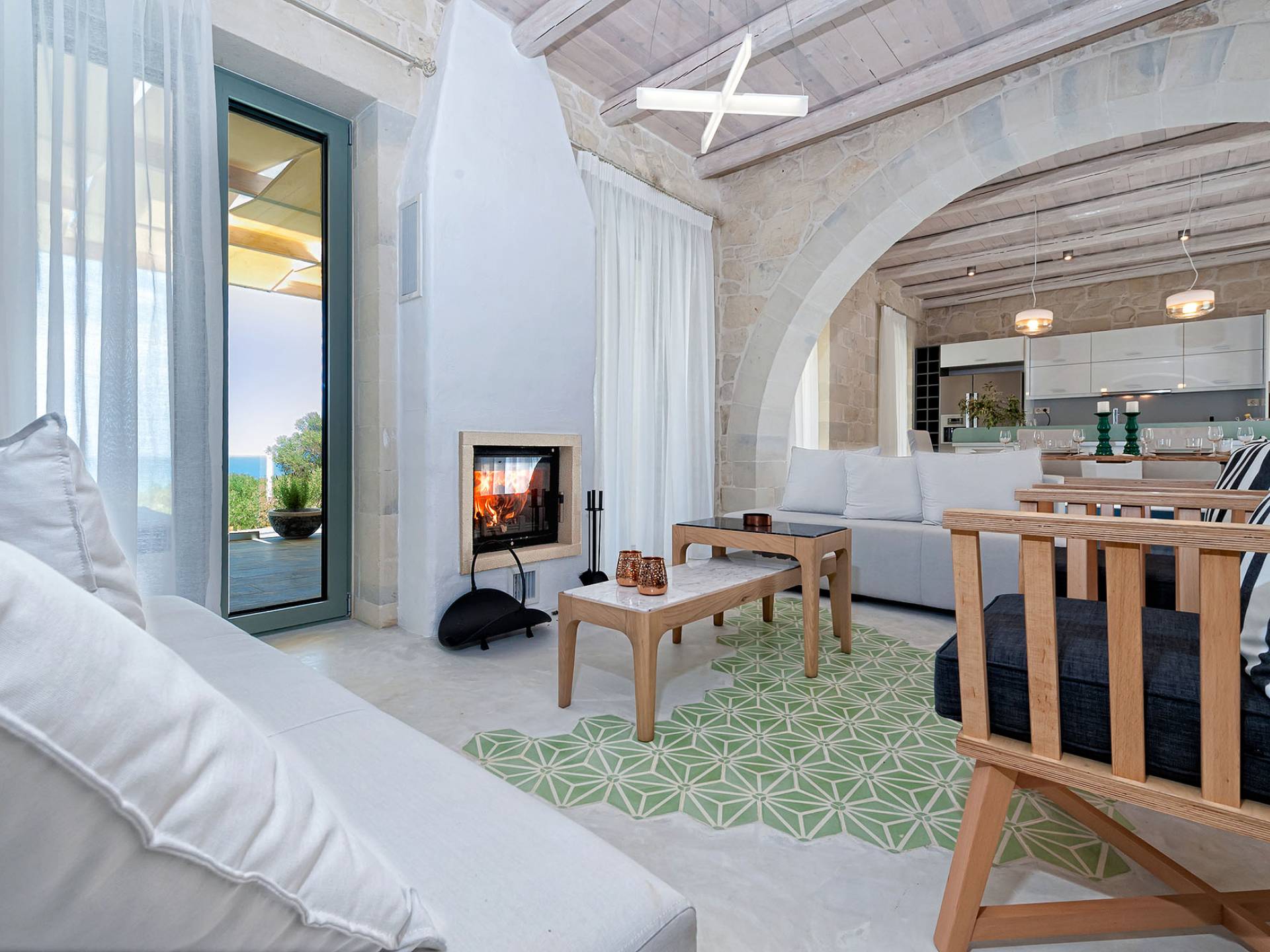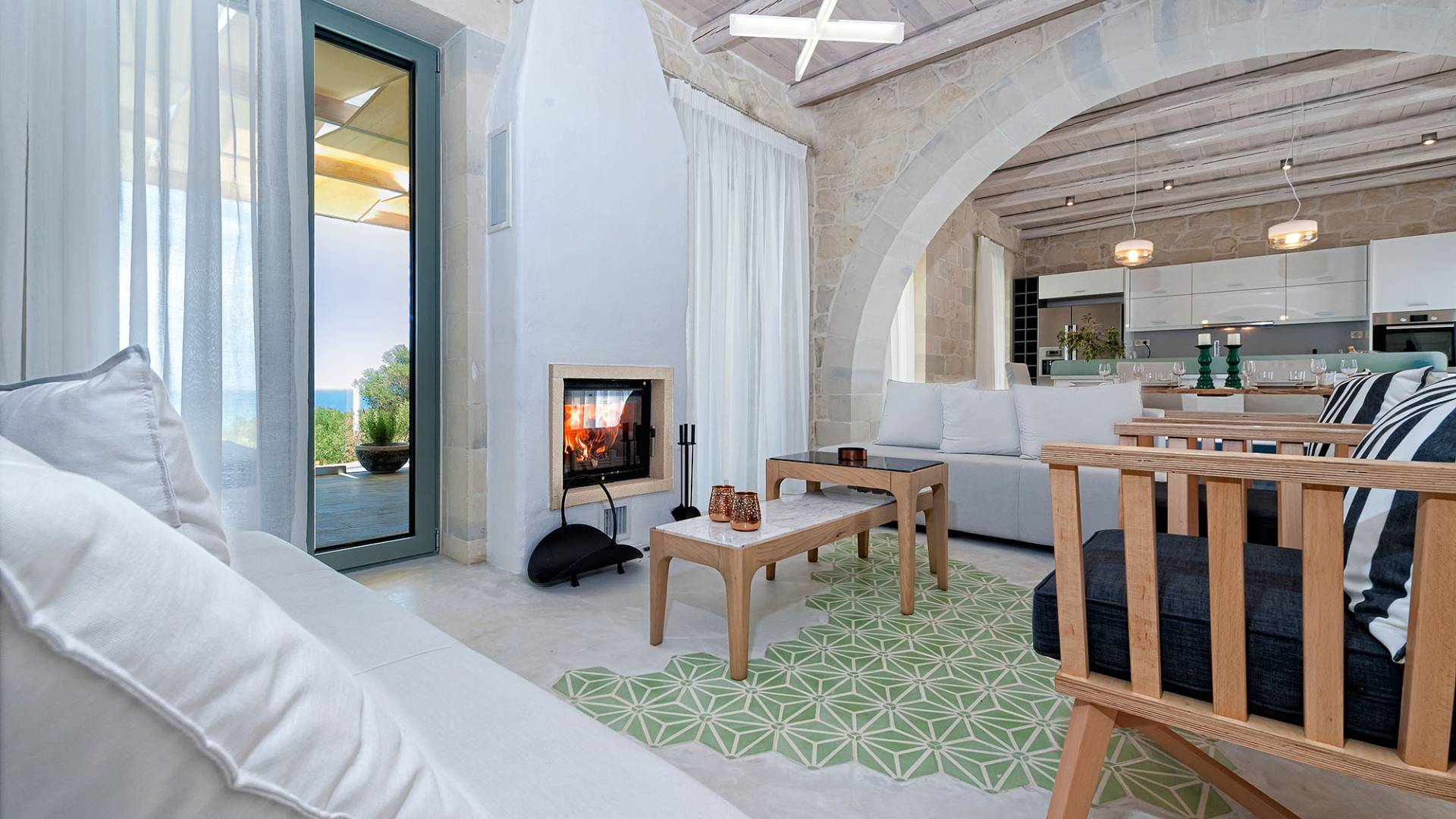 Ενιαίος χώρος καθιστικού, όπου τα χειροποίητα πλακάκια και το τζάκι δημιουργούν την τέλεια ατμόσφαιρα.