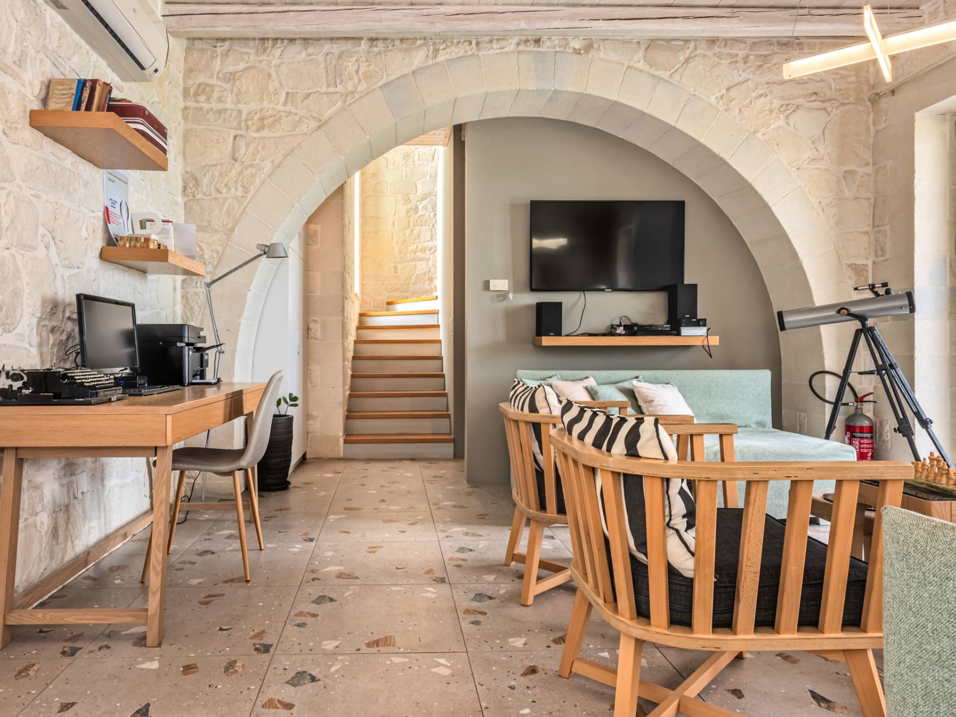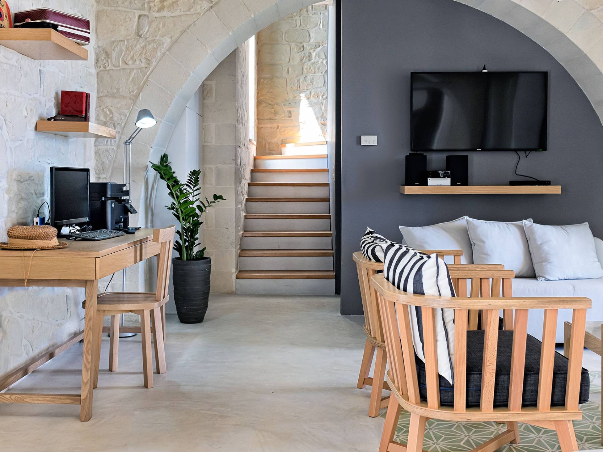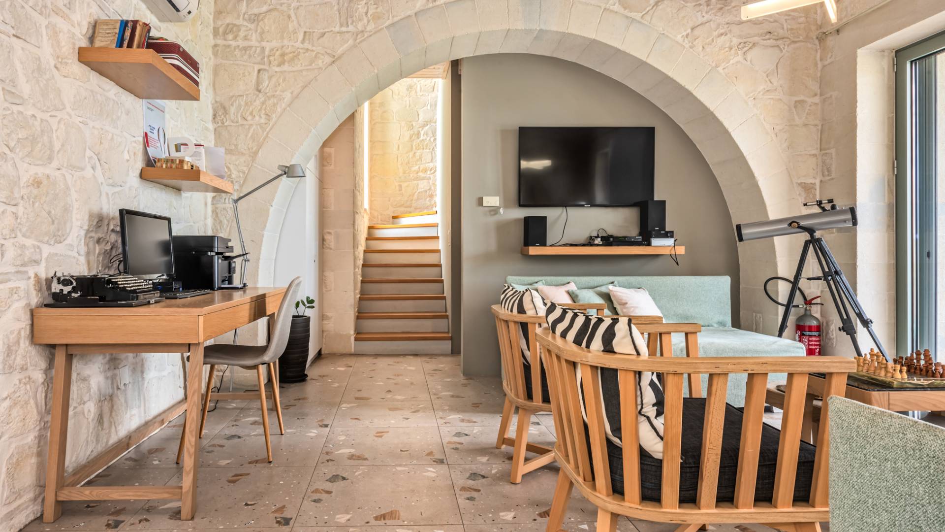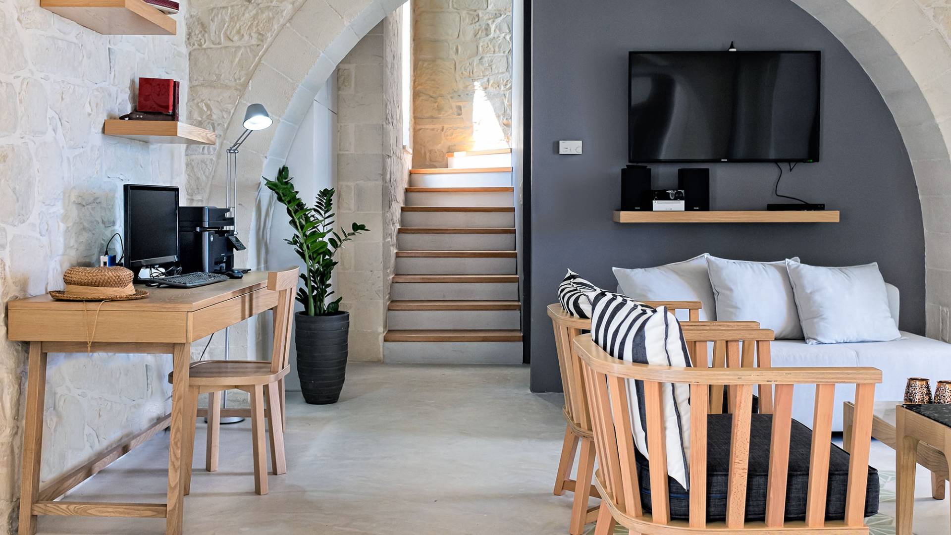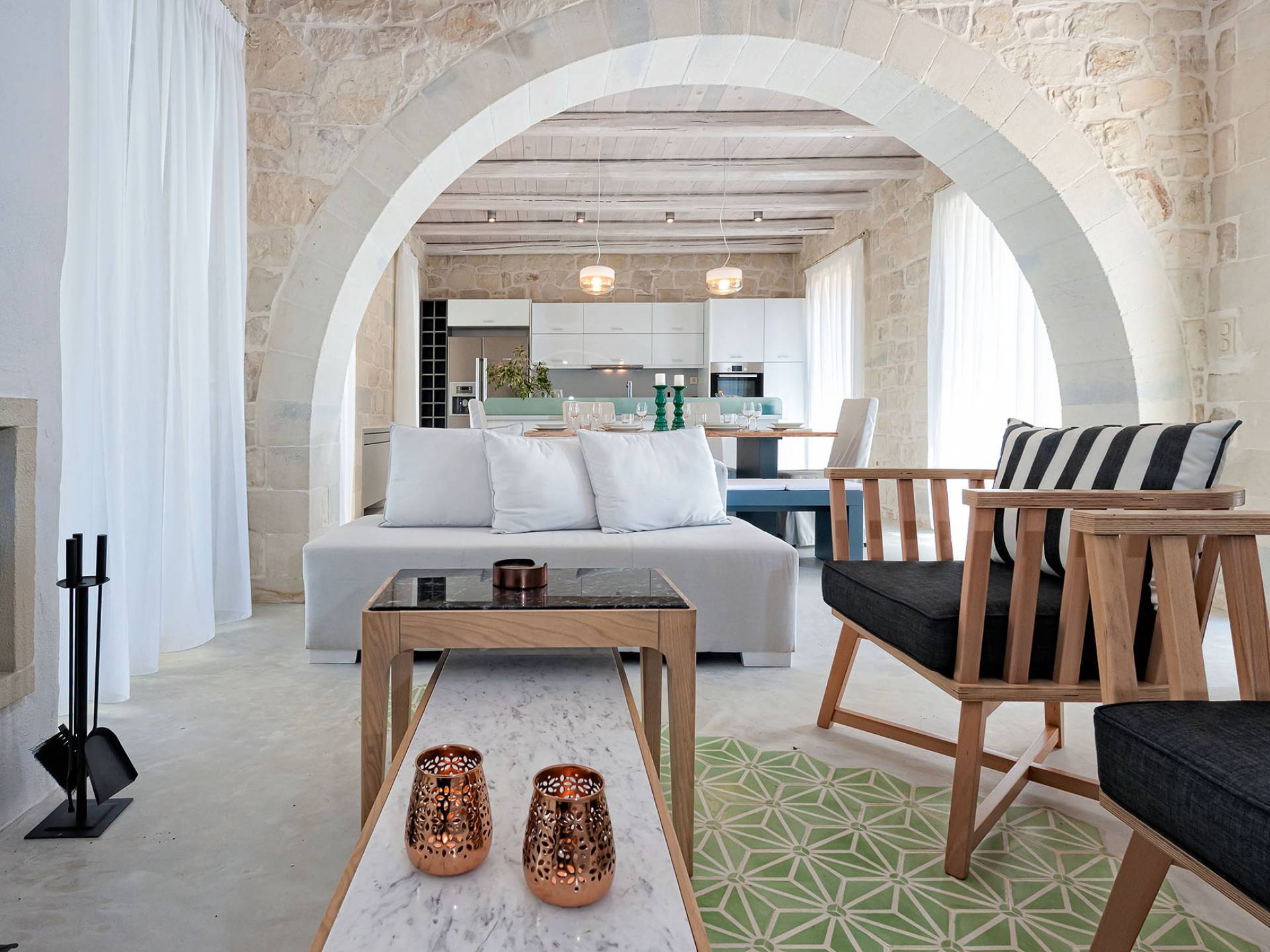 Ενιαίος χώρος καθιστικού, όπου τα χειροποίητα πλακάκια και το τζάκι δημιουργούν την τέλεια ατμόσφαιρα.
