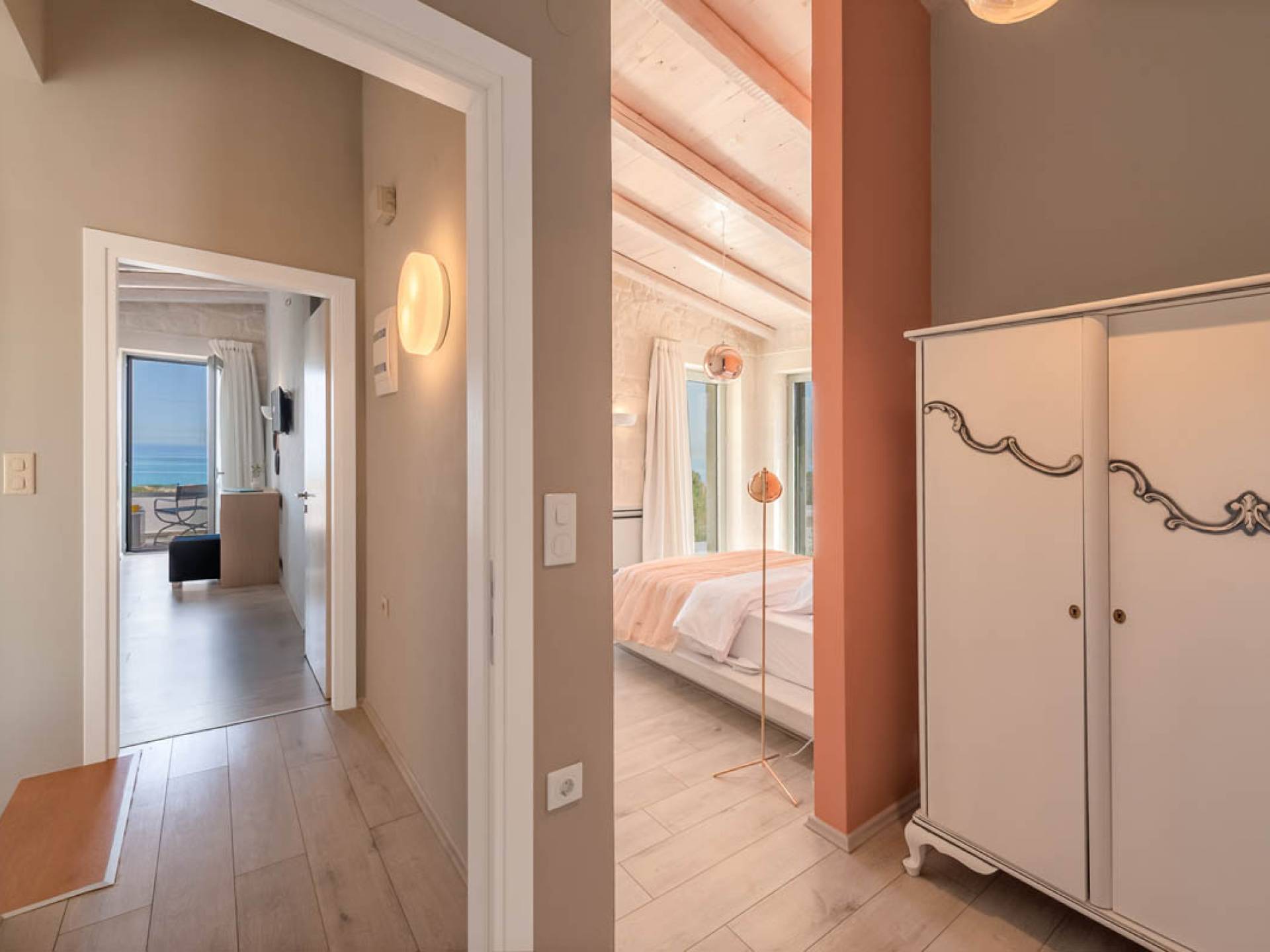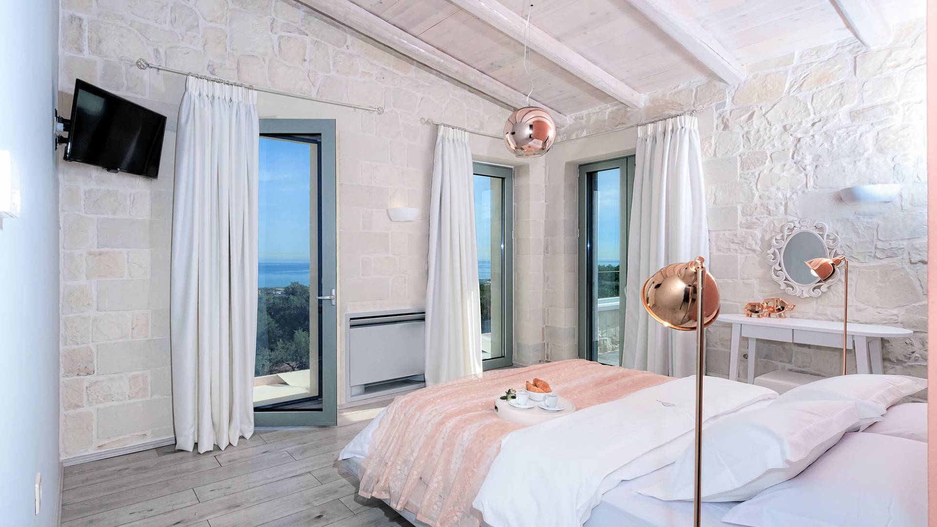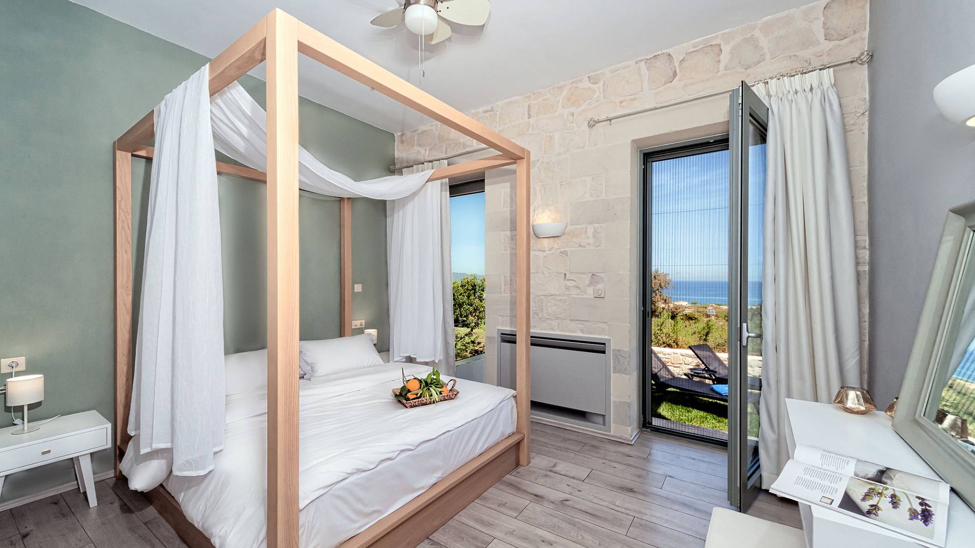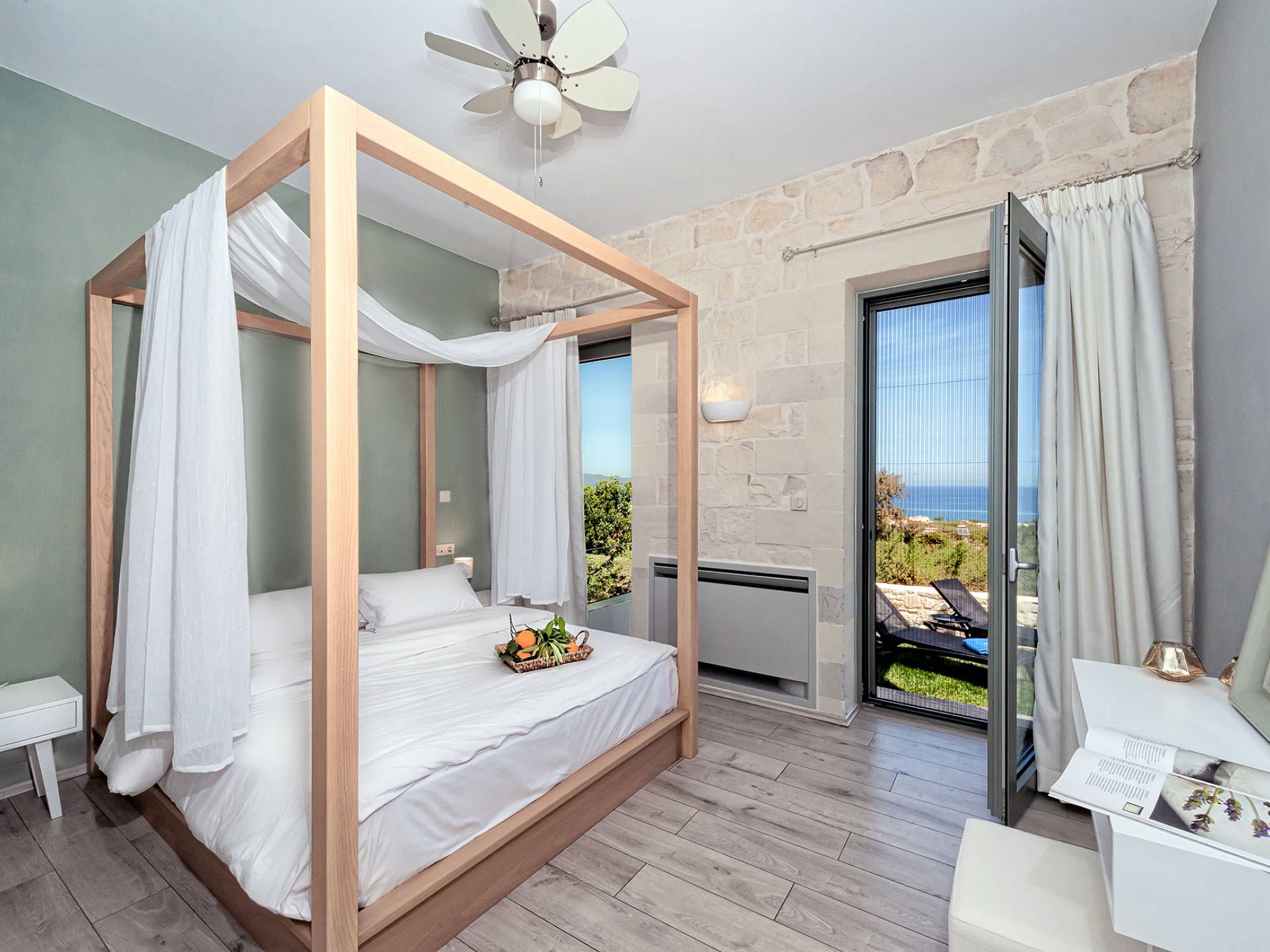 Κύριο Υπνοδωμάτιο: Κομψό κρεβάτι και ιδιωτική βεράντα κάτω από τη σκιά ενός αιωνόβιου ελαιόδεντρου.
