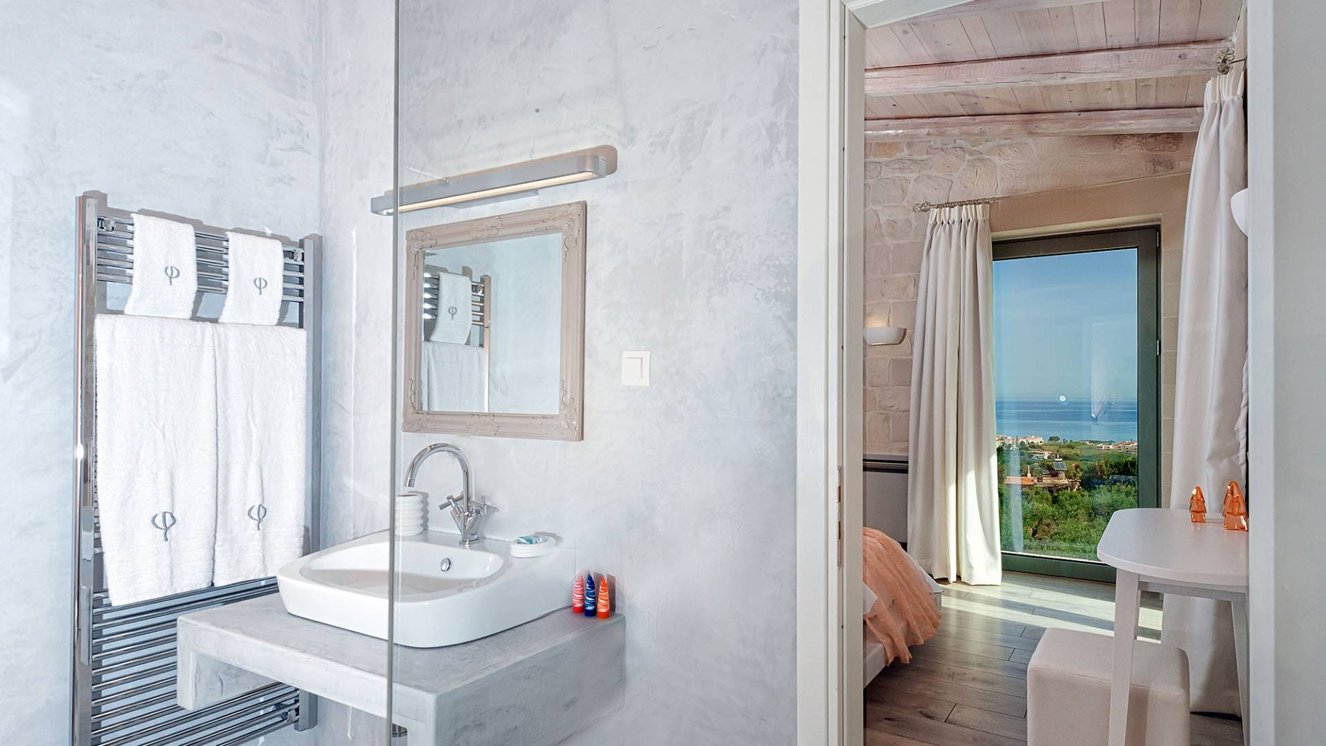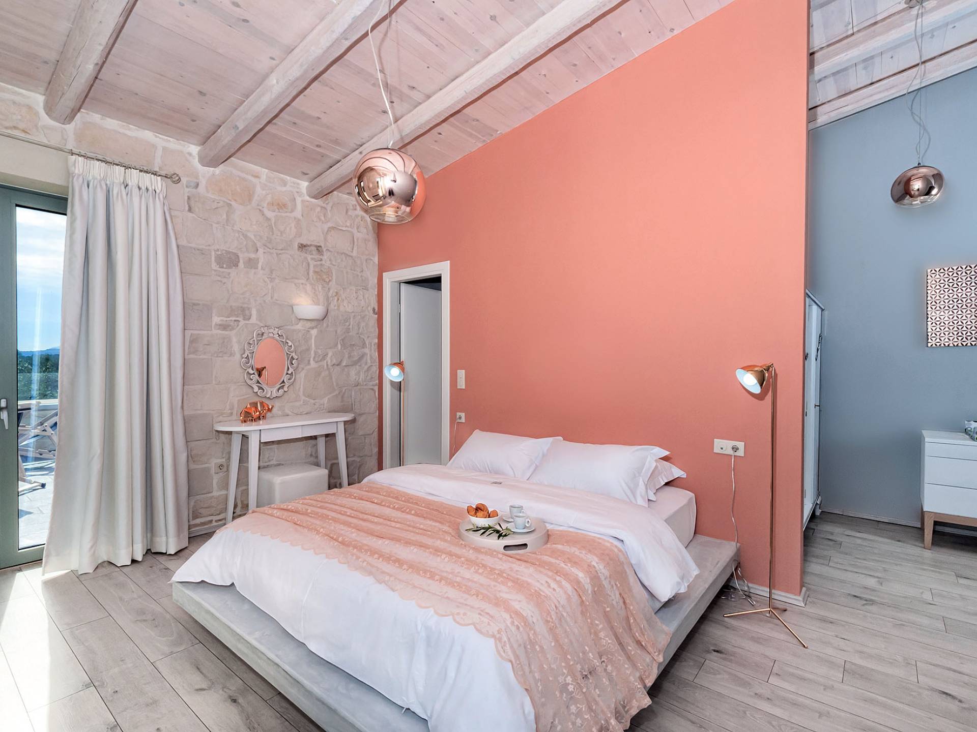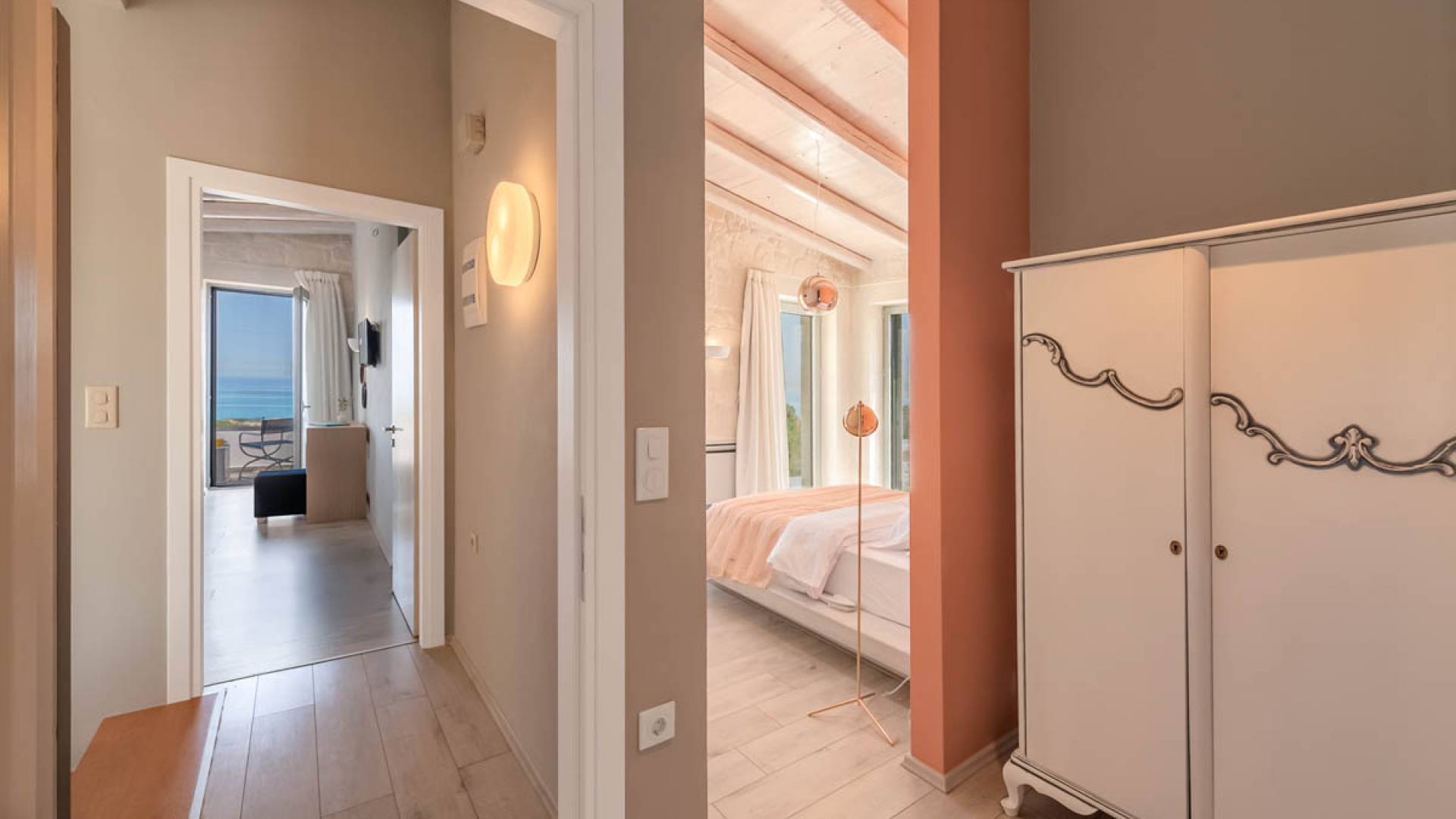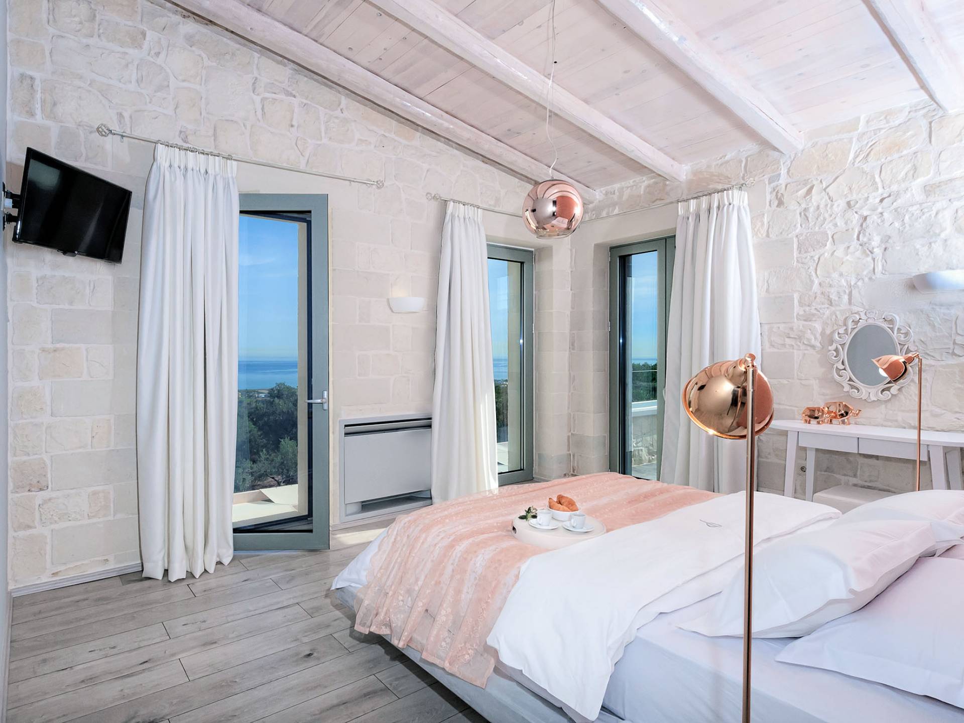Κύριο Υπνοδωμάτιο: Κομψό κρεβάτι και ιδιωτική βεράντα κάτω από τη σκιά ενός αιωνόβιου ελαιόδεντρου.