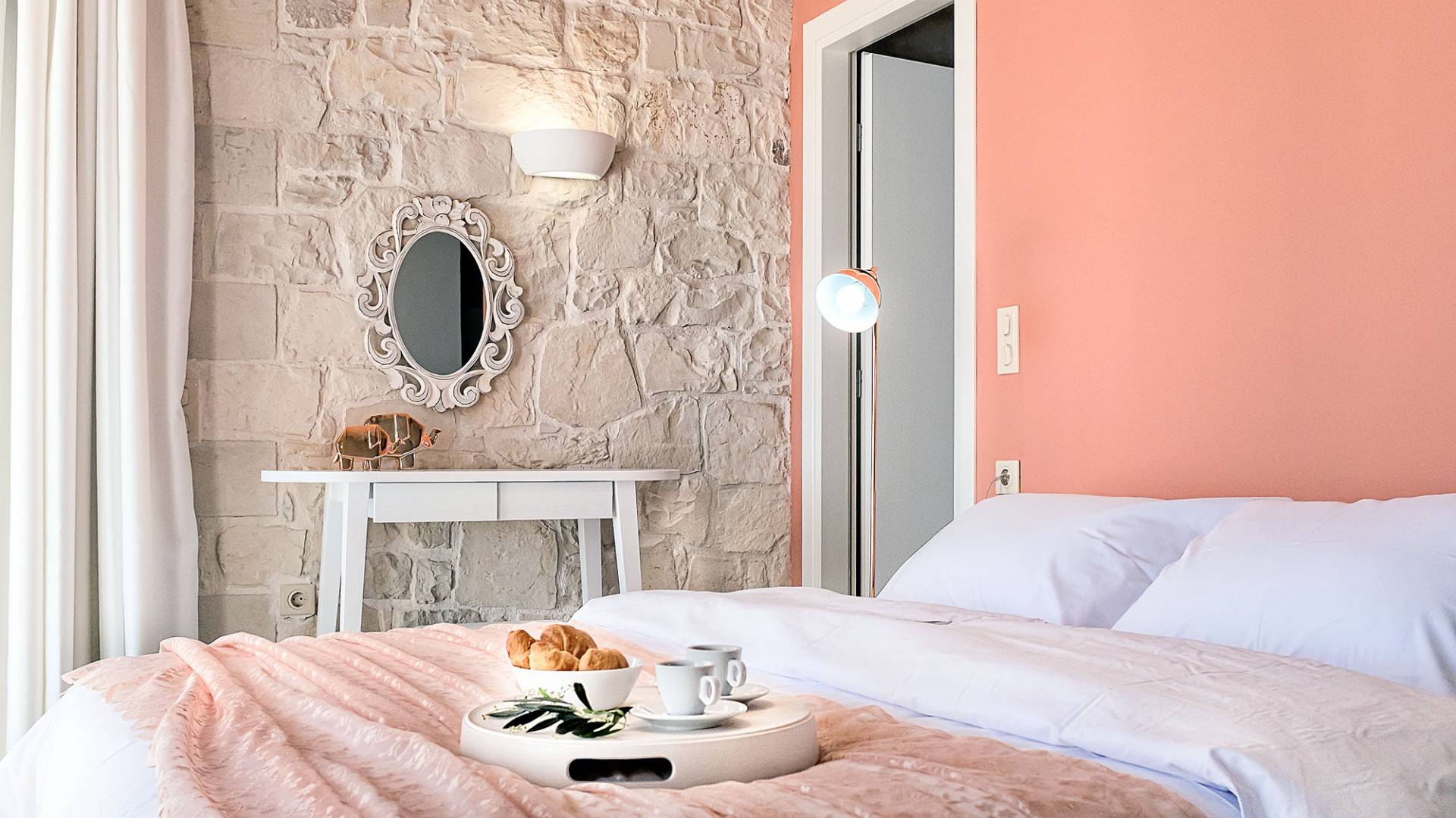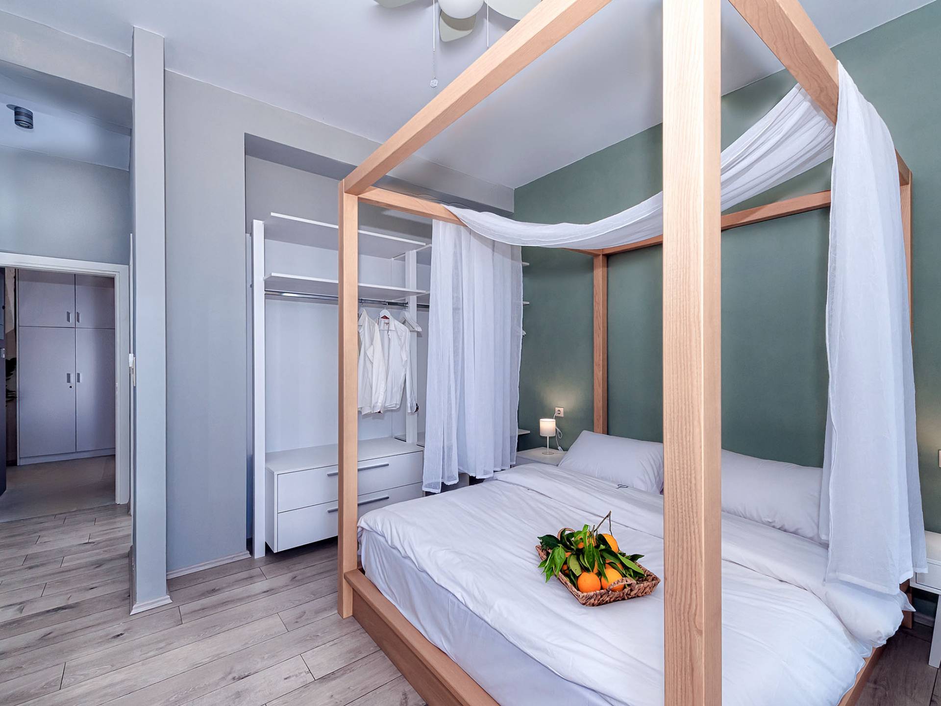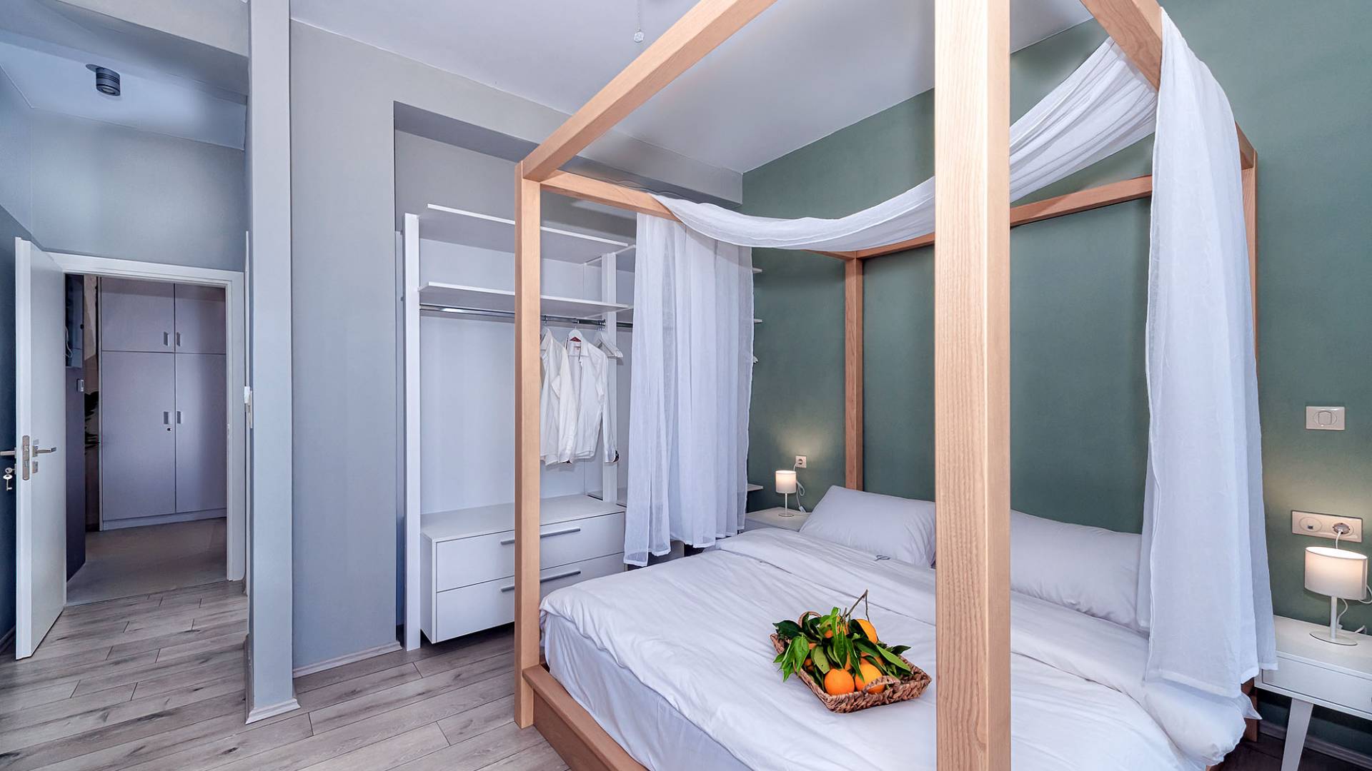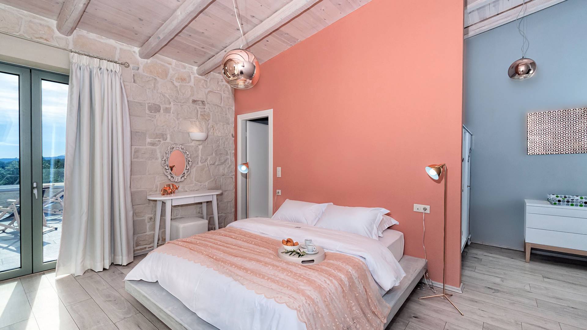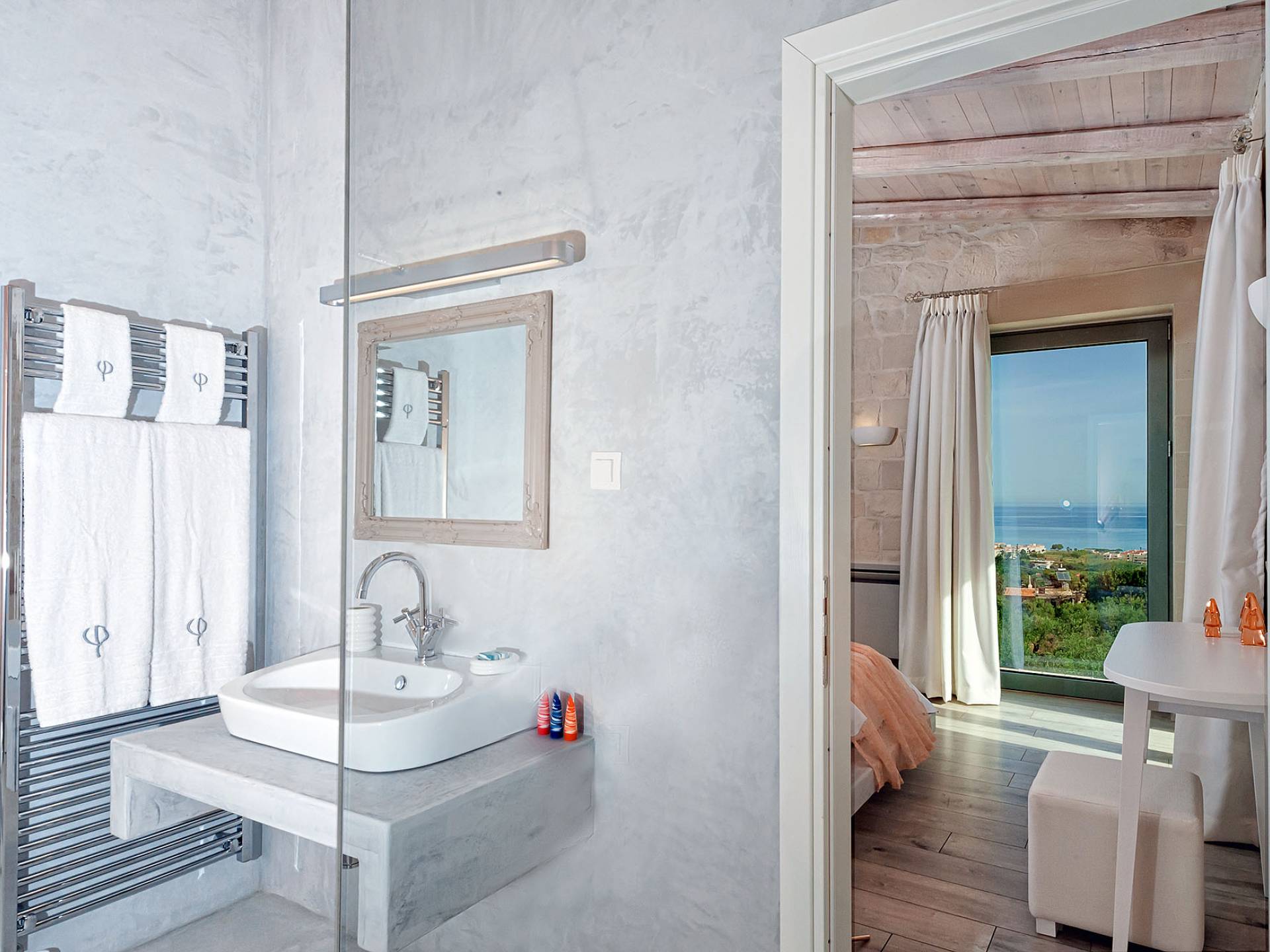 Κύριο Υπνοδωμάτιο: Κομψό κρεβάτι και ιδιωτική βεράντα κάτω από τη σκιά ενός αιωνόβιου ελαιόδεντρου.