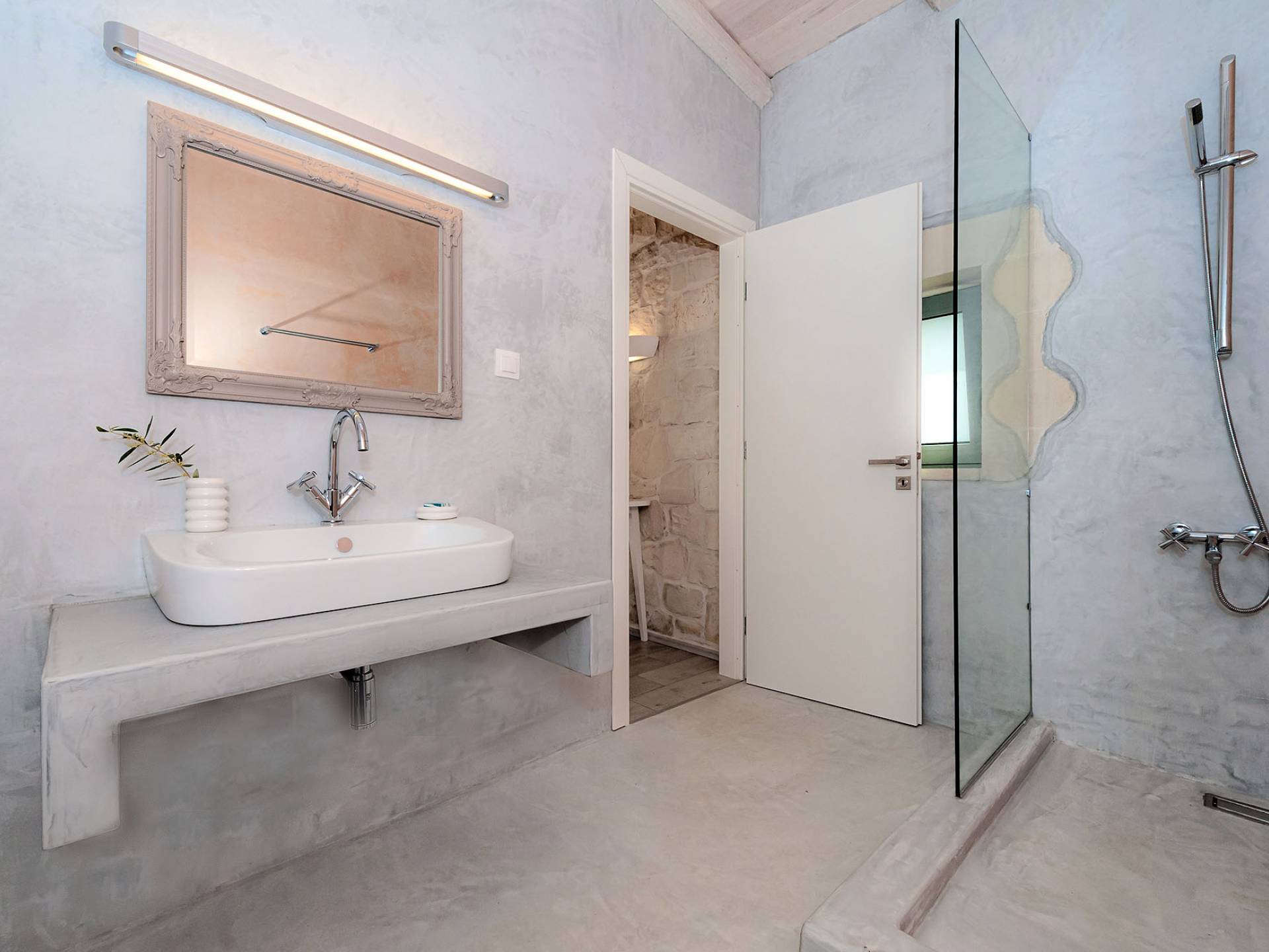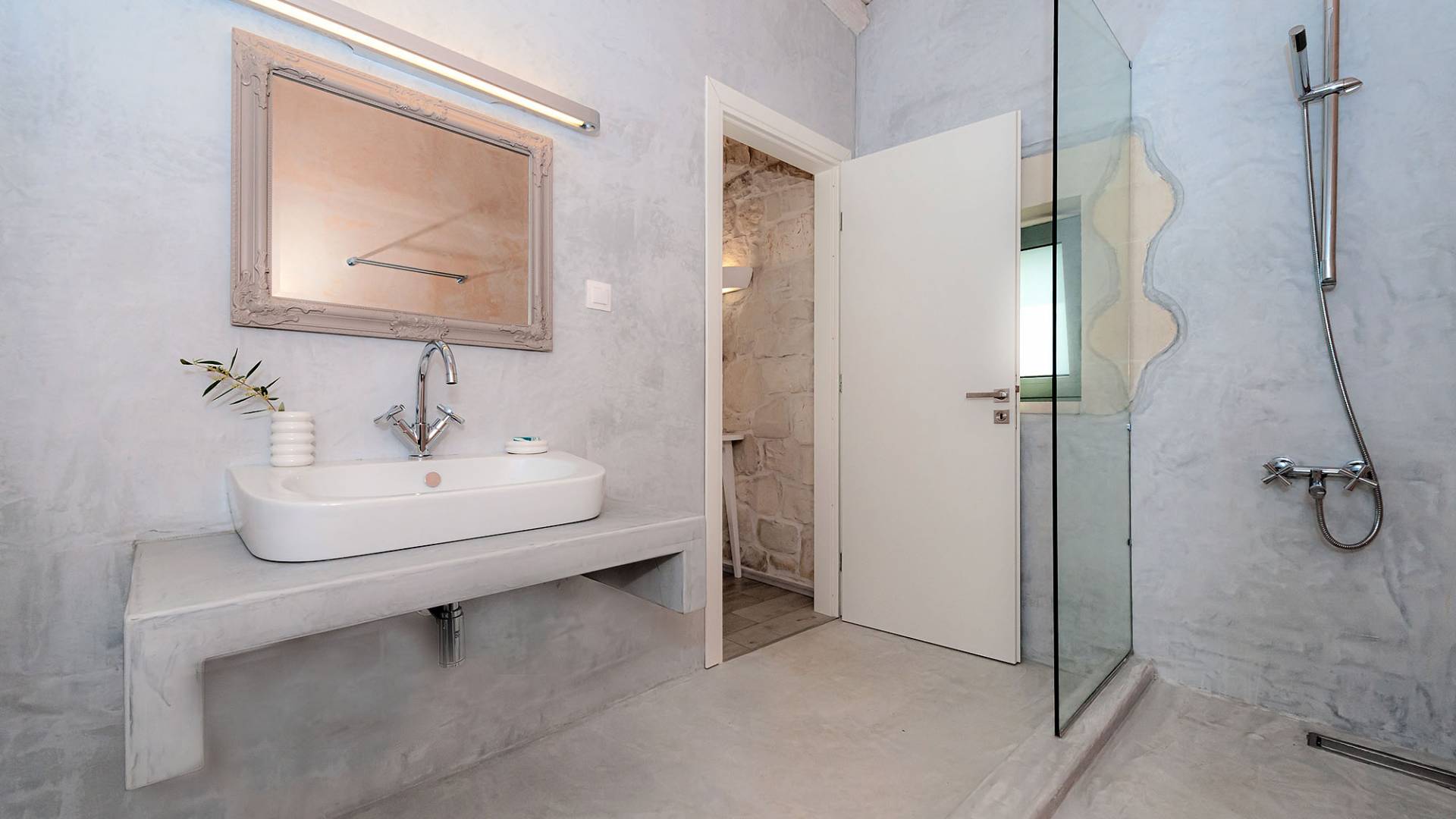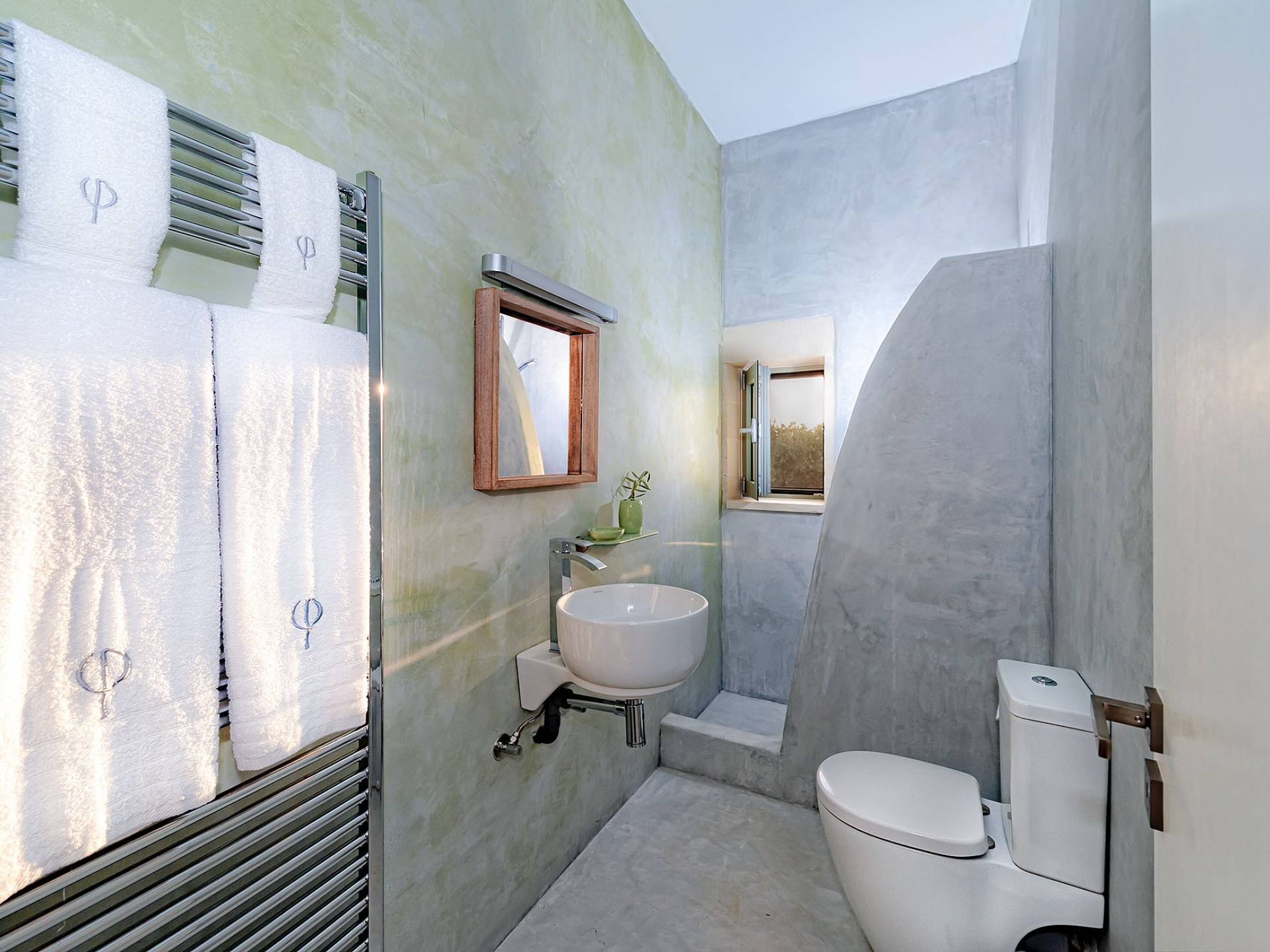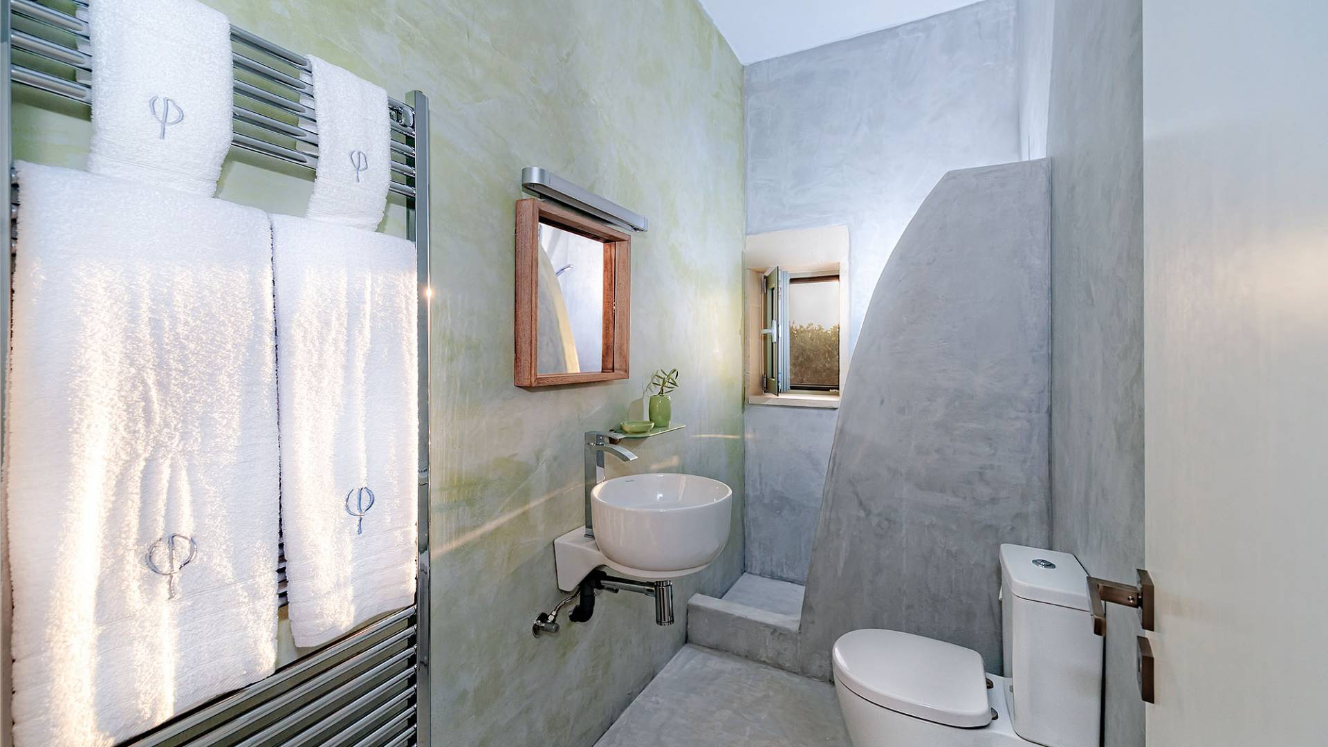 Κύριο Υπνοδωμάτιο: Κομψό κρεβάτι και ιδιωτική βεράντα κάτω από τη σκιά ενός αιωνόβιου ελαιόδεντρου.