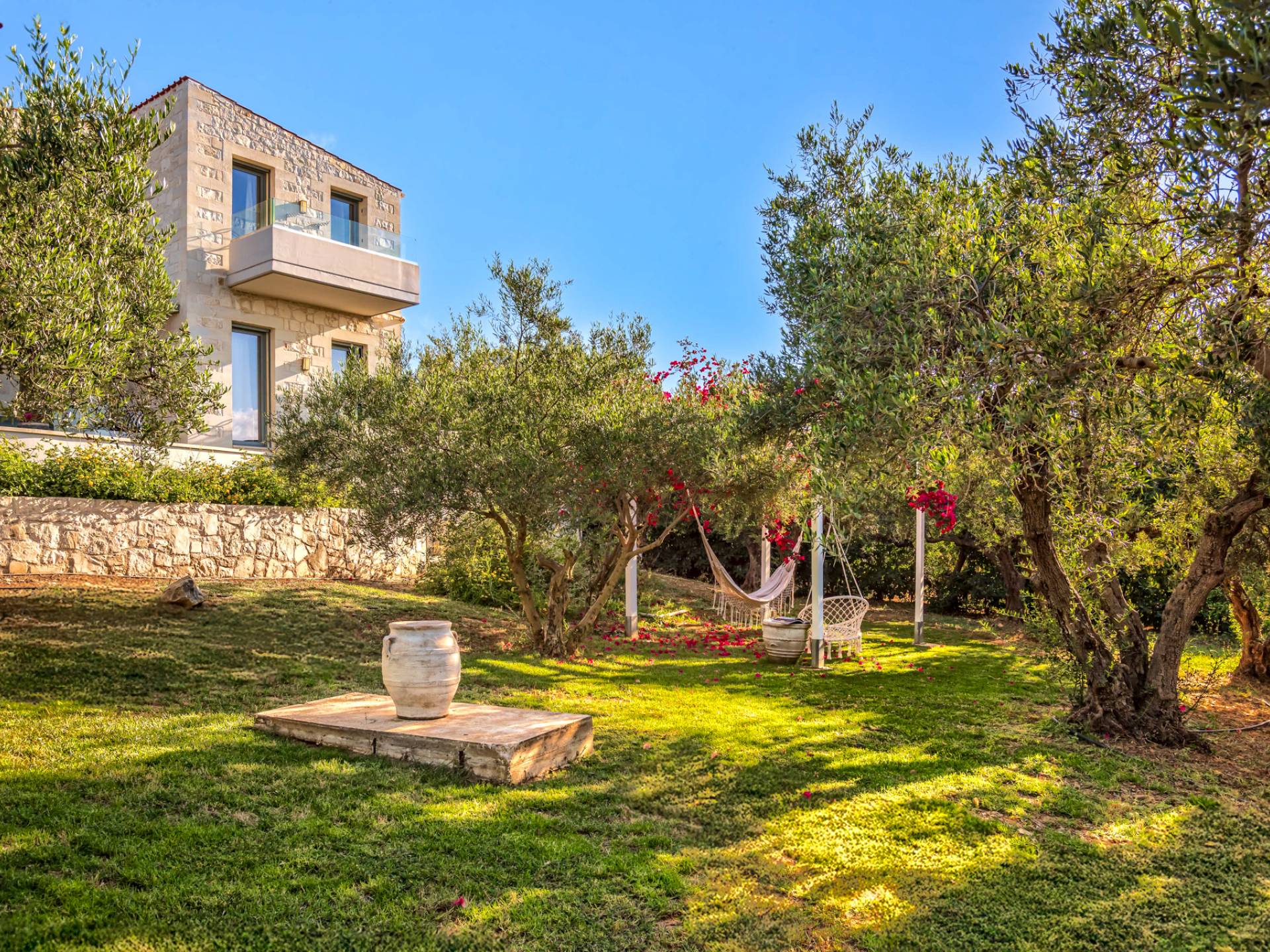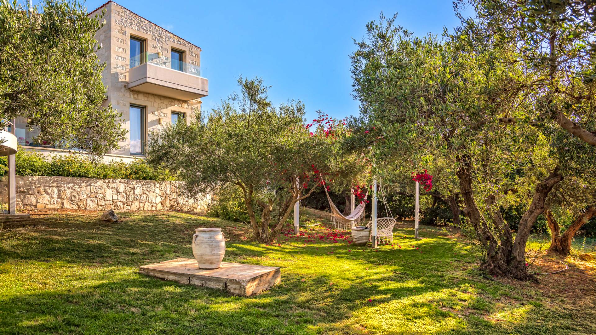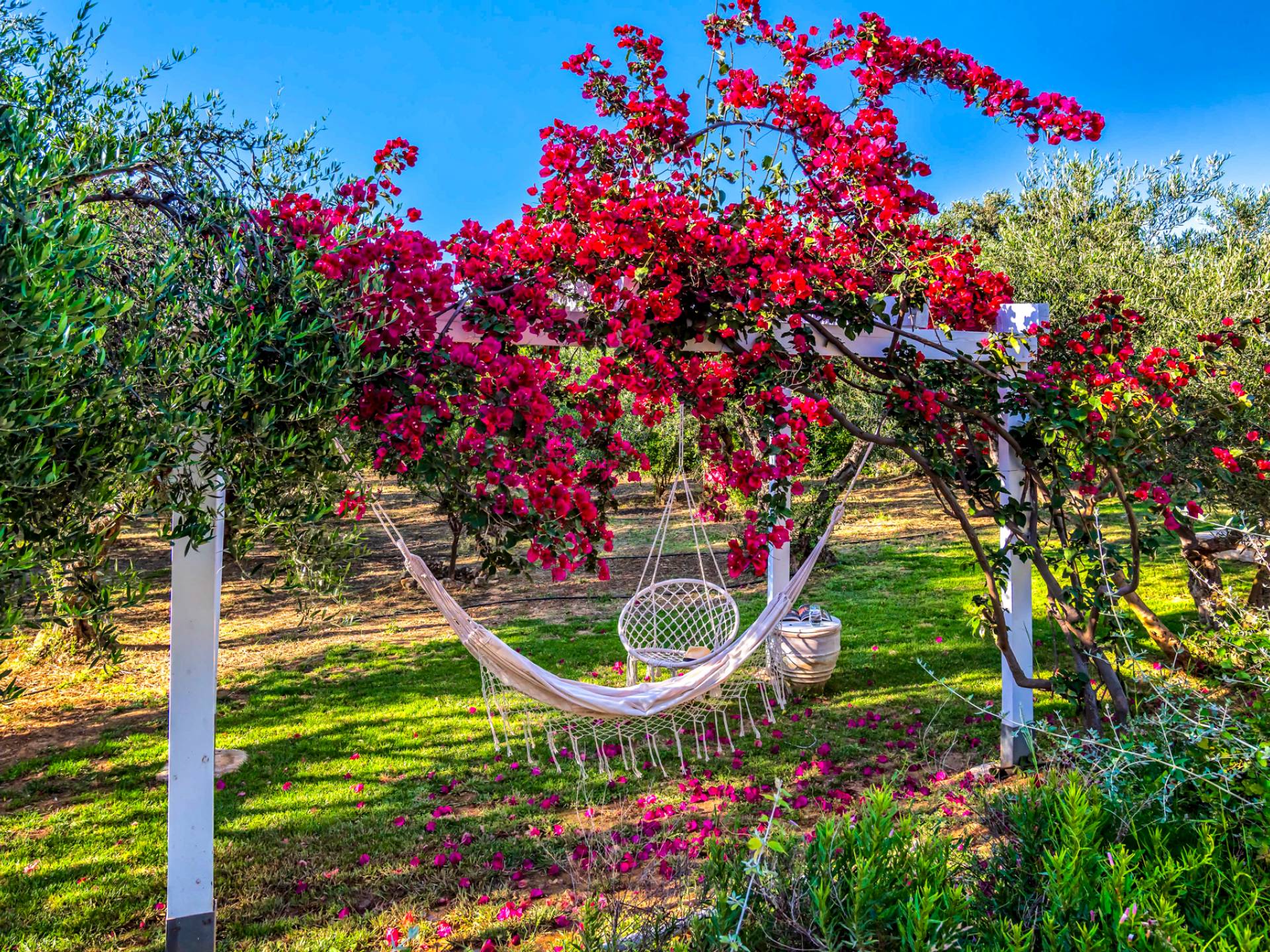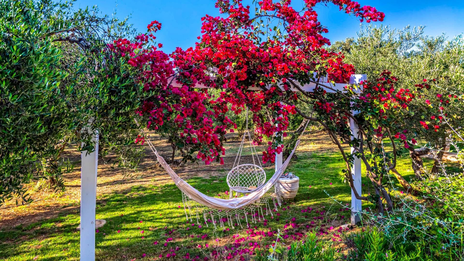 Καταπράσινος κήπος με ελαιόδεντρα και γωνιά χαλάρωσης με αιώρα.