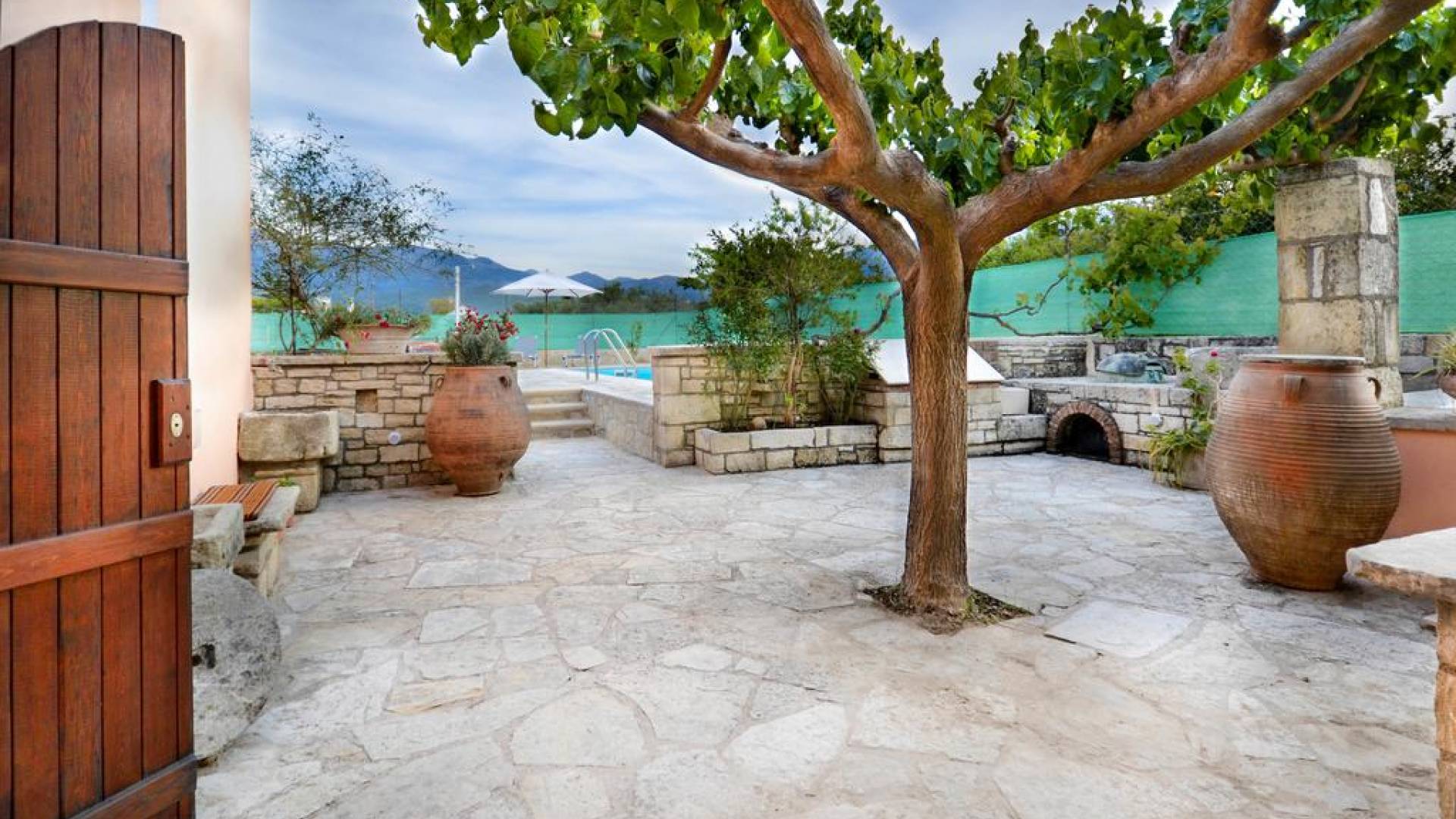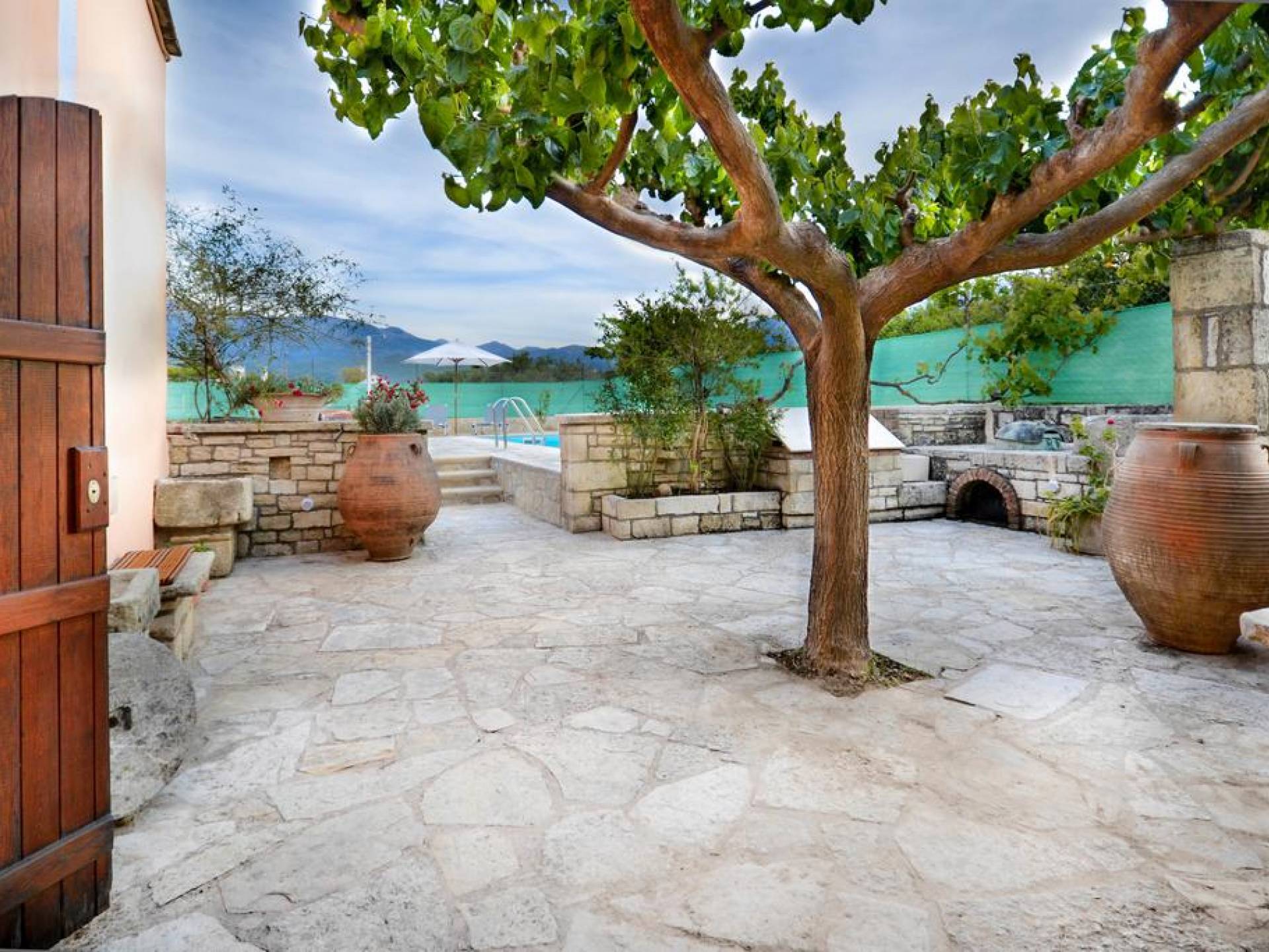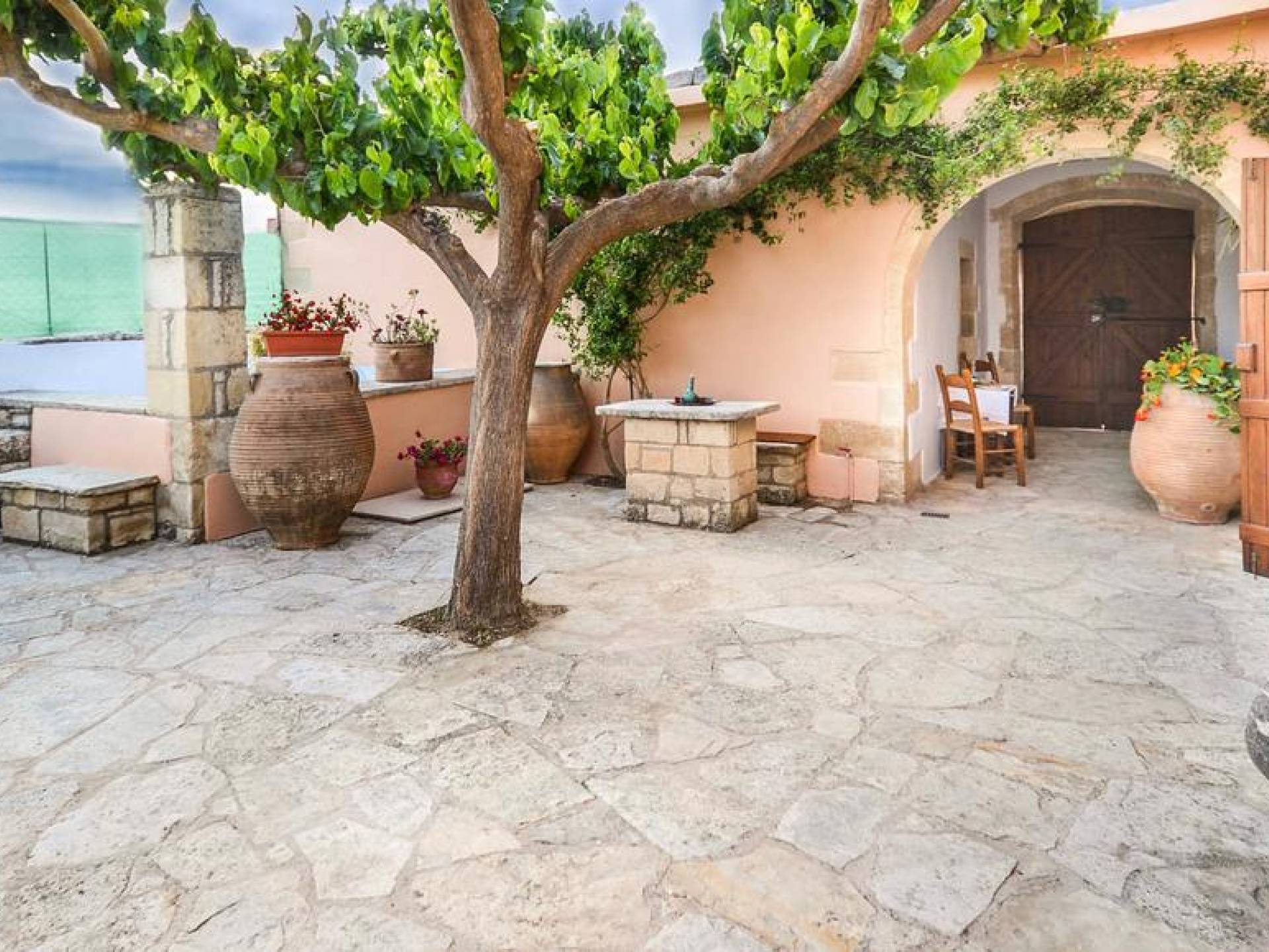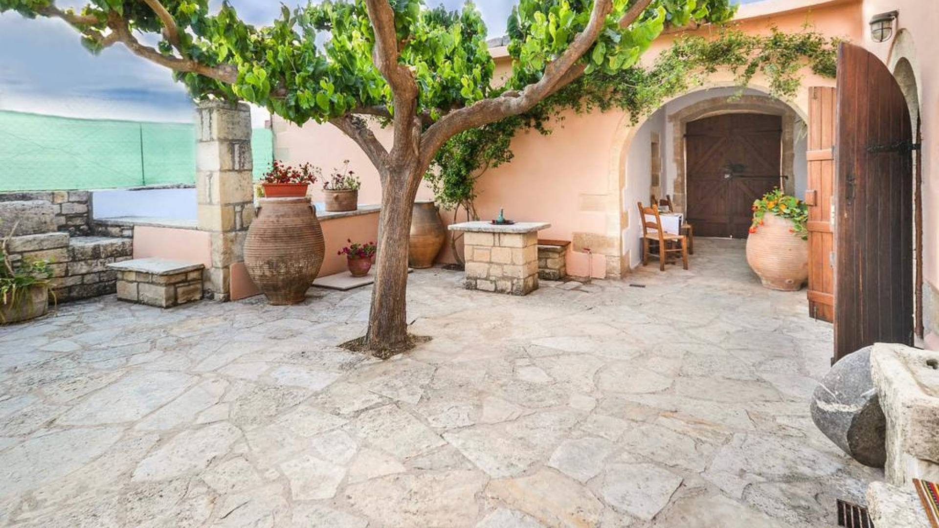 Οι επισκέπτες του Rodi Villa Chania μπορούν να απολαύσουν έναν υπέροχο μυρωδάτο κήπο με πολύχρωμα λουλούδια και εκπληκτική θέα. Η κλειστή παραδοσιακή αυλή με τον μοναδικό κήπο και τα φυτεμένα βιολογικά προϊόντα διασφαλίζει την απόλυτη ιδιωτικότητα και ασφάλεια των επισκεπτών. Το παλιό πατητήρι και ο λέβητας απόσταξης αποτελούν το συγκριτικό πλεονέκτημα της Rodi Villa Chania καθώς χρησιμοποιούνταν για την παραγωγή κρασιού και τσικουδιάς, από σταφύλια των αμπελώνων της οικογένειας Ανδριανάκη. Είναι μια μοναδική εμπειρία για όσους επισκέπτονται το Rodi Villa Chania την περίοδο του τρύγου και συμμετέχουν στη διαδικασία του κρασιού και της τσικουδιάς αντίστοιχα. Το φυσικό περιβάλλον της αυλής της βίλας είναι διακοσμημένο με πισίνα 21τ.μ. και χώρο μπάρμπεκιου όπου οι επισκέπτες μπορούν να περάσουν στιγμές χαλάρωσης, απόλαυσης και να έχουν επίσης την ευκαιρία να γευτούν νόστιμα πιάτα και καλαίσθητες λιχουδιές απολαμβάνοντας την ευχάριστη σκιά κάτω από μια μεγάλη μουριά.