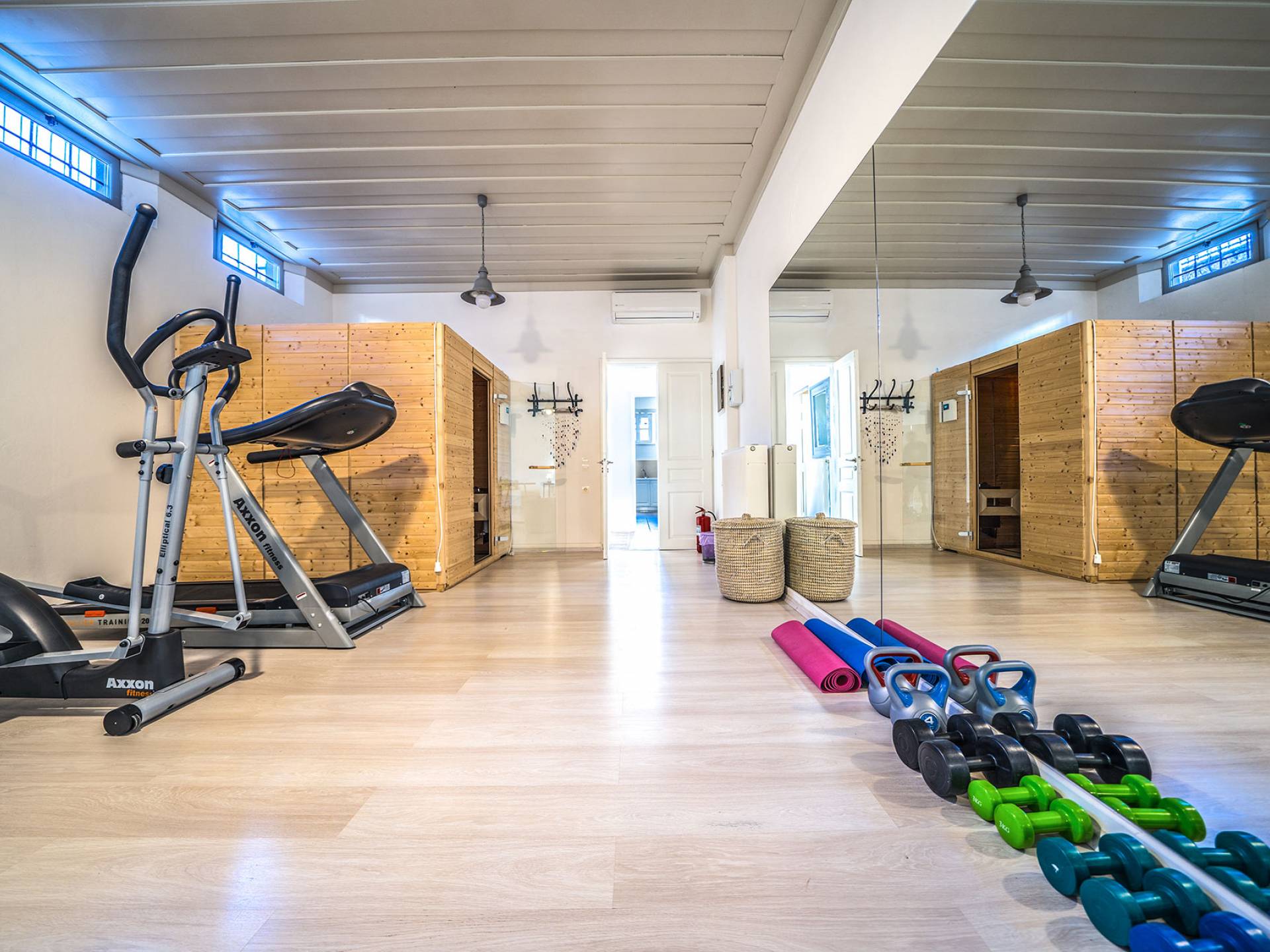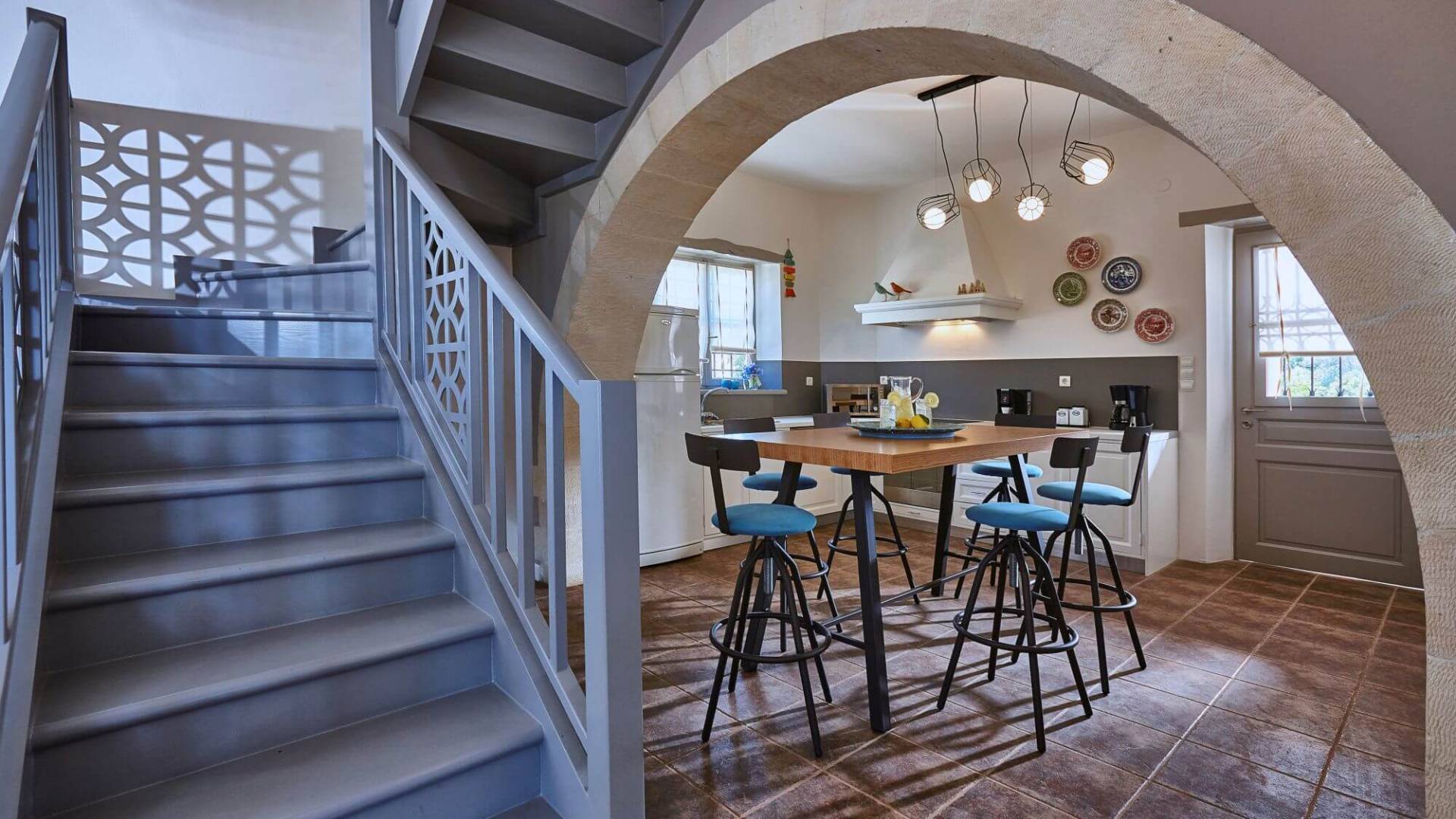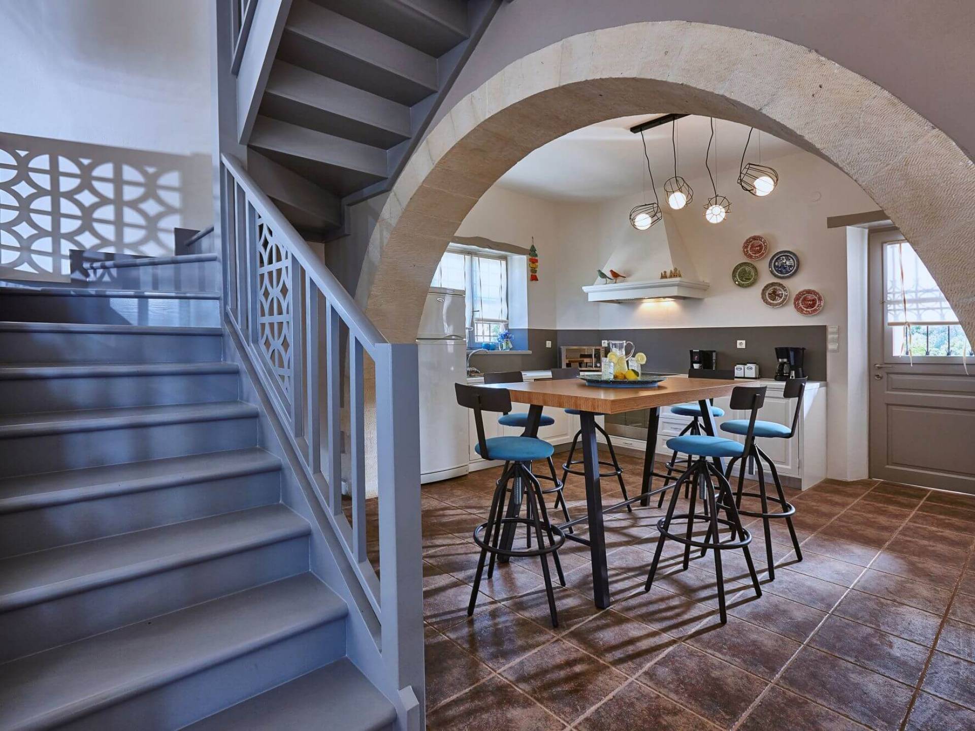 Καθώς μπαίνετε στο κατάλυμα, συναντάτε έναν χώρο πλήρως εξοπλισμένης κουζίνας και το σαλόνι αυτού του ακινήτου συμπληρώνεται με το γυμναστήριο. Τα τεράστια παράθυρα επιτρέπουν στο φυσικό φως να εισέλθει και το κάνουν πιο φωτεινό και ευχάριστο. Υπάρχουν επίσης δύο υπνοδωμάτια με ιδιωτικό μπάνιο εξοπλισμένο με υδρομασάζ. Το κελάρι με τοπικά κρασιά και μικρό αποθηκευτικό χώρο συμπληρώνουν το ισόγειο.