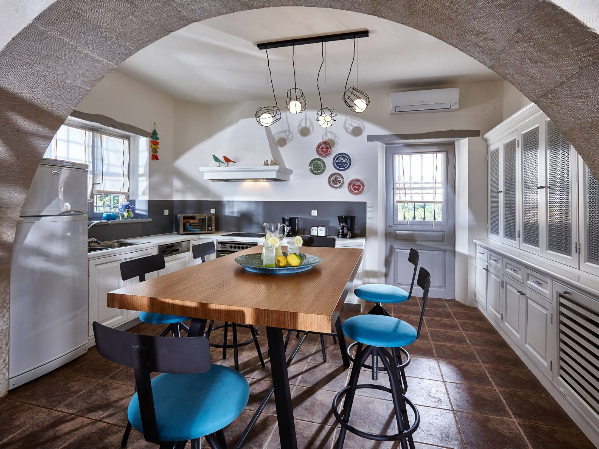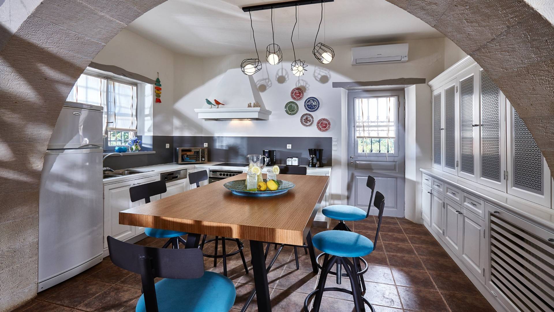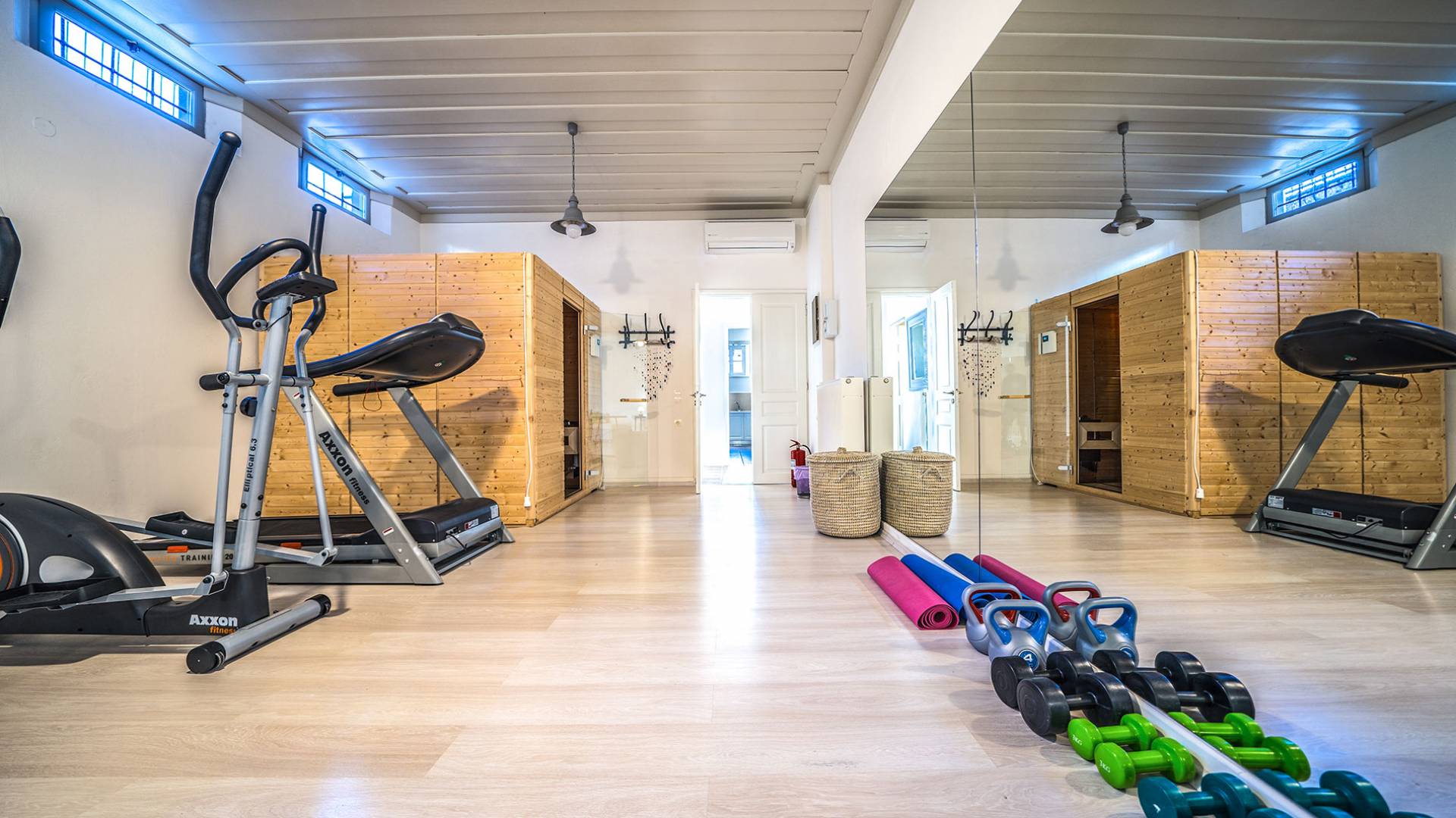 Καθώς μπαίνετε στο κατάλυμα, συναντάτε έναν χώρο πλήρως εξοπλισμένης κουζίνας και το σαλόνι αυτού του ακινήτου συμπληρώνεται με το γυμναστήριο. Τα τεράστια παράθυρα επιτρέπουν στο φυσικό φως να εισέλθει και το κάνουν πιο φωτεινό και ευχάριστο. Υπάρχουν επίσης δύο υπνοδωμάτια με ιδιωτικό μπάνιο εξοπλισμένο με υδρομασάζ. Το κελάρι με τοπικά κρασιά και μικρό αποθηκευτικό χώρο συμπληρώνουν το ισόγειο.