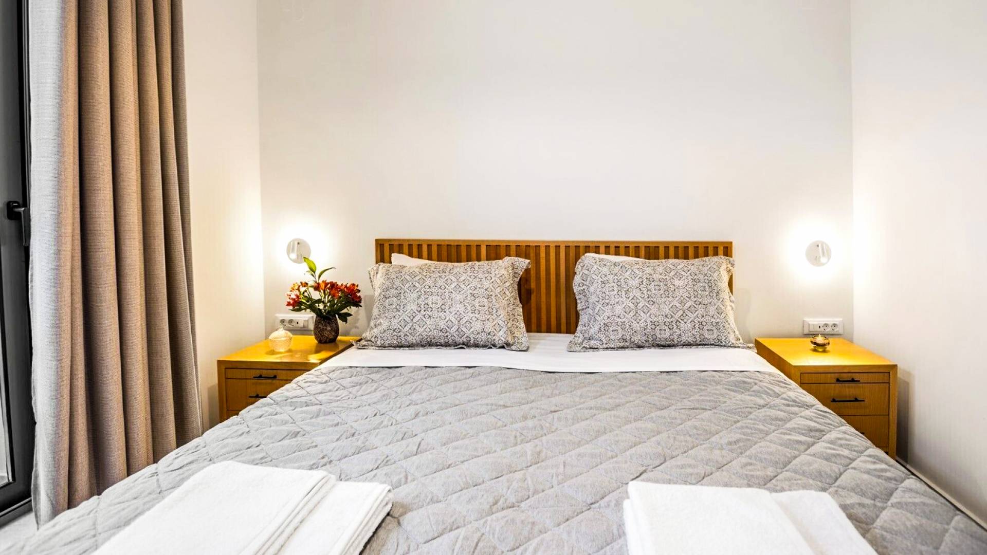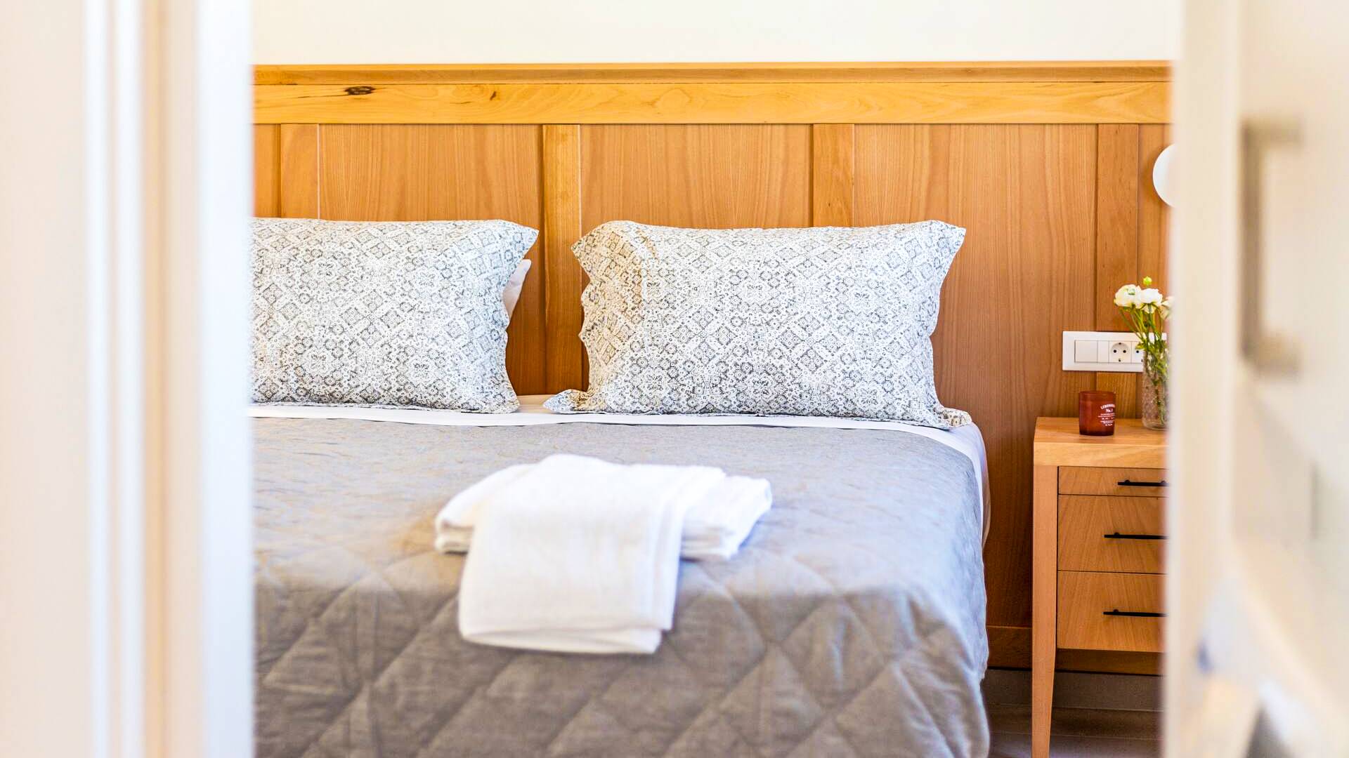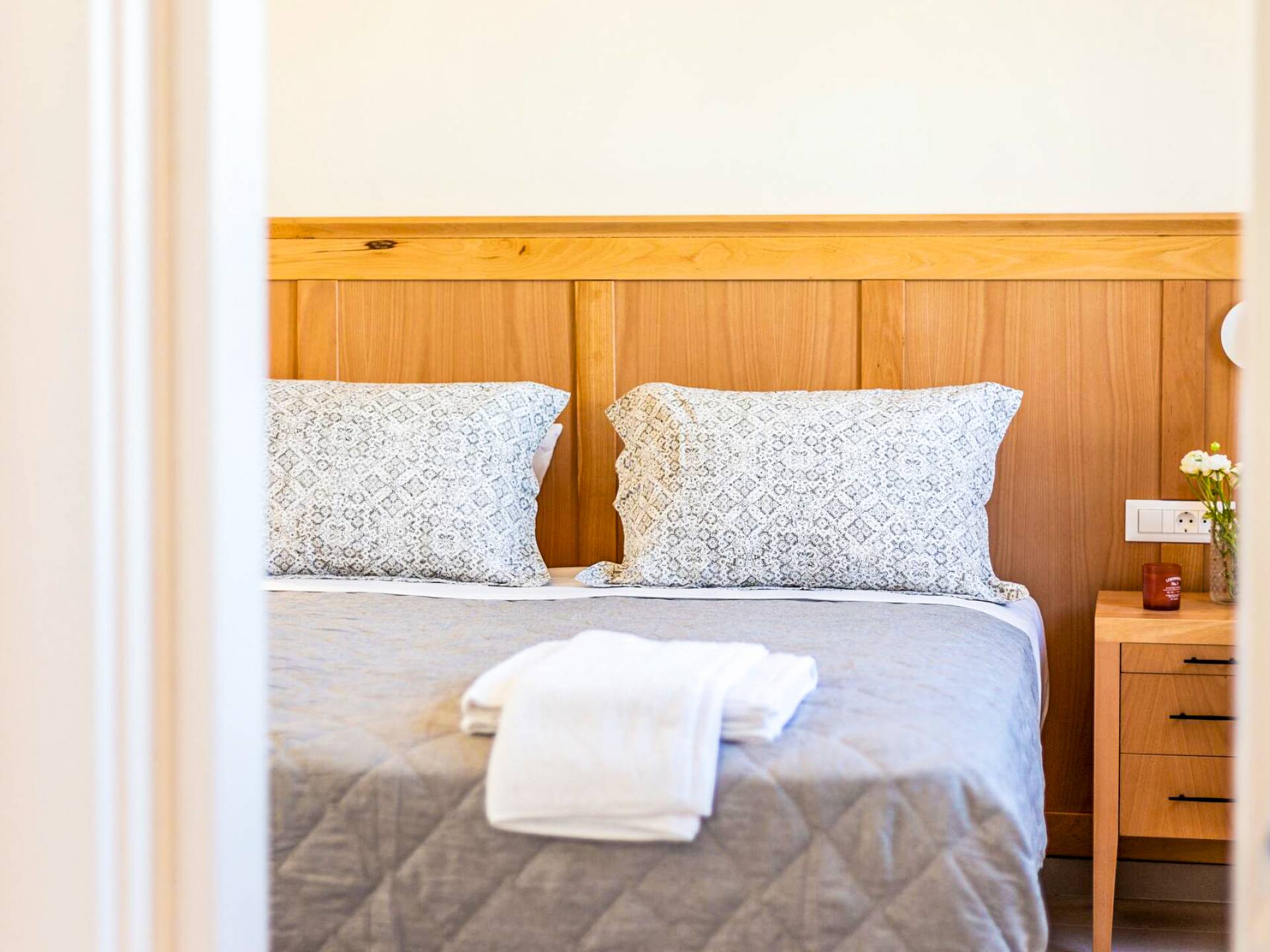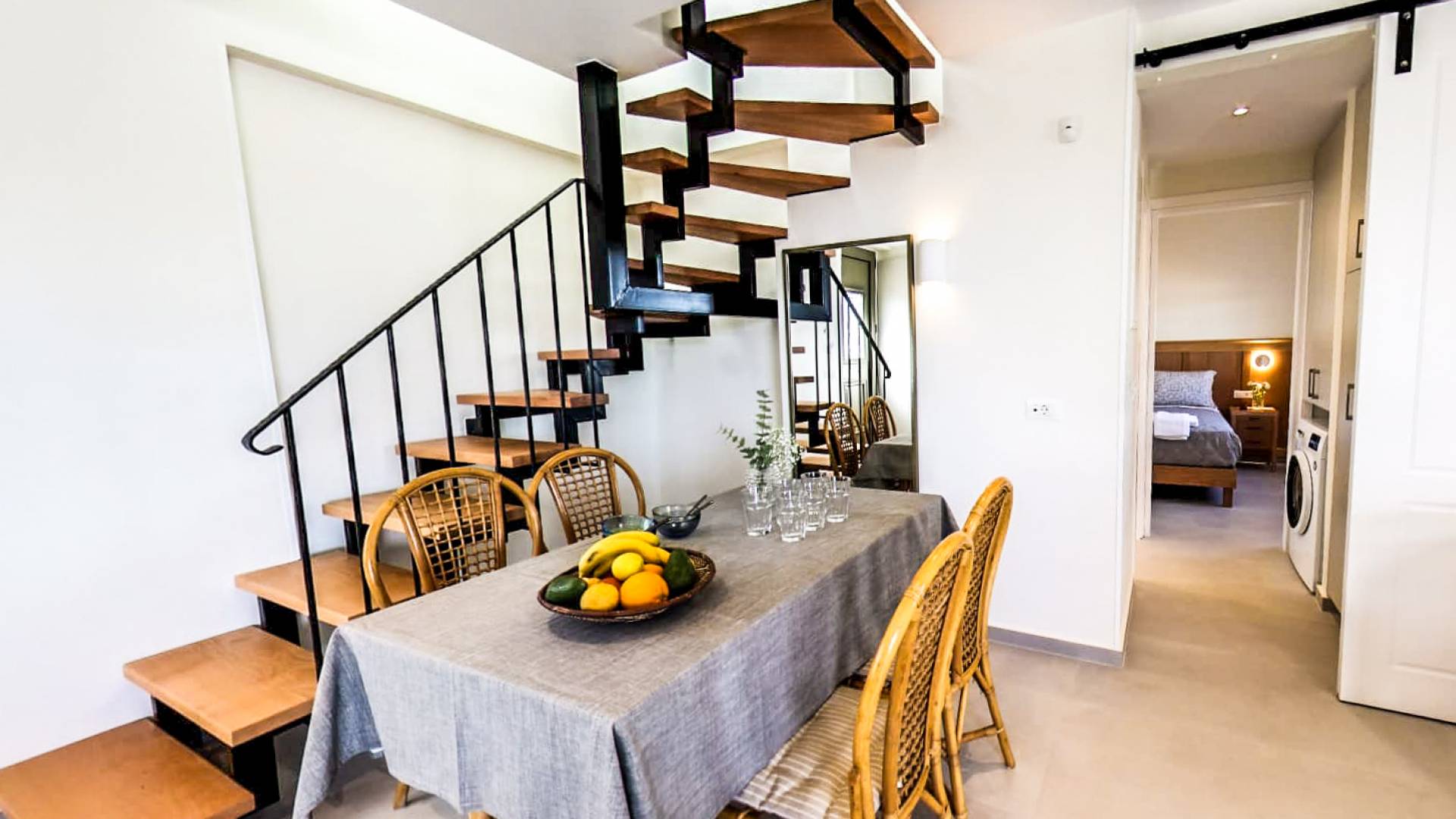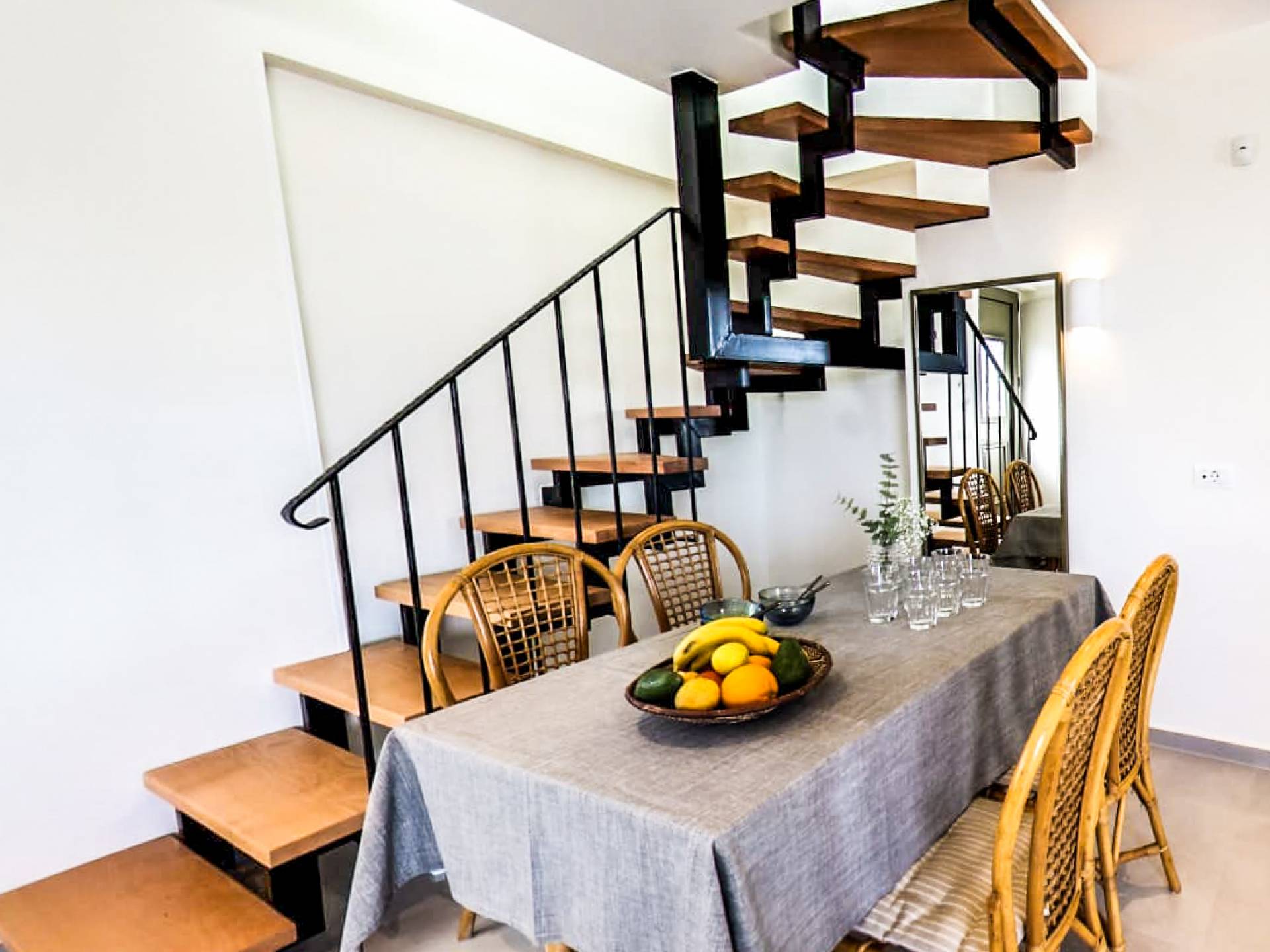 The first apartment is 85 square meters and consists of a ground floor and an attic. On the ground floor you will find a spacious living room with a fully equipped kitchen, a dining room with a sitting space, a bathroom with a shower,a bedroom and a hall that provides ample storage as well as a washing machine. The king-size bedroom features exquisite mattress quality. A beauty dressing room with mirror and wardrobe complete the picture. The modern bathroom offers a shower and provides toiletries, a hair dryer and a full set of towels. From the sitting area, there is access to a spacious terrace which offers a view of the swimming pool and the garden. The kitchen looks out to the mountains and allows you to prepare all of your meals. The dining table has space for 4 people while the terrace table offers the option of dining for 8 people.