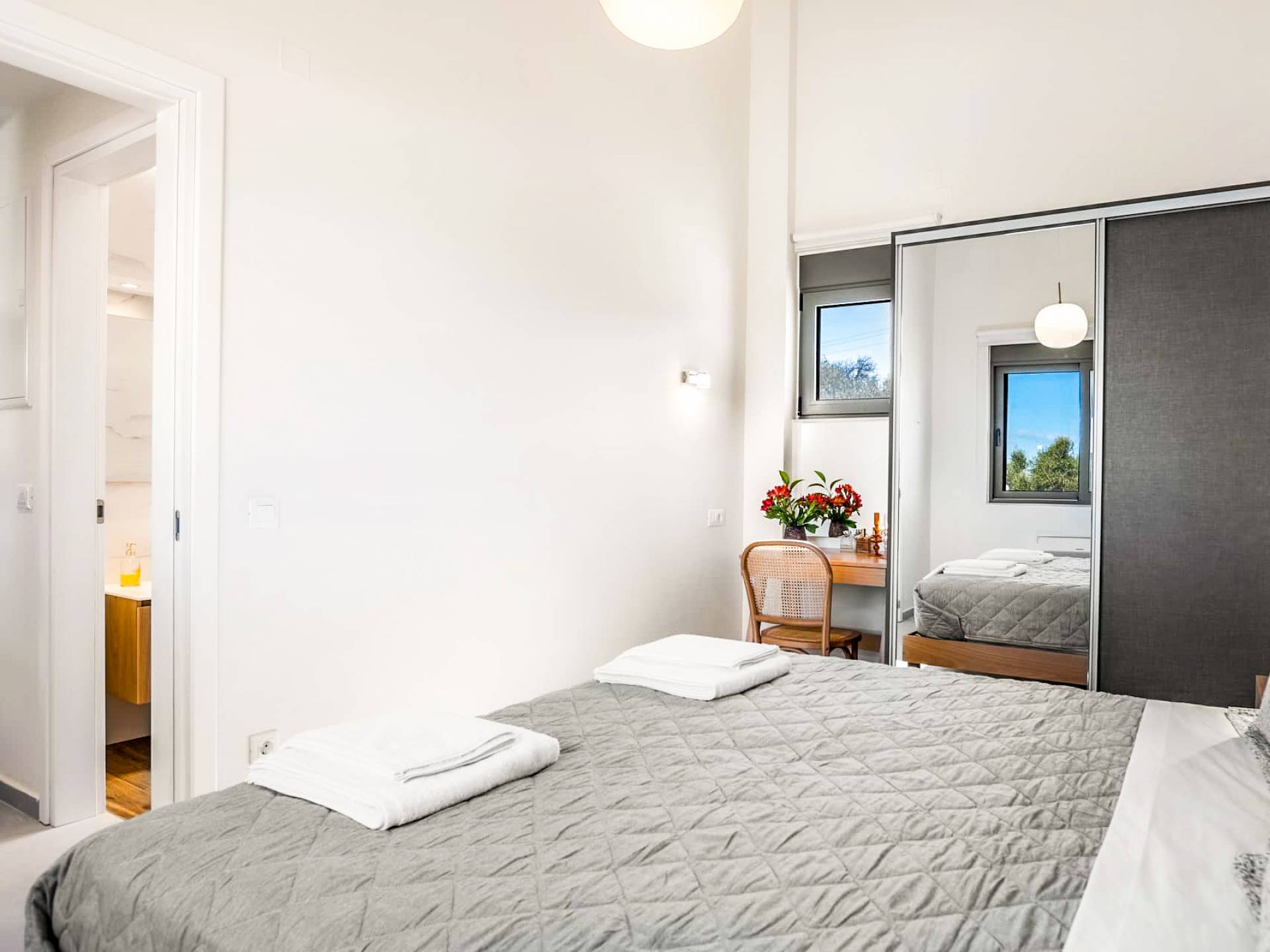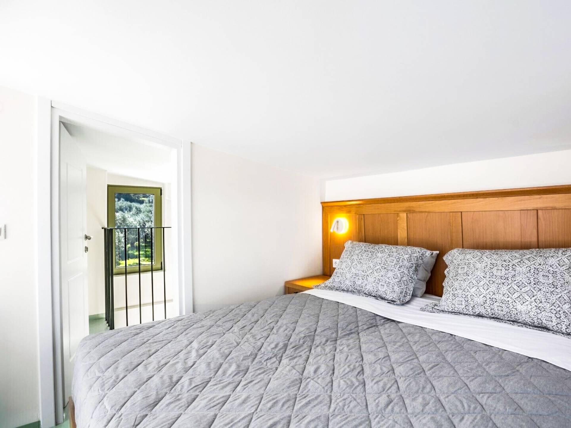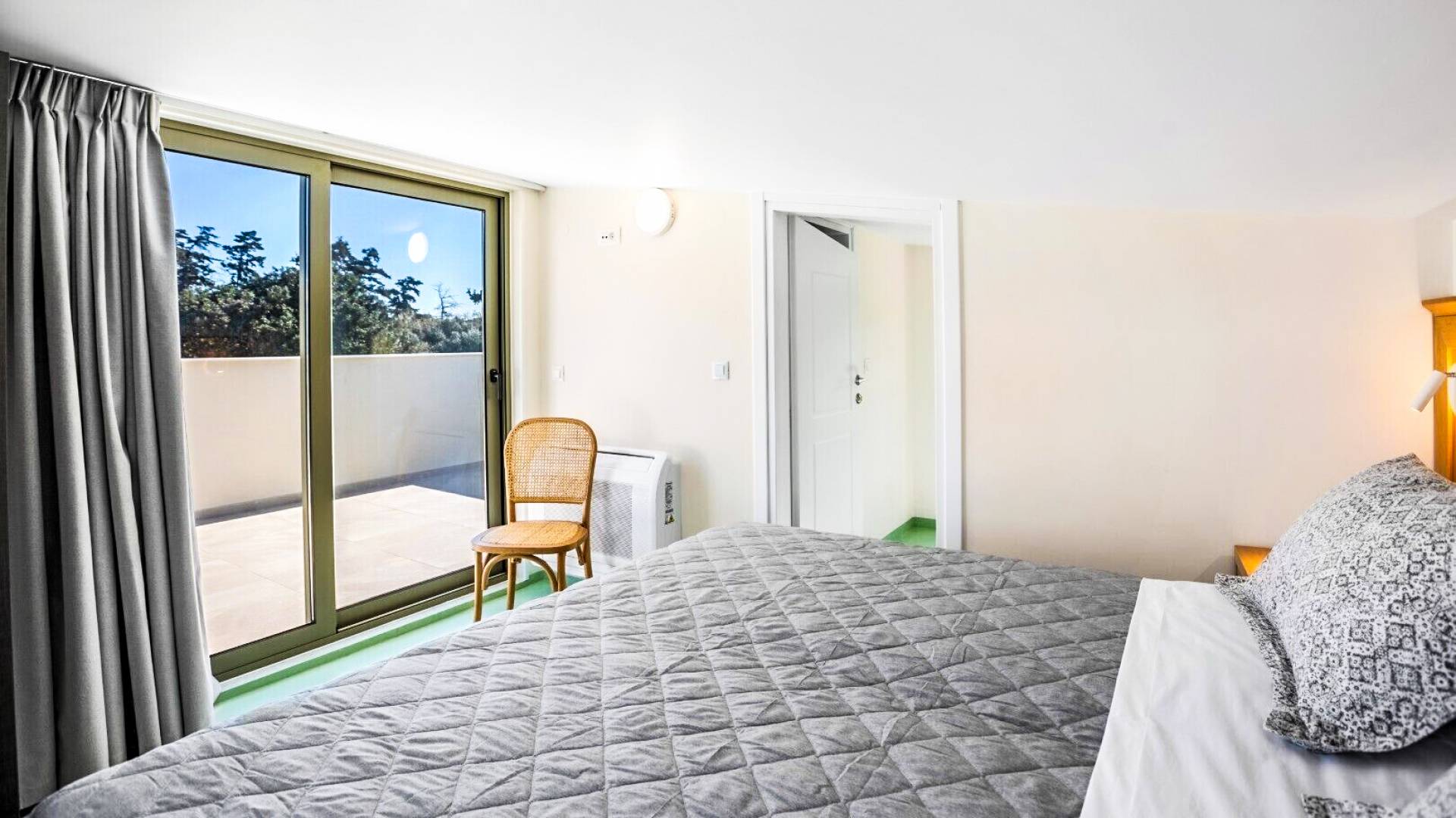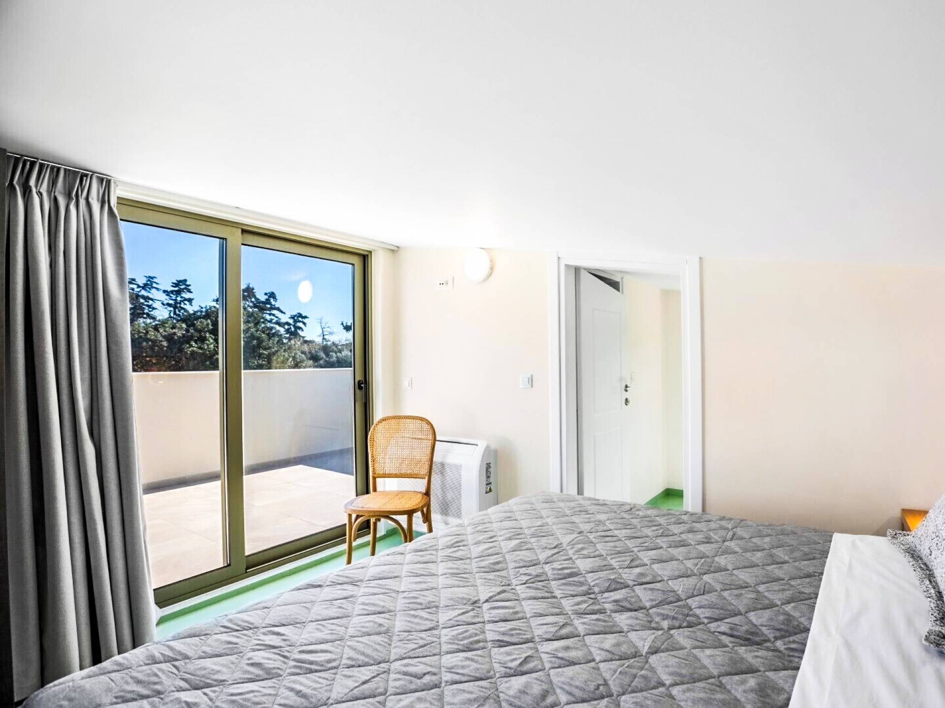 Going up the stairs, there is the attic with the second bedroom and its bathroom. This bedroom overlooks the surrounding olive grove and the swimming pools up to the sea. Its balcony provides a table with chairs and an umbrella under which you can relax and enjoy the beautiful view towards the sea or the mountains to the south.