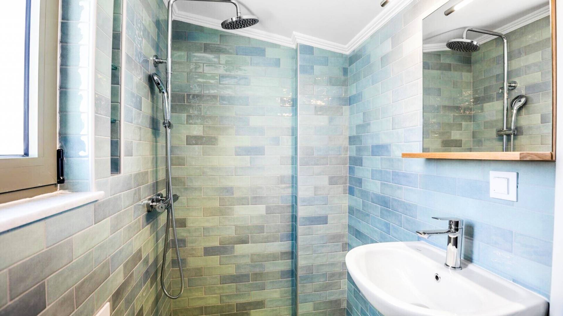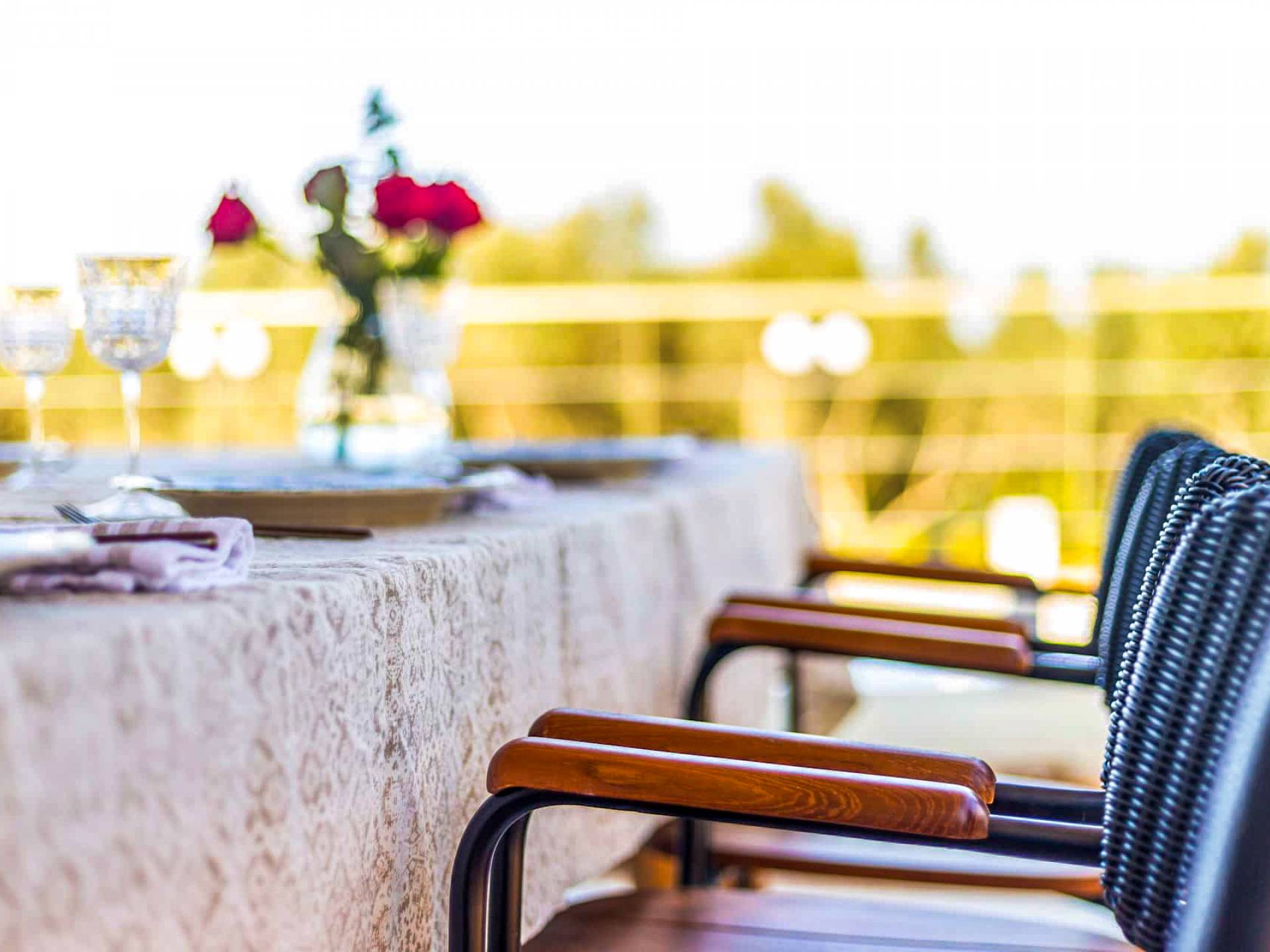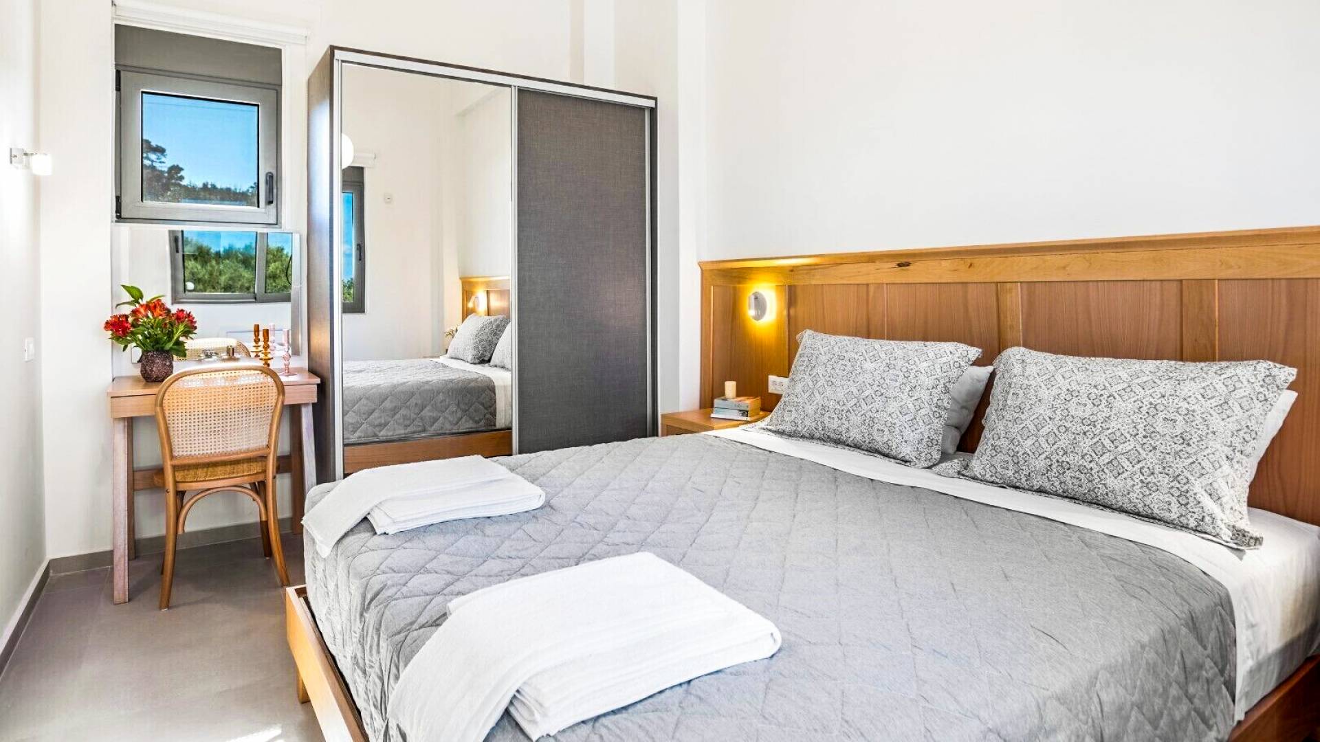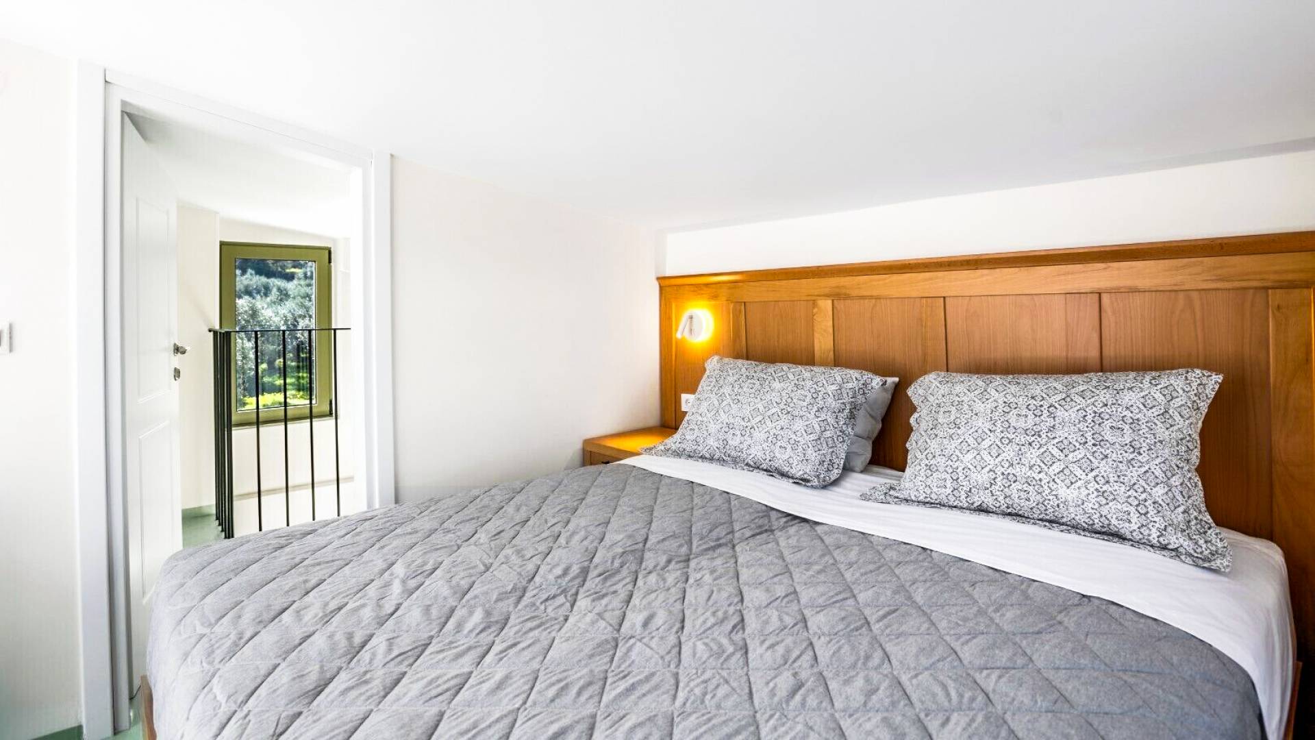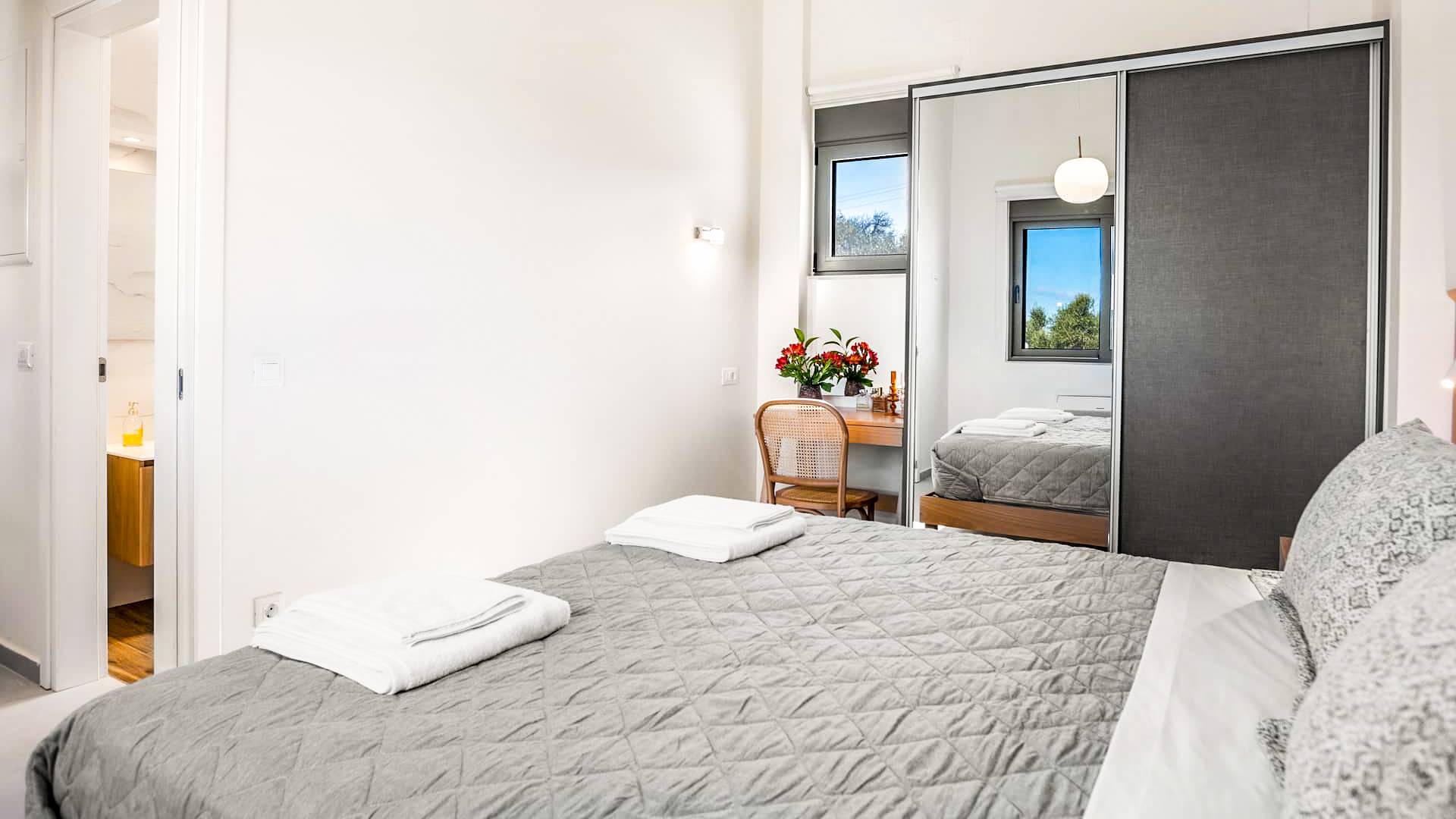 Going up the stairs, there is the attic with the second bedroom and its bathroom. This bedroom overlooks the surrounding olive grove and the swimming pools up to the sea. Its balcony provides a table with chairs and an umbrella under which you can relax and enjoy the beautiful view towards the sea or the mountains to the south.