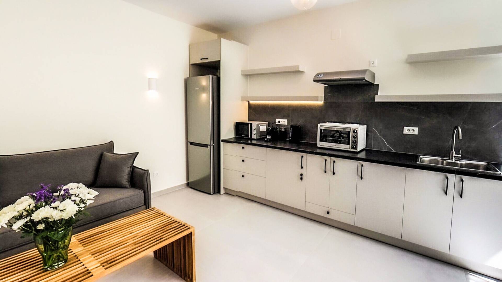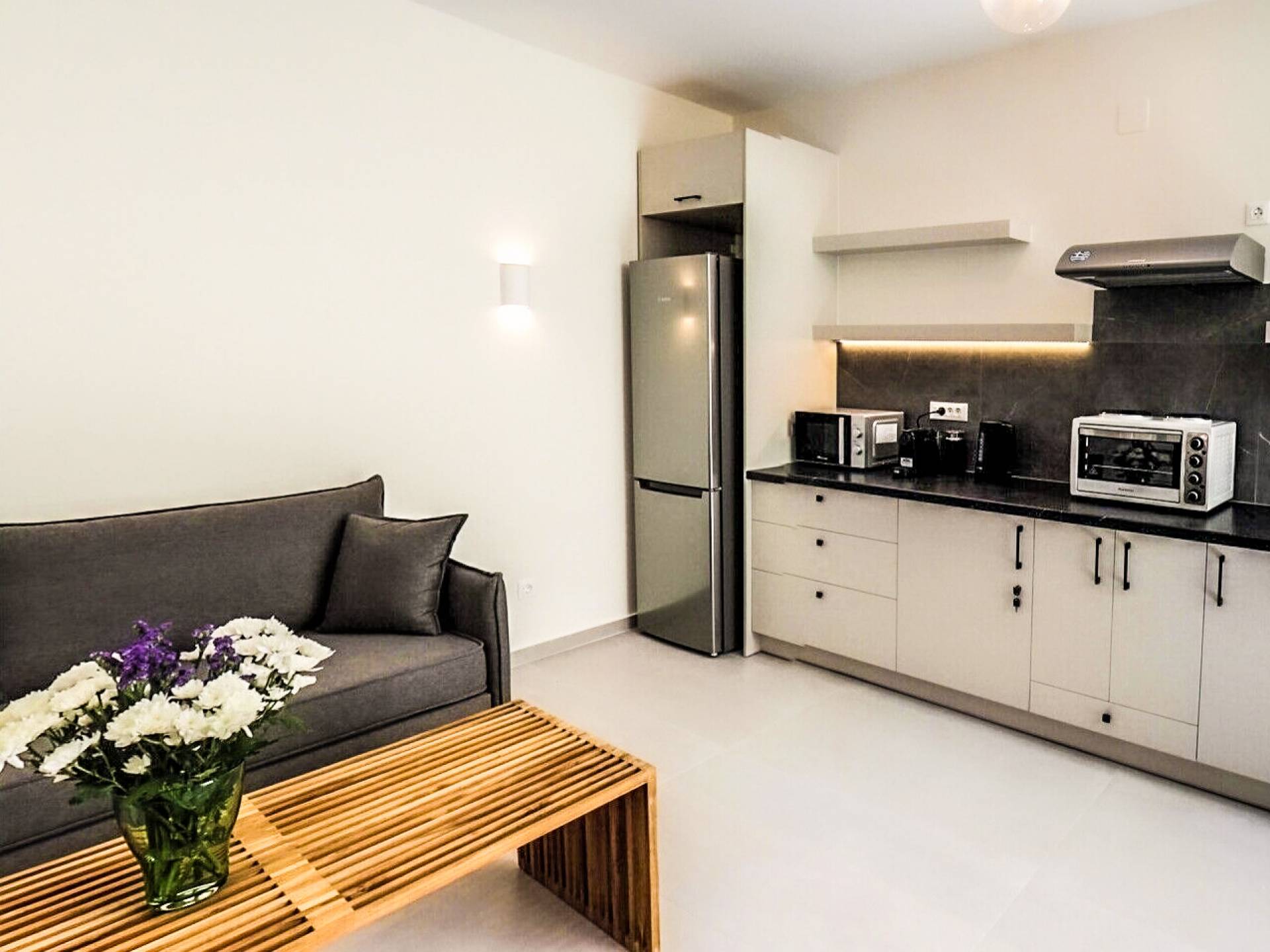 The second apartment is 65 square meters and is located in the basement and has two bedrooms, a bathroom with shower and a living room with a l kitchen where you can cook, enjoy your meal and relax. It is built in a way which allows a lot of natural light to flood in while it is also cooler on warmer days.