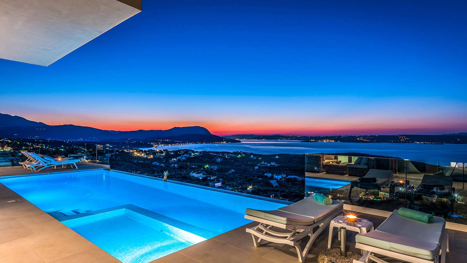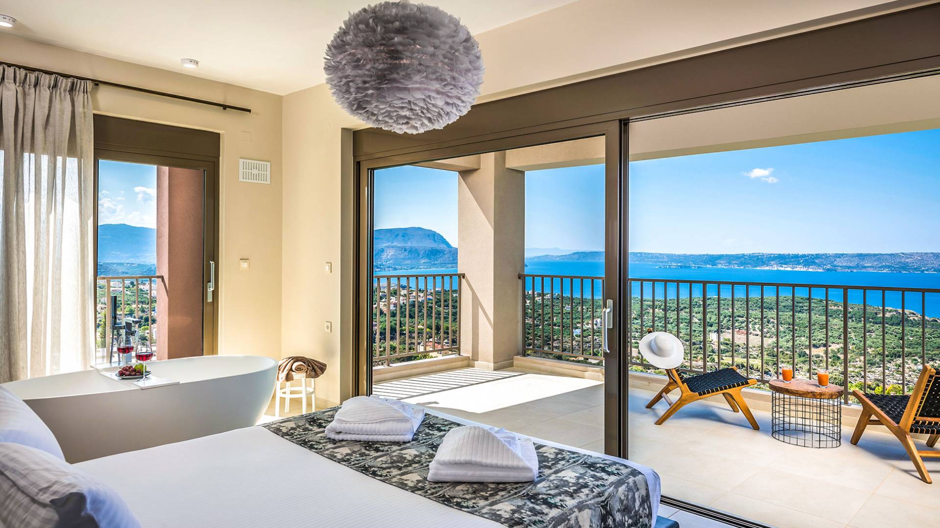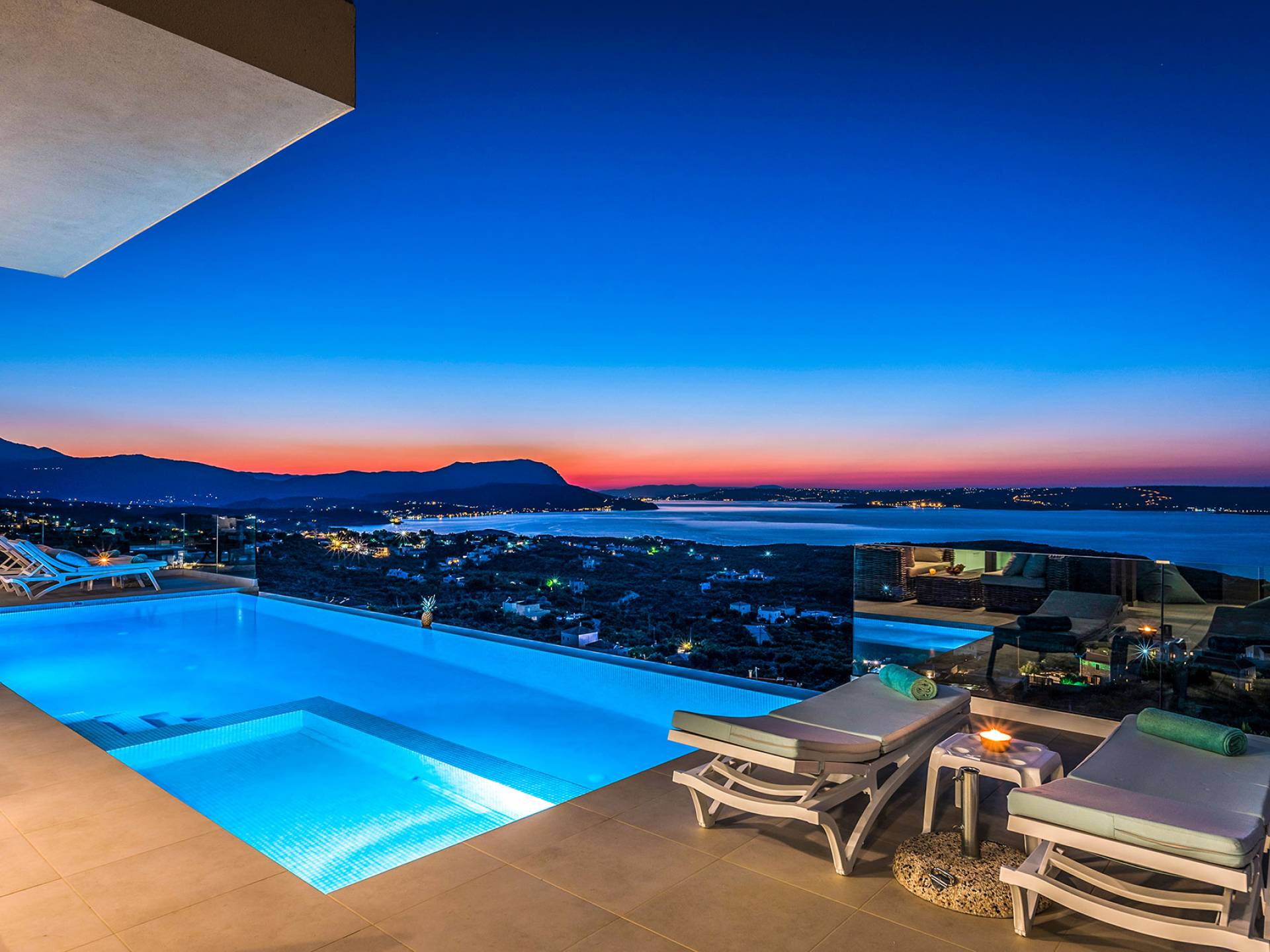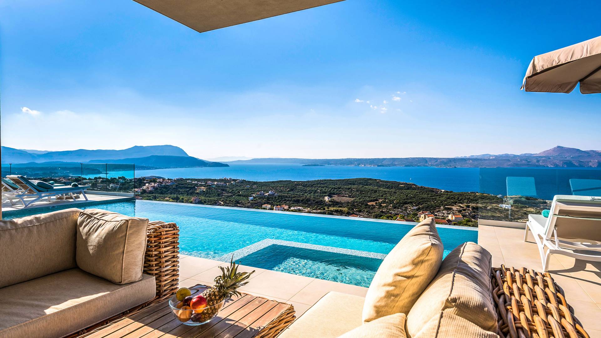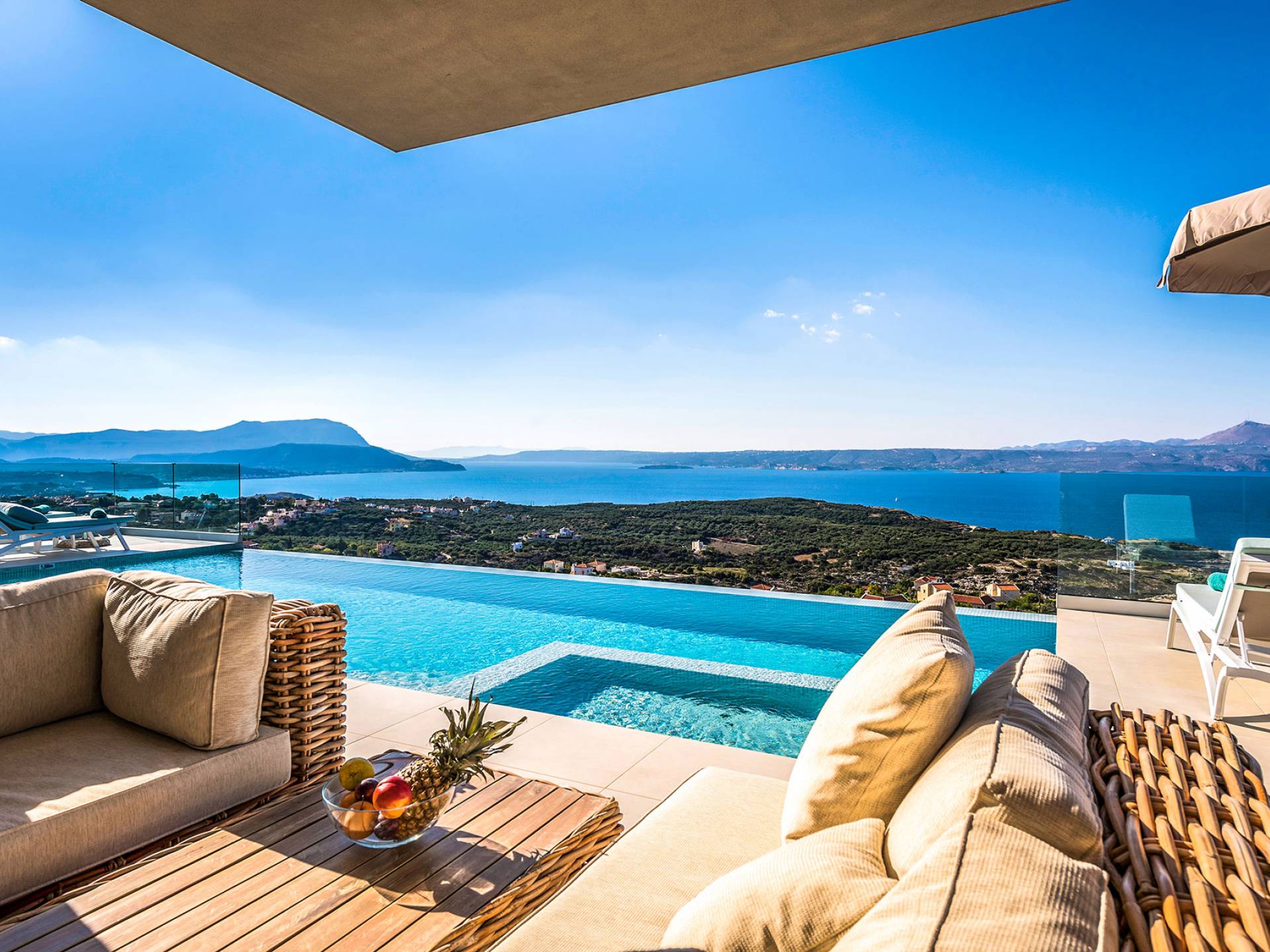 - Heated infinity pool (40 m²) with integrated children’s wading pool and panoramic views of Souda Bay & White Mountains