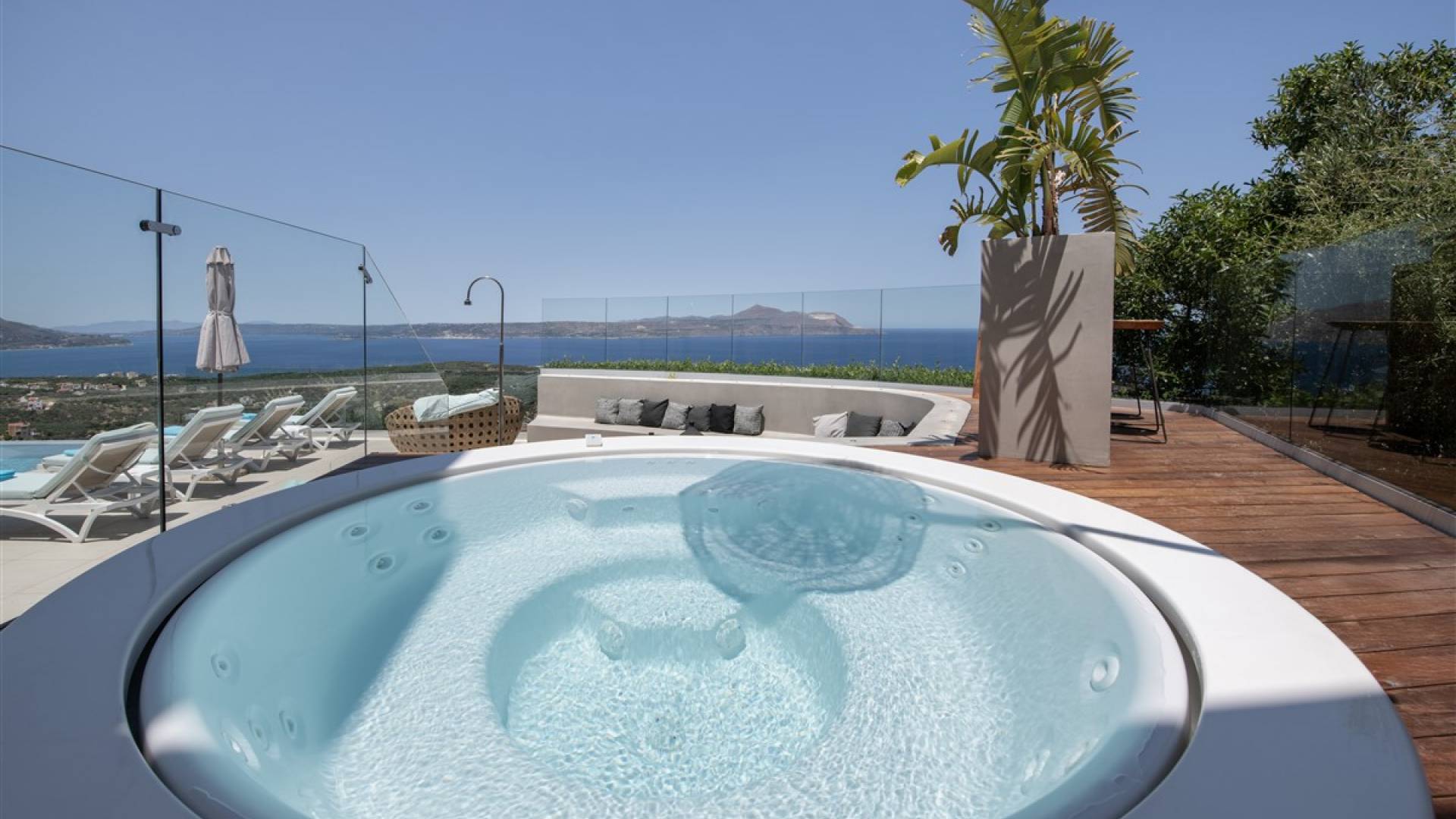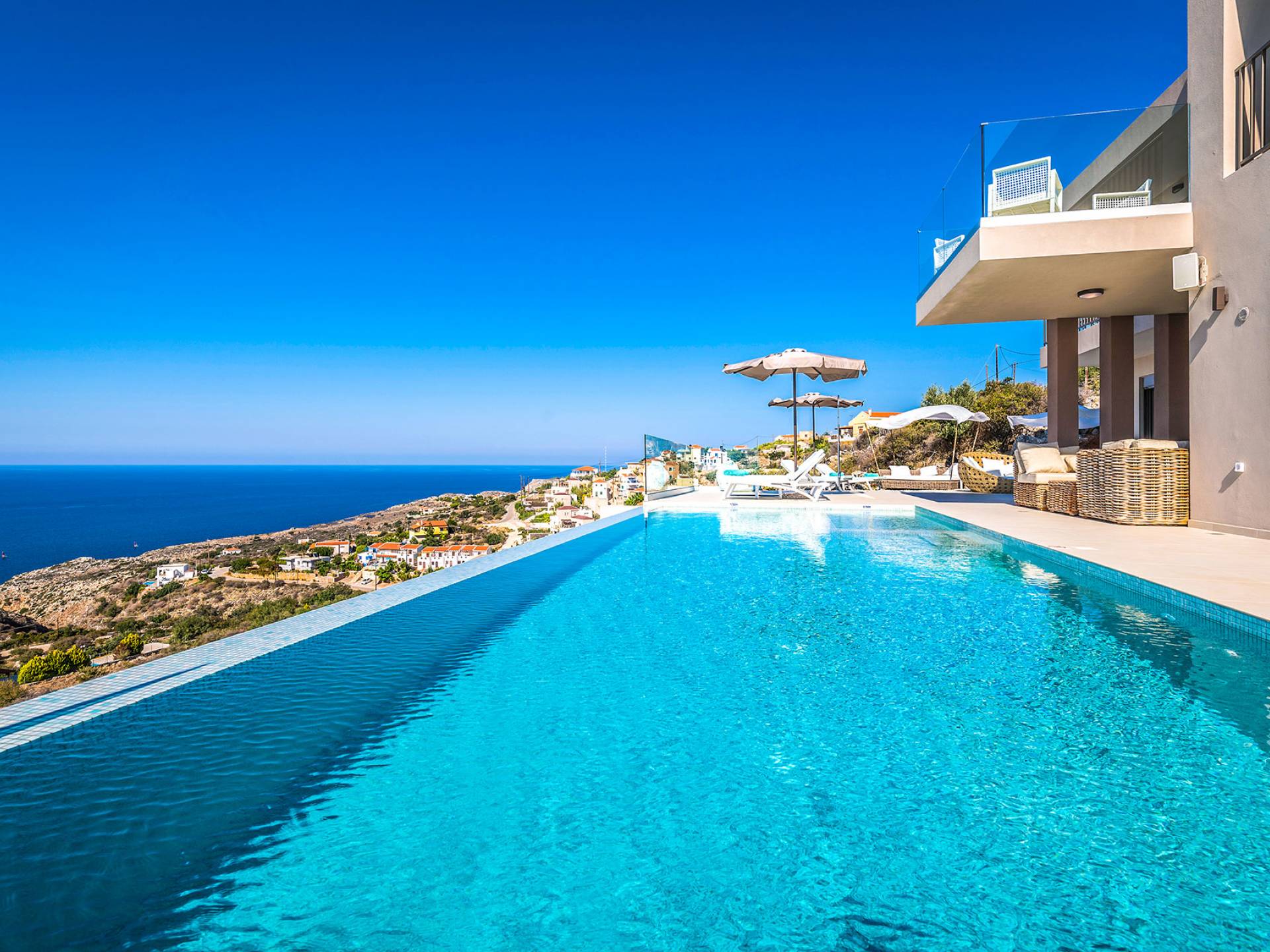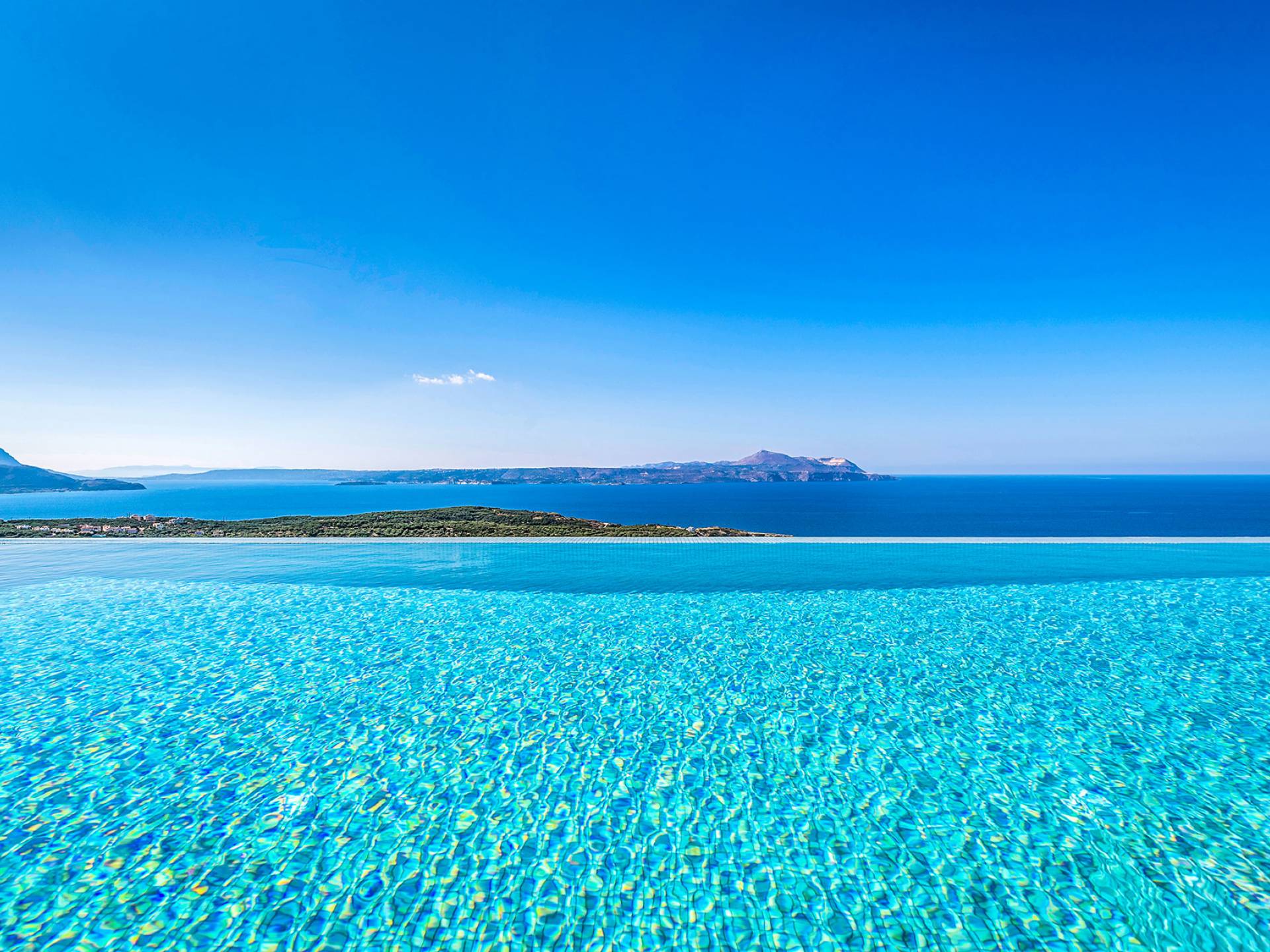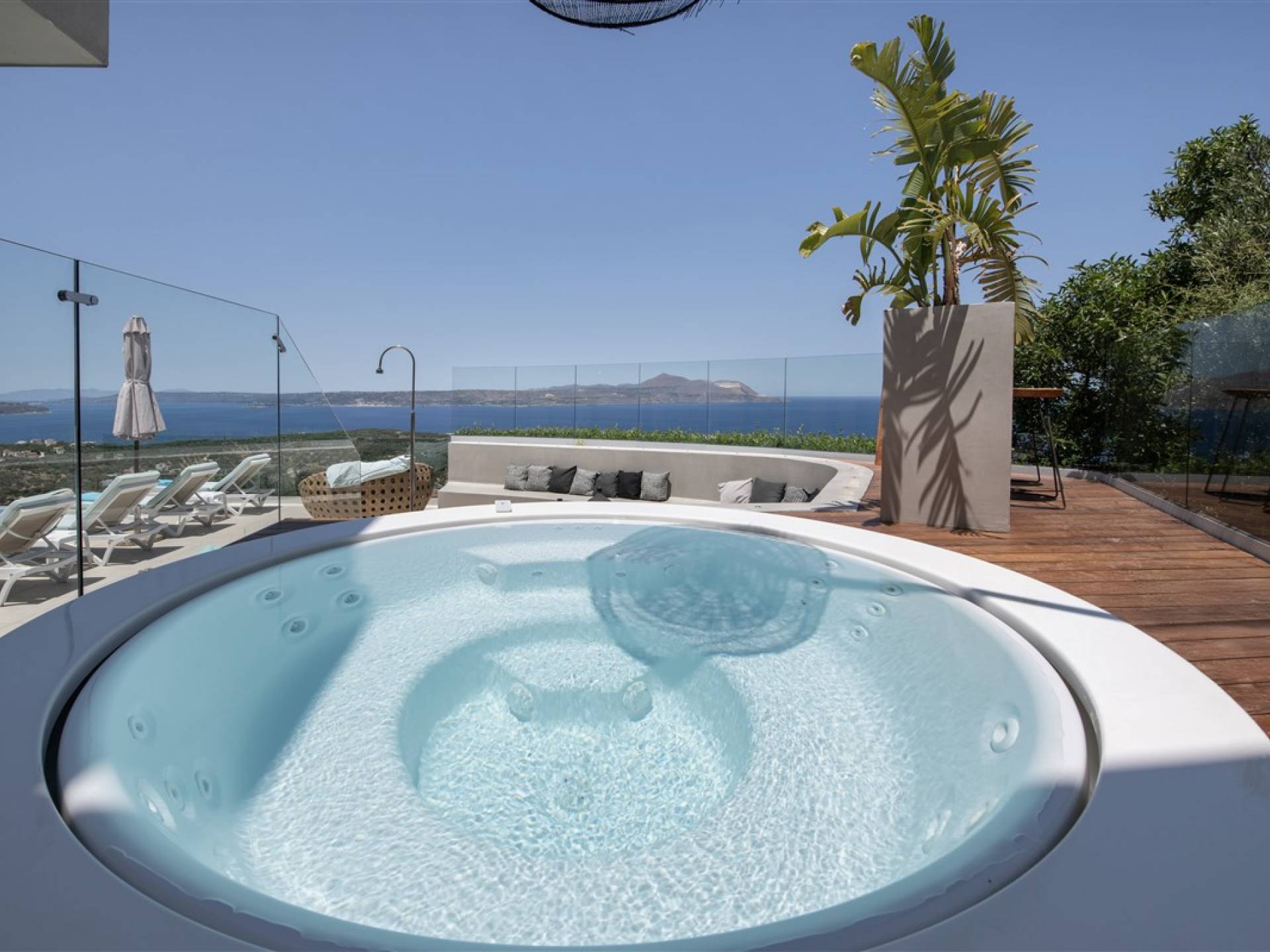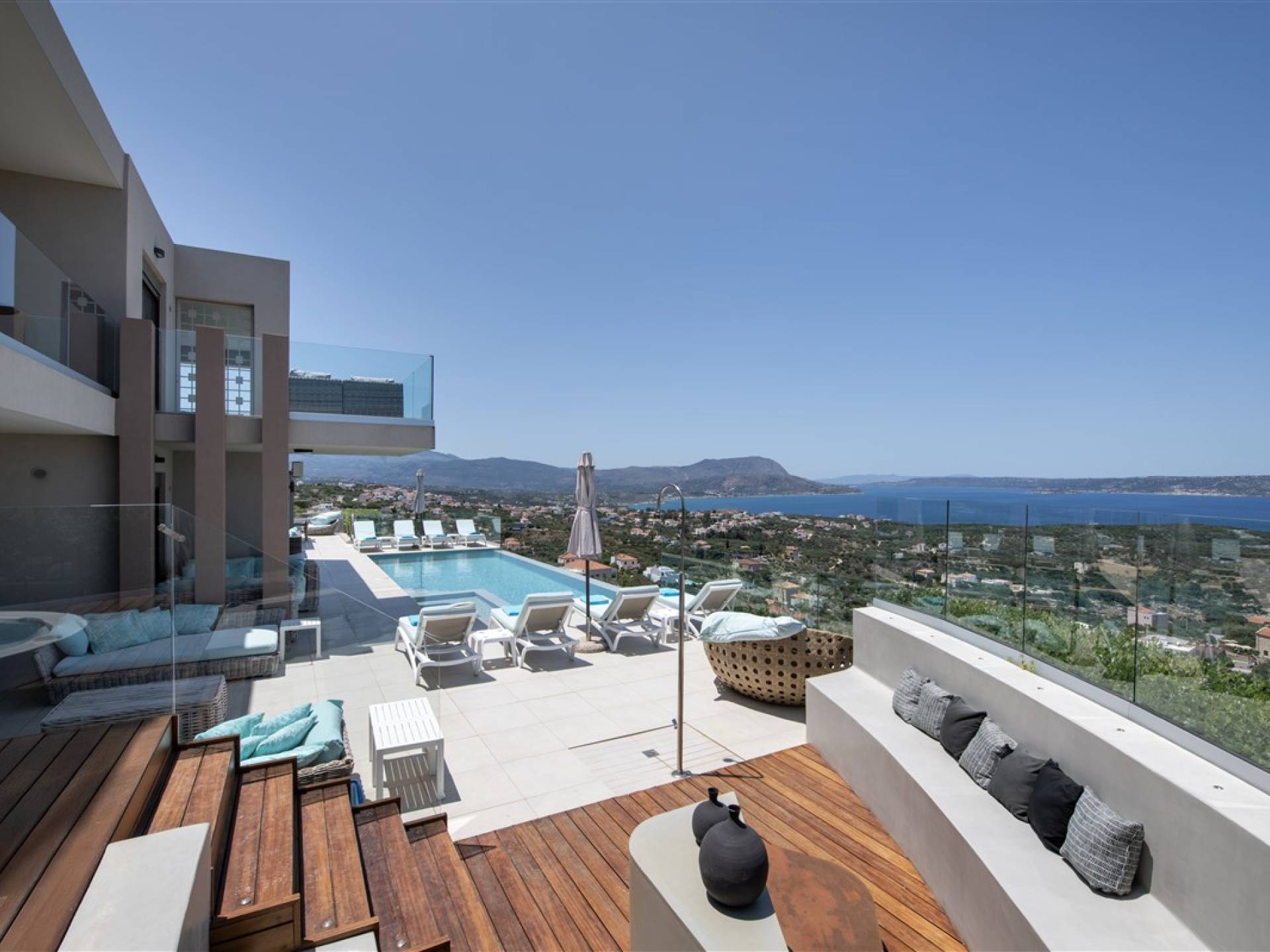 - Heated infinity pool (40 m²) with integrated children’s wading pool and panoramic views of Souda Bay & White Mountains