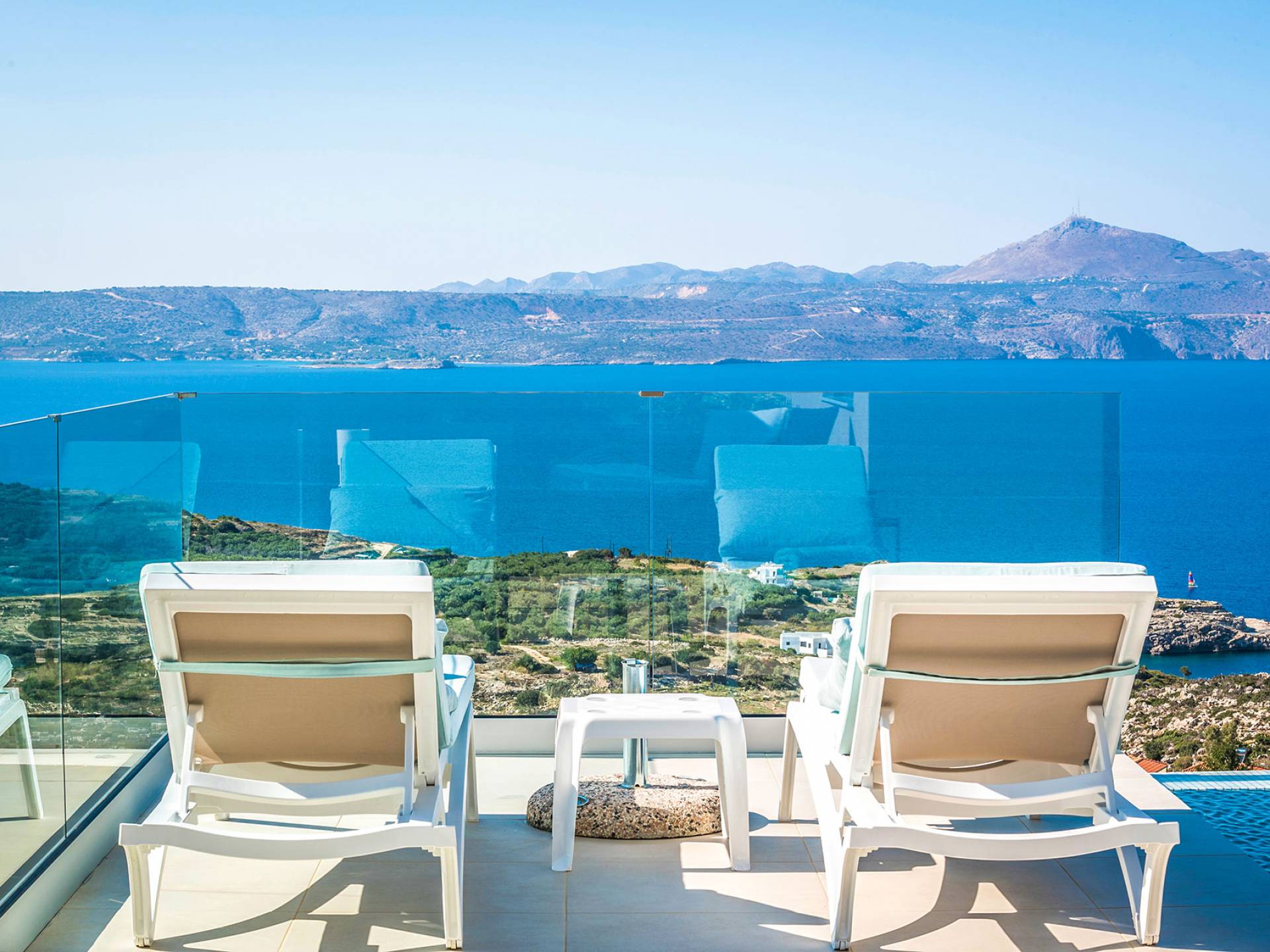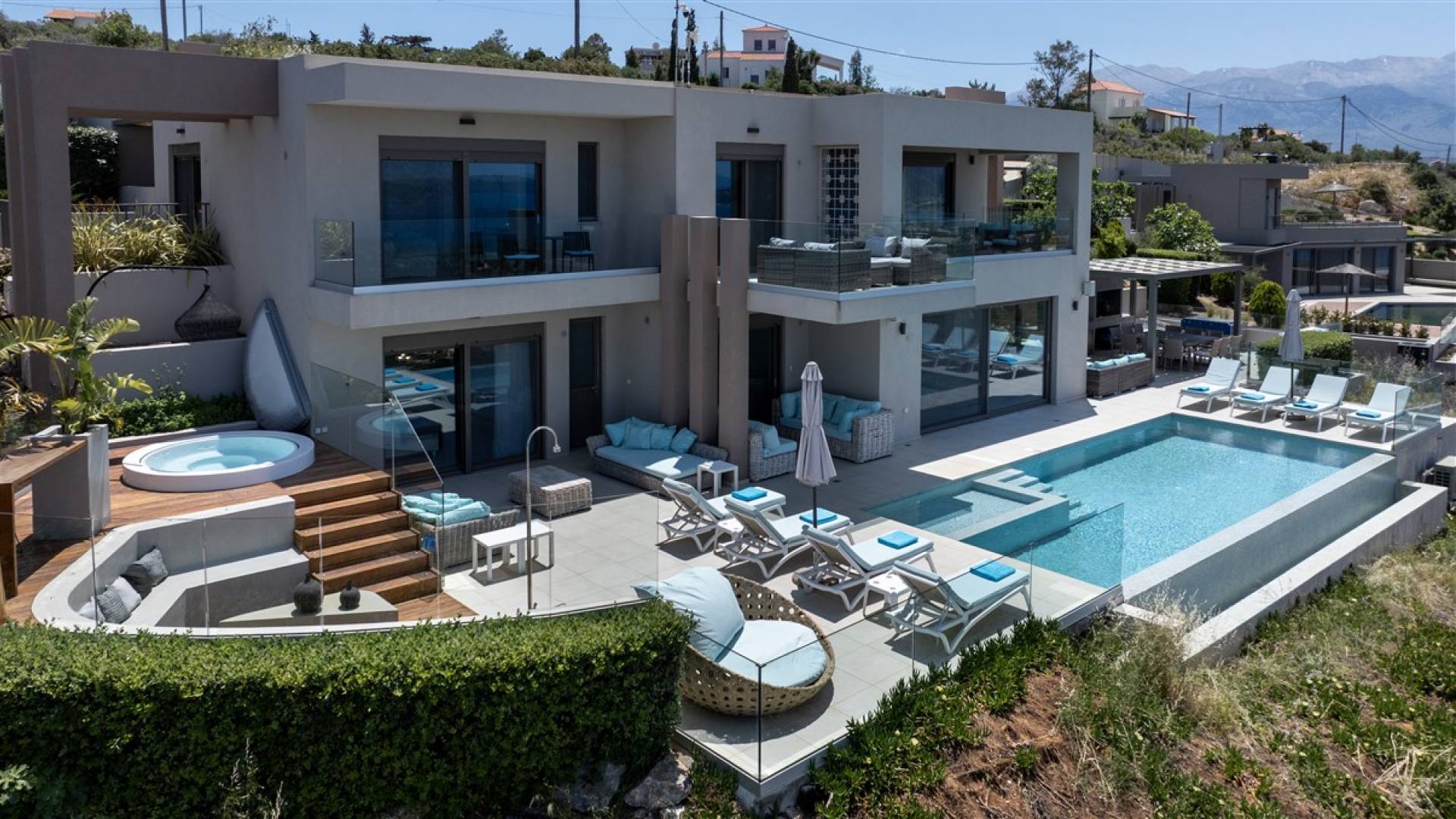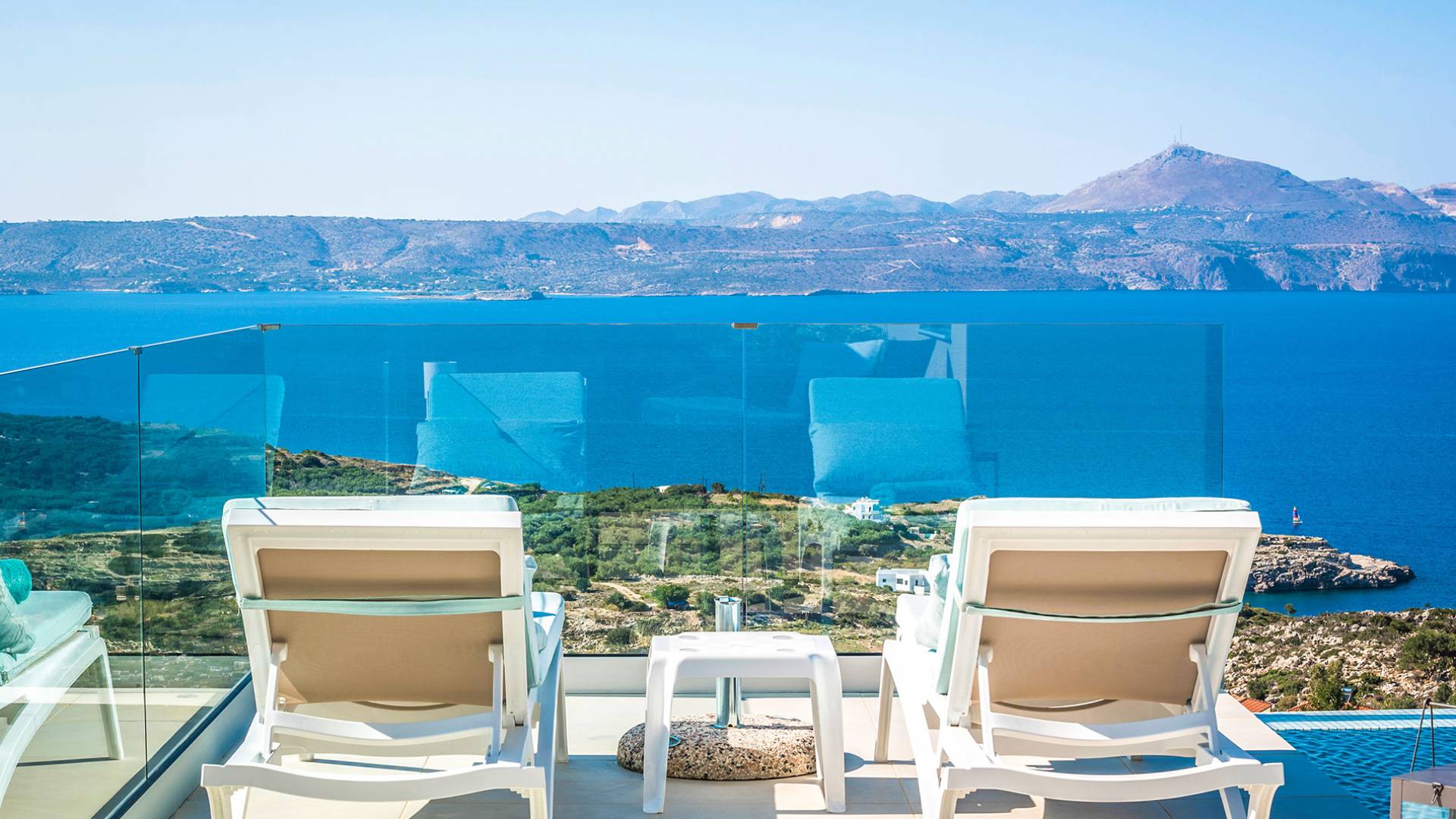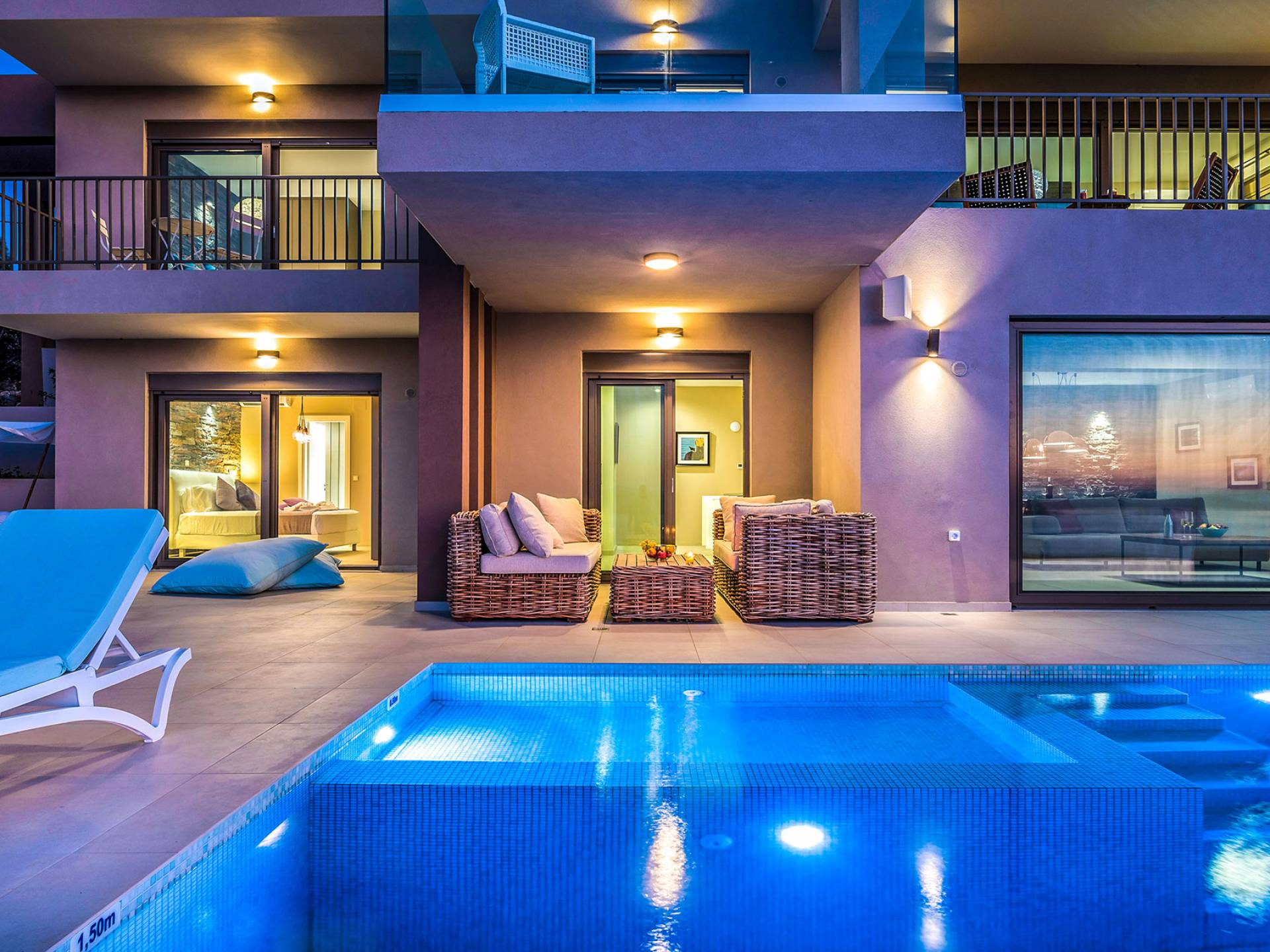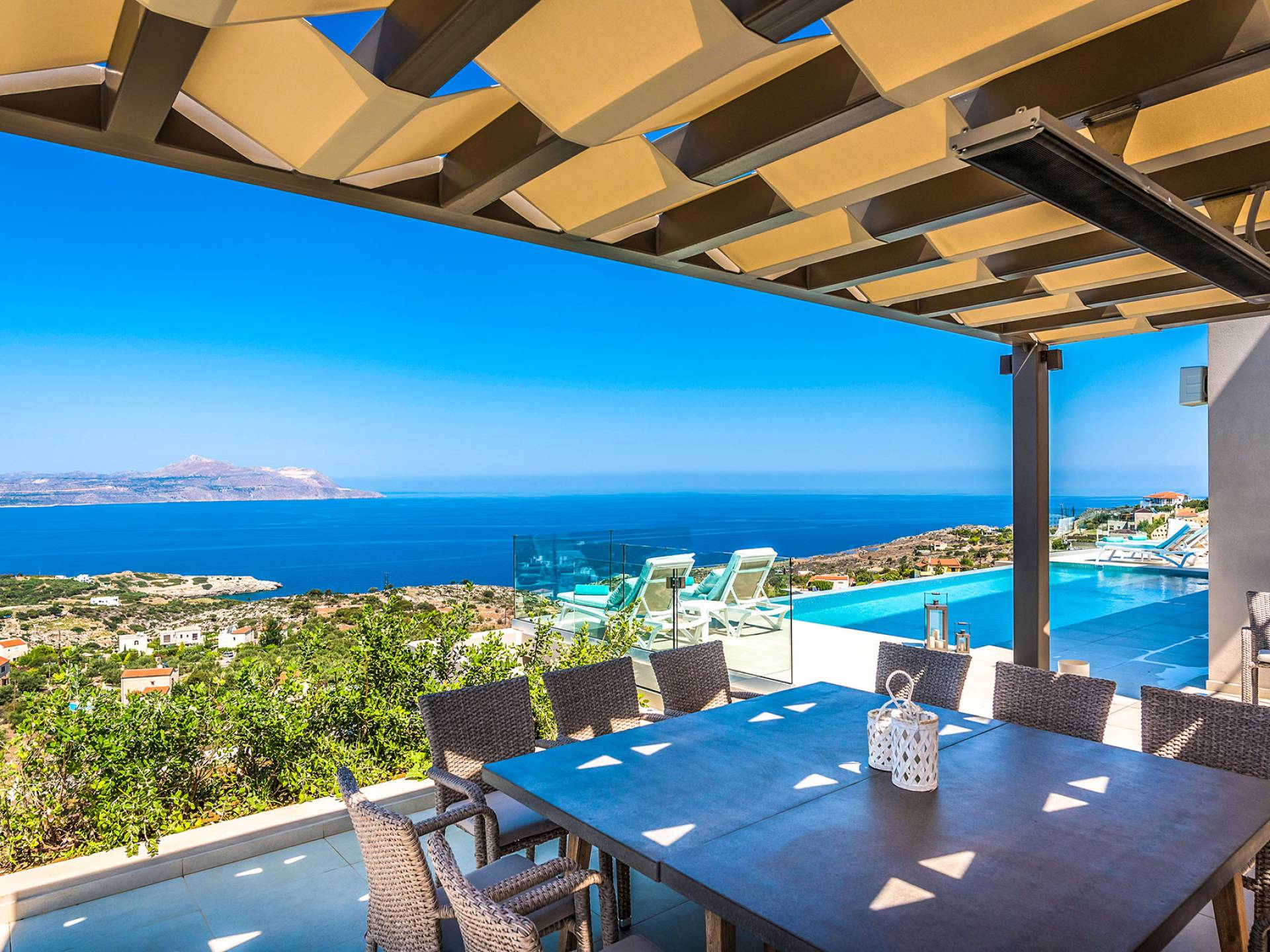 - Heated infinity pool (40 m²) with integrated children’s wading pool and panoramic views of Souda Bay & White Mountains