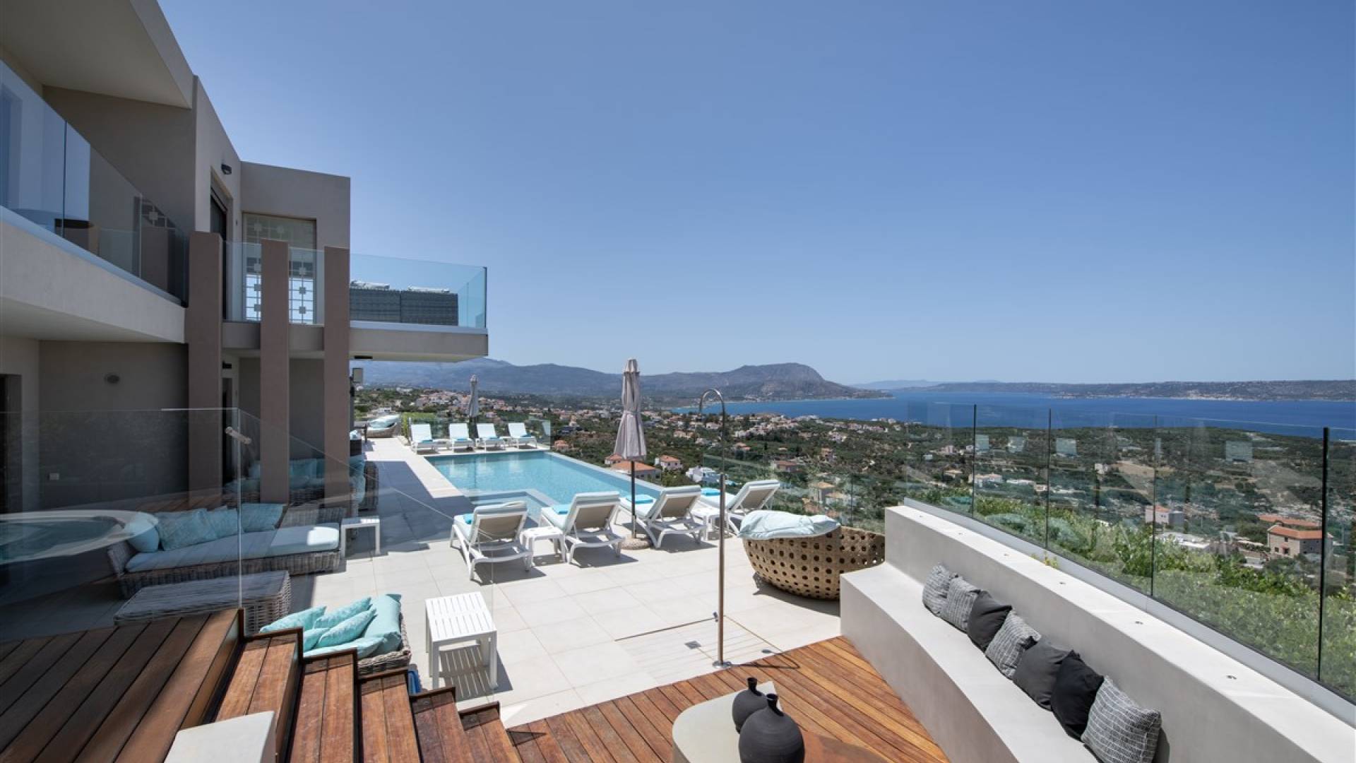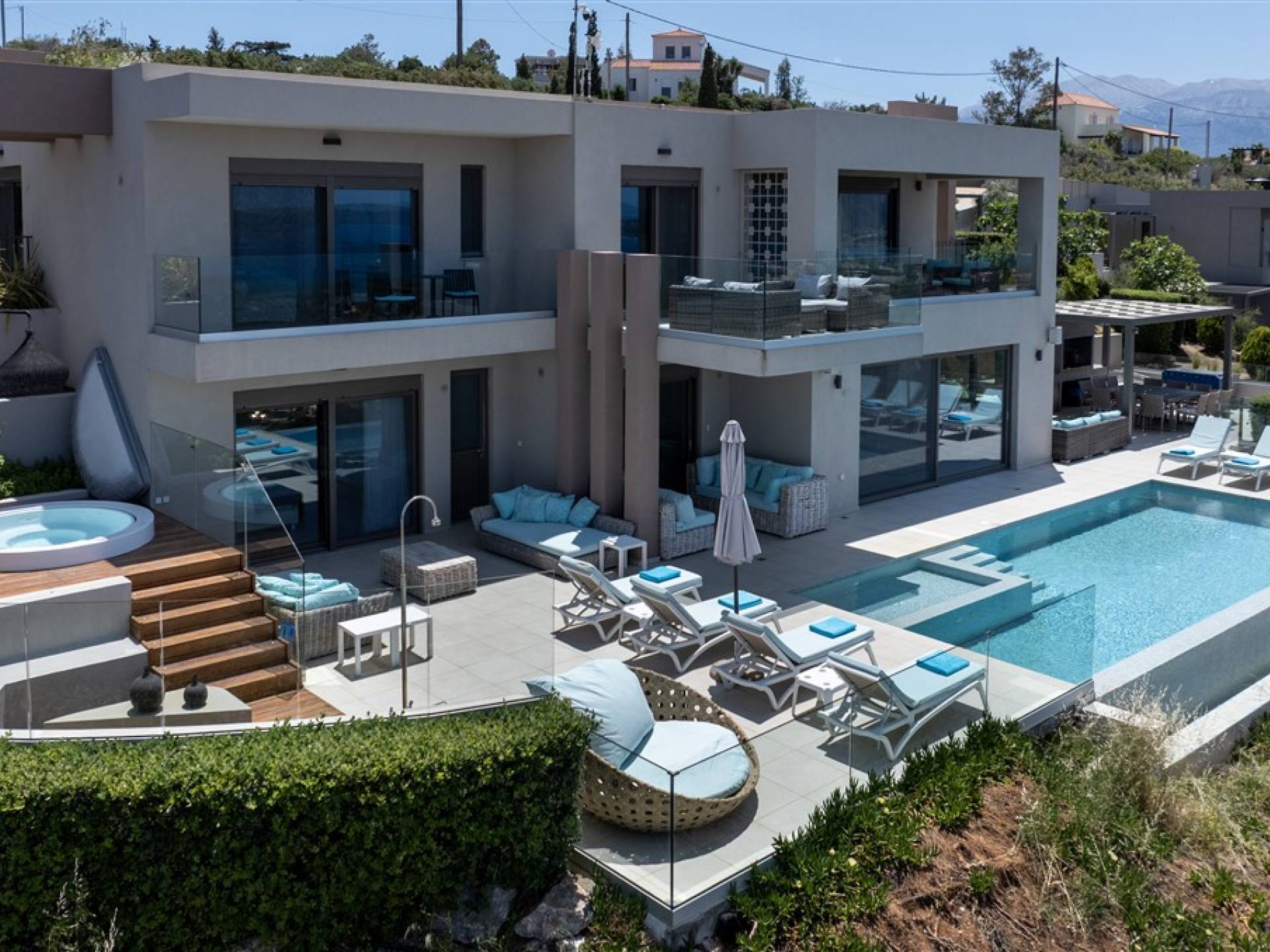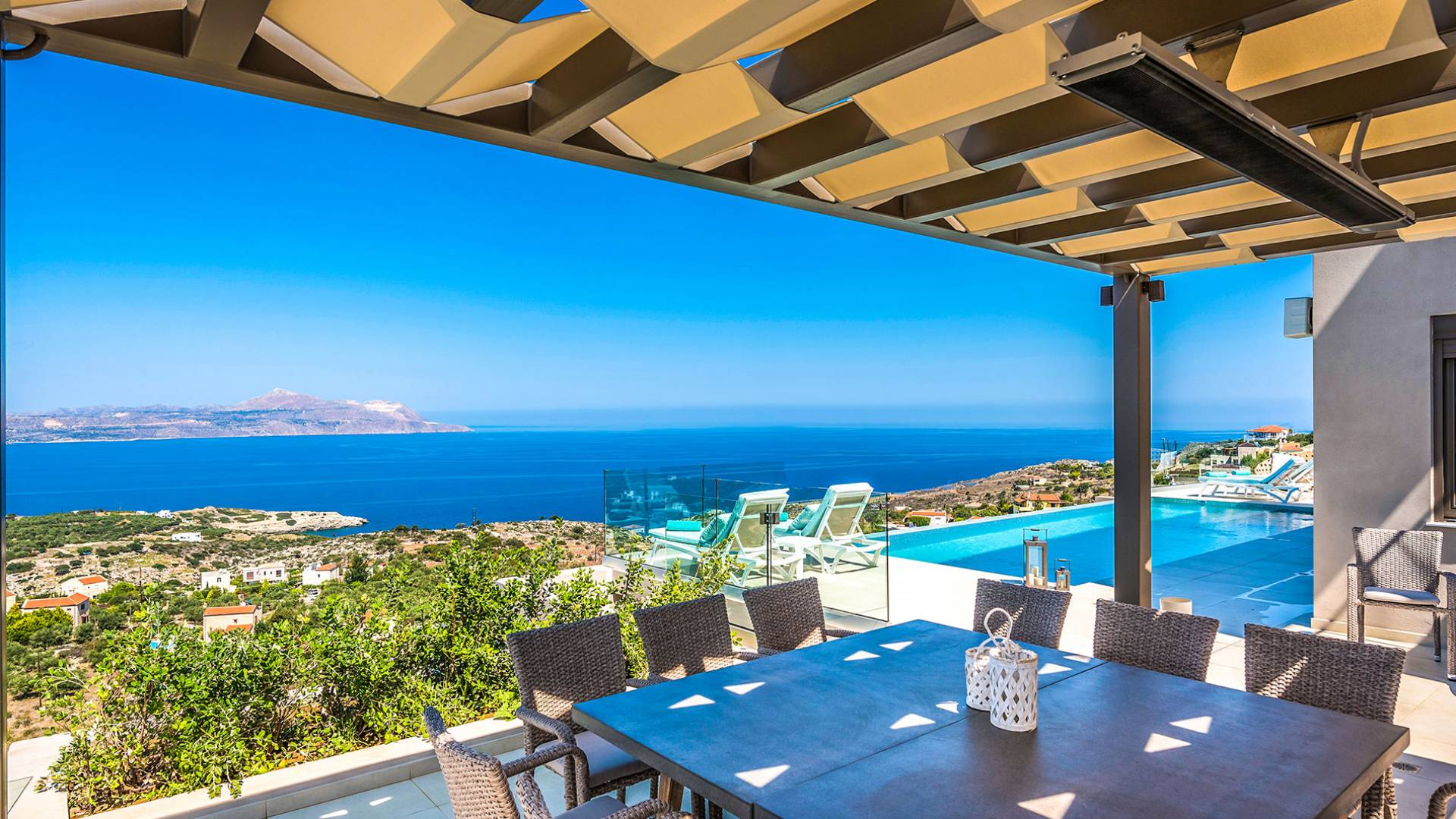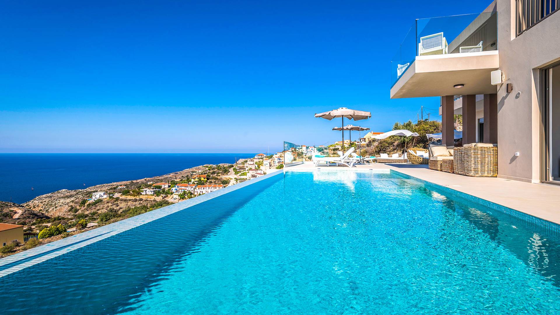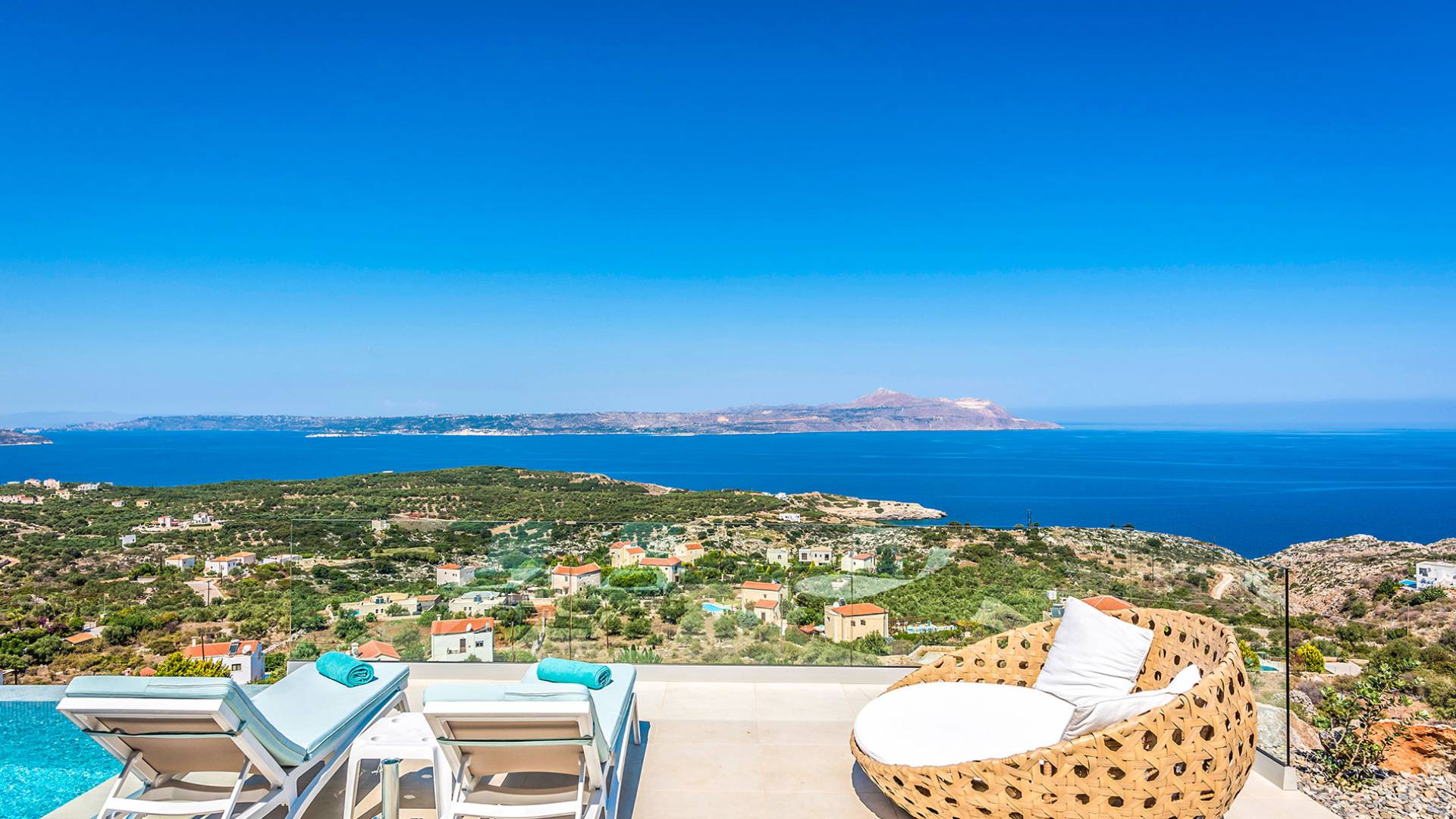 - Heated infinity pool (40 m²) with integrated children’s wading pool and panoramic views of Souda Bay & White Mountains