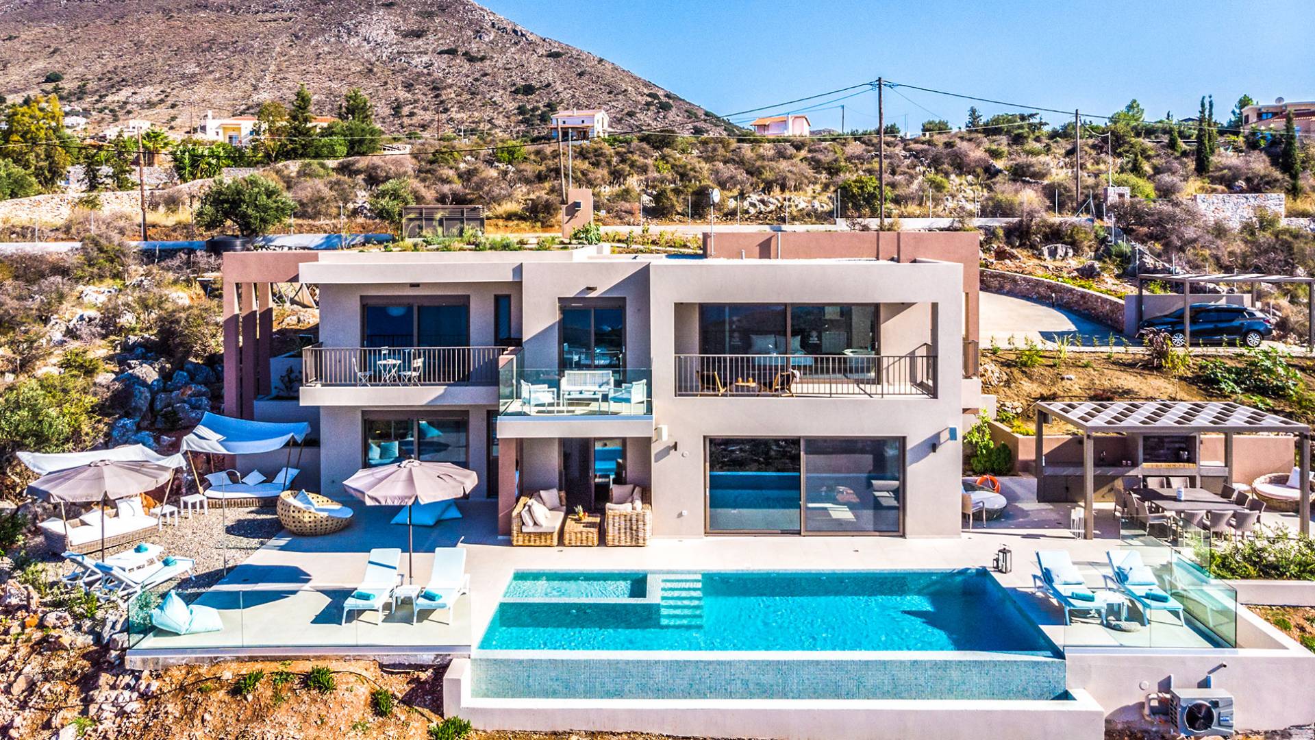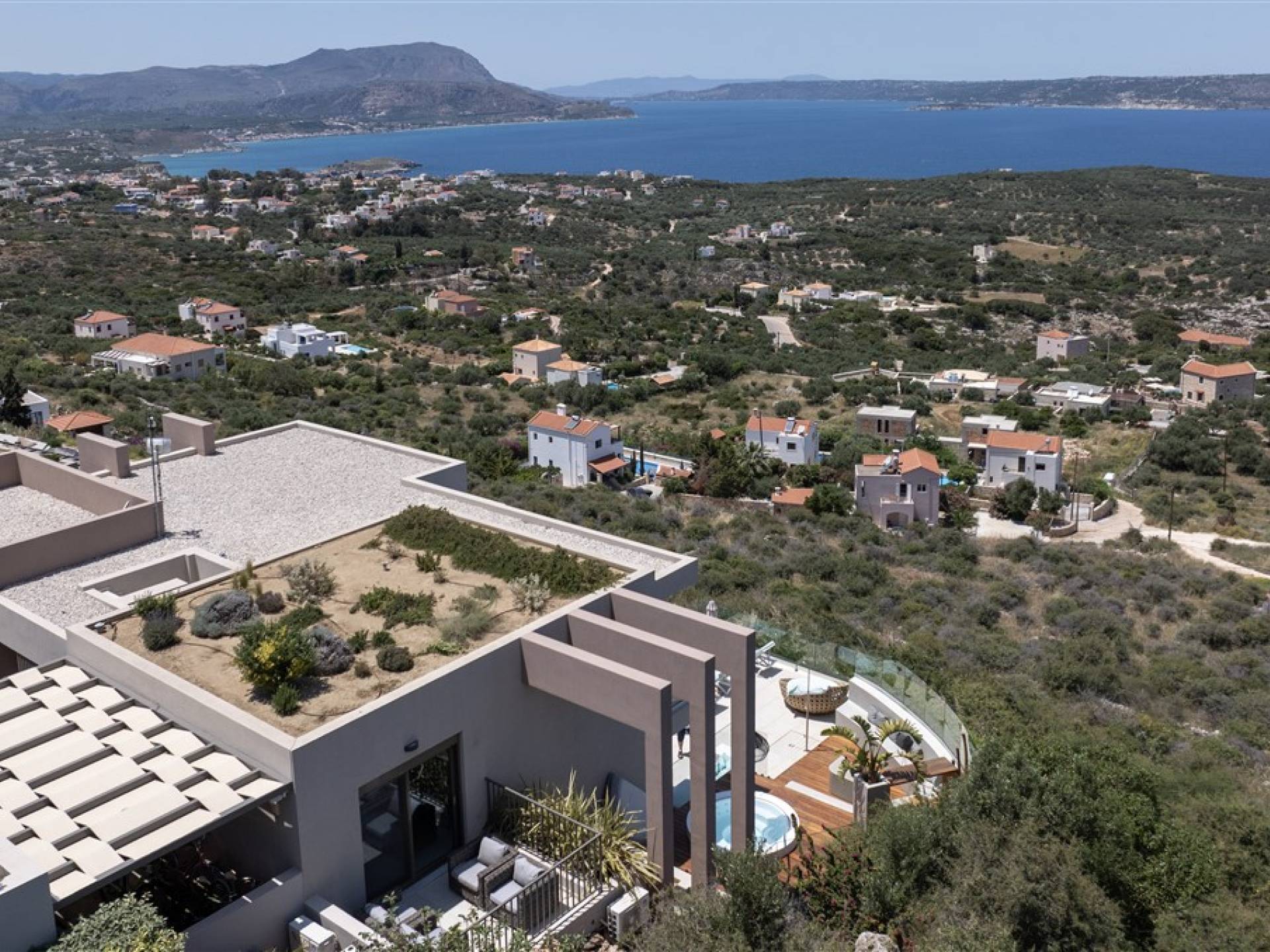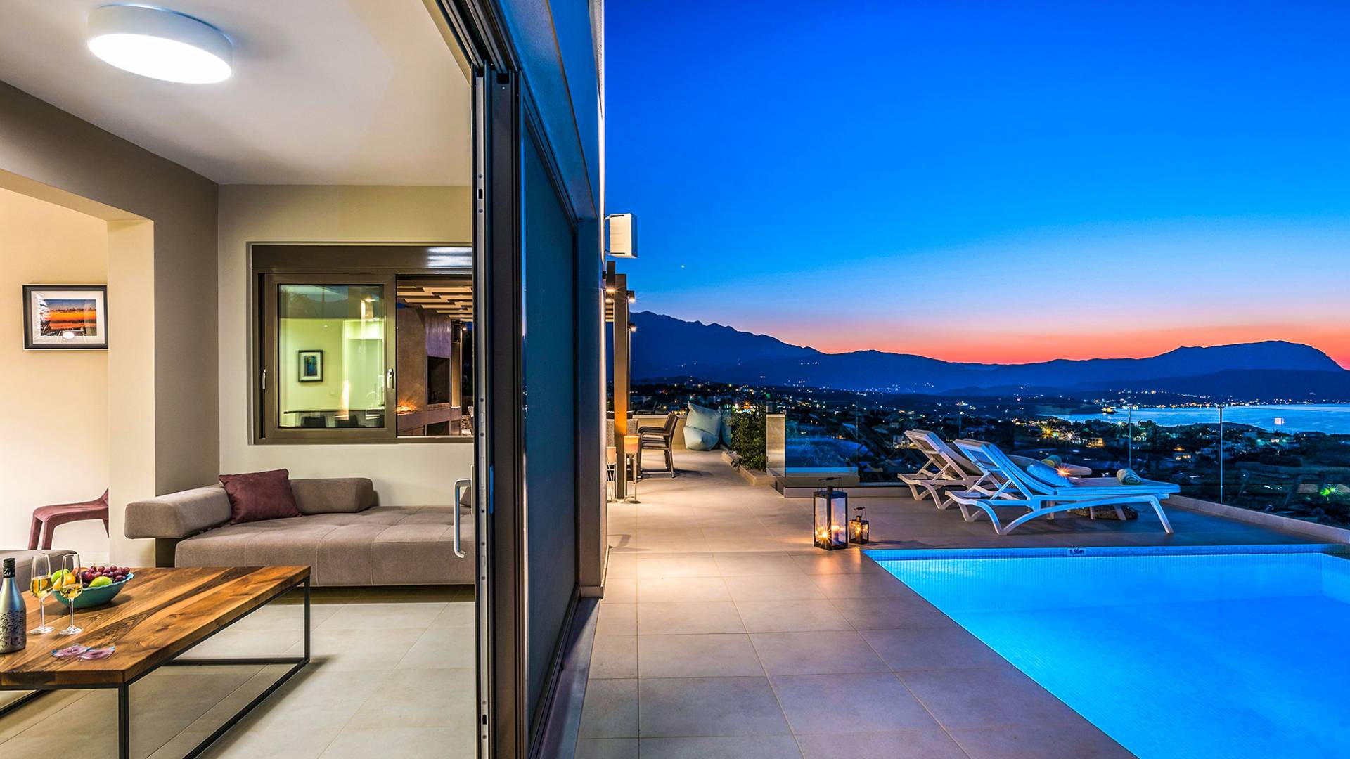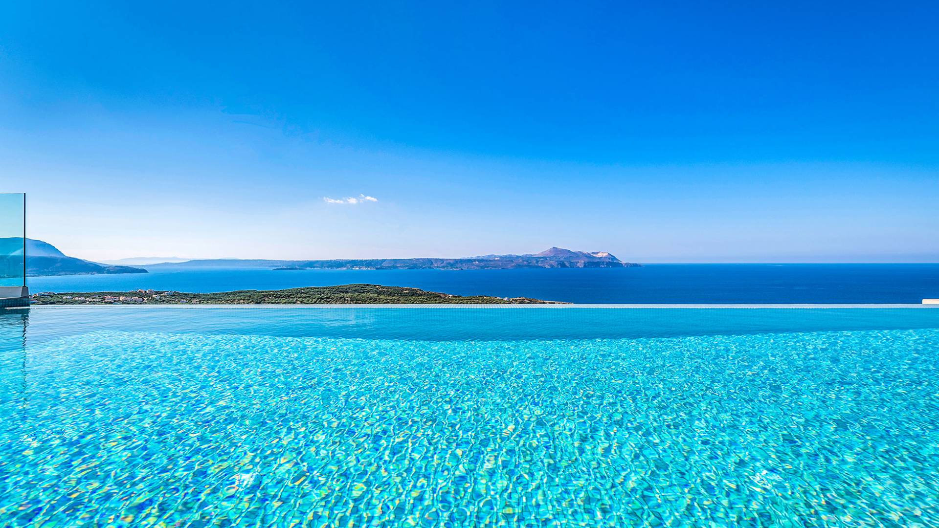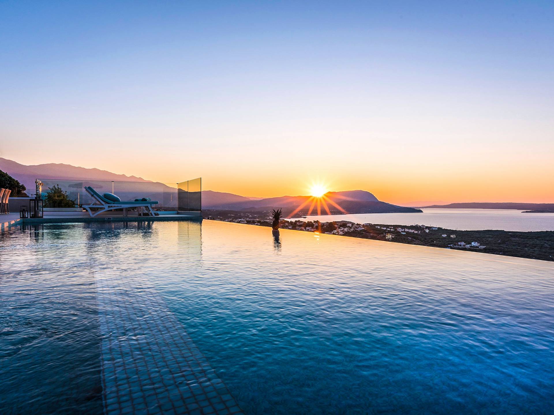 - Heated infinity pool (40 m²) with integrated children’s wading pool and panoramic views of Souda Bay & White Mountains