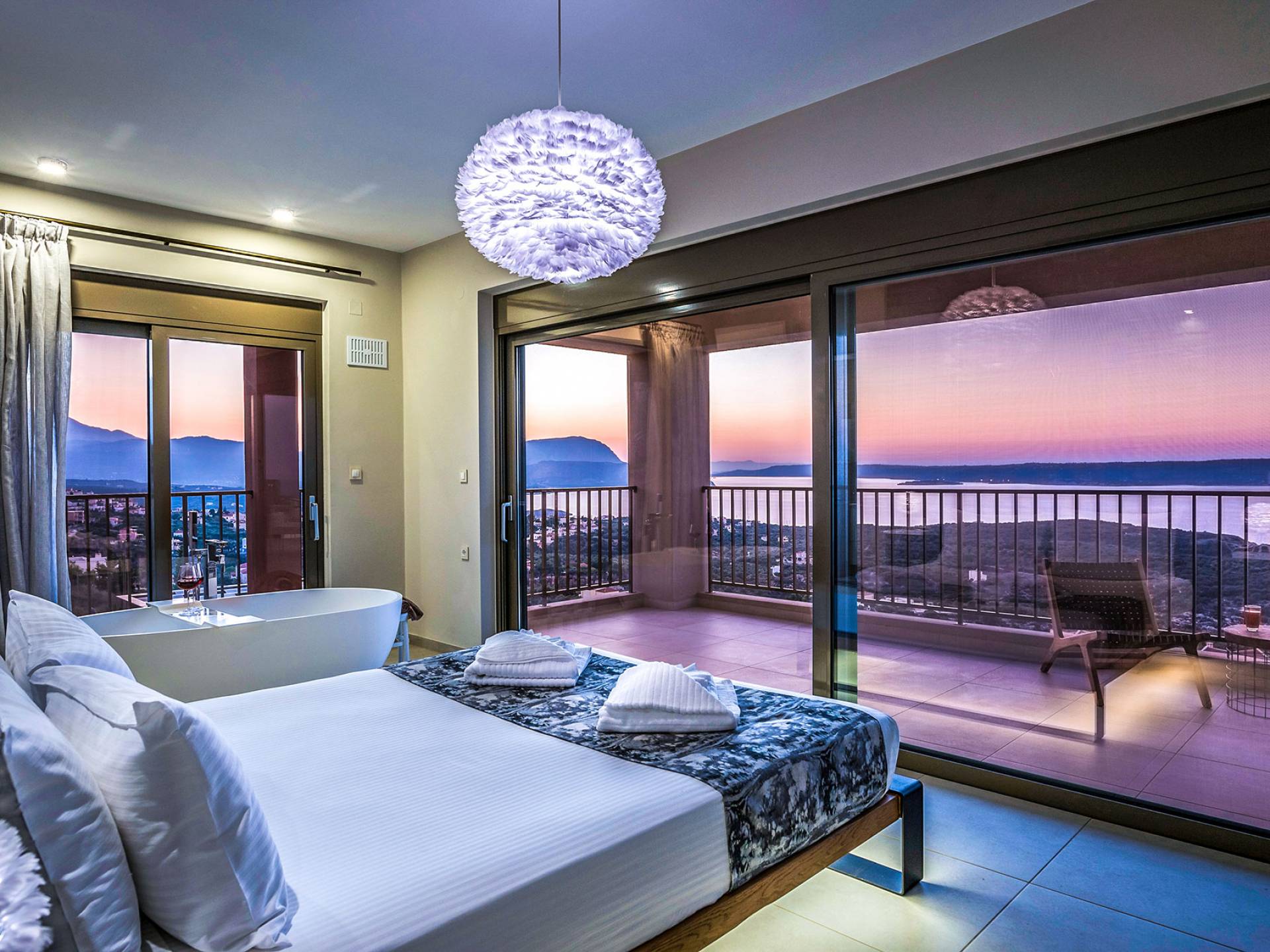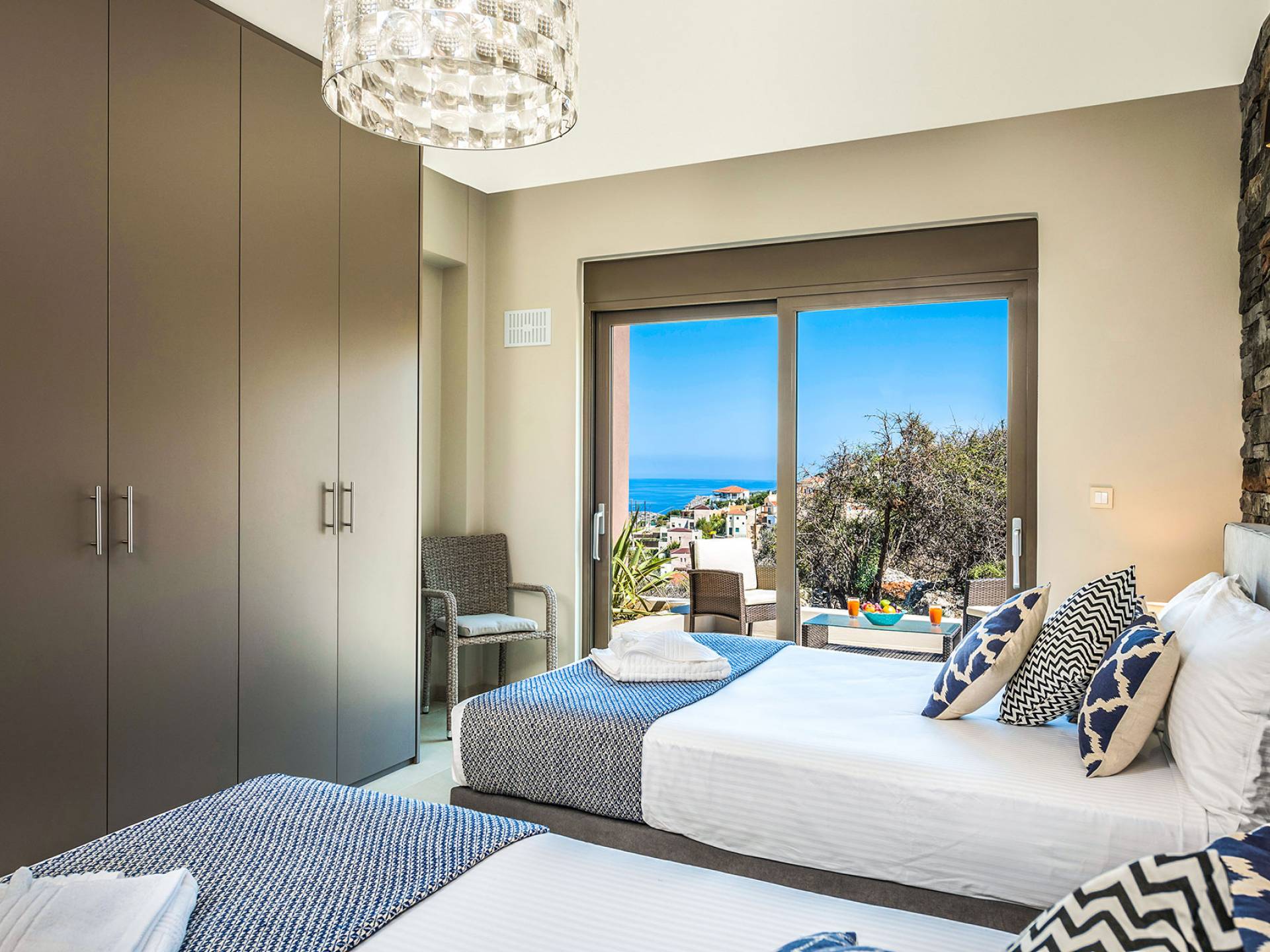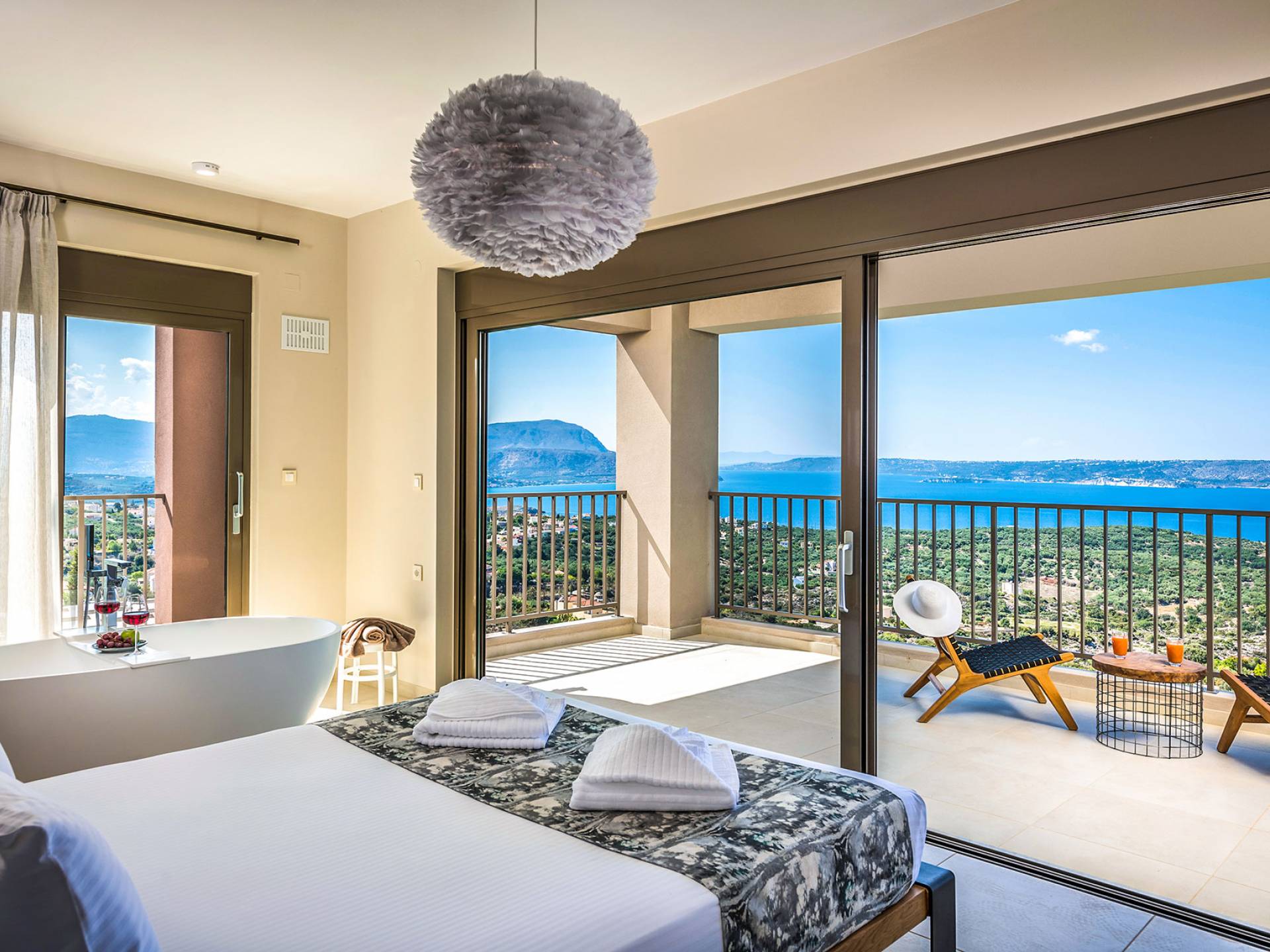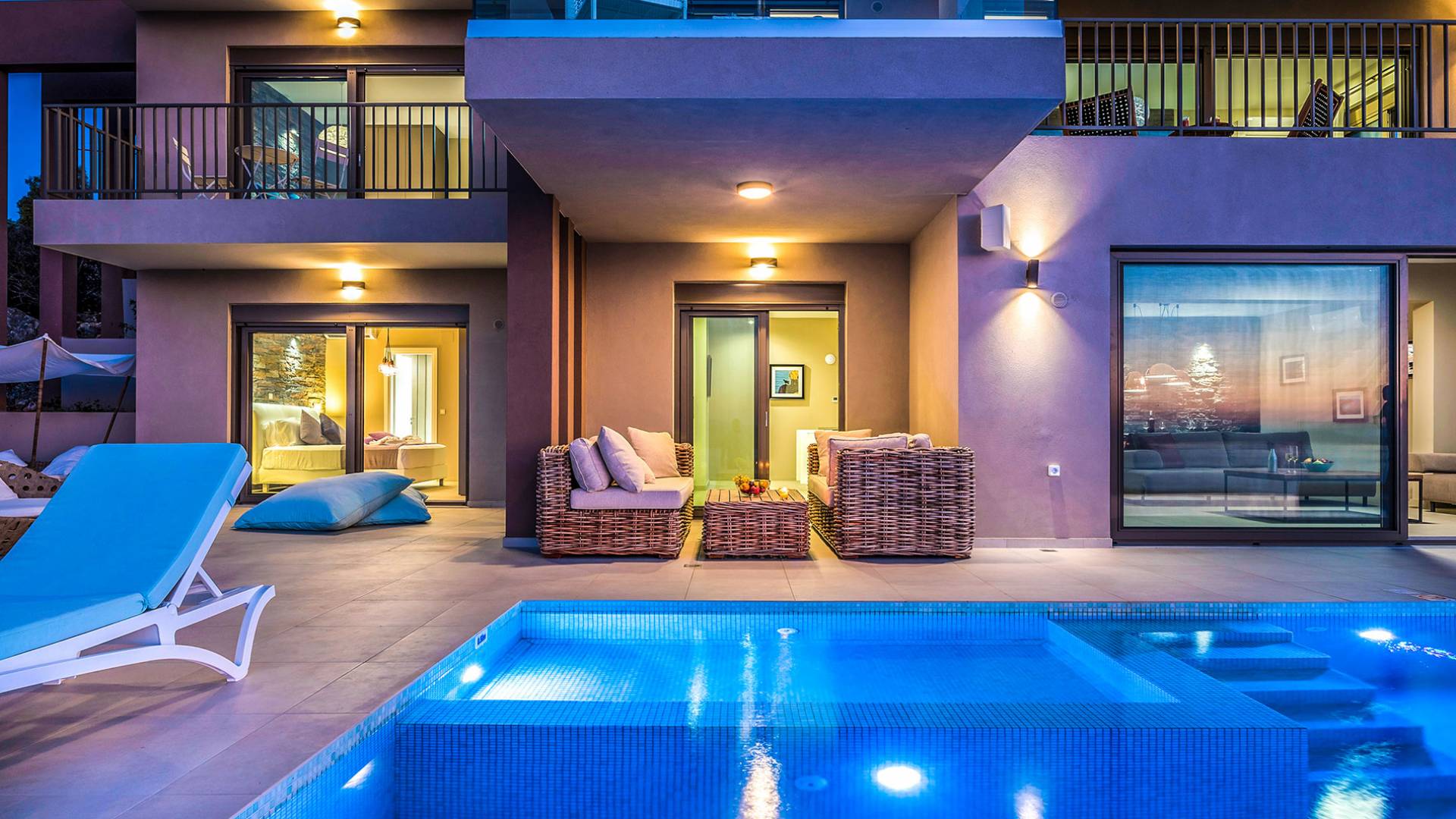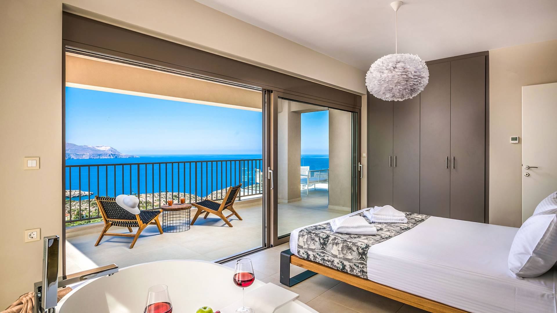 - Heated infinity pool (40 m²) with integrated children’s wading pool and panoramic views of Souda Bay & White Mountains