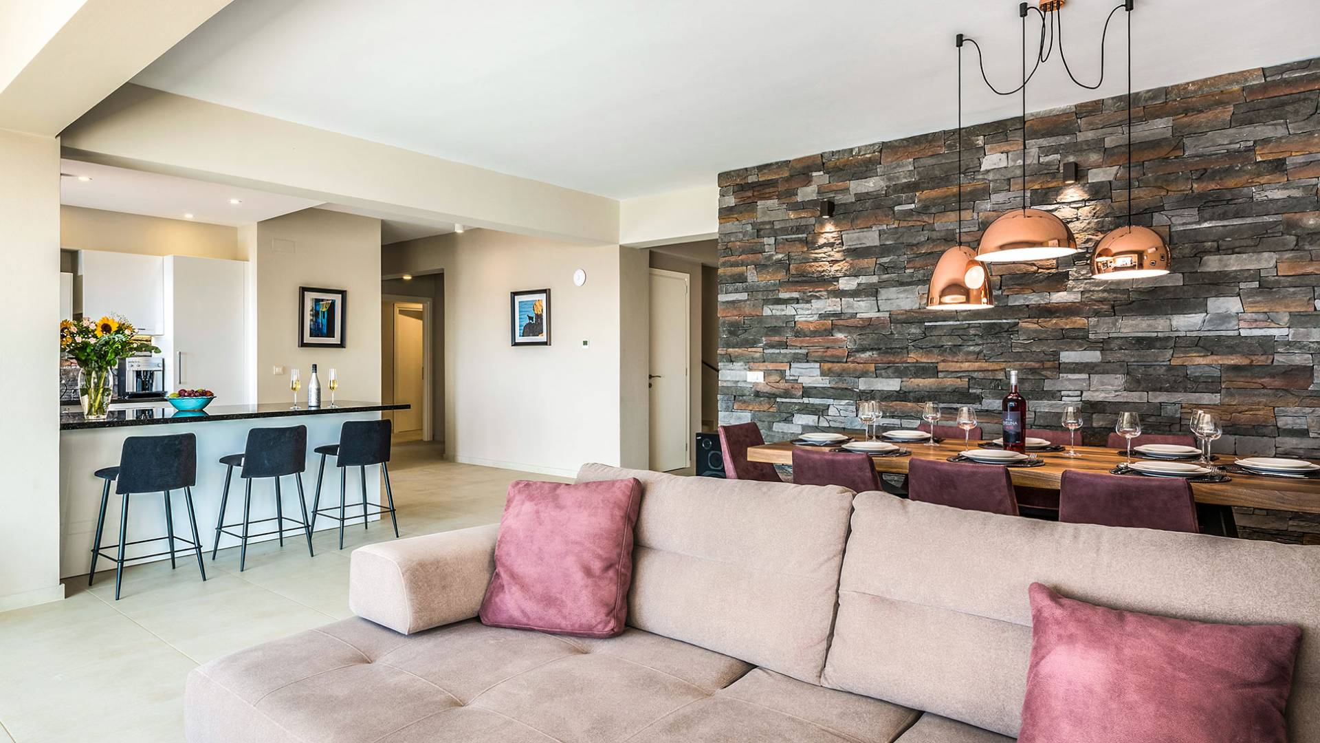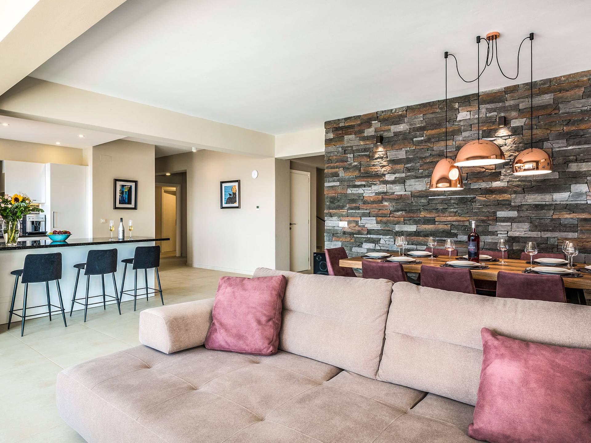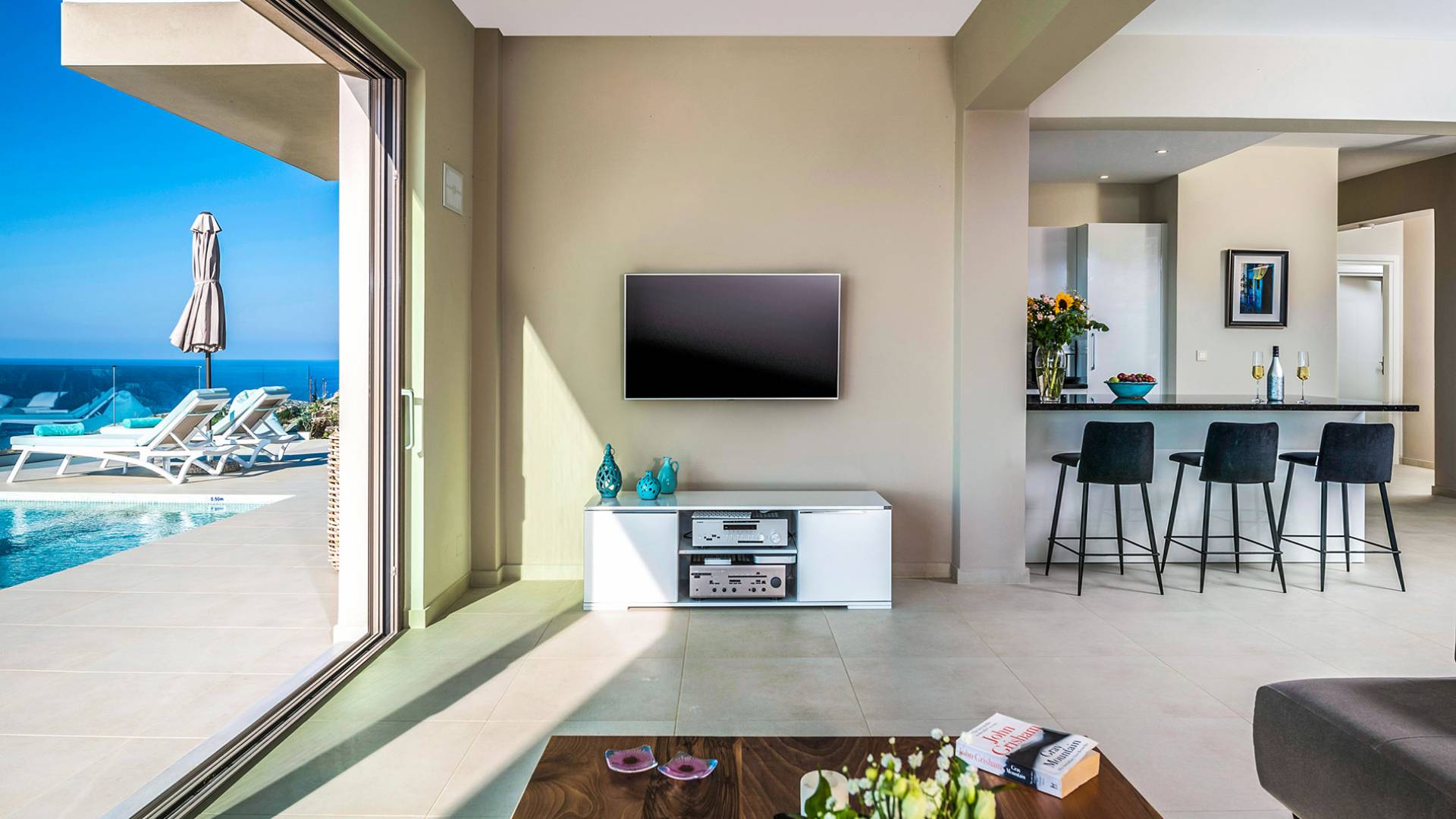 - Open-plan living/dining for 8 guests with direct pool access