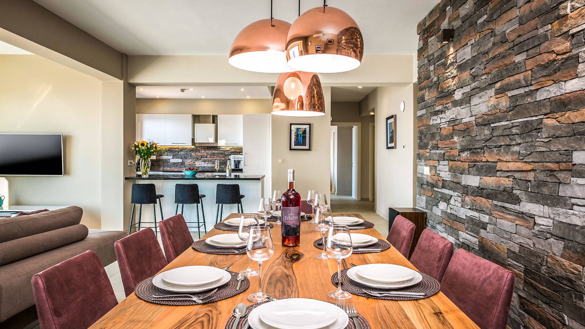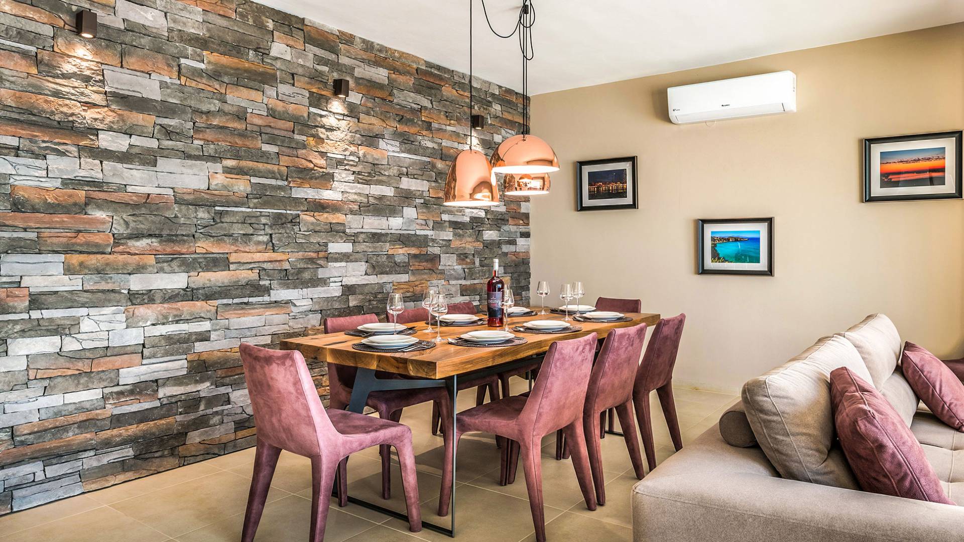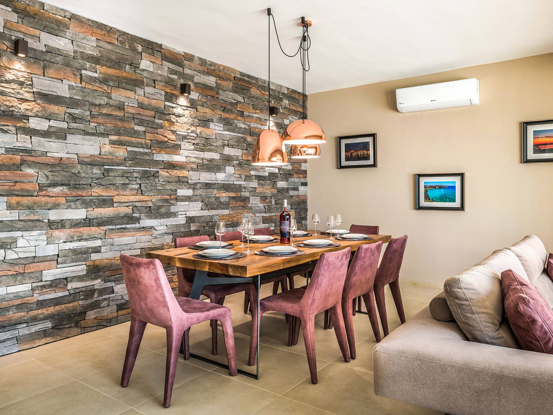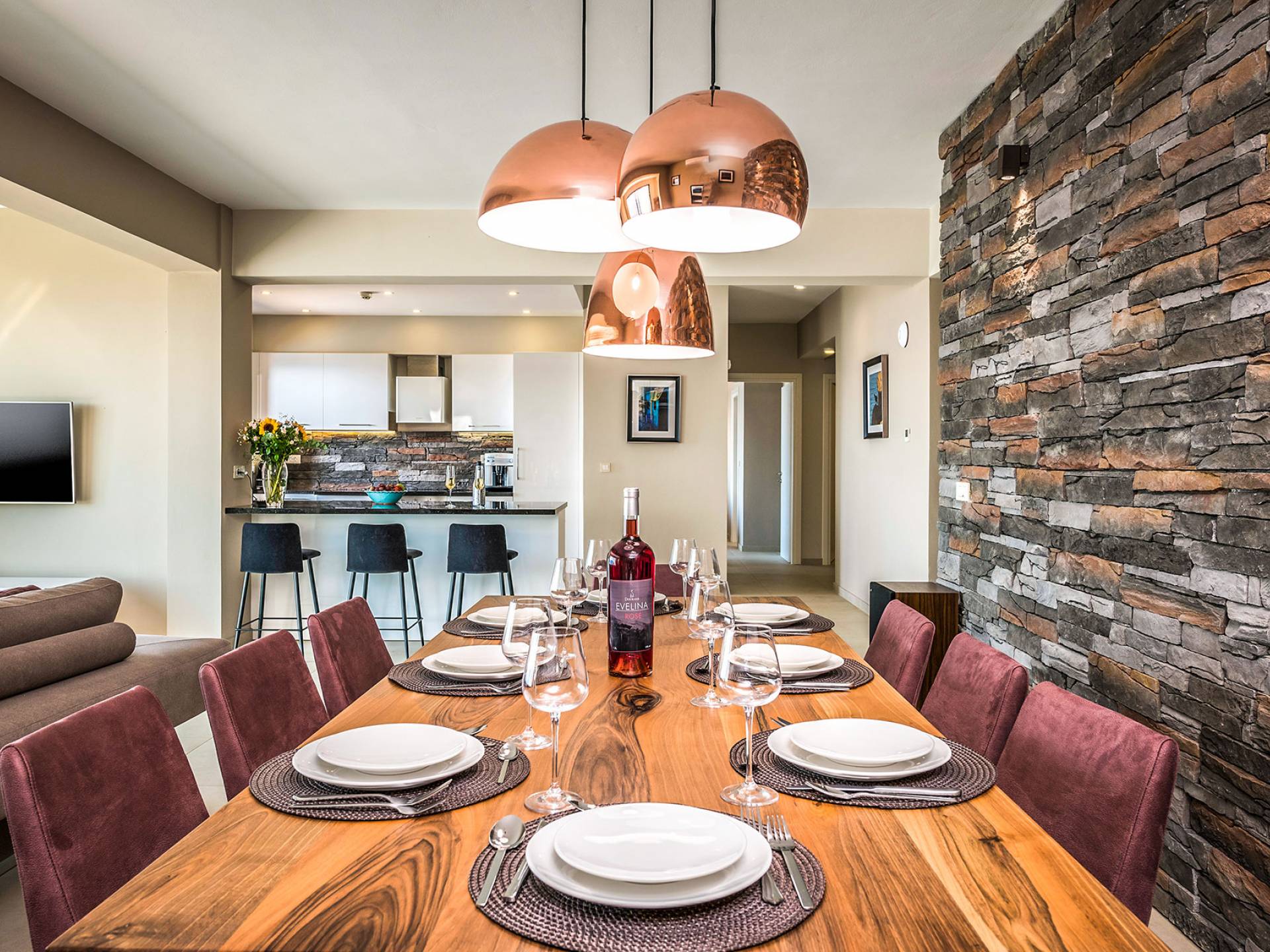 - Open-plan living/dining for 8 guests with direct pool access