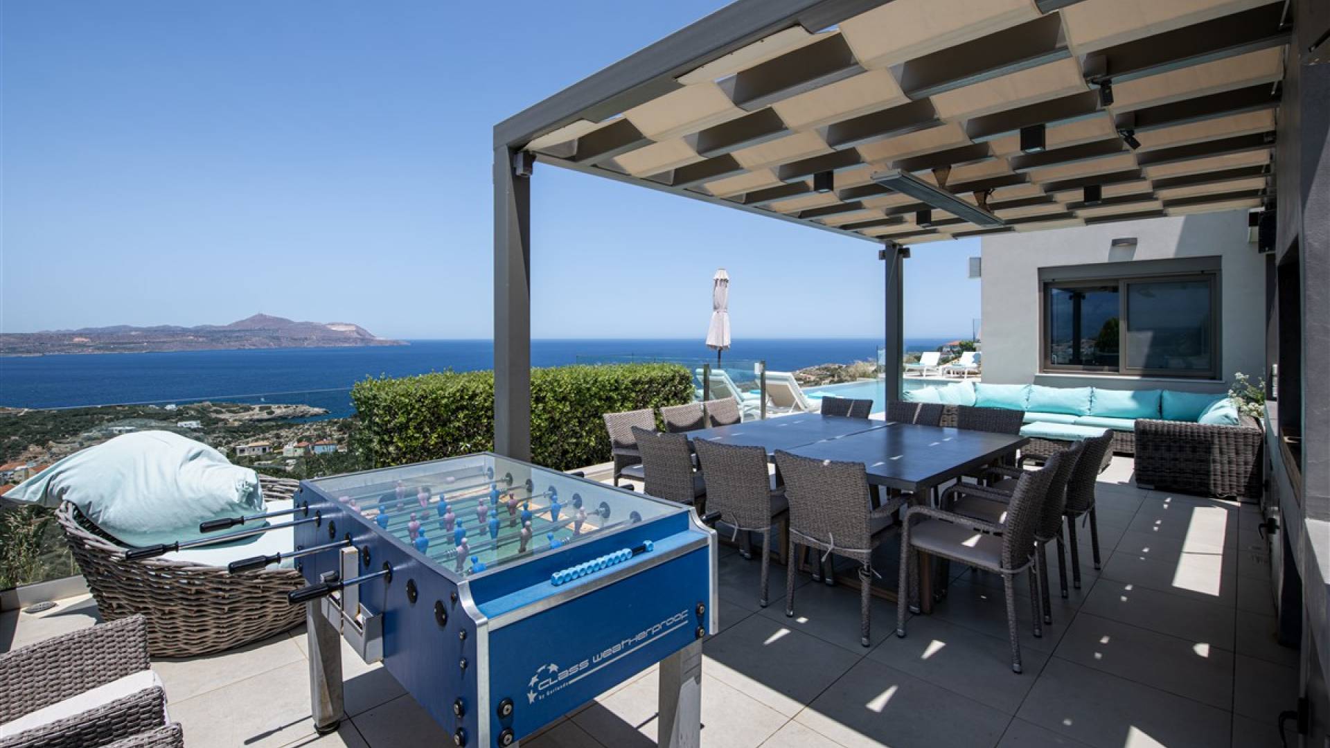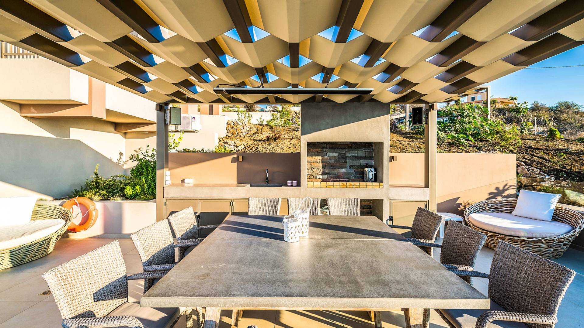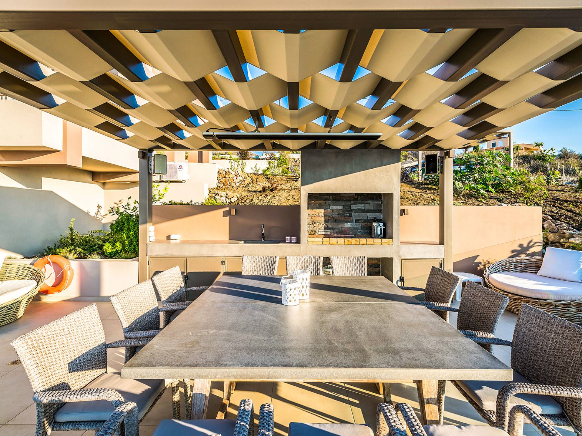 - Fully equipped summer kitchen (BBQ, fridge, sink) and shaded dining area for 12 guests