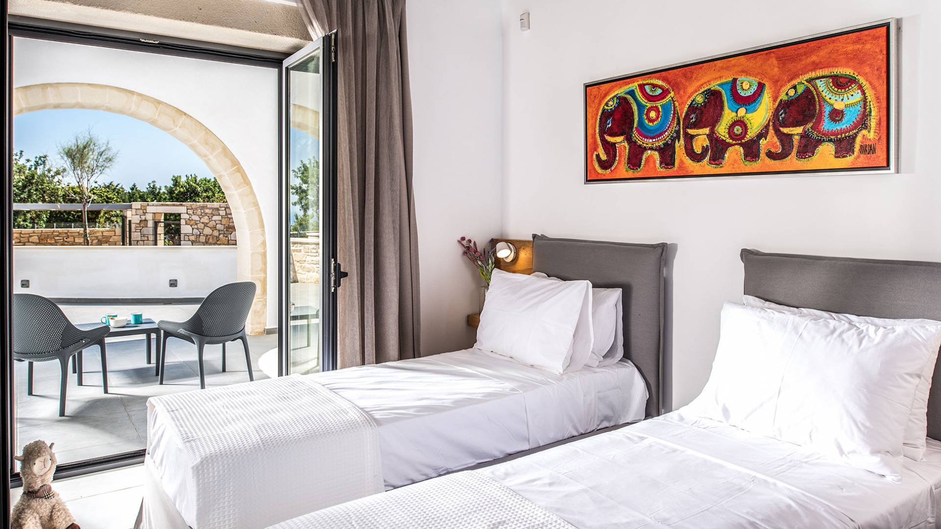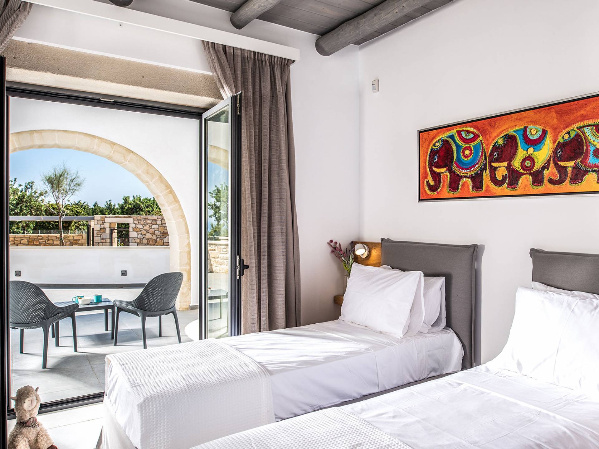 - Bedroom 1 with two single beds (or king) and terrace access
