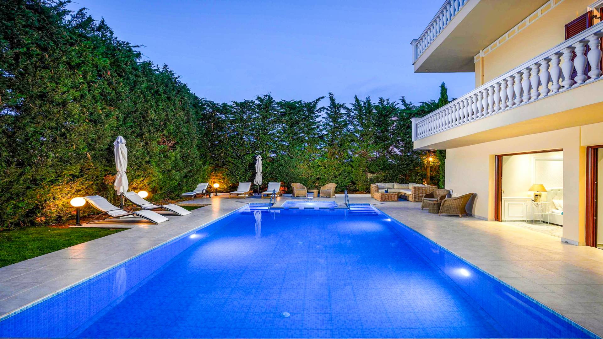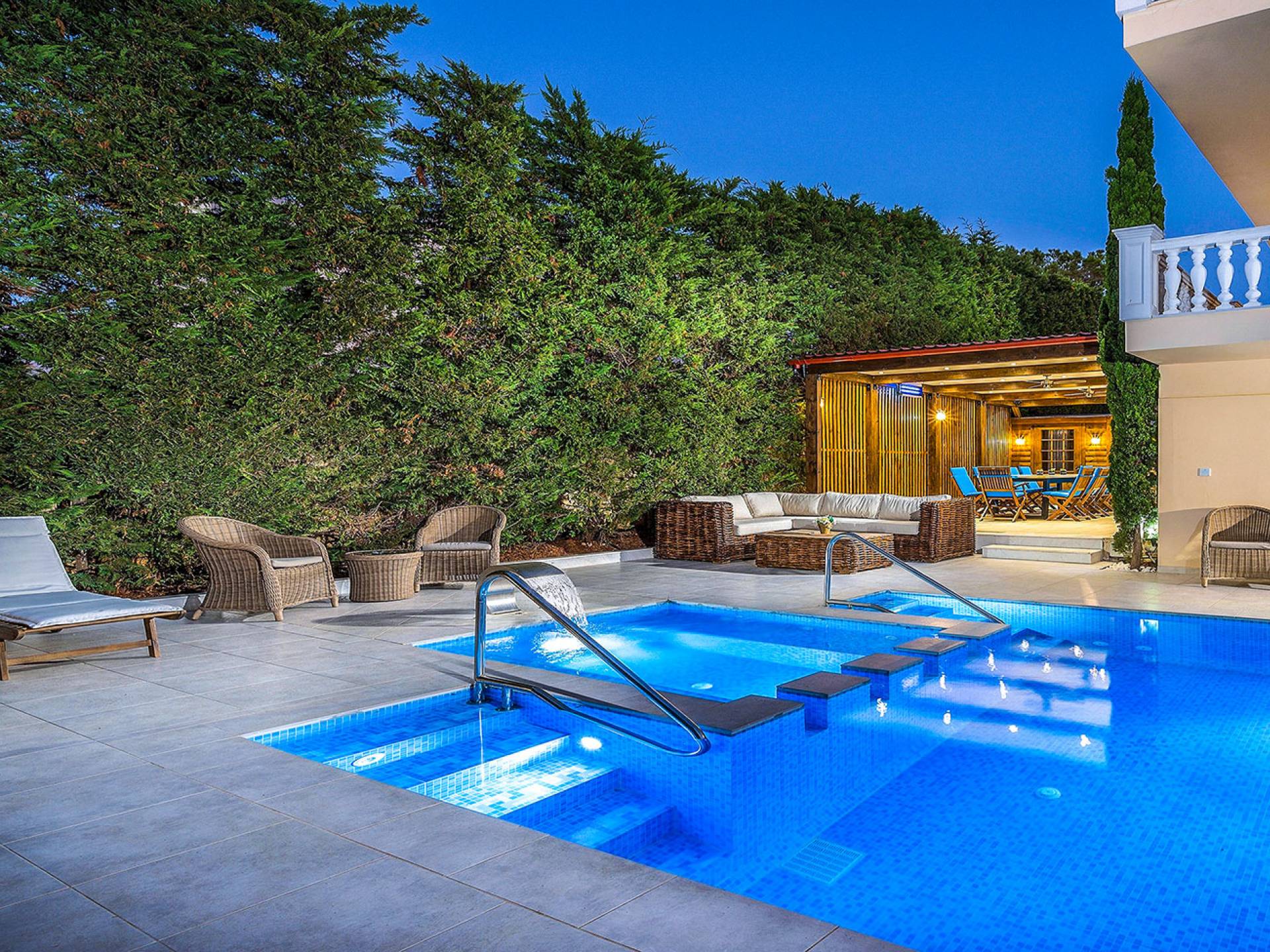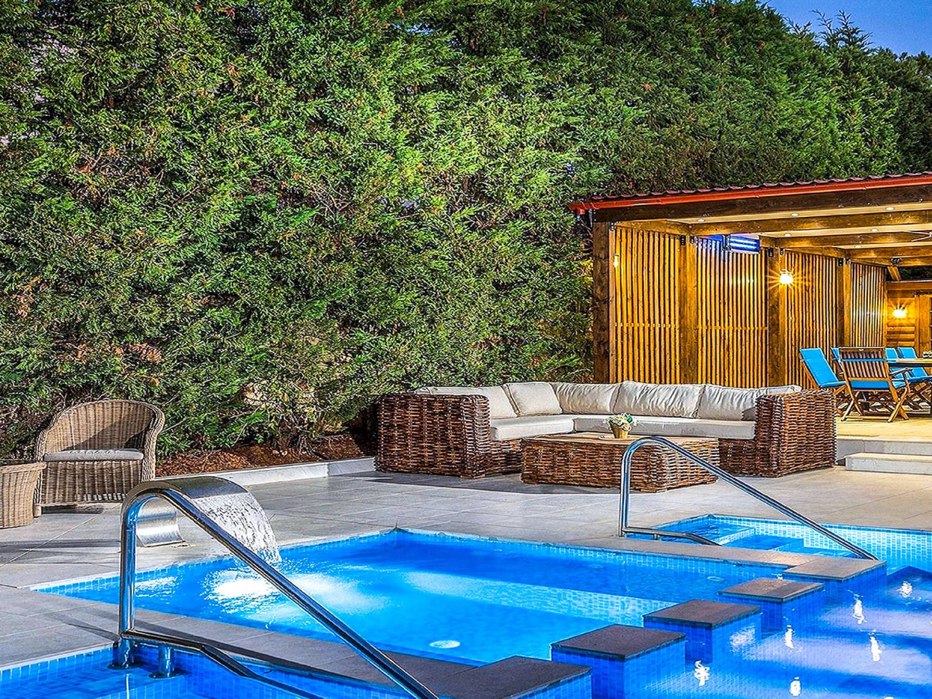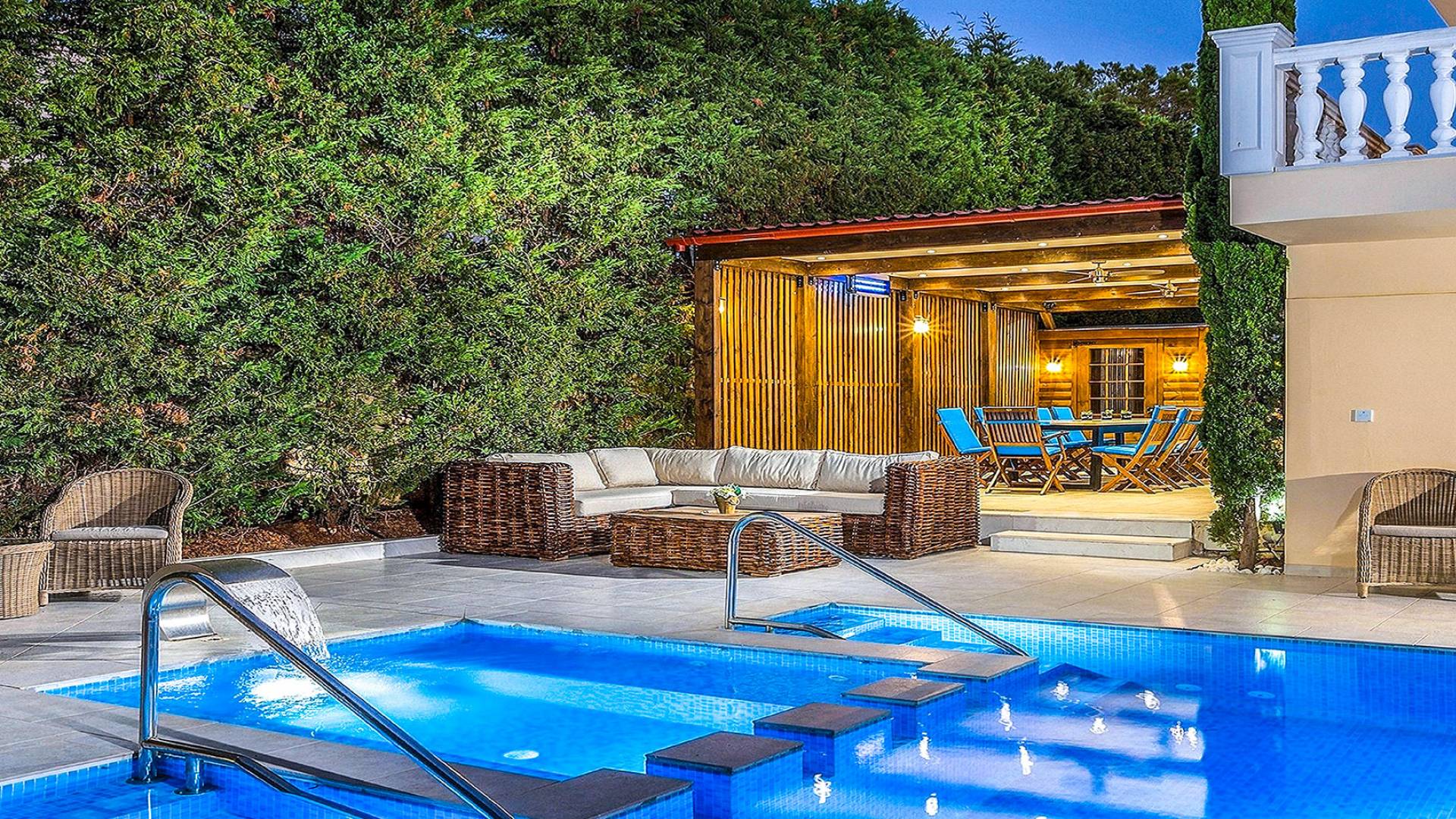 Το κυρίαρχο στοιχείο του εξωτερικού χώρου είναι η ιδιωτικότητα που προσφέρει. Ο κήπος που περιβάλλει τη βίλα είναι γεμάτος δέντρα, λουλούδια και δάνεια. Σε πολλά μέρη, μπορείτε να βρείτε καρέκλες, παγκάκια και αιώρες για να καθίσετε και να απολαύσετε το φαγητό, το ποτό σας ή να διαβάσετε ένα βιβλίο. Στην πισίνα υπάρχουν πολλές ξαπλώστρες και ομπρέλες, ακόμη και μπαρ με ψυγείο, για να έχετε πρόσβαση σε ότι επιθυμείτε. Οι μαρμάρινες πασαρέλες ενώνουν όλα τα σημεία του κήπου, ενώ κοντά στο BBQ υπάρχει μια πολύ όμορφη πέργκολα με κουζίνα και τραπεζαρία. Όλα τα μέρη του κήπου έχουν πολλά φώτα, έτσι το βράδυ δημιουργούσε μια πολύ όμορφη αίσθηση, ενώ ένα πολύ μοναδικό μέρος του κήπου όπου μπορείτε επίσης να απολαύσετε με την παρέα σας ή να χαλαρώσετε διαβάζοντας μια εφημερίδα ή ένα βιβλίο είναι το φαγητό μπροστά από μια μεγάλη τοιχογραφία, με θέμα από την αρχαία Ελλάδα, κολώνες και λουλούδια.
