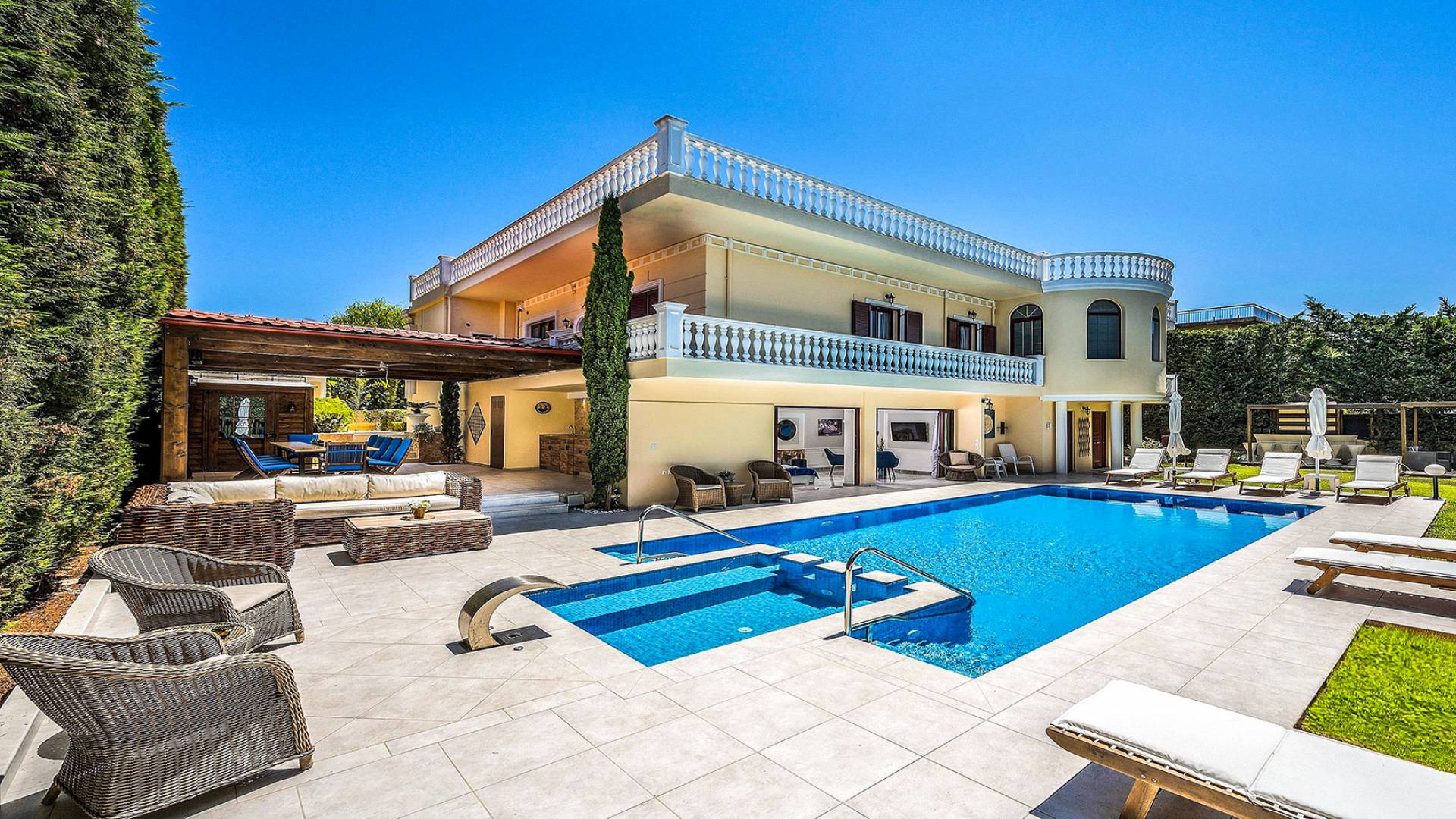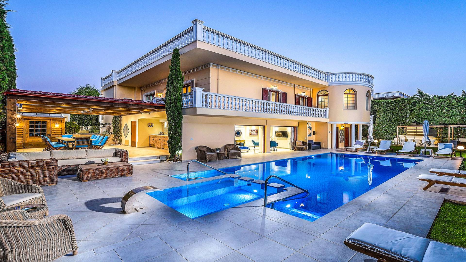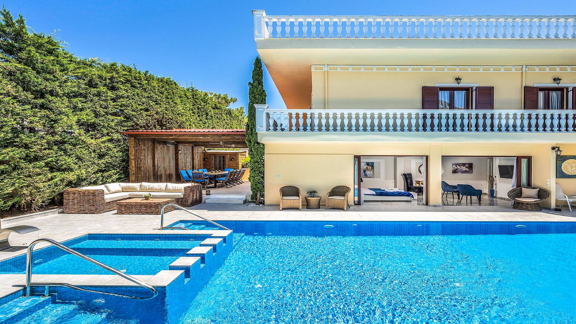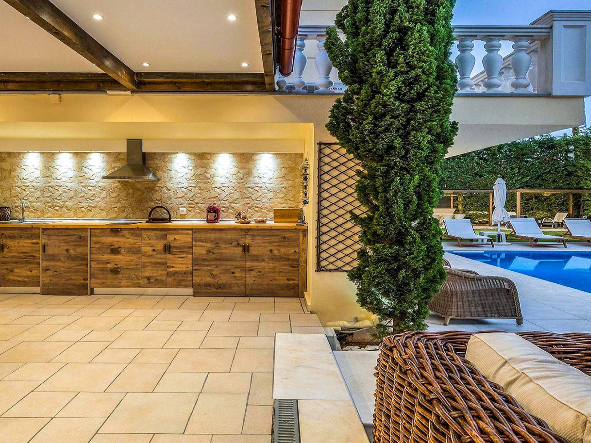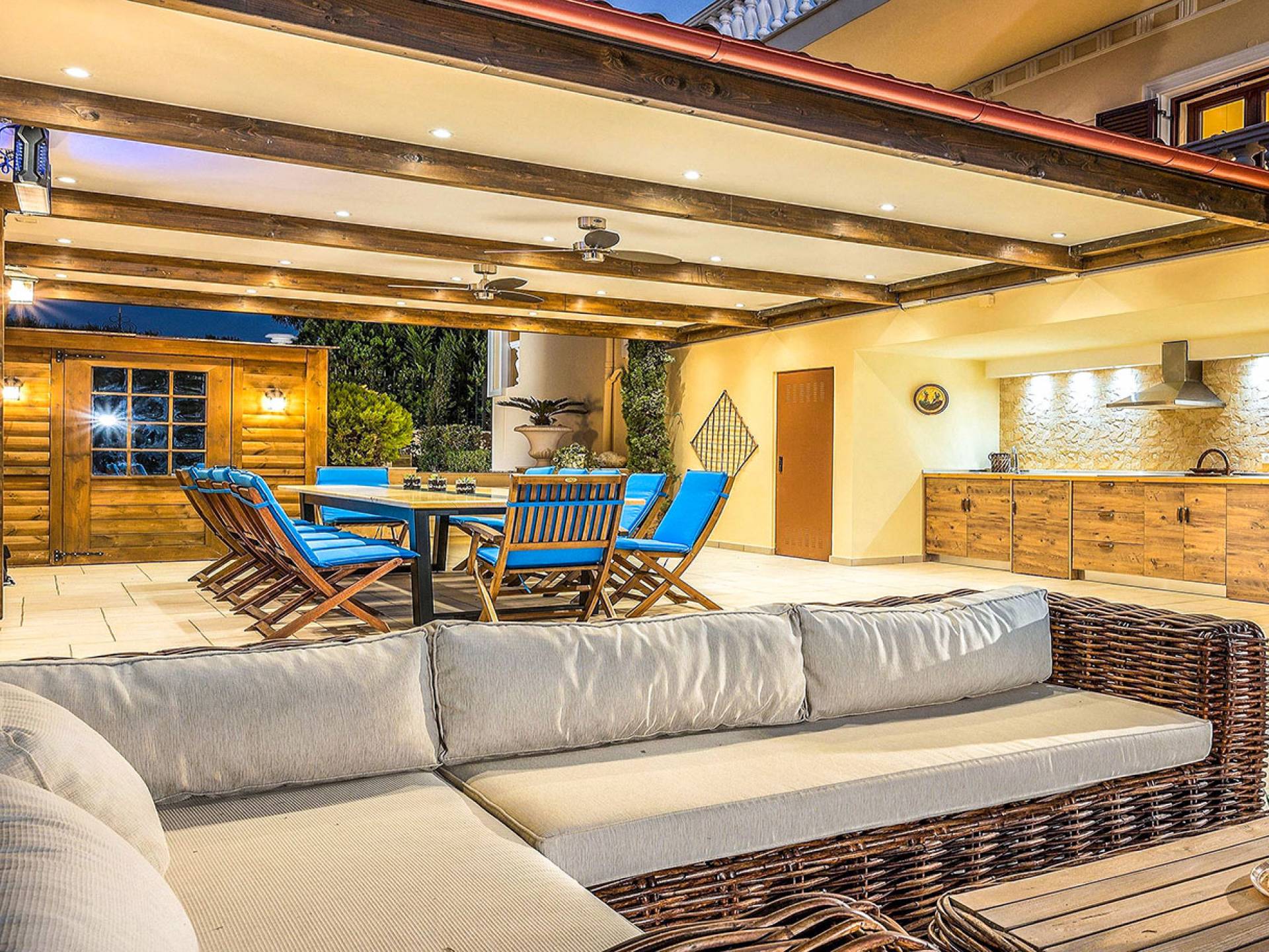 Το κυρίαρχο στοιχείο του εξωτερικού χώρου είναι η ιδιωτικότητα που προσφέρει. Ο κήπος που περιβάλλει τη βίλα είναι γεμάτος δέντρα, λουλούδια και δάνεια. Σε πολλά μέρη, μπορείτε να βρείτε καρέκλες, παγκάκια και αιώρες για να καθίσετε και να απολαύσετε το φαγητό, το ποτό σας ή να διαβάσετε ένα βιβλίο. Στην πισίνα υπάρχουν πολλές ξαπλώστρες και ομπρέλες, ακόμη και μπαρ με ψυγείο, για να έχετε πρόσβαση σε ότι επιθυμείτε. Οι μαρμάρινες πασαρέλες ενώνουν όλα τα σημεία του κήπου, ενώ κοντά στο BBQ υπάρχει μια πολύ όμορφη πέργκολα με κουζίνα και τραπεζαρία. Όλα τα μέρη του κήπου έχουν πολλά φώτα, έτσι το βράδυ δημιουργούσε μια πολύ όμορφη αίσθηση, ενώ ένα πολύ μοναδικό μέρος του κήπου όπου μπορείτε επίσης να απολαύσετε με την παρέα σας ή να χαλαρώσετε διαβάζοντας μια εφημερίδα ή ένα βιβλίο είναι το φαγητό μπροστά από μια μεγάλη τοιχογραφία, με θέμα από την αρχαία Ελλάδα, κολώνες και λουλούδια.