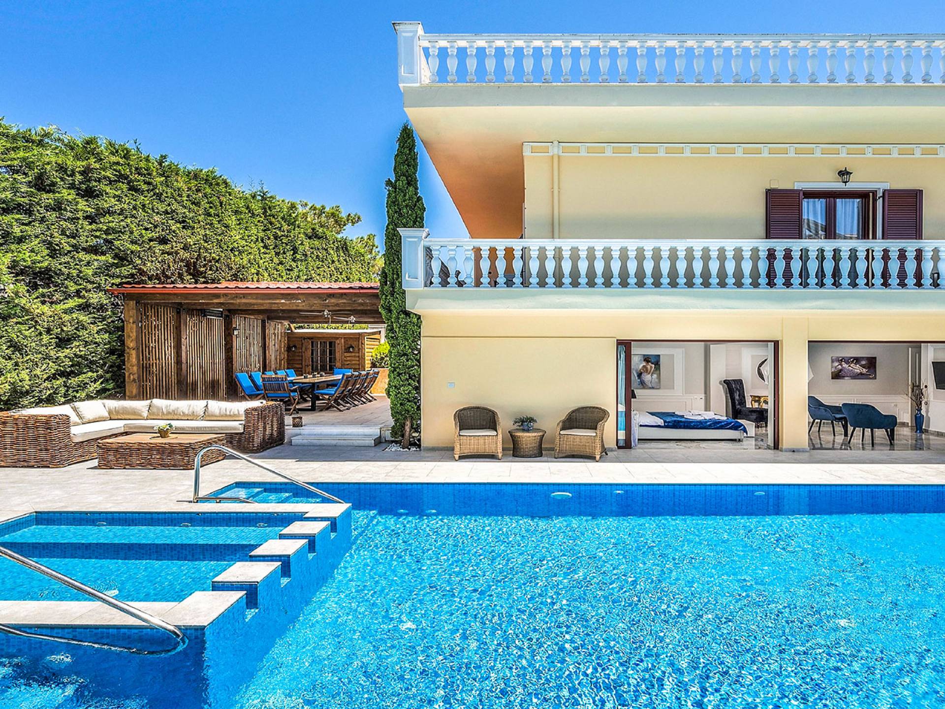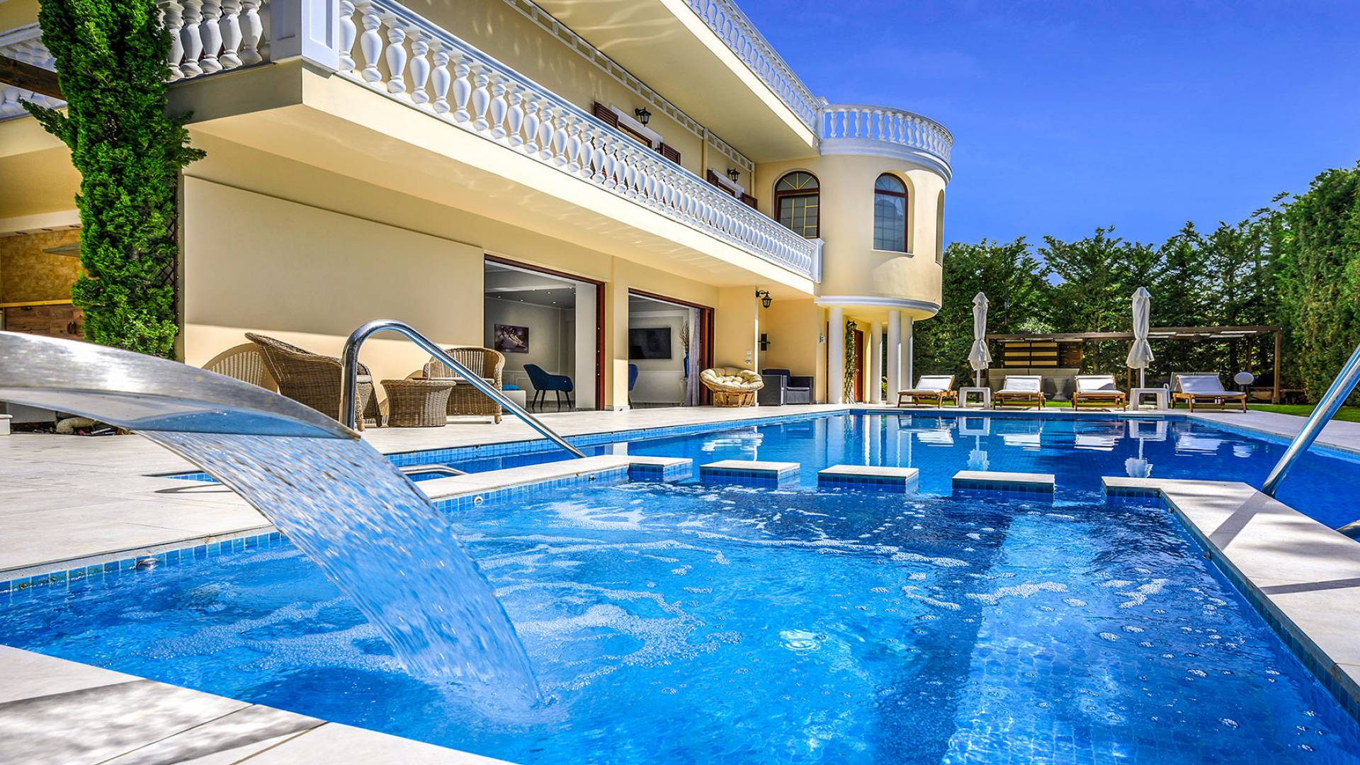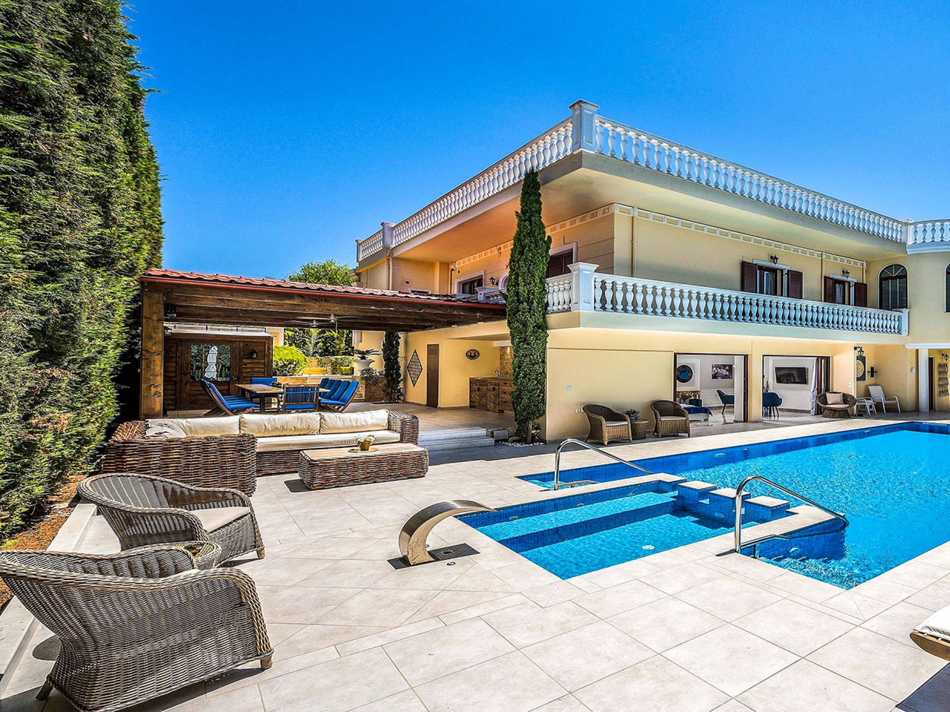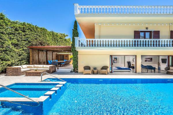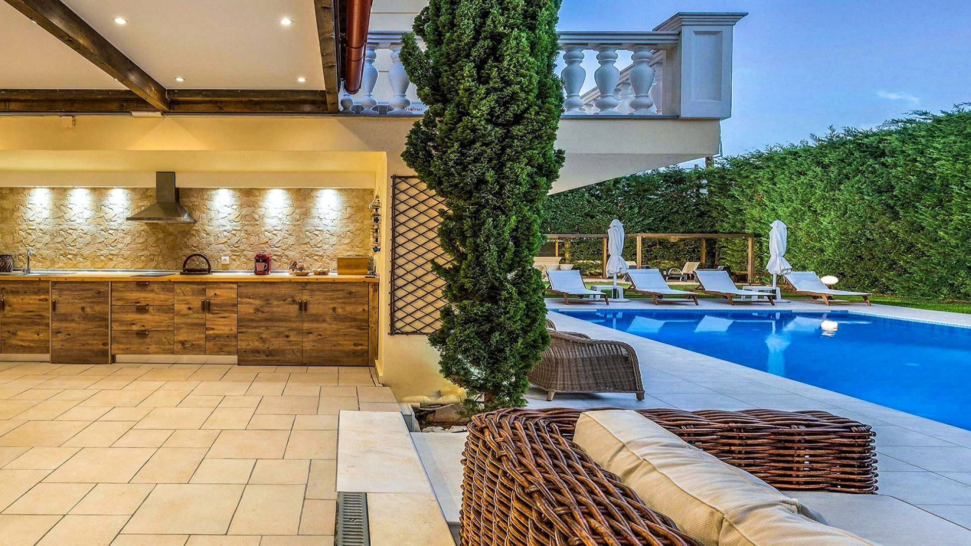 Το κυρίαρχο στοιχείο του εξωτερικού χώρου είναι η ιδιωτικότητα που προσφέρει. Ο κήπος που περιβάλλει τη βίλα είναι γεμάτος δέντρα, λουλούδια και δάνεια. Σε πολλά μέρη, μπορείτε να βρείτε καρέκλες, παγκάκια και αιώρες για να καθίσετε και να απολαύσετε το φαγητό, το ποτό σας ή να διαβάσετε ένα βιβλίο. Στην πισίνα υπάρχουν πολλές ξαπλώστρες και ομπρέλες, ακόμη και μπαρ με ψυγείο, για να έχετε πρόσβαση σε ότι επιθυμείτε. Οι μαρμάρινες πασαρέλες ενώνουν όλα τα σημεία του κήπου, ενώ κοντά στο BBQ υπάρχει μια πολύ όμορφη πέργκολα με κουζίνα και τραπεζαρία. Όλα τα μέρη του κήπου έχουν πολλά φώτα, έτσι το βράδυ δημιουργούσε μια πολύ όμορφη αίσθηση, ενώ ένα πολύ μοναδικό μέρος του κήπου όπου μπορείτε επίσης να απολαύσετε με την παρέα σας ή να χαλαρώσετε διαβάζοντας μια εφημερίδα ή ένα βιβλίο είναι το φαγητό μπροστά από μια μεγάλη τοιχογραφία, με θέμα από την αρχαία Ελλάδα, κολώνες και λουλούδια.