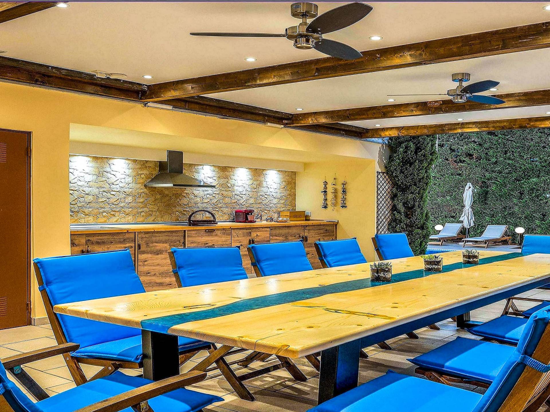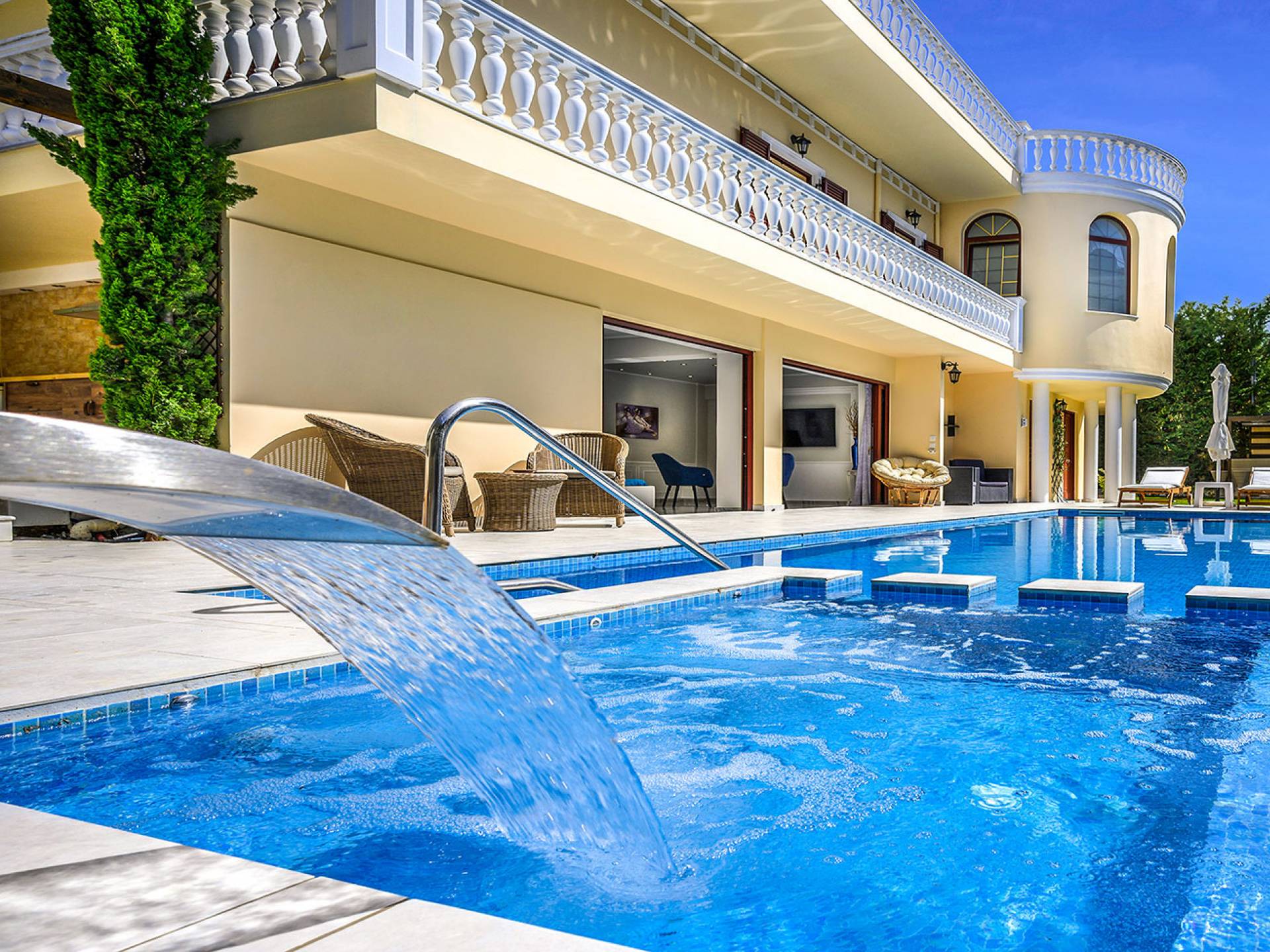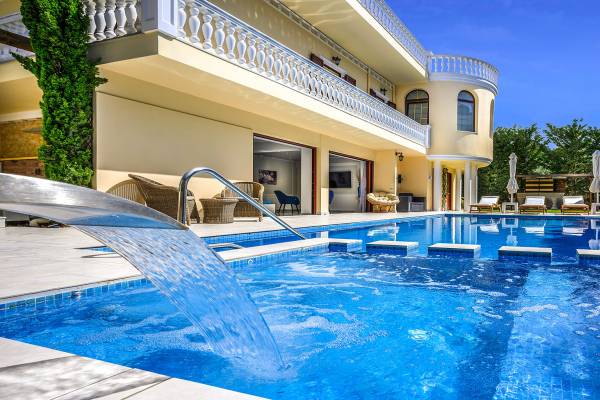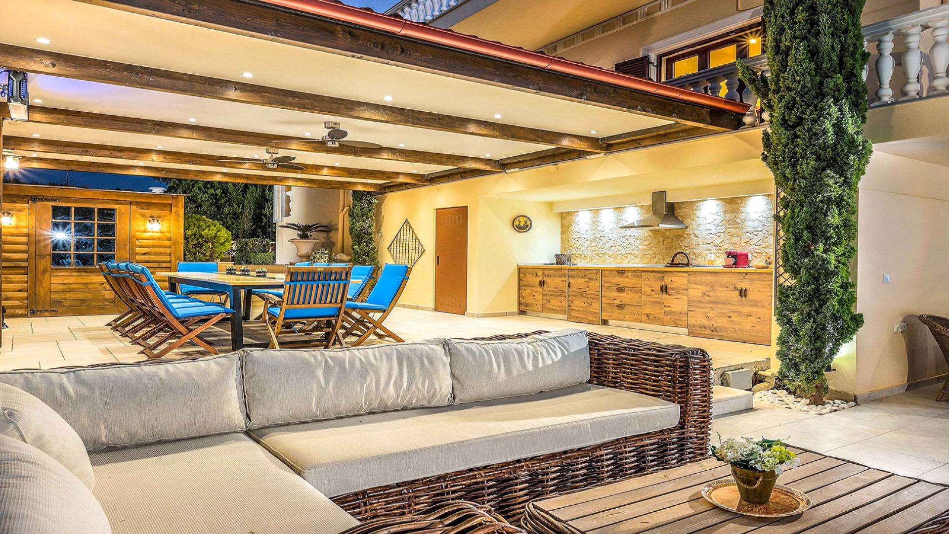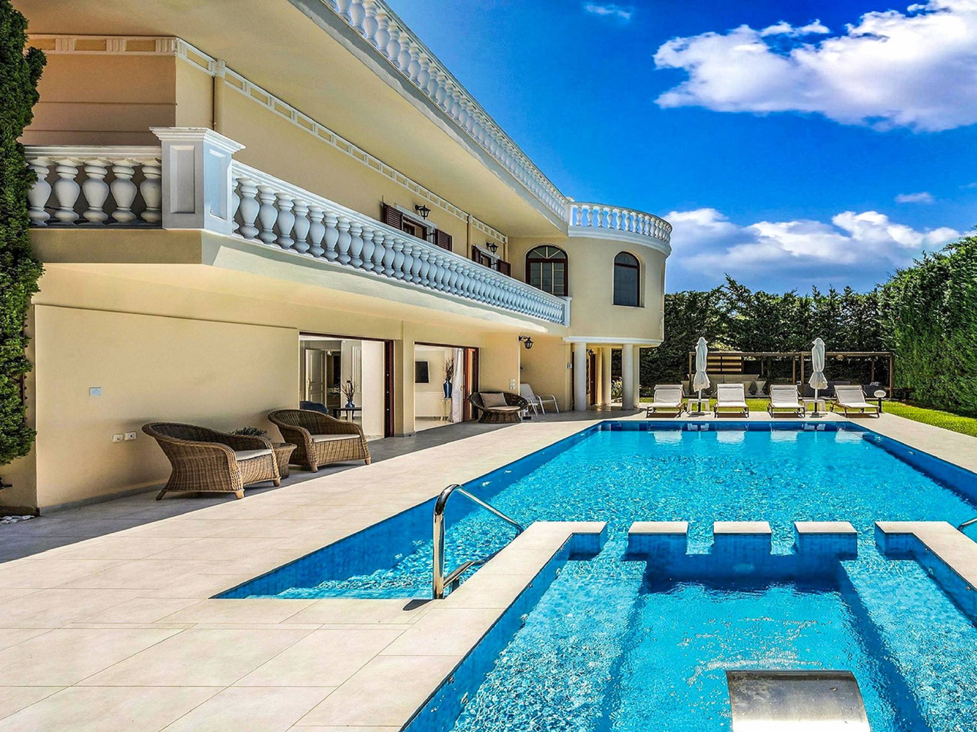 Το κυρίαρχο στοιχείο του εξωτερικού χώρου είναι η ιδιωτικότητα που προσφέρει. Ο κήπος που περιβάλλει τη βίλα είναι γεμάτος δέντρα, λουλούδια και δάνεια. Σε πολλά μέρη, μπορείτε να βρείτε καρέκλες, παγκάκια και αιώρες για να καθίσετε και να απολαύσετε το φαγητό, το ποτό σας ή να διαβάσετε ένα βιβλίο. Στην πισίνα υπάρχουν πολλές ξαπλώστρες και ομπρέλες, ακόμη και μπαρ με ψυγείο, για να έχετε πρόσβαση σε ότι επιθυμείτε. Οι μαρμάρινες πασαρέλες ενώνουν όλα τα σημεία του κήπου, ενώ κοντά στο BBQ υπάρχει μια πολύ όμορφη πέργκολα με κουζίνα και τραπεζαρία. Όλα τα μέρη του κήπου έχουν πολλά φώτα, έτσι το βράδυ δημιουργούσε μια πολύ όμορφη αίσθηση, ενώ ένα πολύ μοναδικό μέρος του κήπου όπου μπορείτε επίσης να απολαύσετε με την παρέα σας ή να χαλαρώσετε διαβάζοντας μια εφημερίδα ή ένα βιβλίο είναι το φαγητό μπροστά από μια μεγάλη τοιχογραφία, με θέμα από την αρχαία Ελλάδα, κολώνες και λουλούδια.
