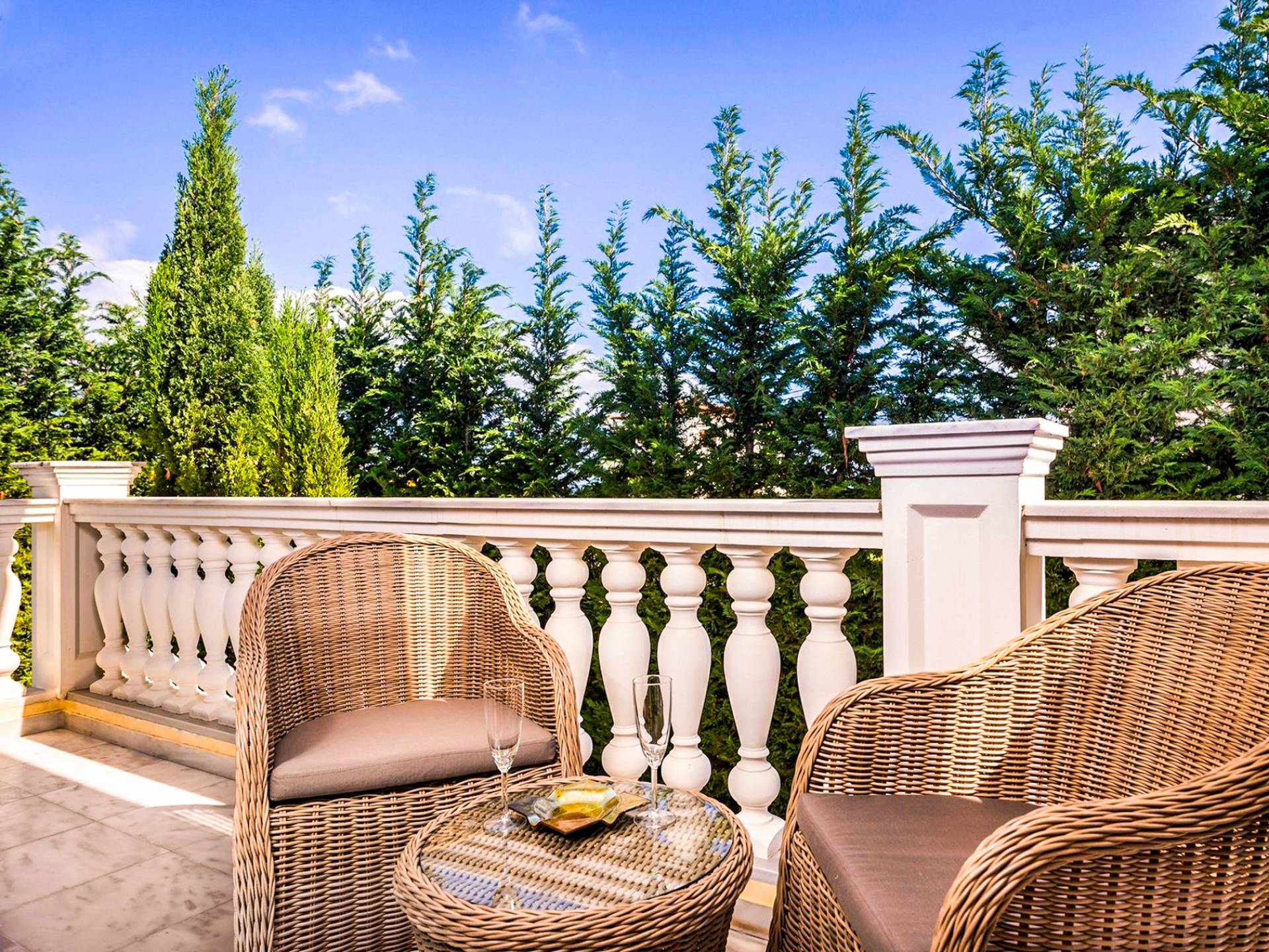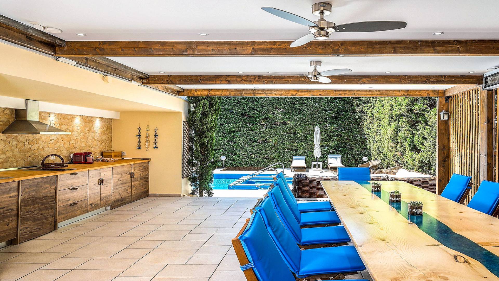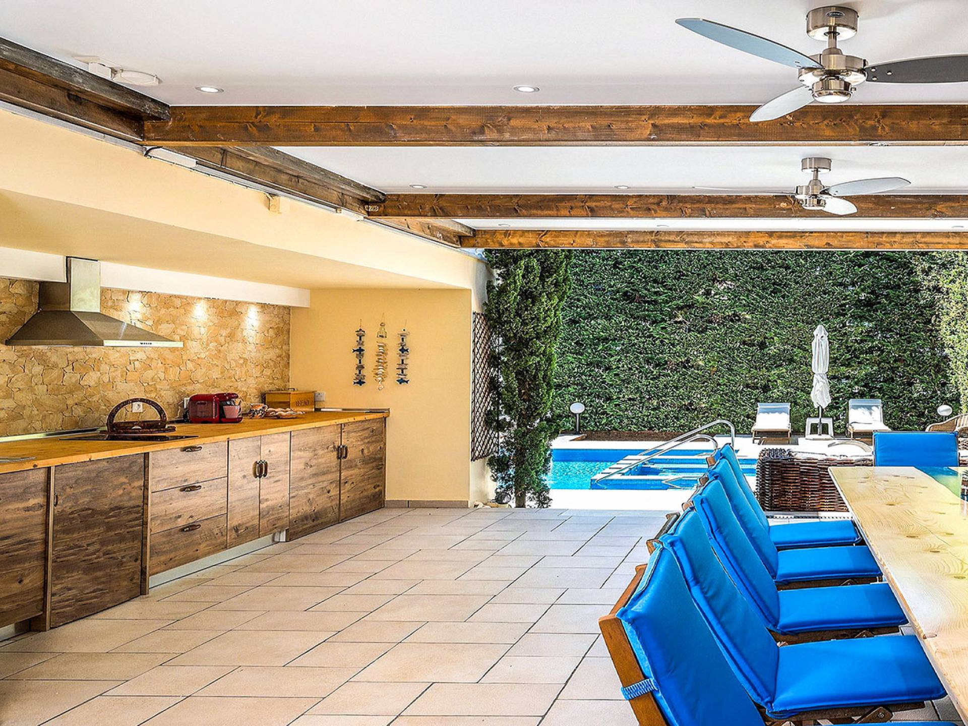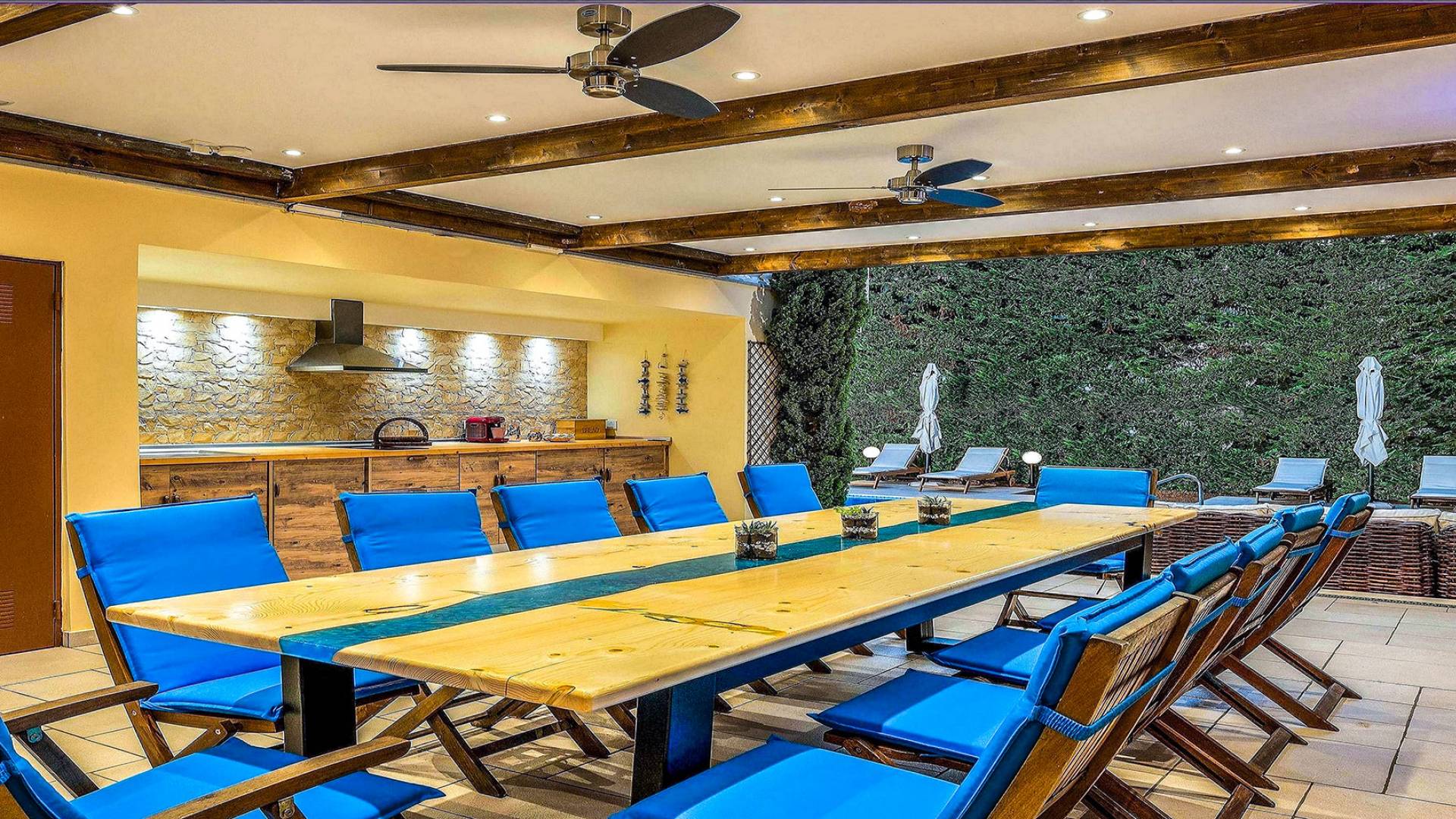 Το κυρίαρχο στοιχείο του εξωτερικού χώρου είναι η ιδιωτικότητα που προσφέρει. Ο κήπος που περιβάλλει τη βίλα είναι γεμάτος δέντρα, λουλούδια και δάνεια. Σε πολλά μέρη, μπορείτε να βρείτε καρέκλες, παγκάκια και αιώρες για να καθίσετε και να απολαύσετε το φαγητό, το ποτό σας ή να διαβάσετε ένα βιβλίο. Στην πισίνα υπάρχουν πολλές ξαπλώστρες και ομπρέλες, ακόμη και μπαρ με ψυγείο, για να έχετε πρόσβαση σε ότι επιθυμείτε. Οι μαρμάρινες πασαρέλες ενώνουν όλα τα σημεία του κήπου, ενώ κοντά στο BBQ υπάρχει μια πολύ όμορφη πέργκολα με κουζίνα και τραπεζαρία. Όλα τα μέρη του κήπου έχουν πολλά φώτα, έτσι το βράδυ δημιουργούσε μια πολύ όμορφη αίσθηση, ενώ ένα πολύ μοναδικό μέρος του κήπου όπου μπορείτε επίσης να απολαύσετε με την παρέα σας ή να χαλαρώσετε διαβάζοντας μια εφημερίδα ή ένα βιβλίο είναι το φαγητό μπροστά από μια μεγάλη τοιχογραφία, με θέμα από την αρχαία Ελλάδα, κολώνες και λουλούδια.
