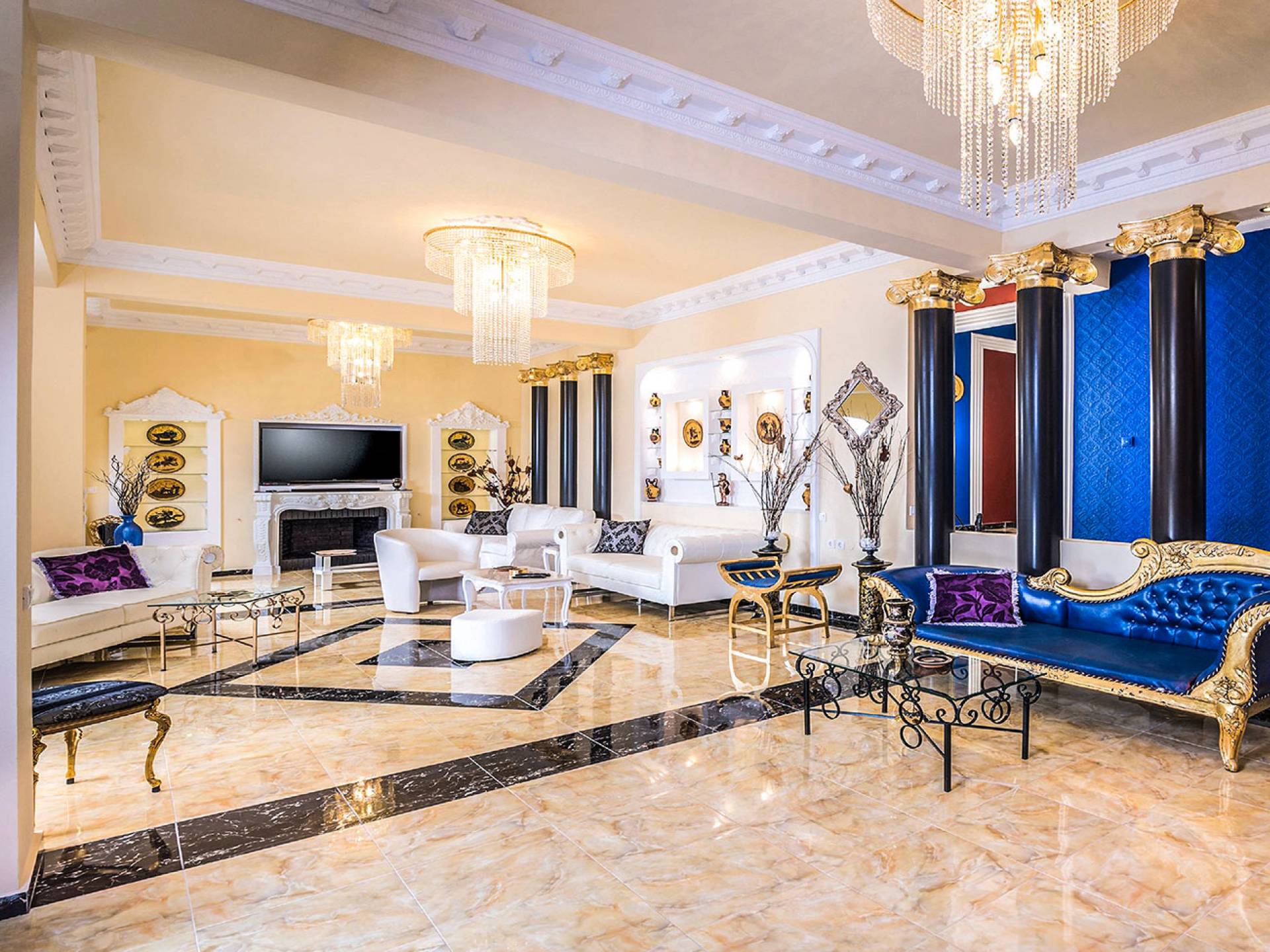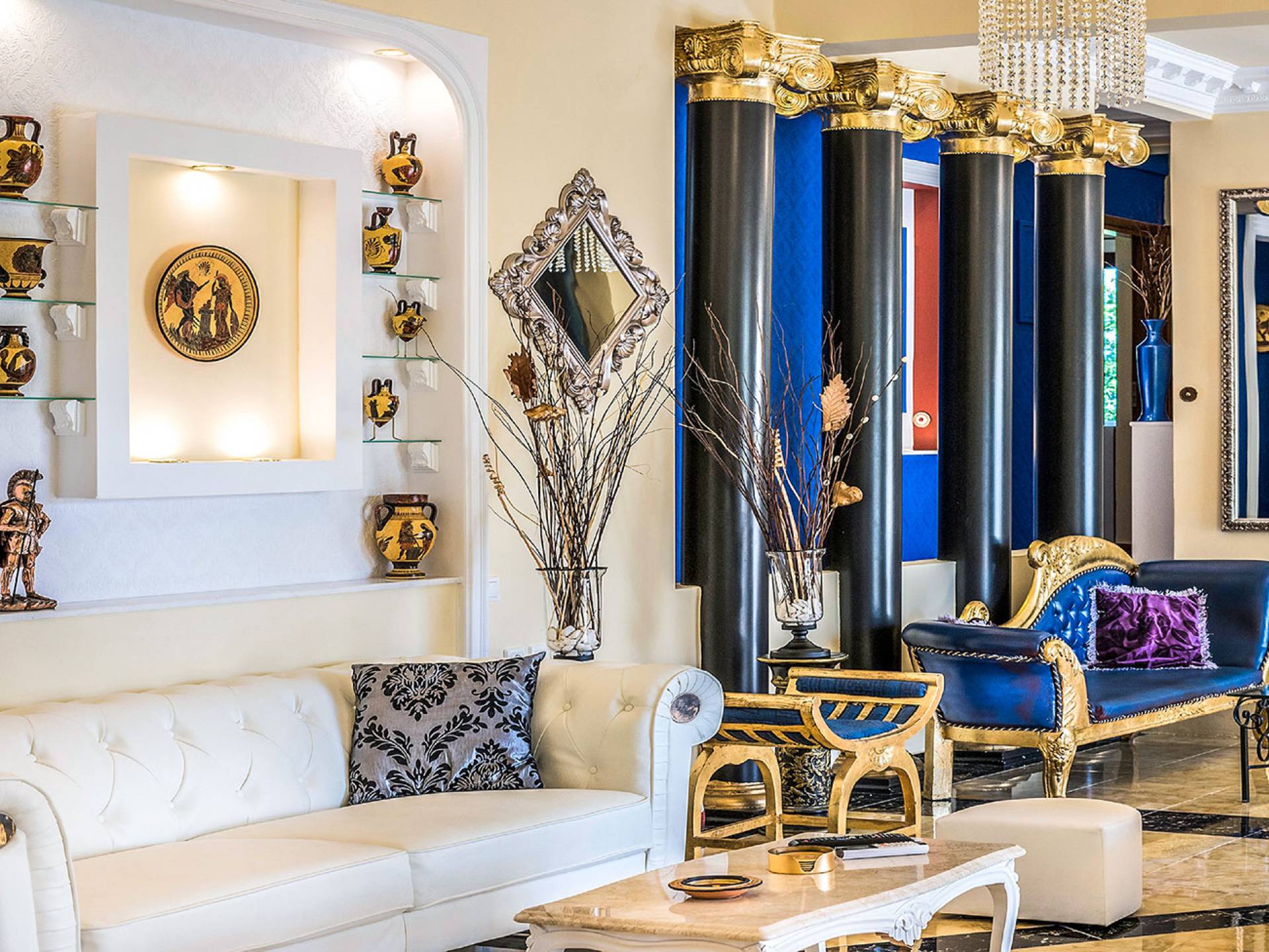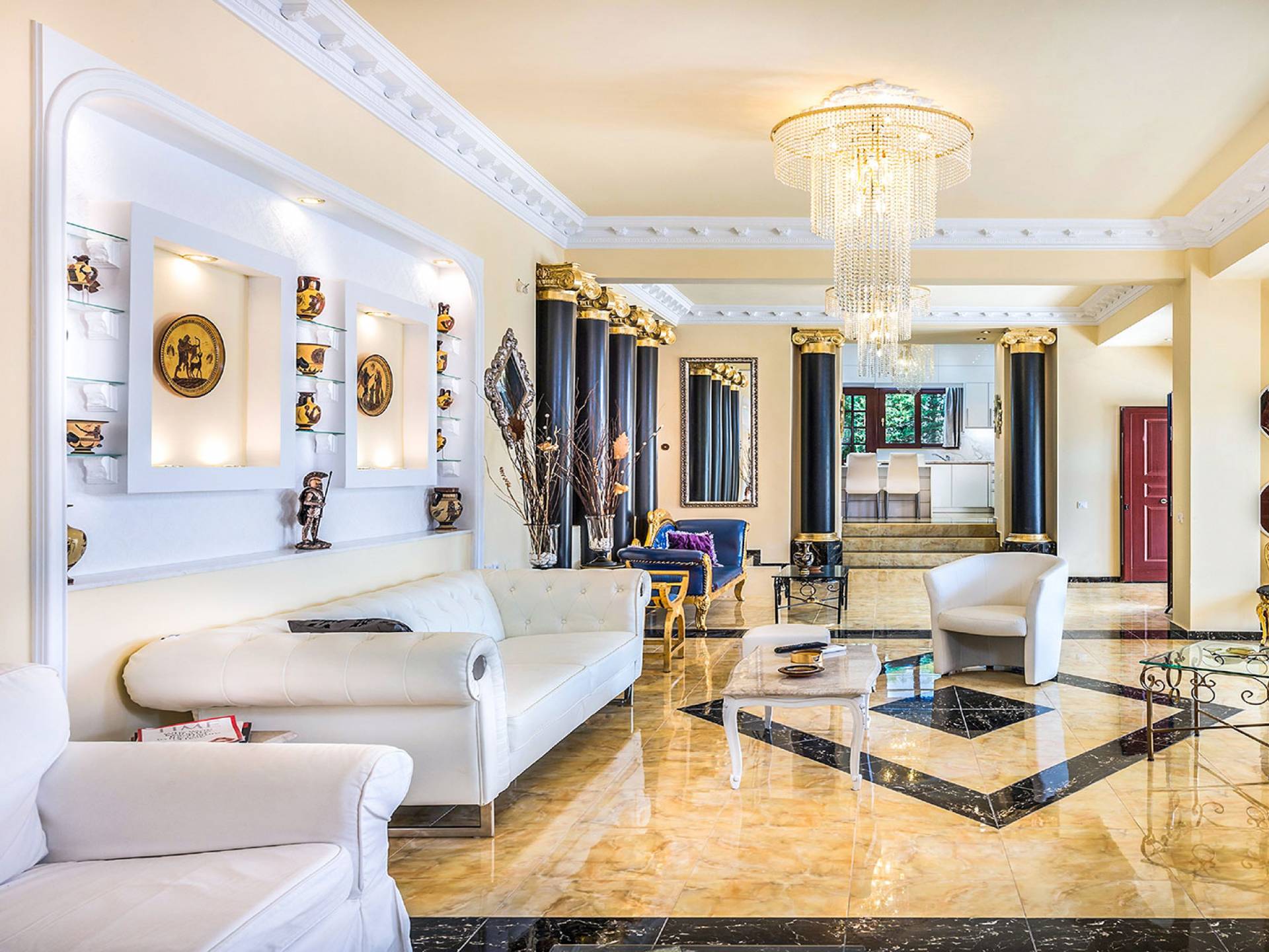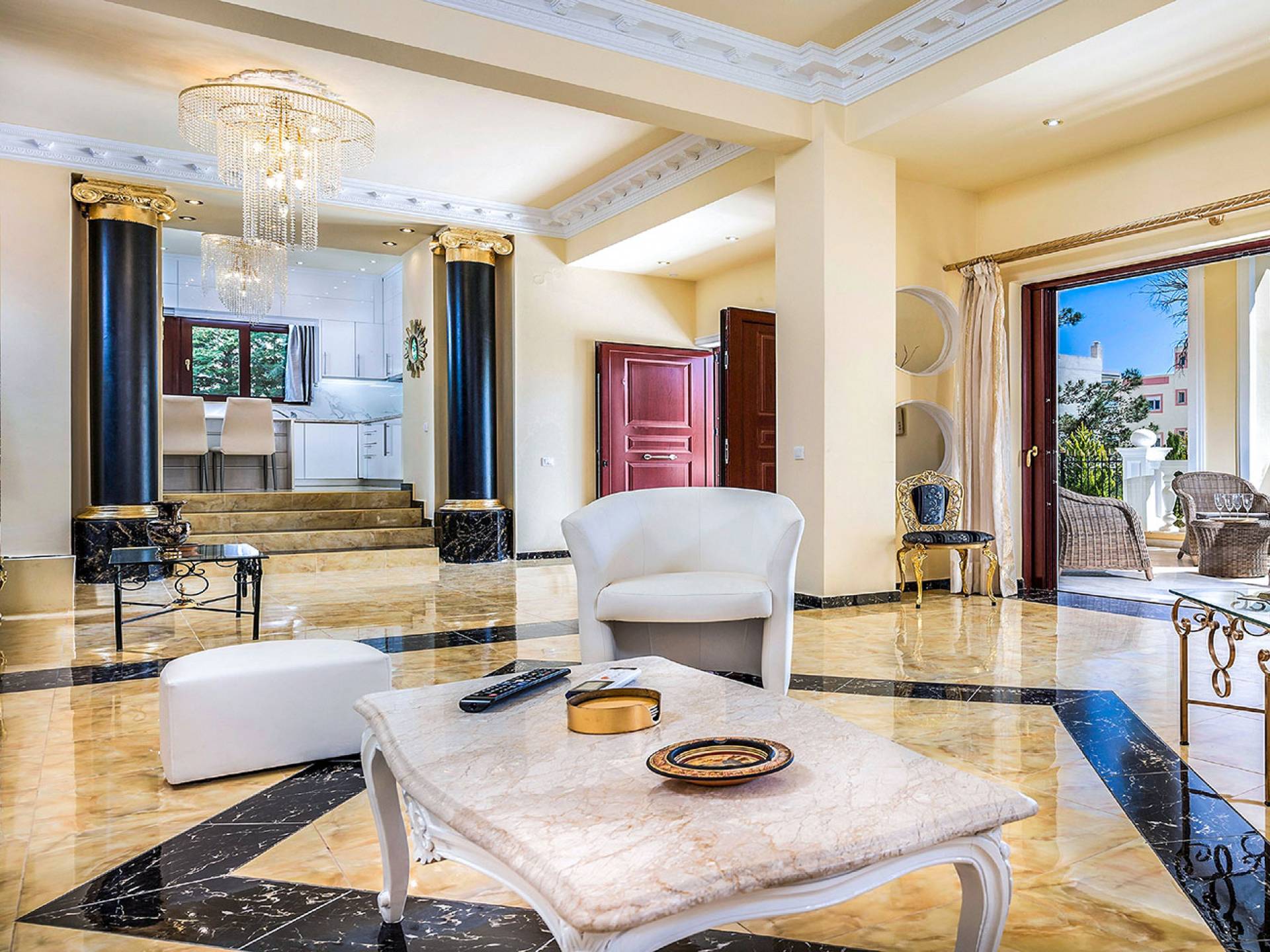 Μπείτε στο Villa Crown Chania, τα 3 μεγάλα σαλόνια με τις αρχαιοελληνικές κολώνες και τις χρυσές διακοσμήσεις, το σκαλισμένο τζάκι, η πρόσβαση στη μεγάλη βεράντα με τα λευκά μάρμαρα «Διονύσου» και τους τρεις επιχρυσωμένους πολυελαίους Swarovski θα σας εντυπωσιάσουν απόλυτα. Γιατί κάθε χρυσό πράγμα στη βίλα δεν είναι βαμμένο αλλά αληθινό φύλλο χρυσού 24 Κ. ή πλάκα χρυσού, σε συνδυασμό με τα γυαλιστερά δάπεδα, τον κρυφό φωτισμό, τα χρώματα, τα γύψινα σκαλίσματα και τους πίνακες, σου μεταφέρουν την αίσθηση της πολυτελούς κατασκευής και ακόμα και στους πιο ρομαντικούς ανθρώπους, την αίσθηση της Αρχαίας Ελλάδας. Αφού επιλέξετε να καθίσετε σε μερικές από τις πολυθρόνες ή τους άνετους καναπέδες που υπάρχουν στα σαλόνια και να ρυθμίσετε τον αυτόματο κλιματισμό, έχετε πρόσβαση στη μεγάλη τηλεόραση Smart led 55' με το home cinema, το DVD, τη δορυφορική τηλεόραση και το σύστημα Hi-Fi.